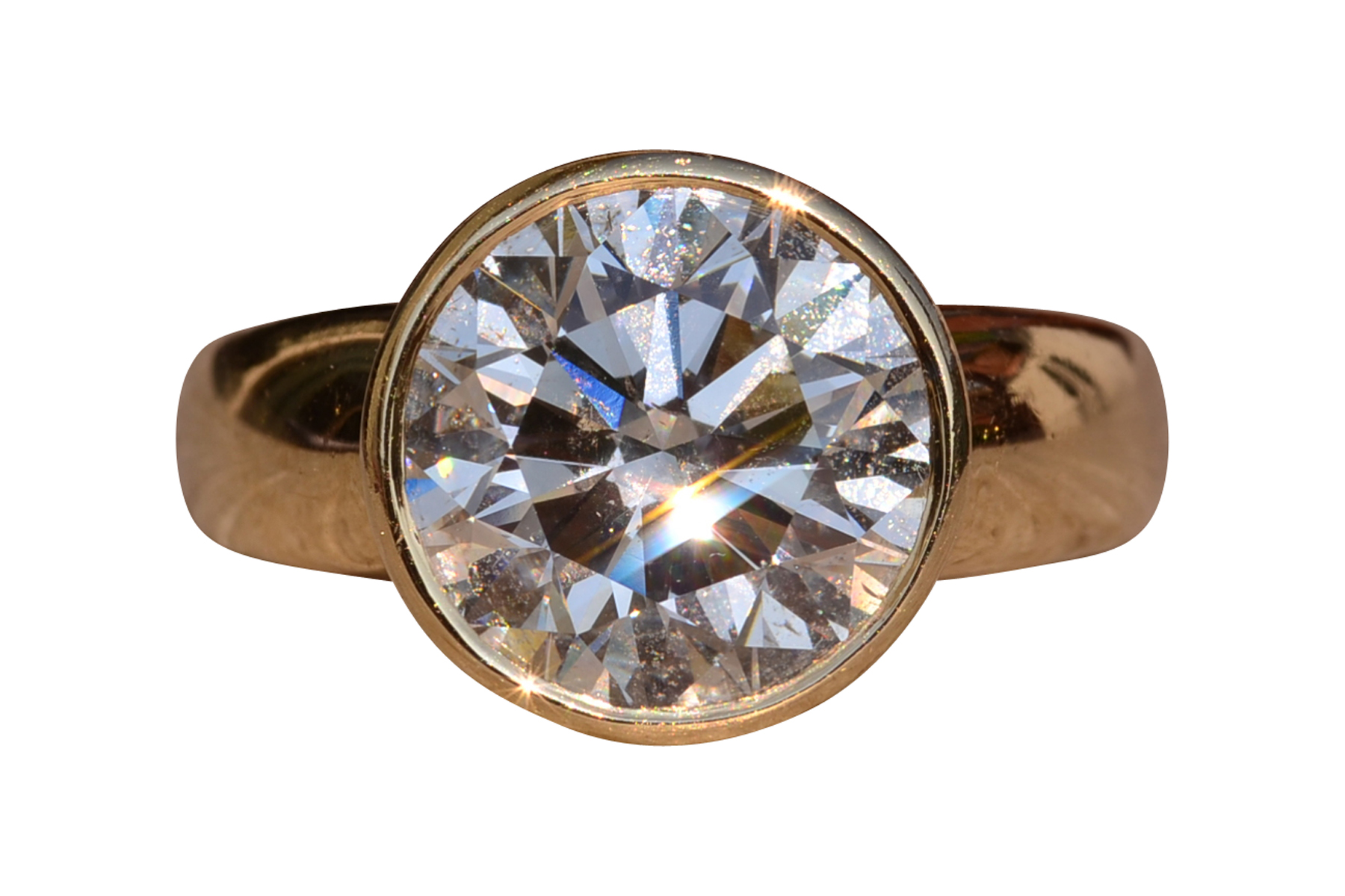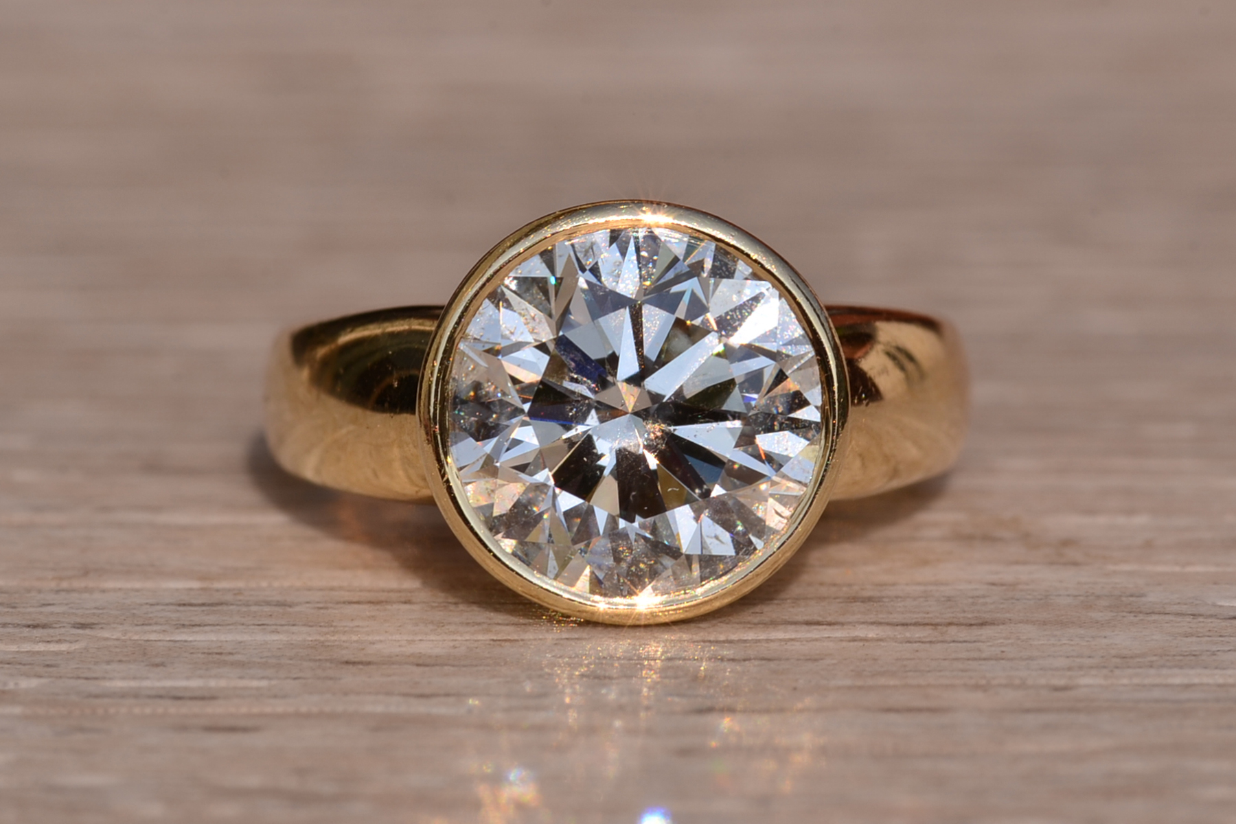 The Bezeler: Bezel Set Round Brilliant Cut Natural Diamond Engagement Ring in Yellow Gold. The ring features a bezel set 4.02 carat round brilliant cut natural diamond center. The diamond has a Gemological Institute of America clarity grade of Si2 and a color grade of J. The diamond has an excellent cut, very good polish, and very good symmetry with no fluorescence. GIA Report #2225436254. The very thin bezel compliments the central diamond on a yellow-gold shank. The ring is crafted in 14 karat yellow gold and is currently a finger size 4 yet can be adjusted to any finger size for an additional charge on request. Please note all of our diamonds are able to be removed and reset in different settings on request.