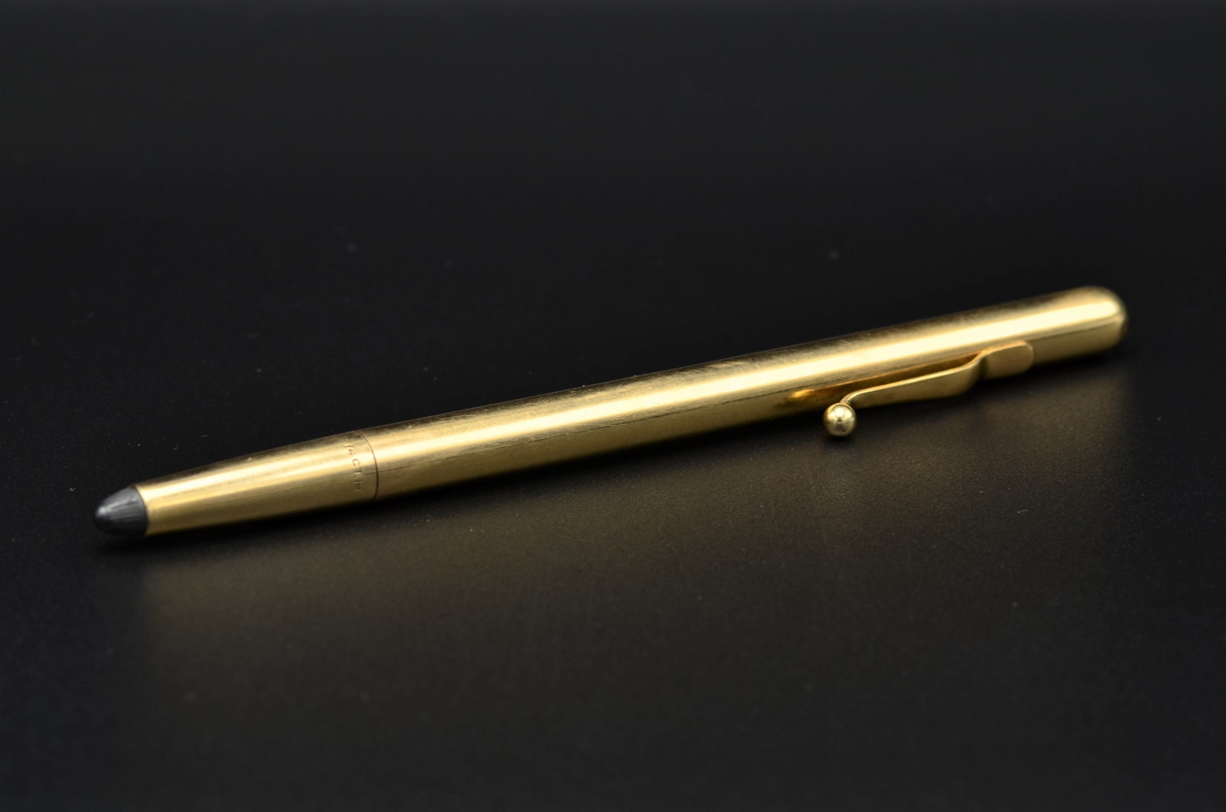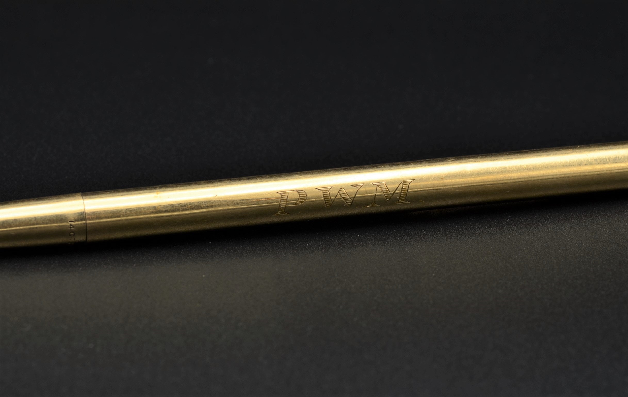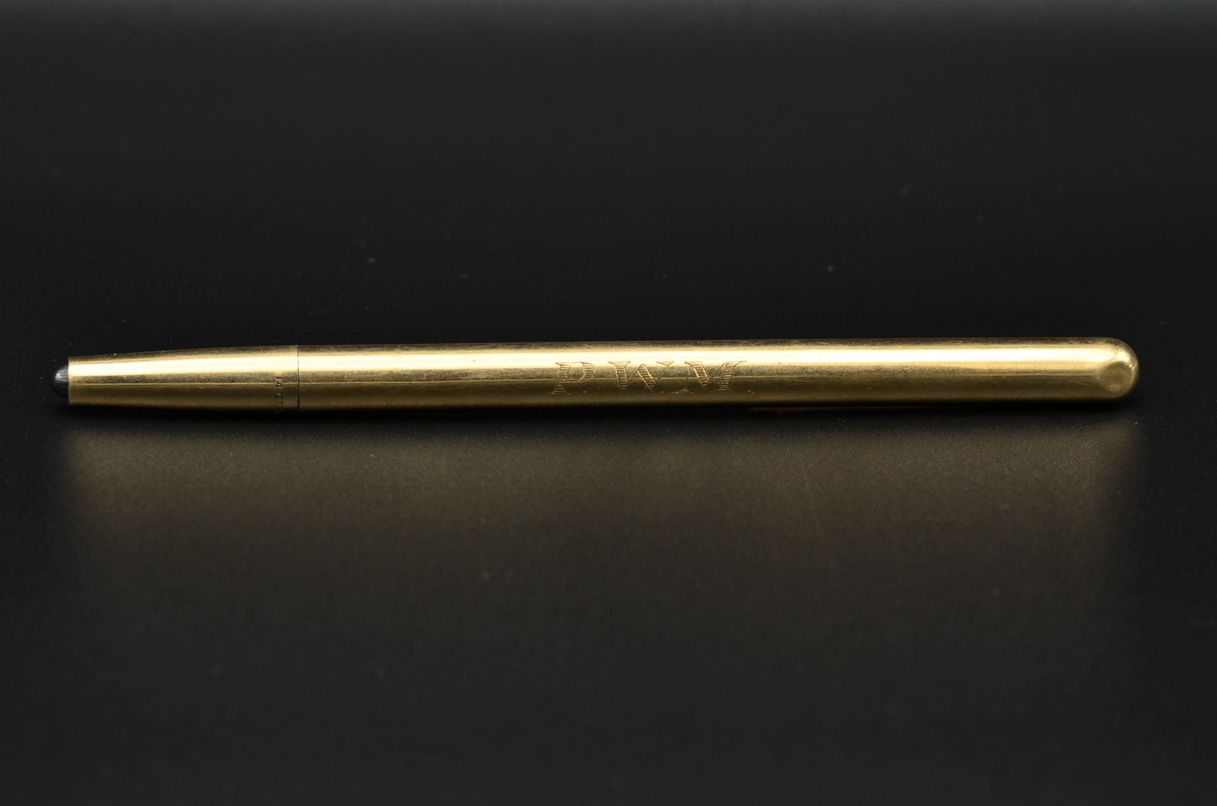 The Bladon: Antique 14 Karat Yellow Gold Mechanical Architects Pencil. The pencil is measures over 1/4 inch thick and features the original yellow gold pocket clip. The pencil has the original lead and is engraved PWM. We are able to remove and re-engrave your own initials for no additional charge.