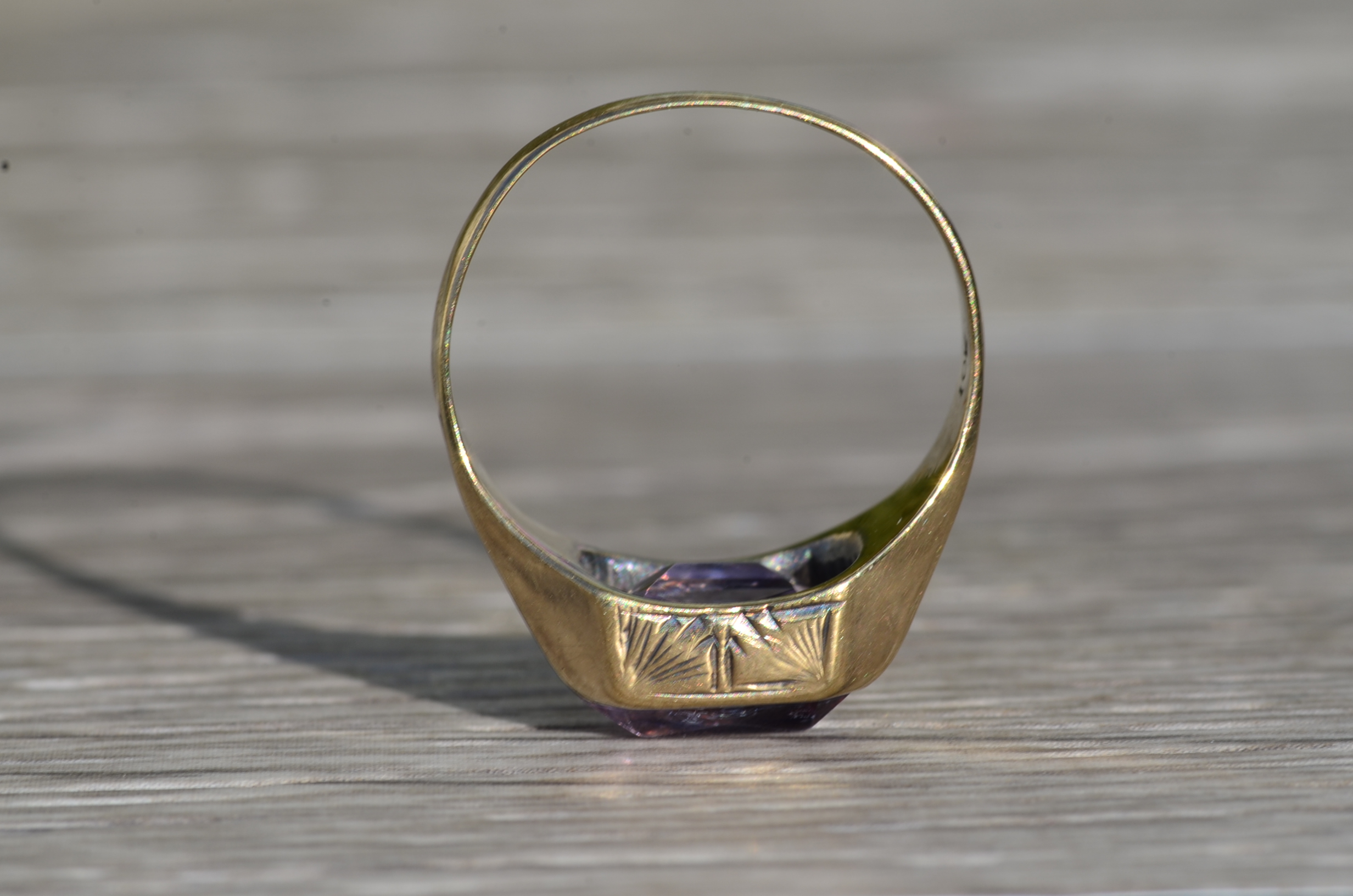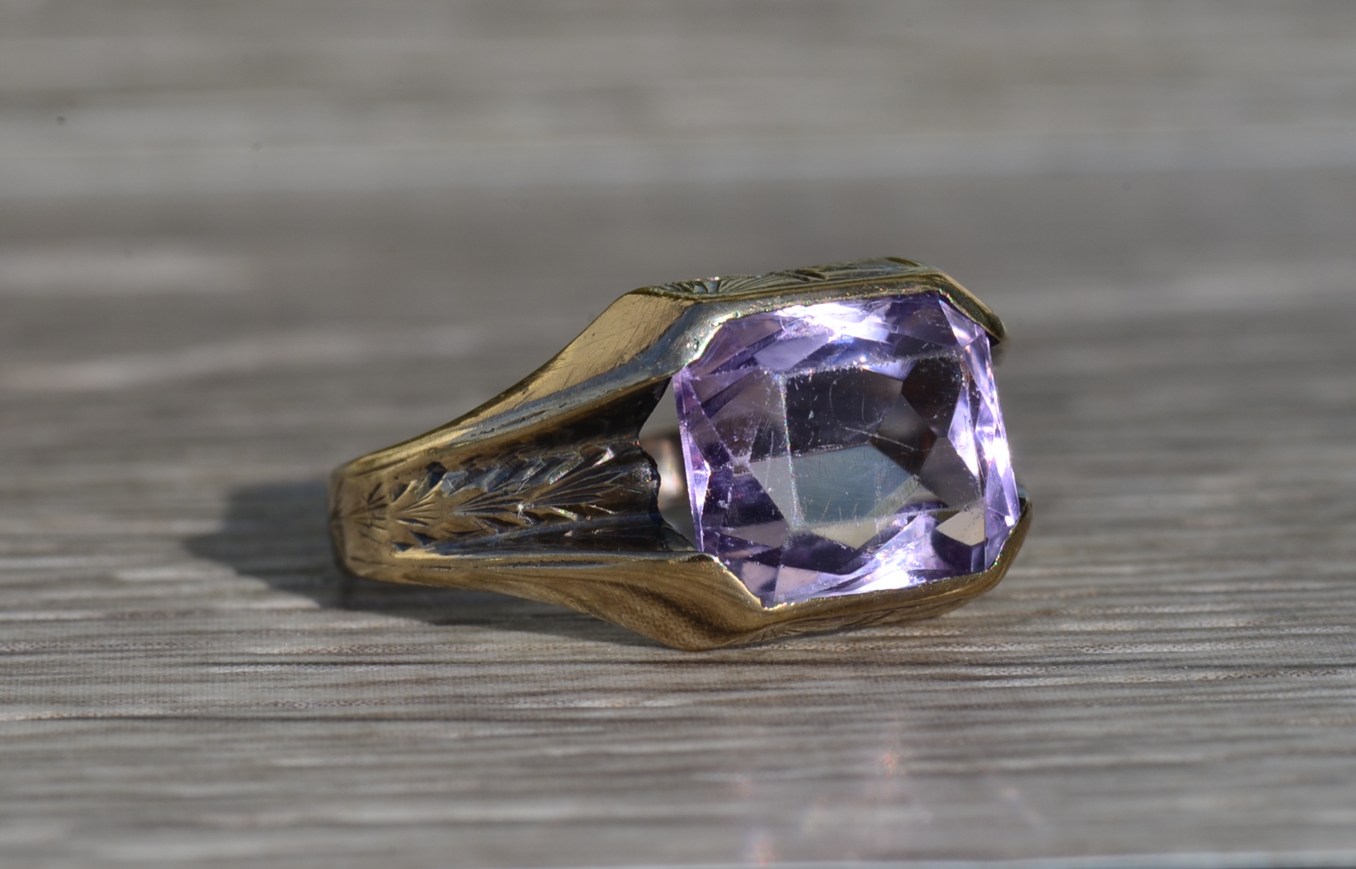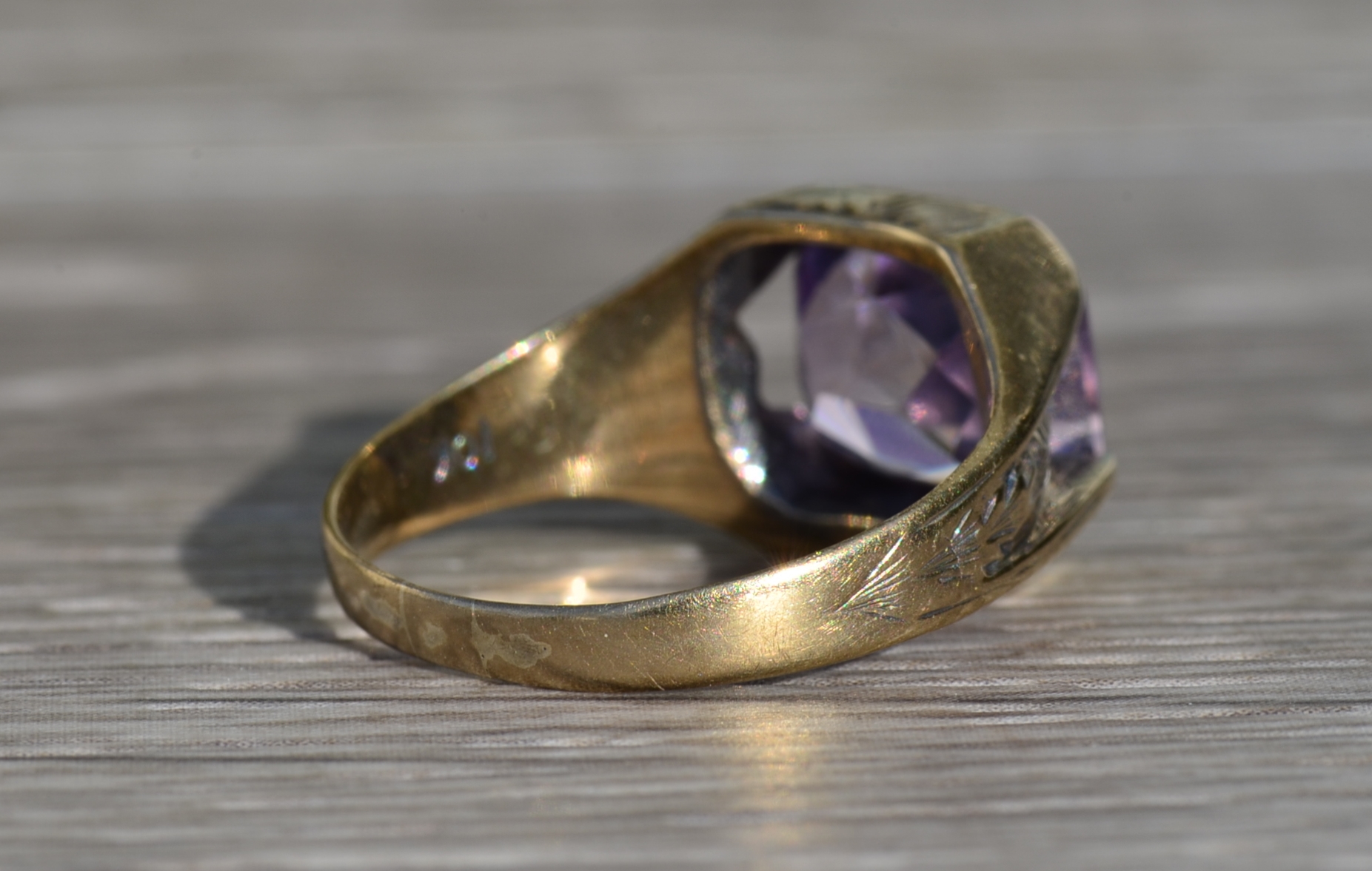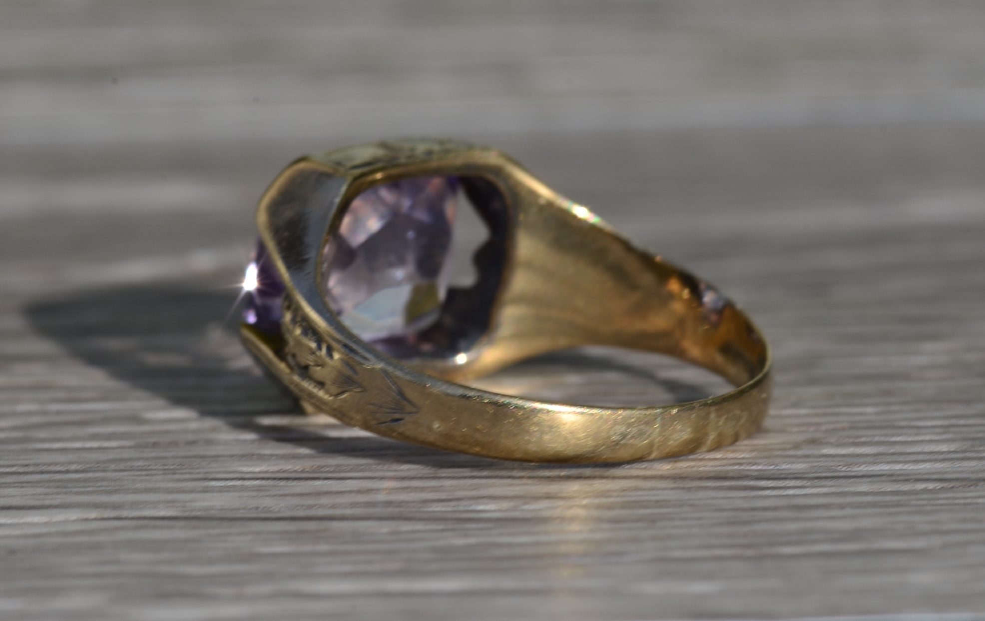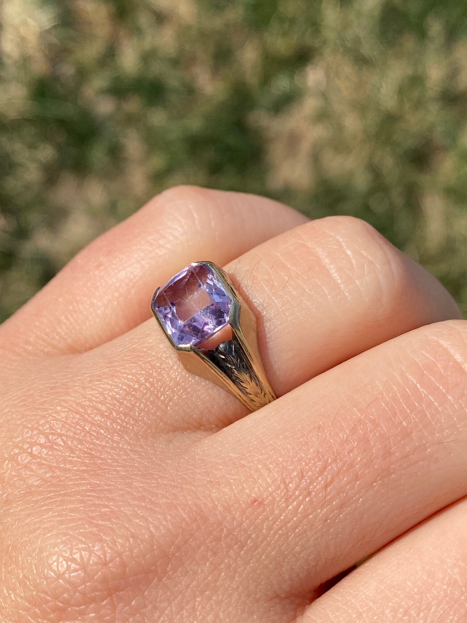 The Blaine: Ladies Antique Yellow Gold Amethyst Ring. Lower set and smooth to wear, this ring is perfect for nurses or anyone who wears gloves all day. Crafted in yellow gold with original engraving, this ring is a finger size 5.5. Resizing is available for an additional charge.