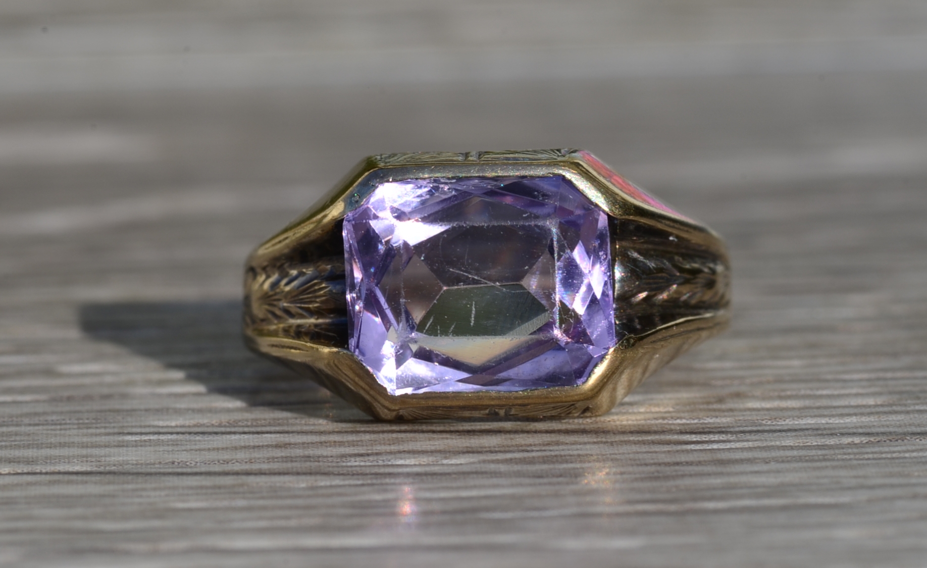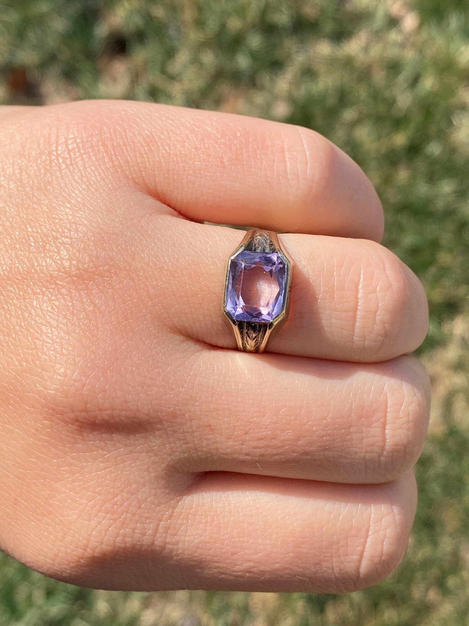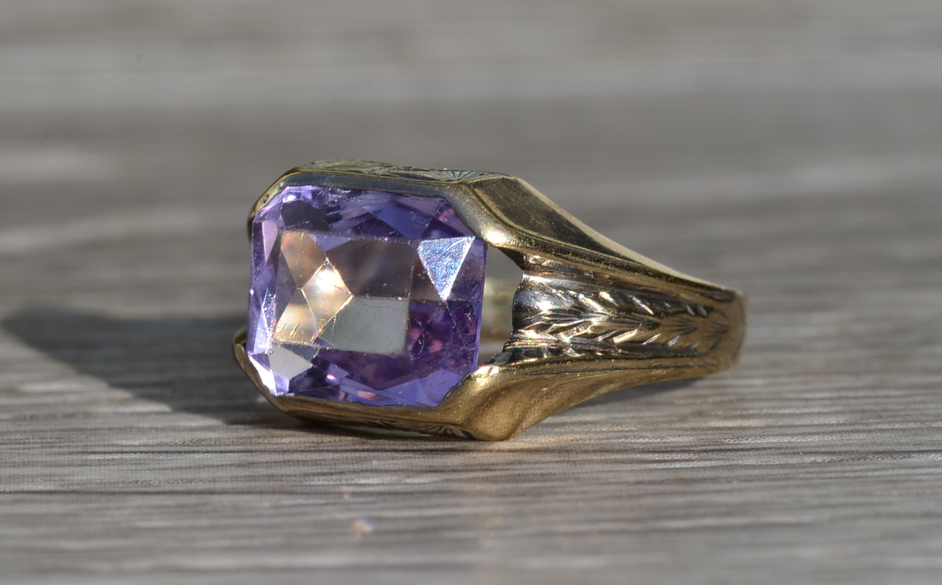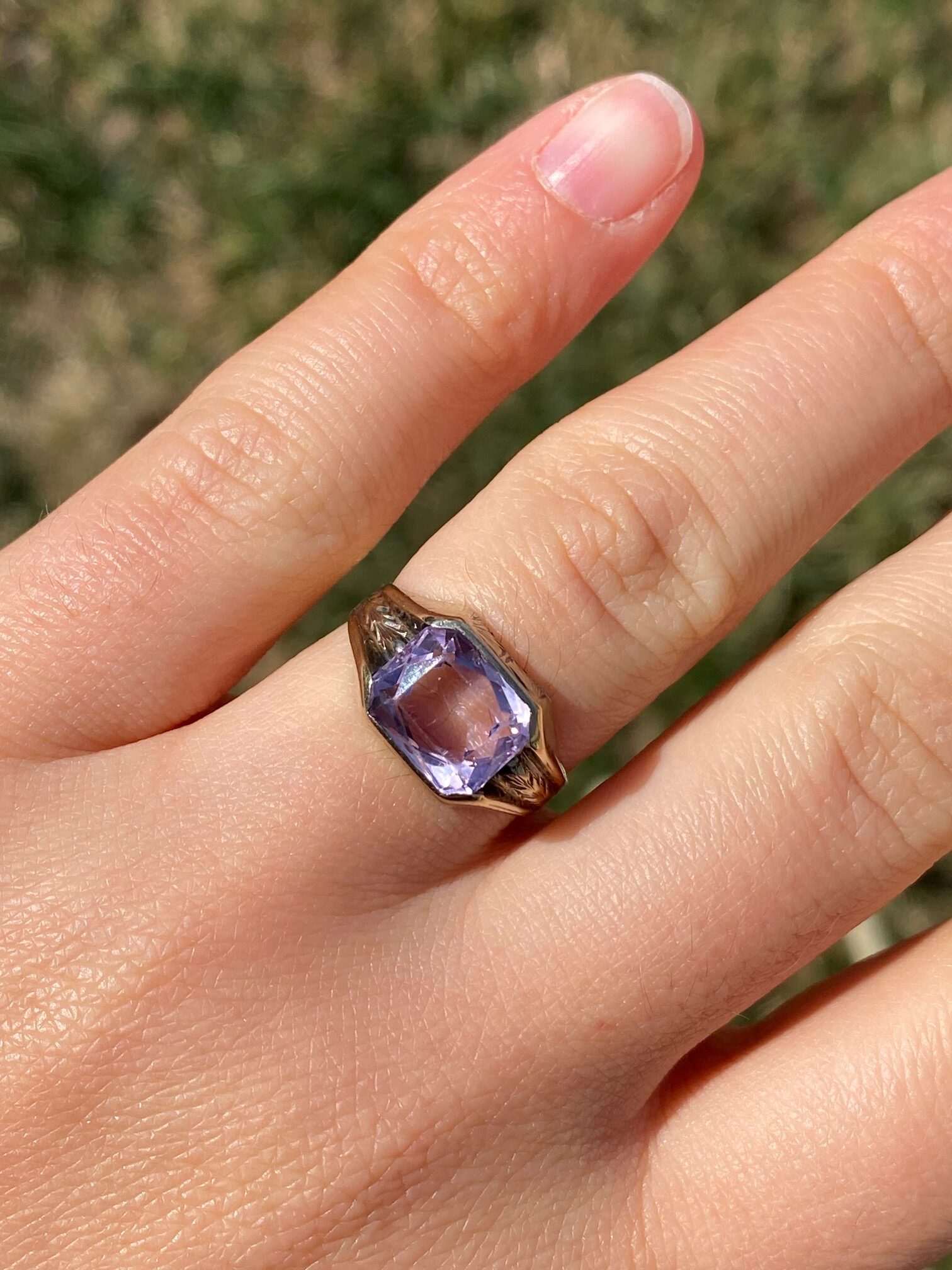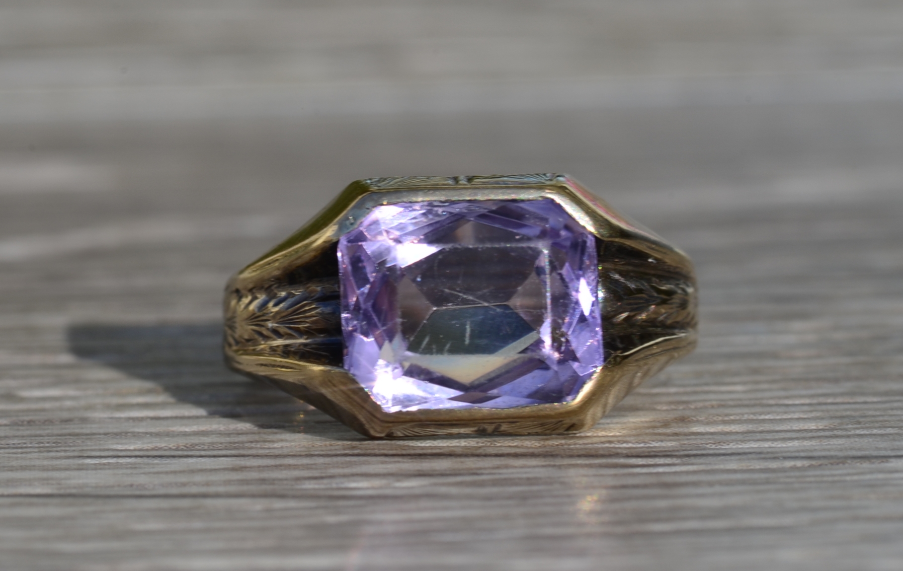 The Blaine: Ladies Antique Yellow Gold Amethyst Ring. Lower set and smooth to wear, this ring is perfect for nurses or anyone who wears gloves all day. Crafted in yellow gold with original engraving, this ring is a finger size 5.5. Resizing is available for an additional charge.