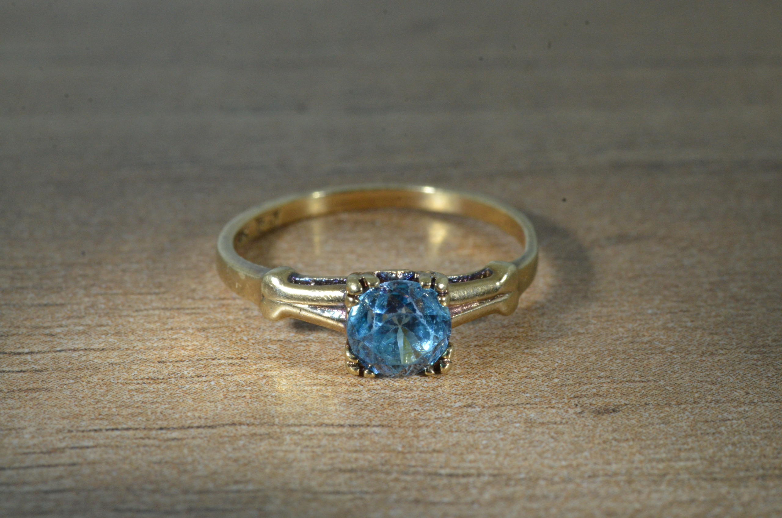 Antique Engagement Ring in Yellow Gold set with Blue Zircon. In the center is set with an old mine cut natural vivid blue zircon with an approximate weight by measurement of 0.75 carats. On either side of the center is an angular gold that finished with a interesting pattern in the through finger view of the head. The ring is crafted in yellow gold and is a lovely example of an original antique engagement ring. The ring is currently a finger size 4 3/4 yet can be adjusted to any finger size.