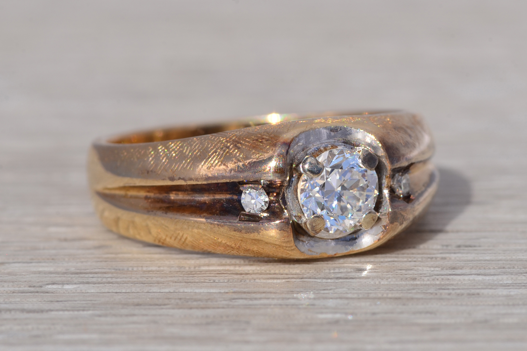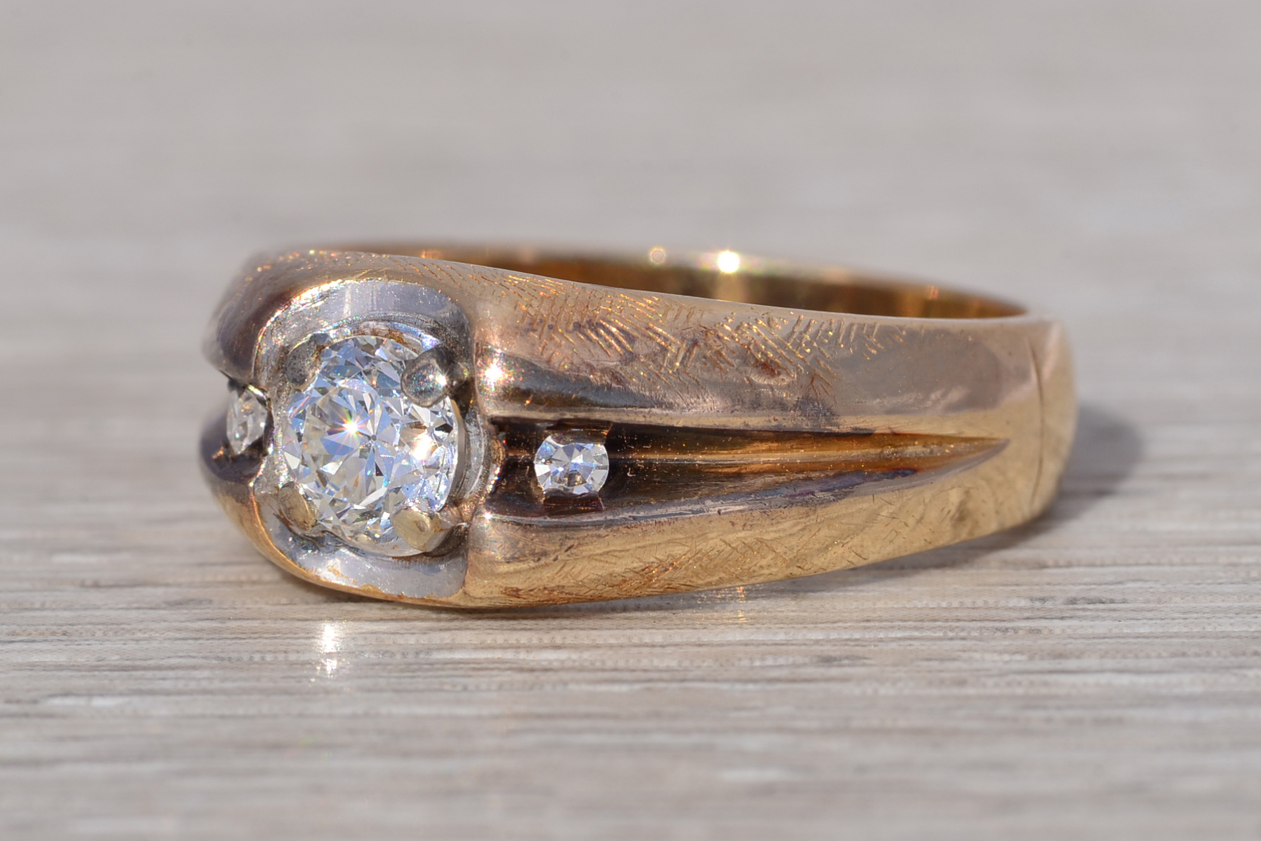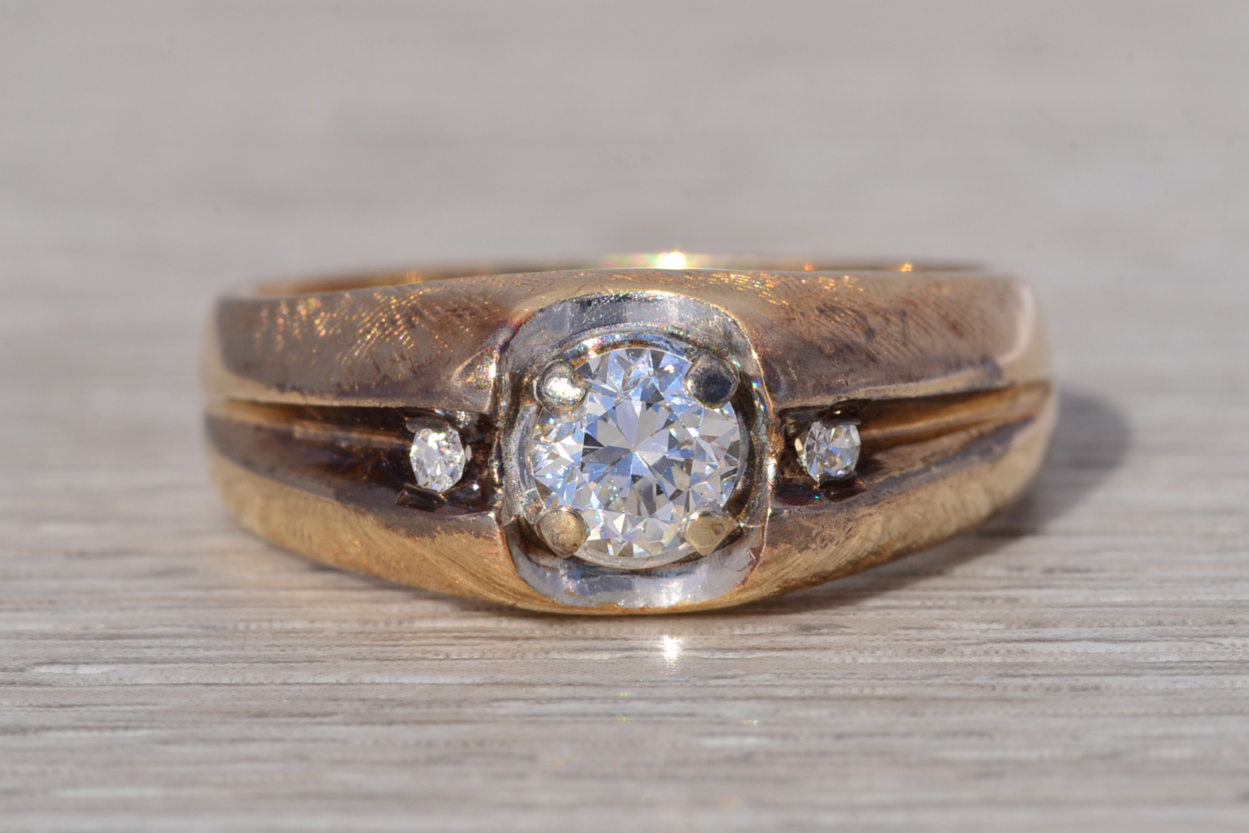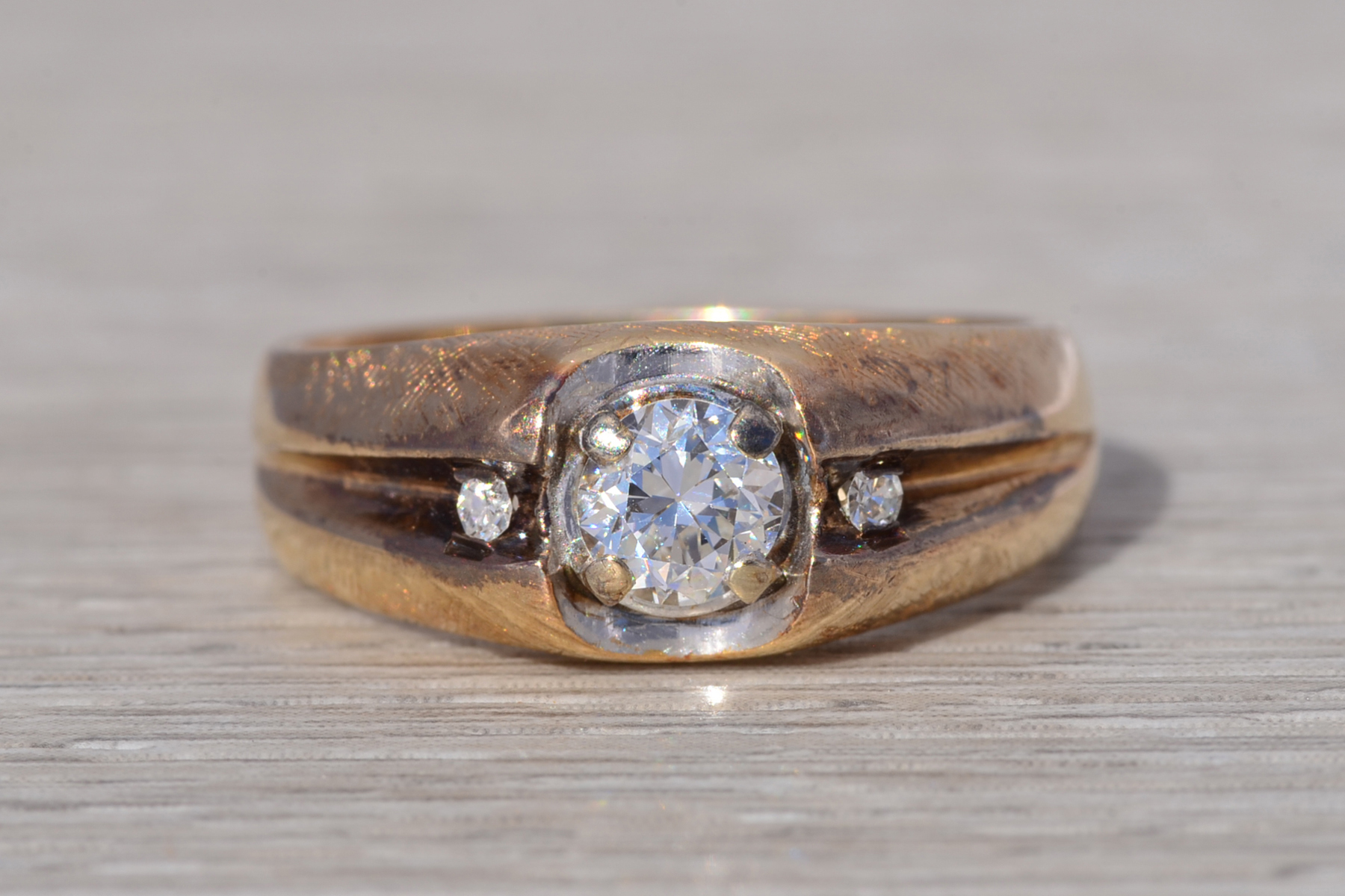 This stunning piece, known as The Bold Crest, features a captivating round brilliant cut natural diamond at its center with an approximate weight of 0.59 carats. The diamond has an approximate GIA clarity grade of VS1 and H color. The center diamond is securely set within a sculpted white gold head, creating a subtle two-tone contrast against the rich yellow gold band. Flanking the center are additional round brilliant cut natural diamonds totaling approximately 0.02 carats, set within a recessed channel design that adds dimension and balance to the ring’s bold profile. The ring is crafted in 14 karat yellow gold and is currently a finger size 10 yet can be adjusted to any finger size for an additional charge upon request, ensuring a perfect fit.