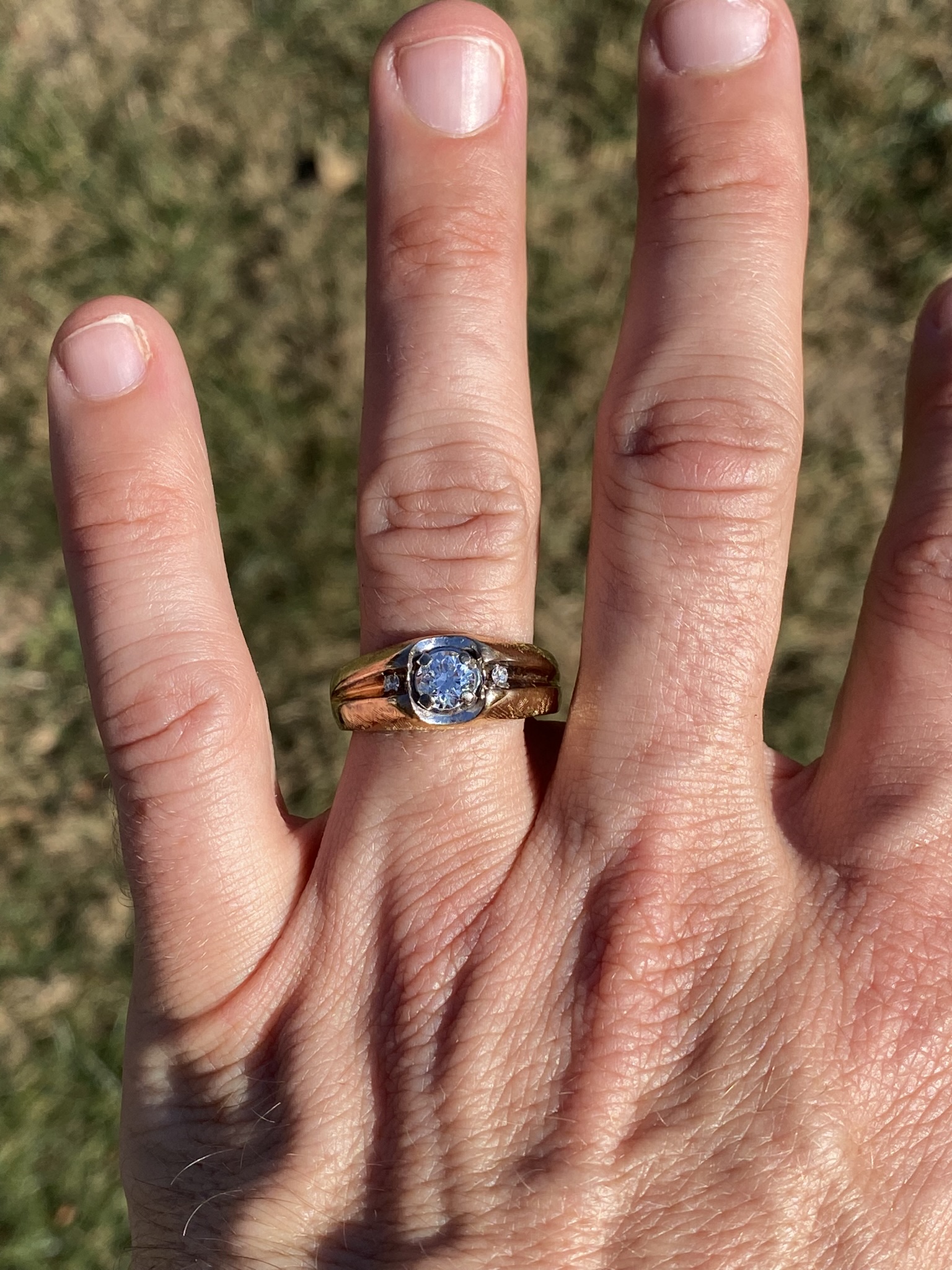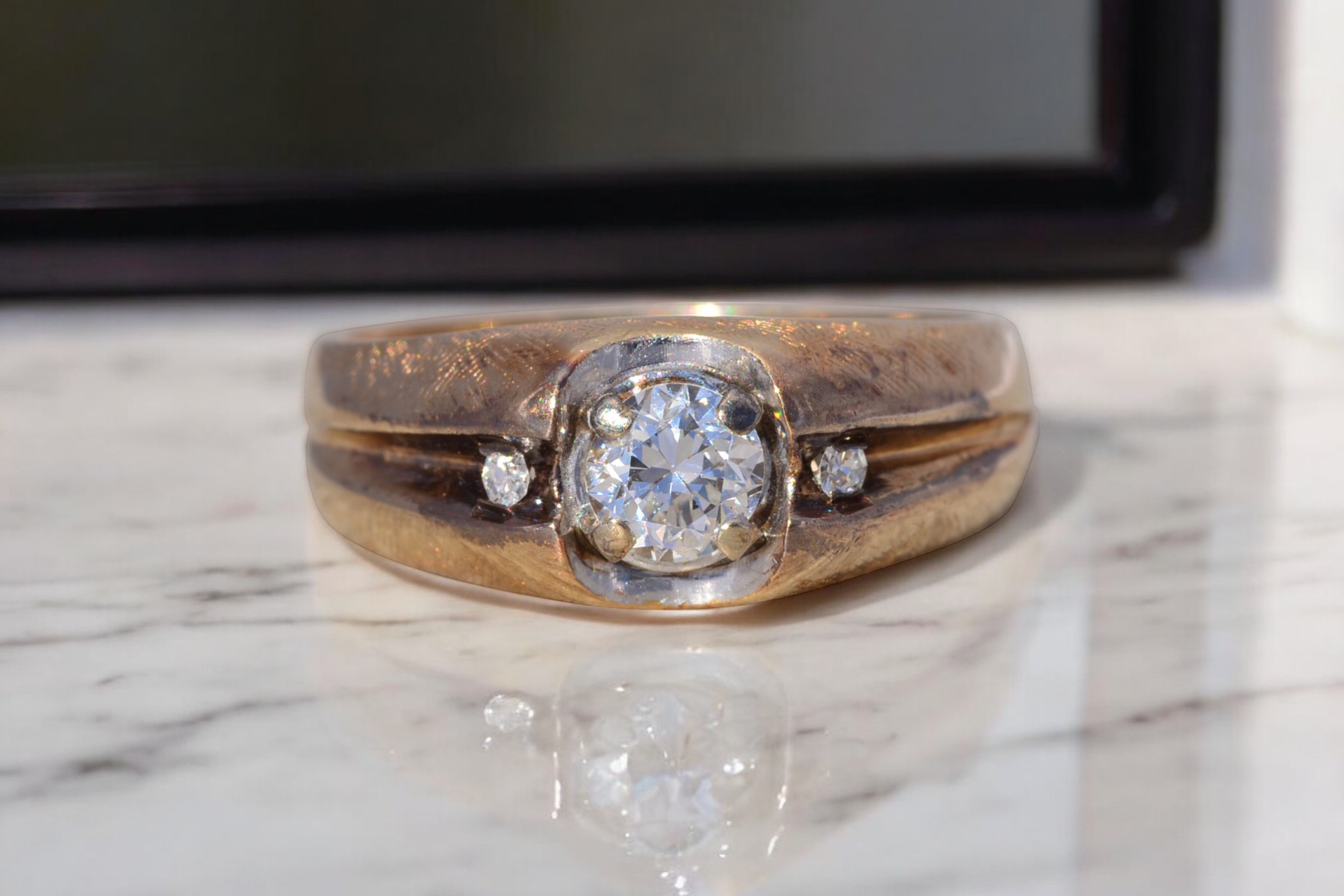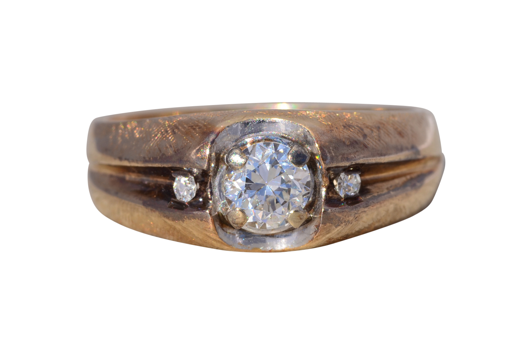 This stunning piece, known as The Bold Crest, features a captivating round brilliant cut natural diamond at its center with an approximate weight of 0.59 carats. The diamond has an approximate GIA clarity grade of VS1 and H color. The center diamond is securely set within a sculpted white gold head, creating a subtle two-tone contrast against the rich yellow gold band. Flanking the center are additional round brilliant cut natural diamonds totaling approximately 0.02 carats, set within a recessed channel design that adds dimension and balance to the ring’s bold profile. The ring is crafted in 14 karat yellow gold and is currently a finger size 10 yet can be adjusted to any finger size for an additional charge upon request, ensuring a perfect fit.
