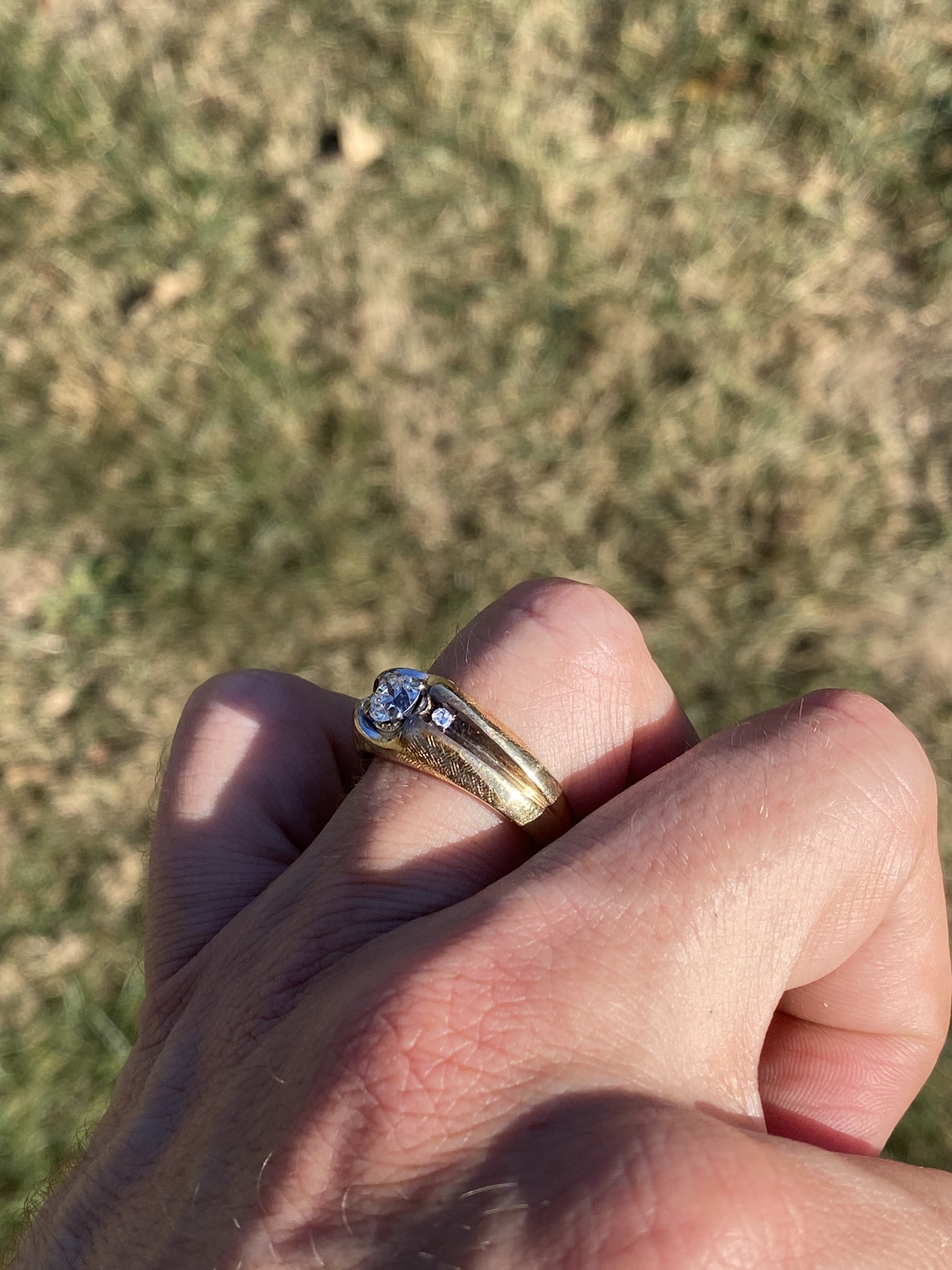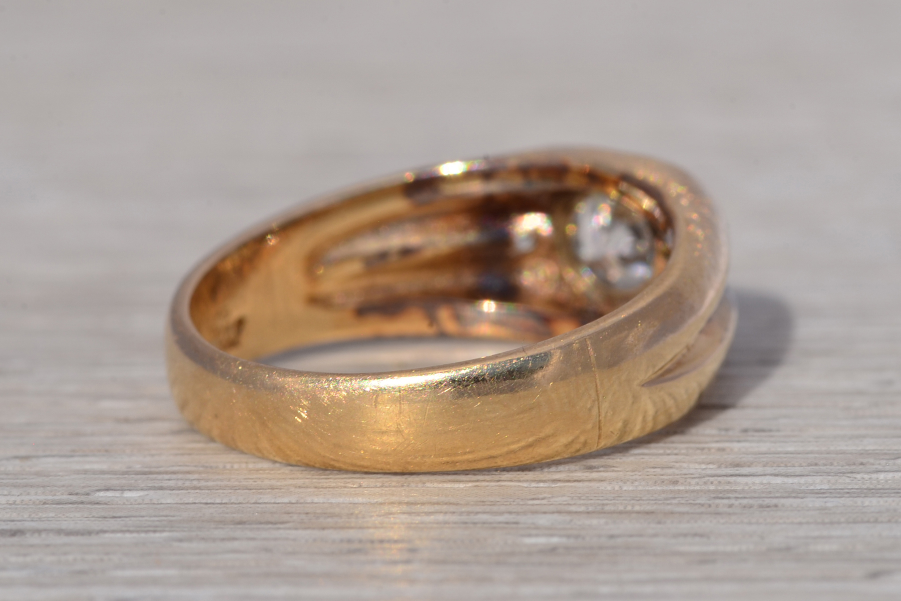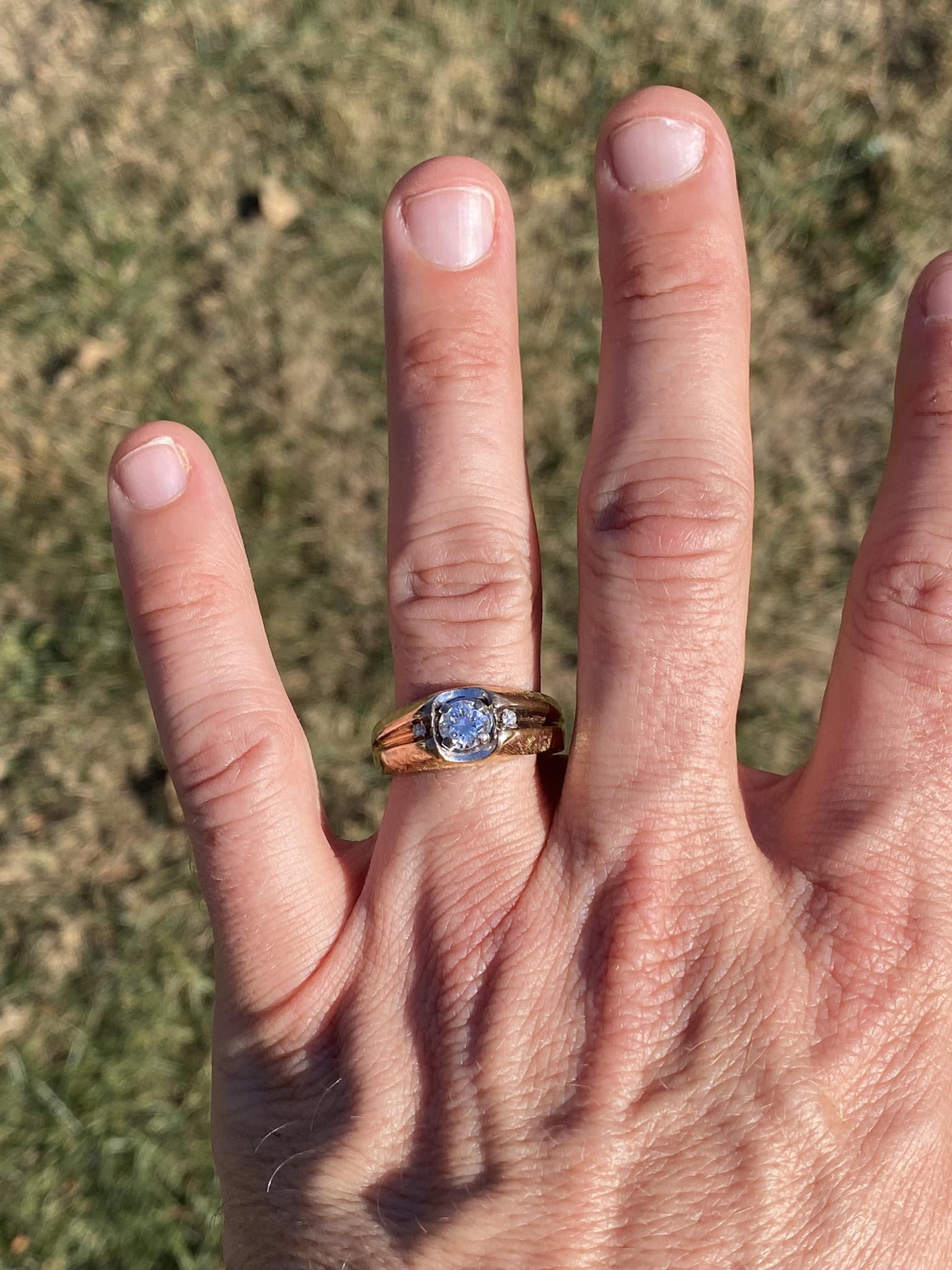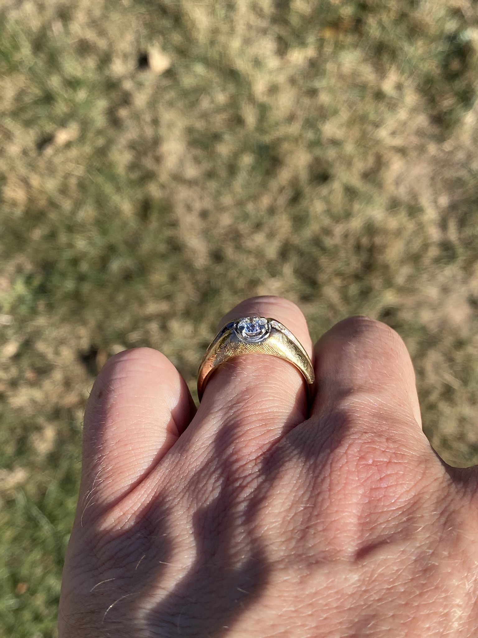 This stunning piece, known as The Bold Crest, features a captivating round brilliant cut natural diamond at its center with an approximate weight of 0.59 carats. The diamond has an approximate GIA clarity grade of VS1 and H color. The center diamond is securely set within a sculpted white gold head, creating a subtle two-tone contrast against the rich yellow gold band. Flanking the center are additional round brilliant cut natural diamonds totaling approximately 0.02 carats, set within a recessed channel design that adds dimension and balance to the ring’s bold profile. The ring is crafted in 14 karat yellow gold and is currently a finger size 10 yet can be adjusted to any finger size for an additional charge upon request, ensuring a perfect fit.