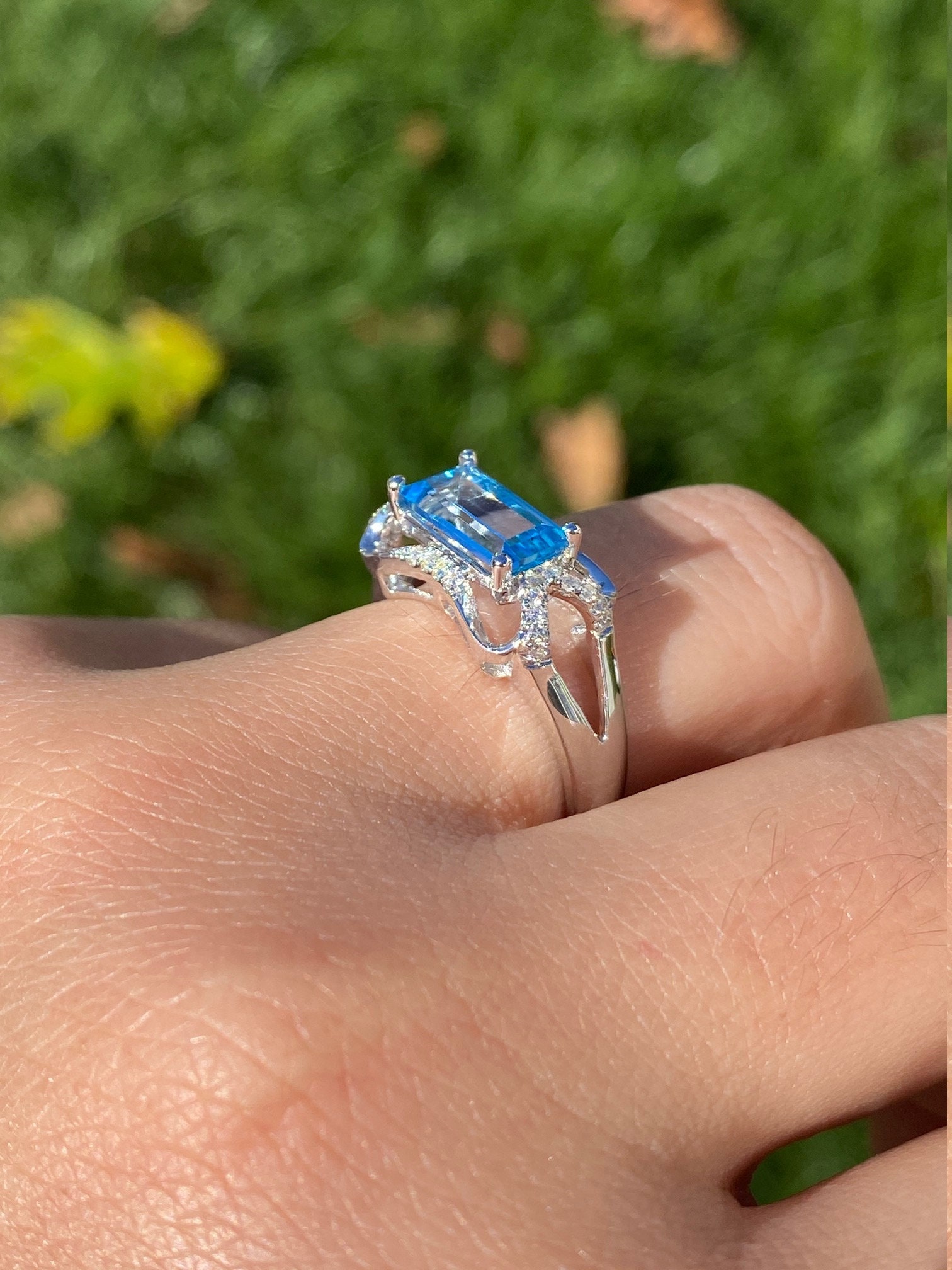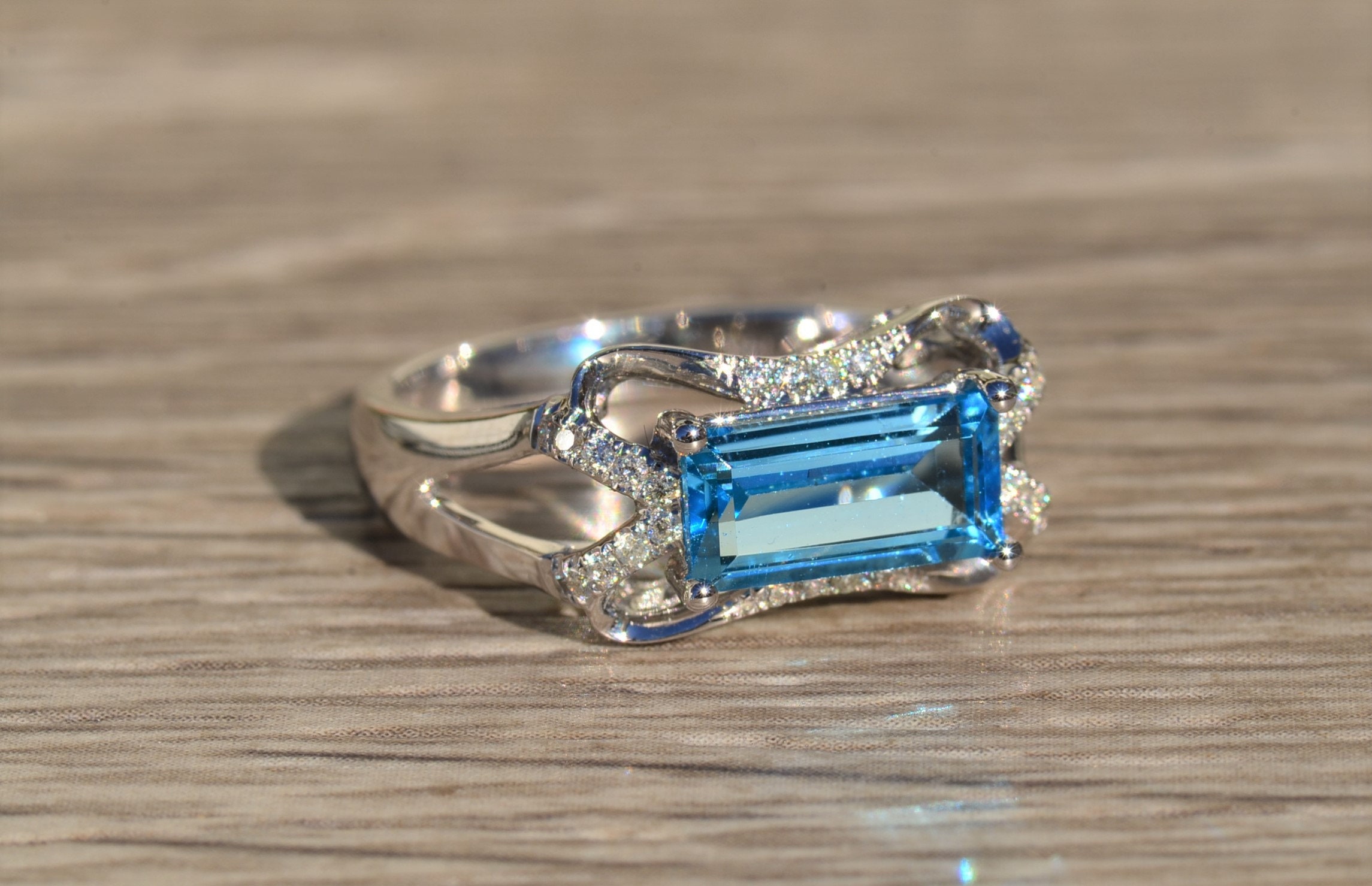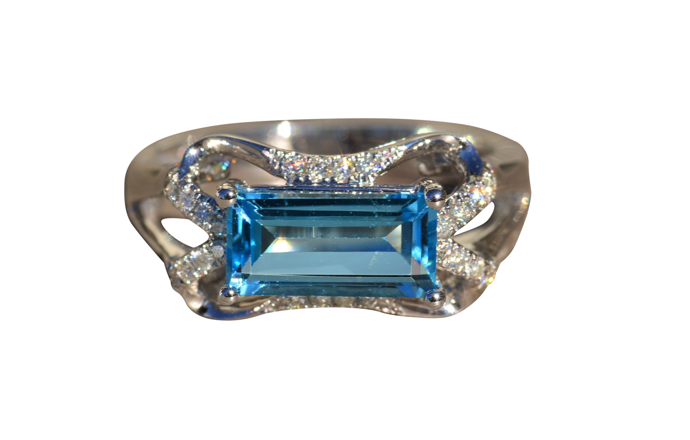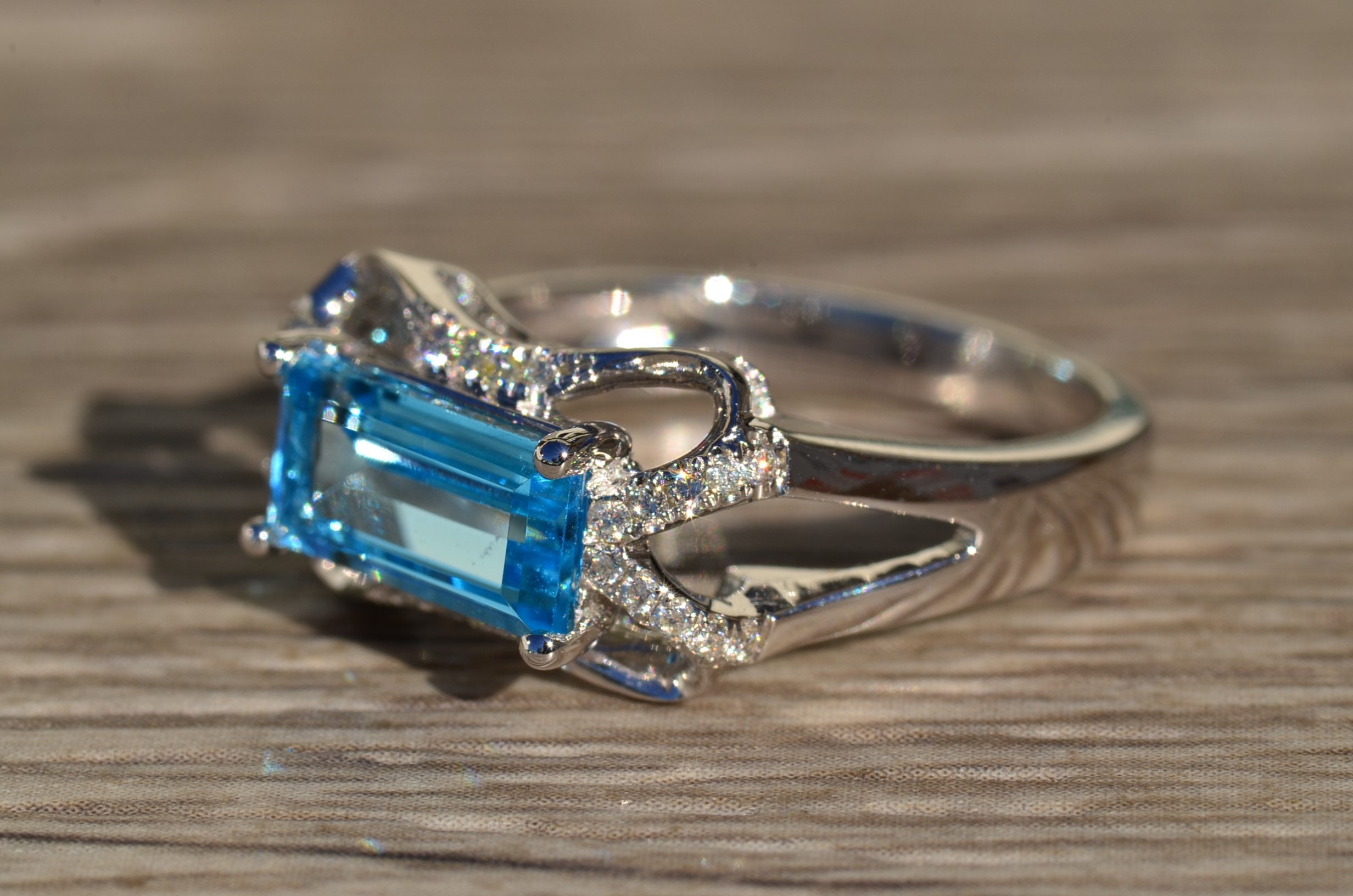 Contemporary Blue Topaz and Diamond Ring set in White Gold. Crafted in 14 karat white gold, this ring centers on a step cut blue topaz that is situated east to west. Diamonds accent the curved sections of the mounting giving this ring a nice presence on the hand. Currently a finger size 7, this ring can be adjusted to any finger size.