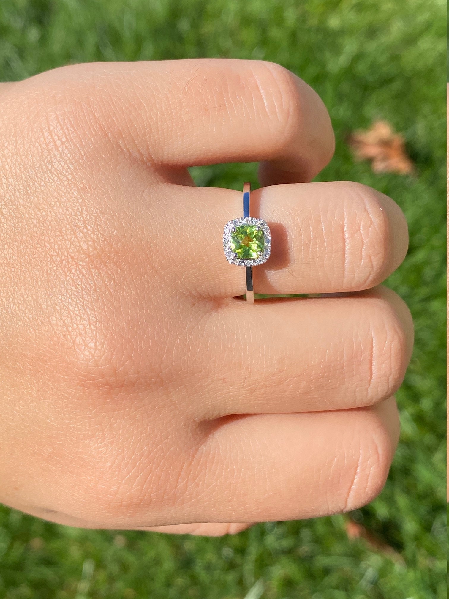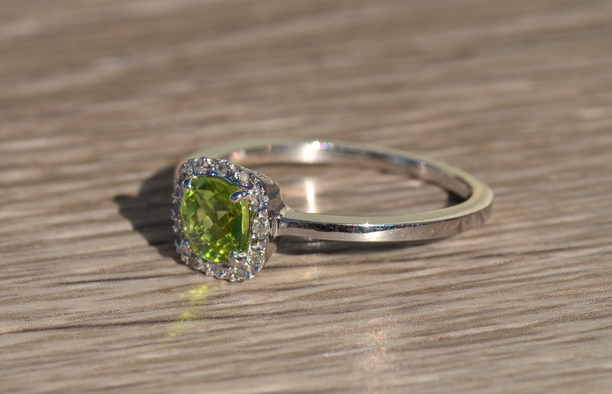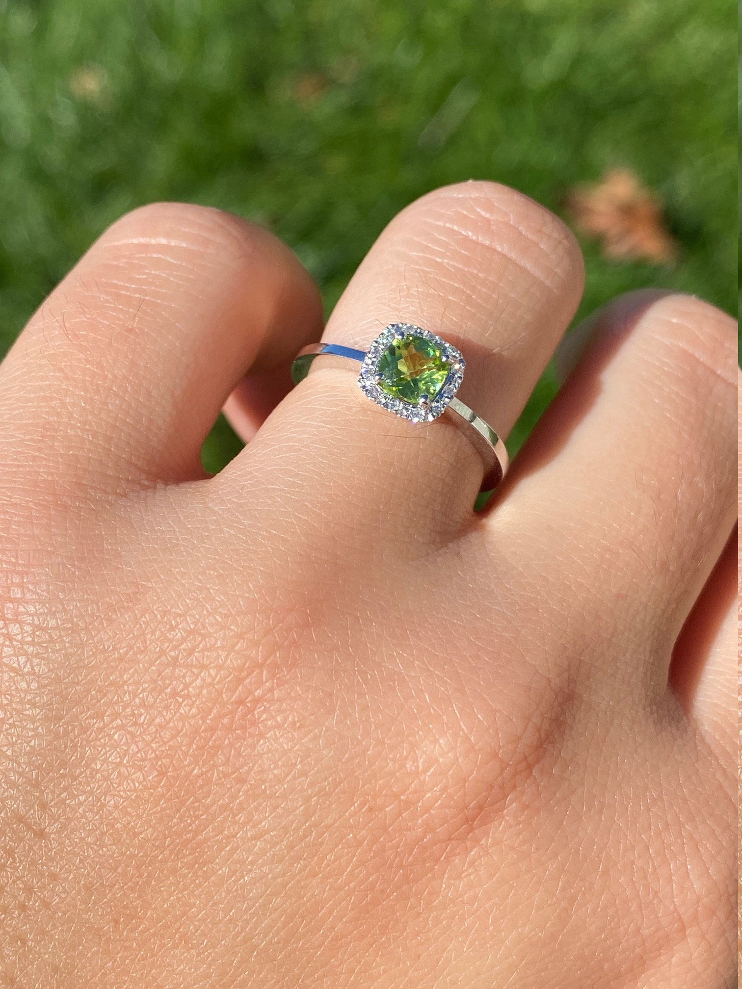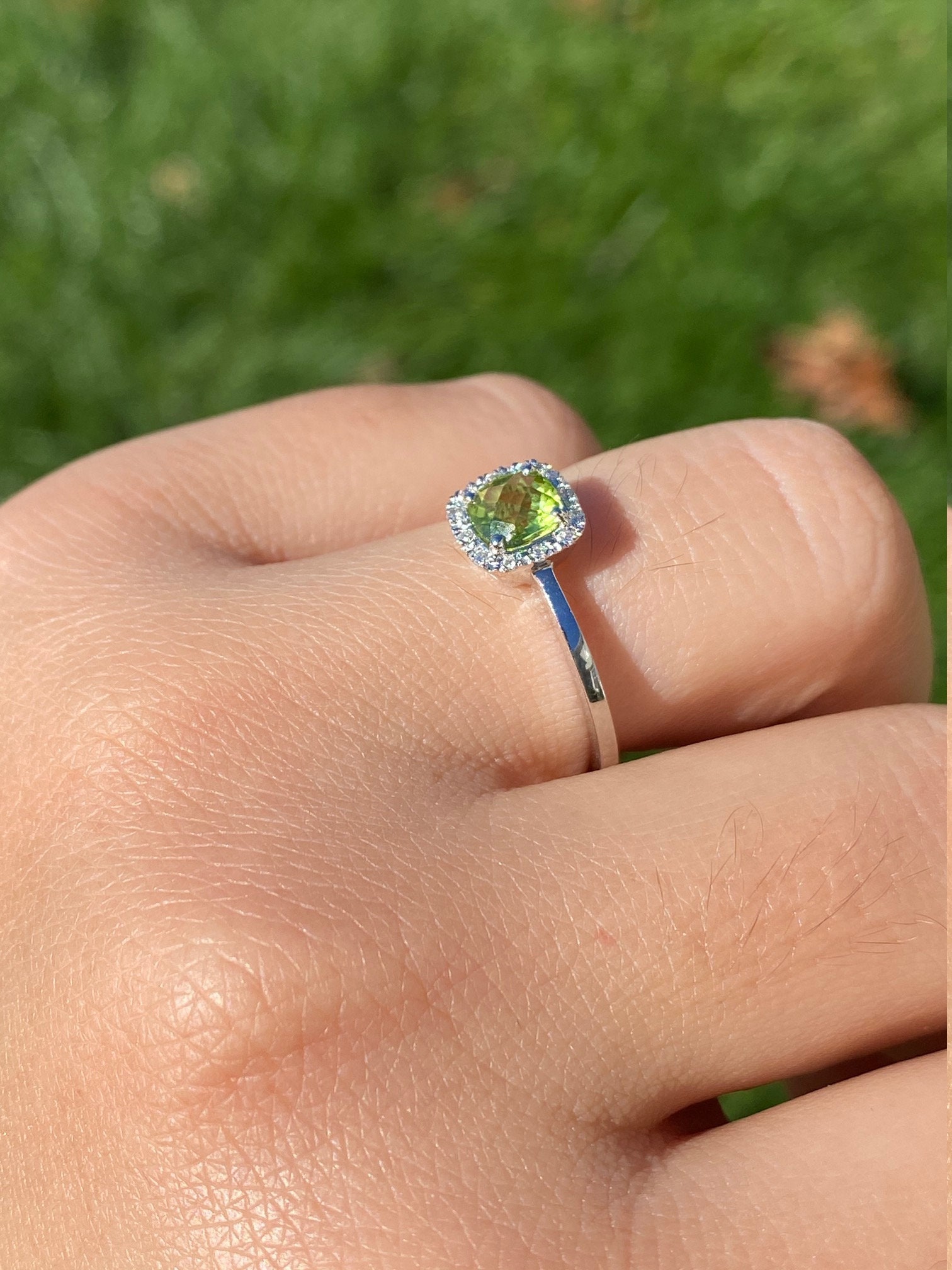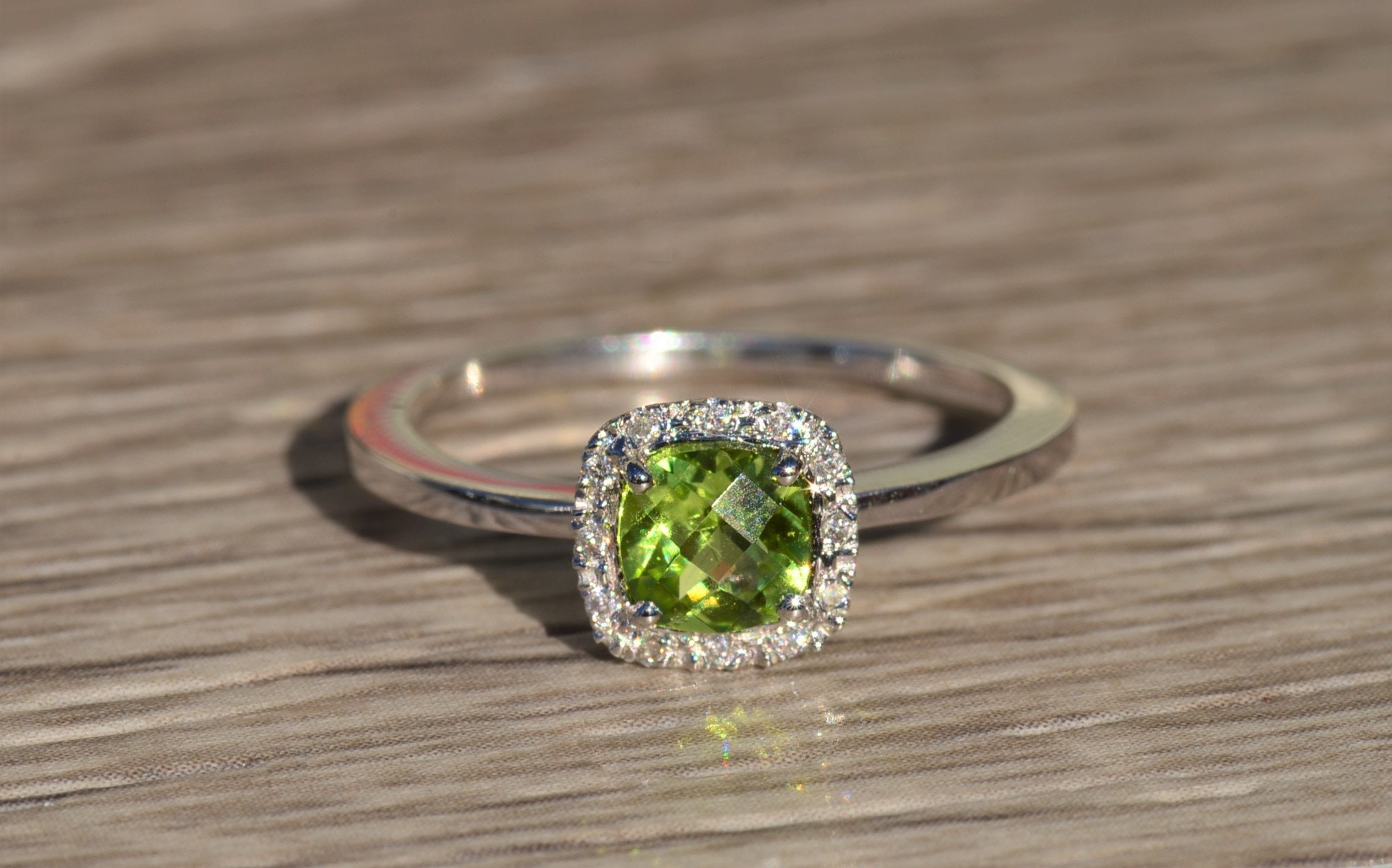 The Brickle:  Ladies Checkerboard Cut Peridot and Diamond Halo Ring in White Gold - Image 9