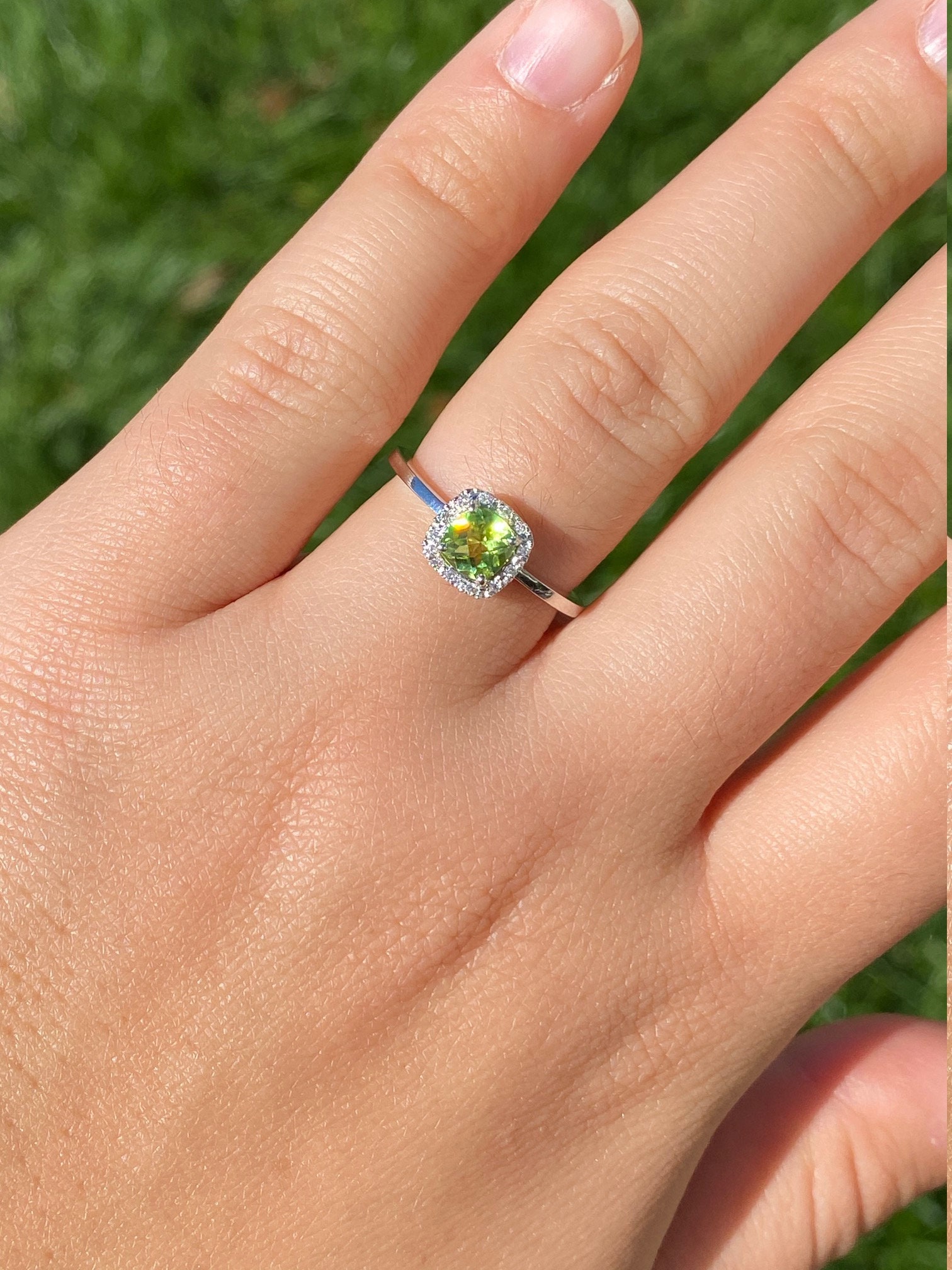 SKU: 1648 Categories: Cocktail Rings, Colored Stone Engagement Rings, Contemporary Jewelry, Engagement Rings, New & Bespoke, New & Bespoke Engagement Rings Tags: 14 karat, 14 karat white gold, checkerboard cut, cocktail ring, contemporary, contemporary ring, cushion cut, cushion cut ring, diamond, diamond halo ring, diamond ring, green, green peridot ring, halo, Ladies, ladies' ring, low profile, low profile ring, modern ring, peridot, peridot ring, ring, statement ring, White Gold, women, women's ring