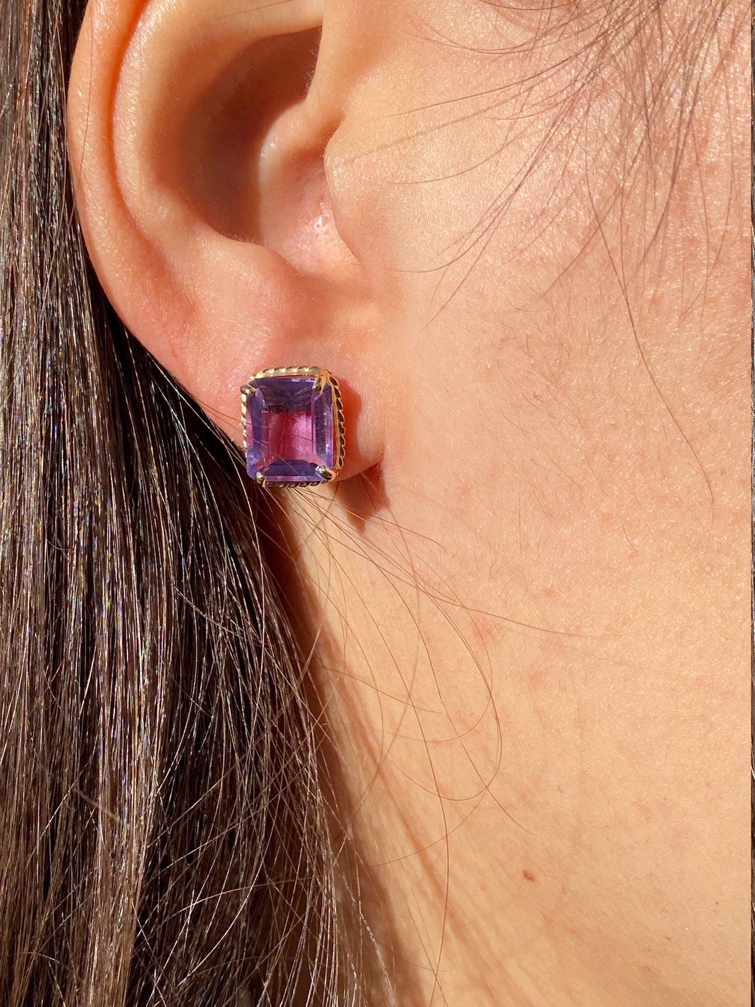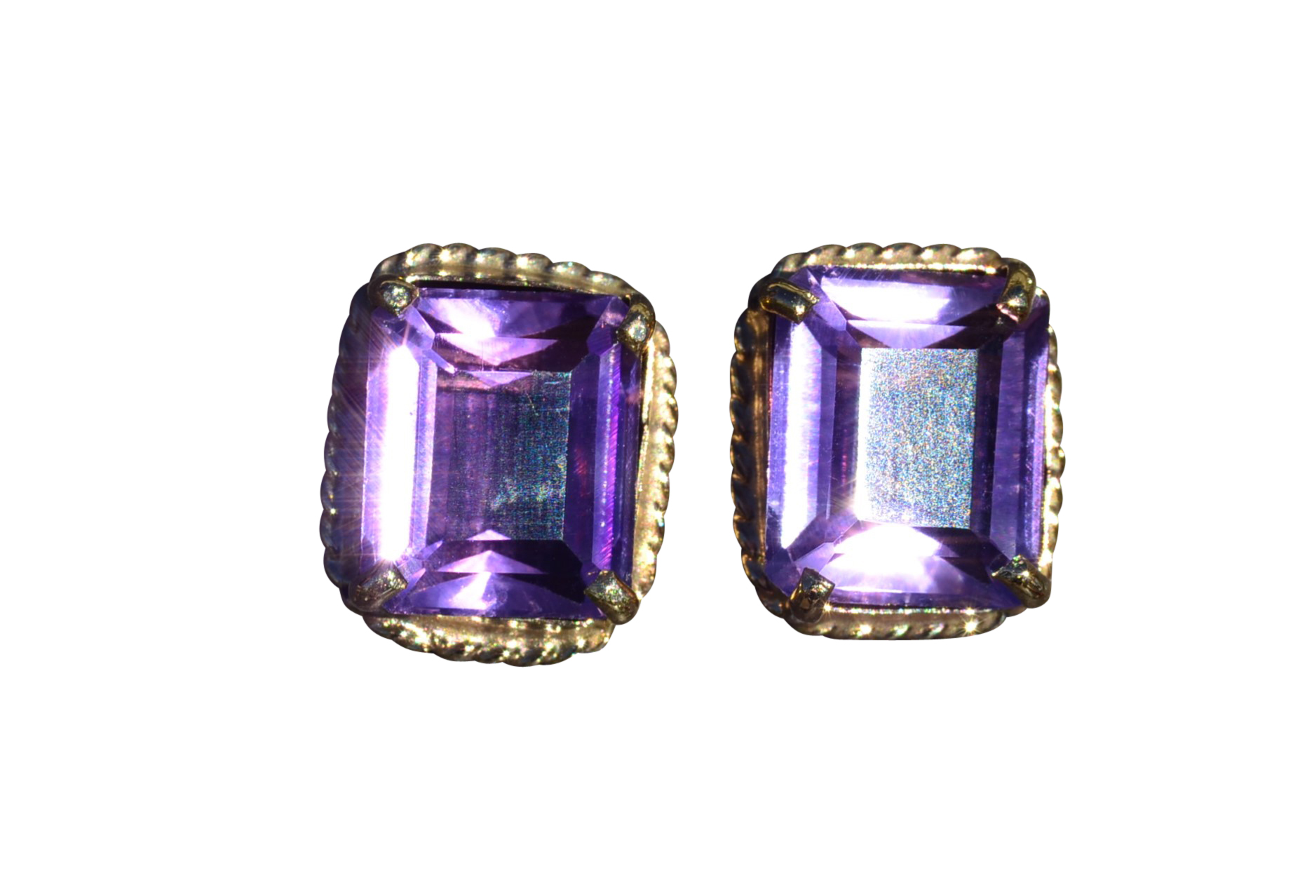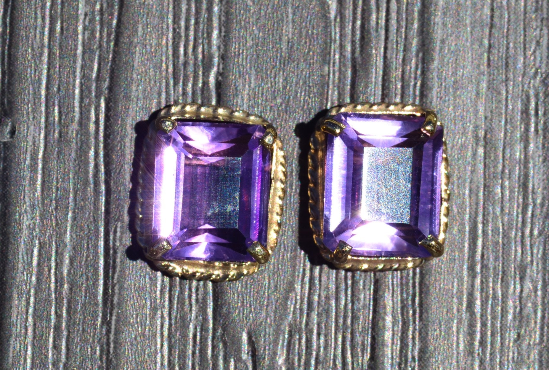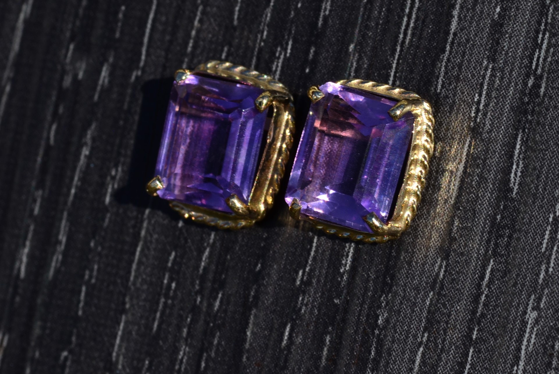 Ladies 14K Yellow Gold Earrings set with 6 CTW Amethyst. Crafted in 14 karat yellow gold, these vintage earrings feature a 3 carat amethyst in each ear. The amethyst measure 10mm x 8mm in size. The earrings are complete with a delicate rope detail around the sides and have standard push style backings.