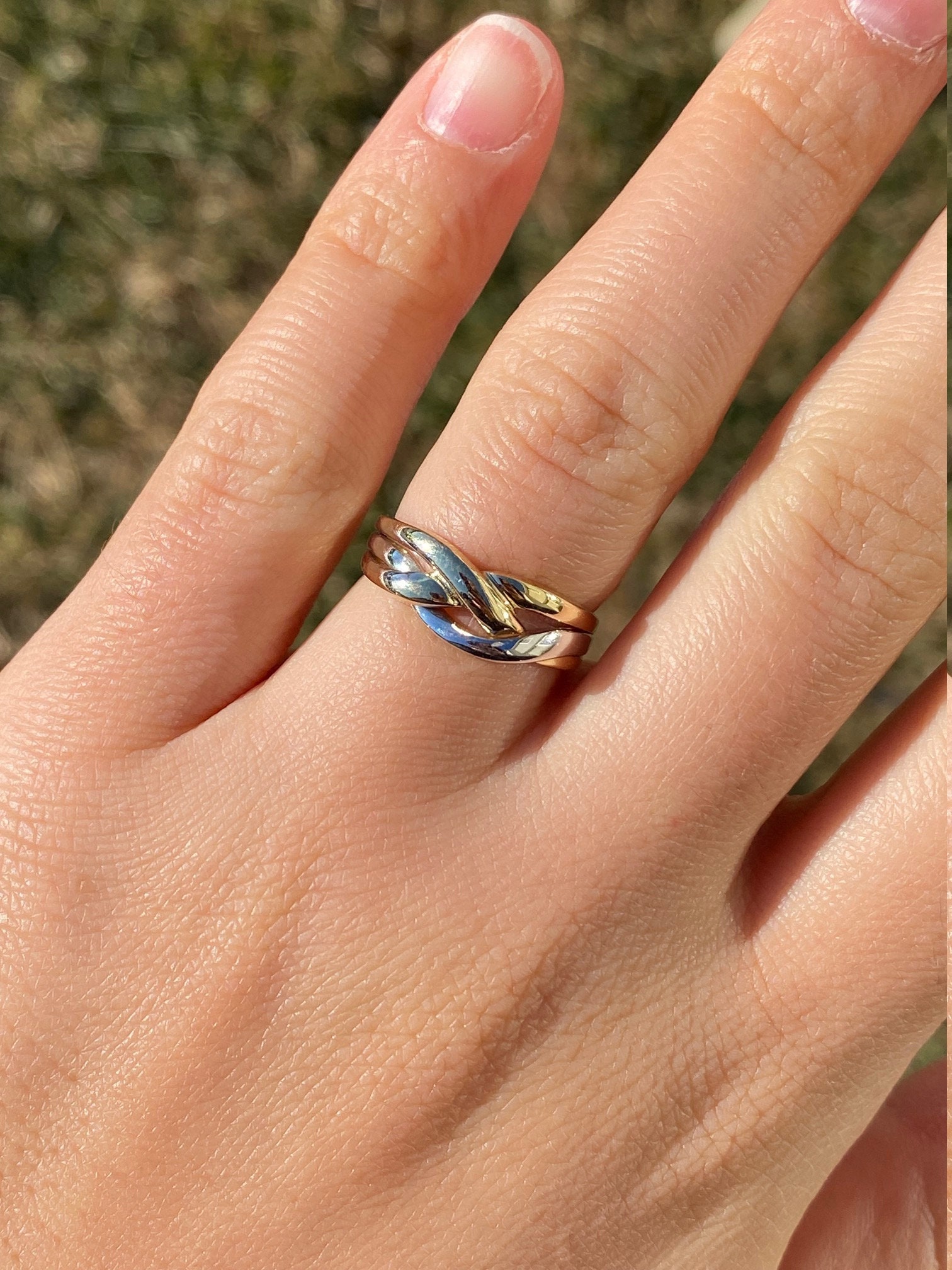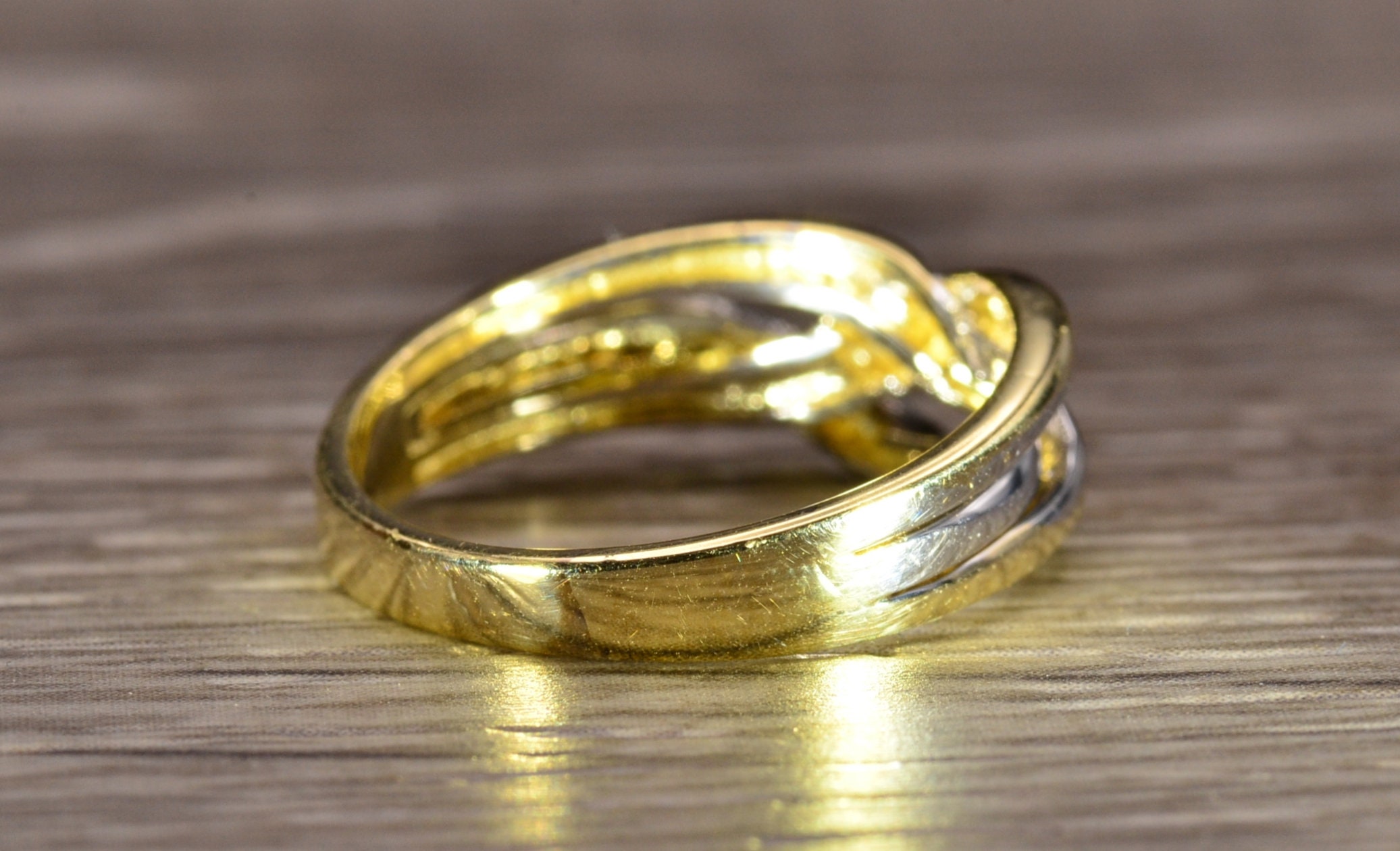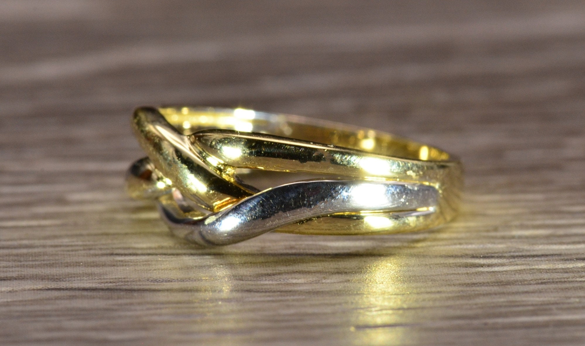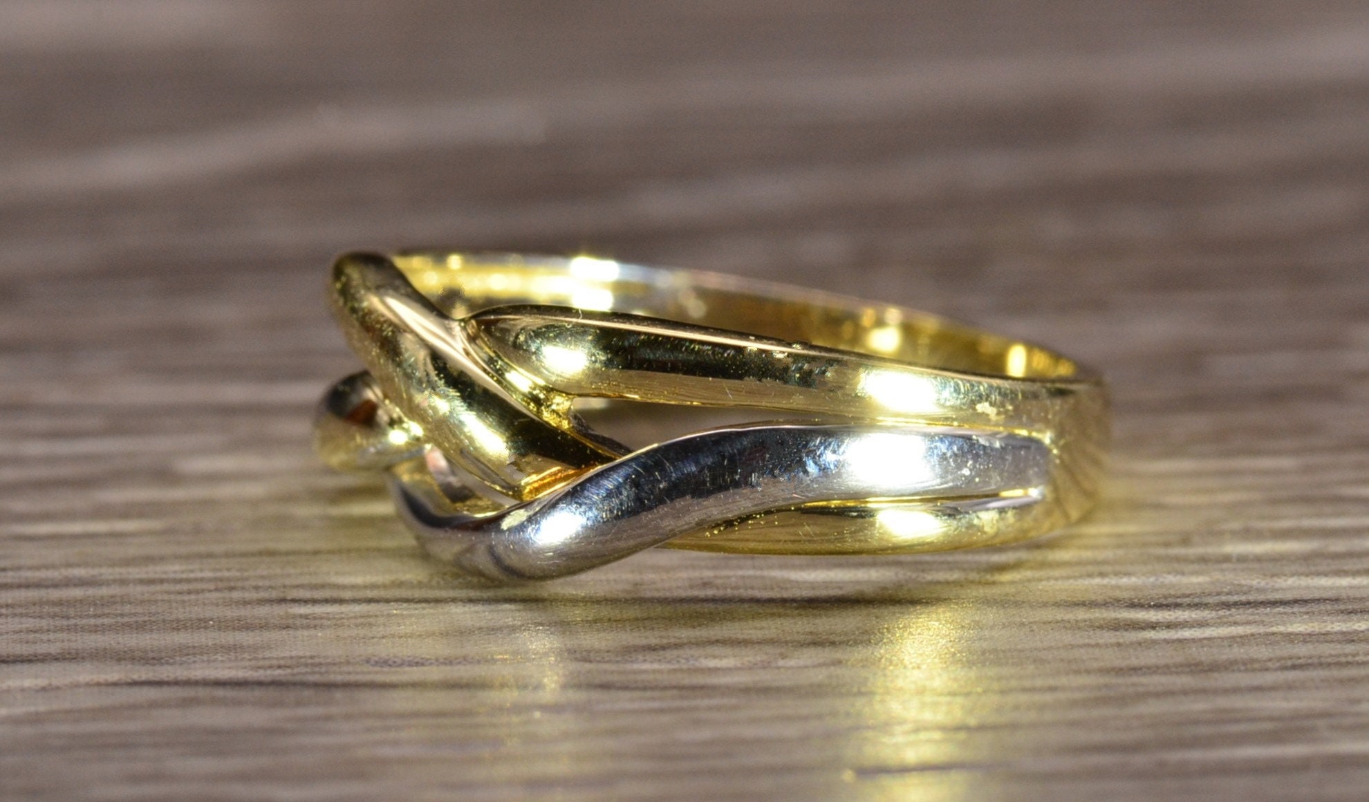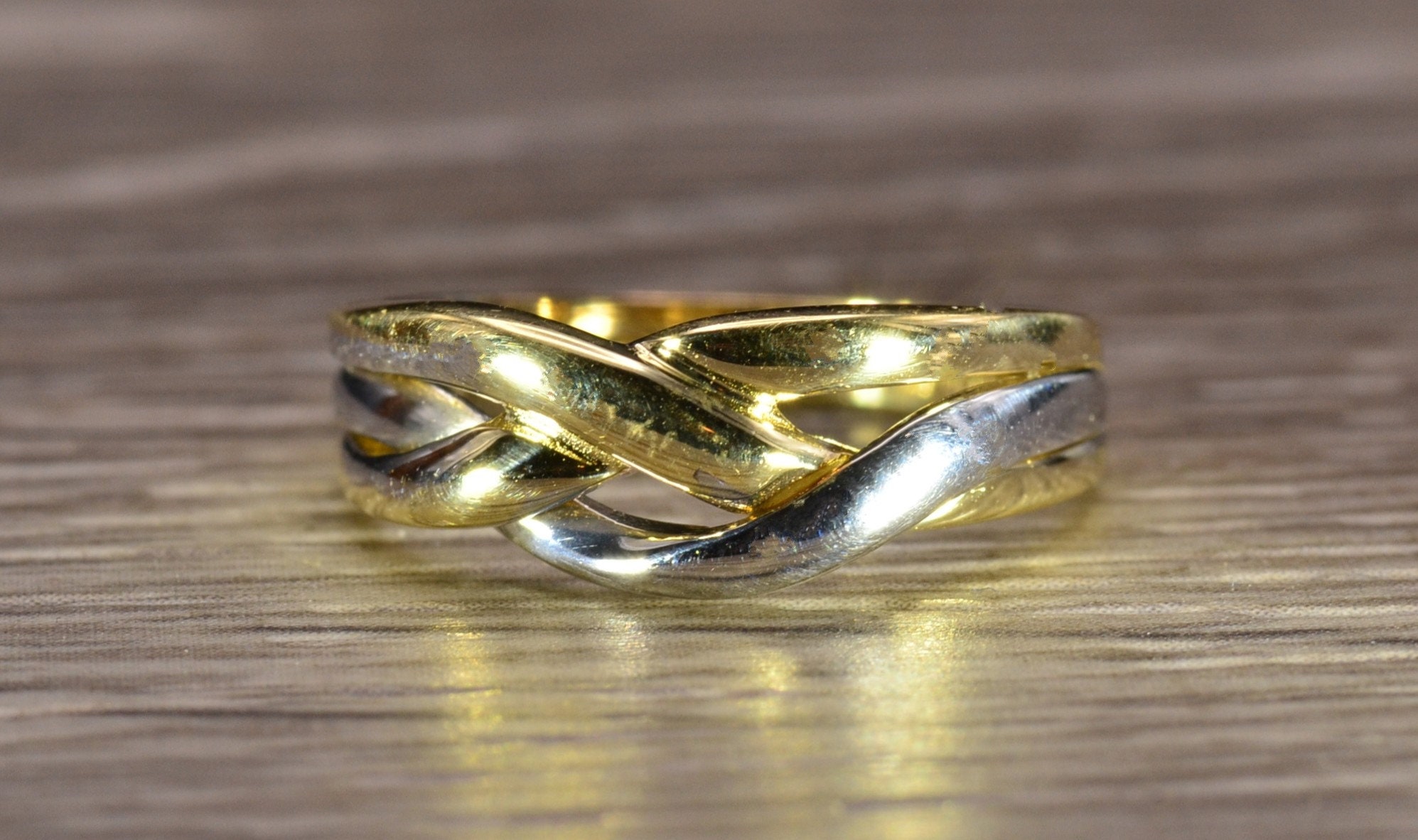 The Caddo Beach: Ladies 14K Two Tone Crossover Band. Crafted in 14 karat gold, this ring features white and yellow gold crossover sections. Currently a finger size 6.25, this ring can be resized for an additional charge.