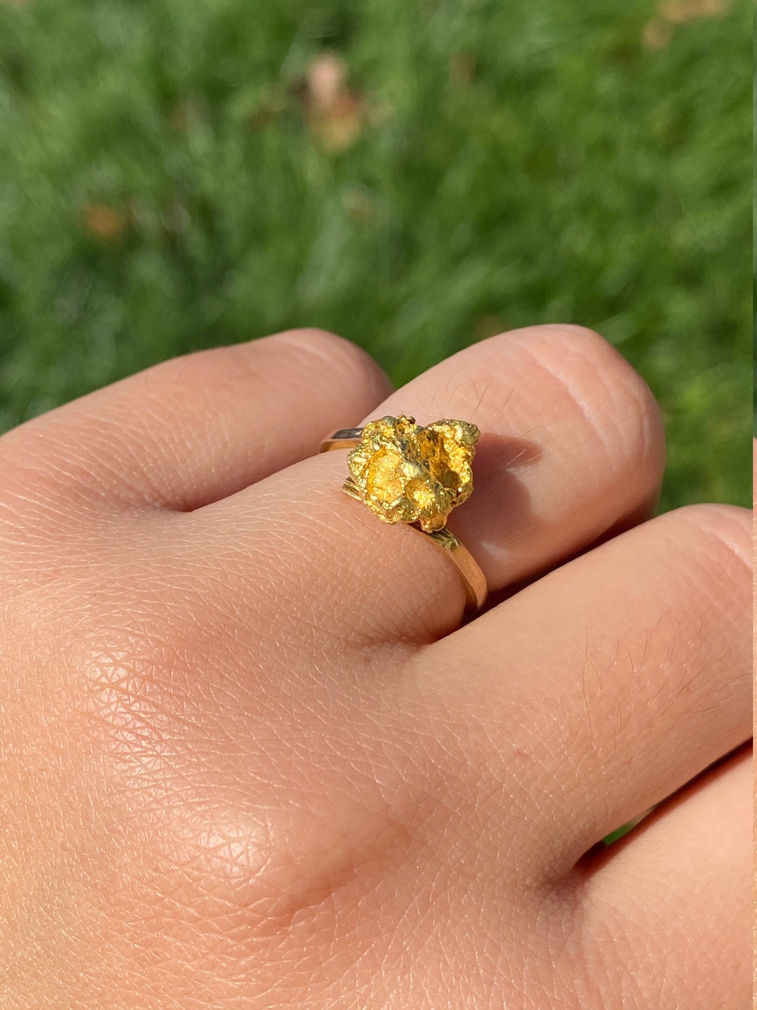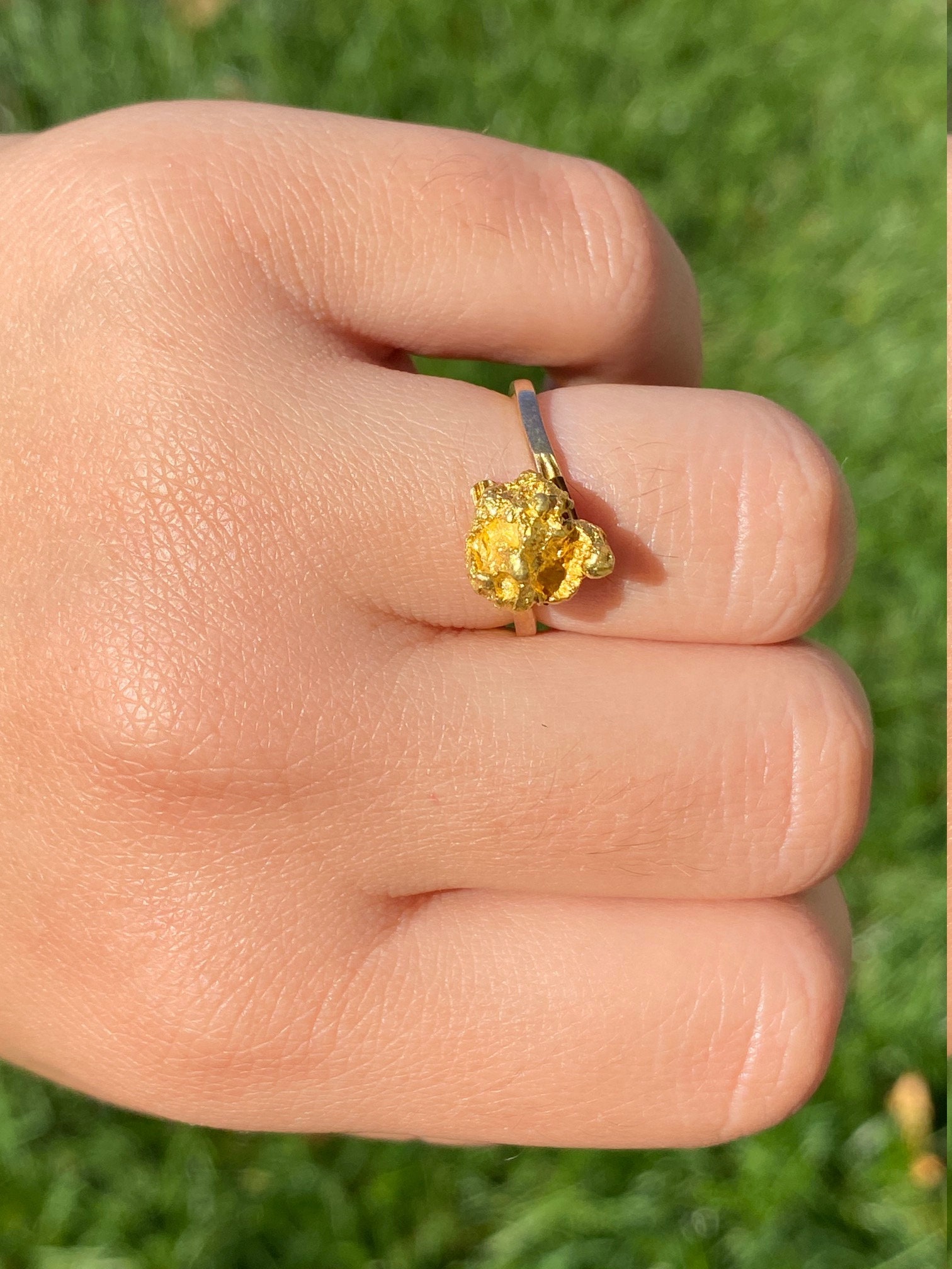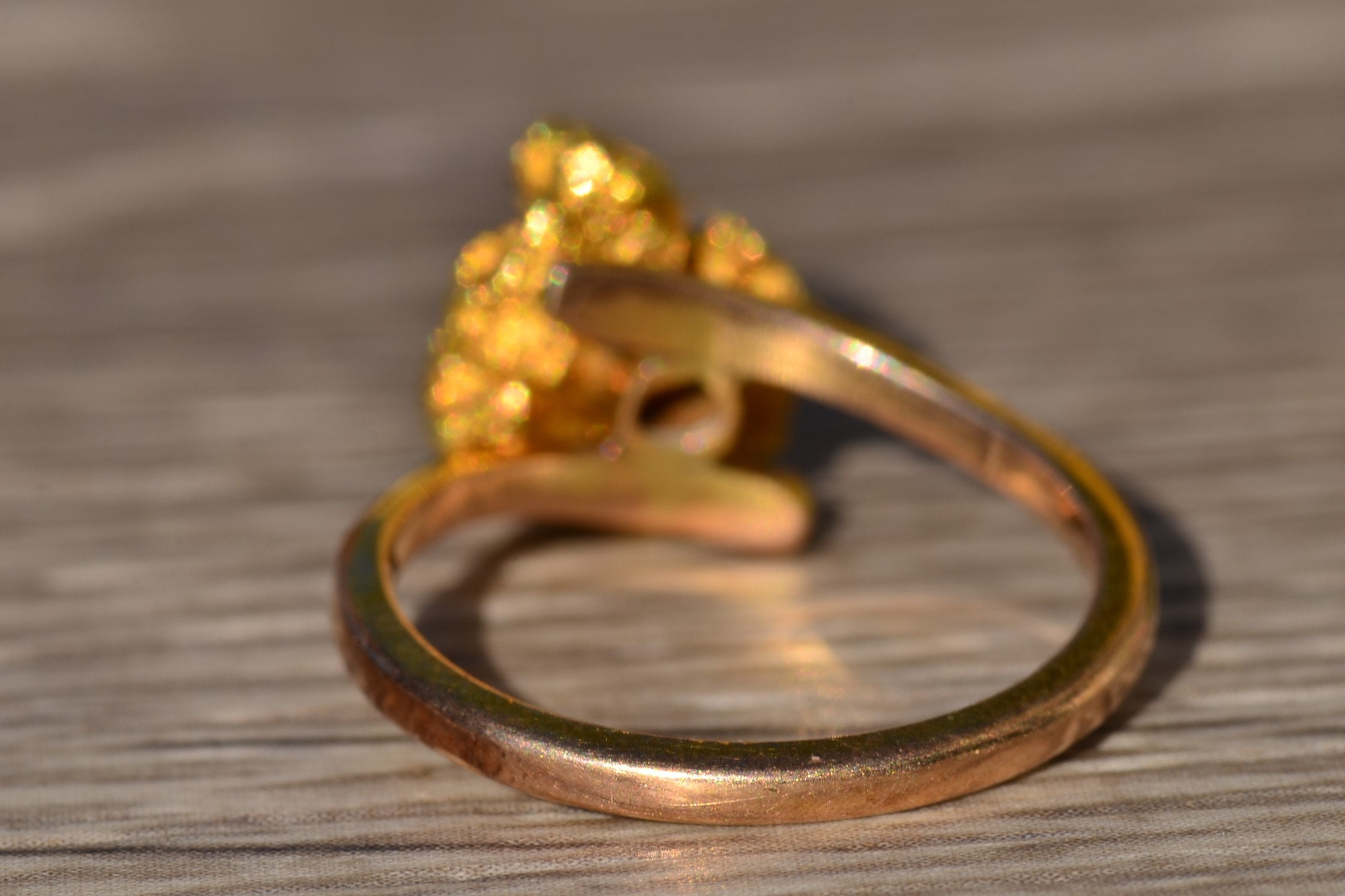 Unique Ladies Yellow Gold Natural Gold Nugget Bypass Ring. This ring is stunningly crafted in 14 and natural 24 karat yellow gold. The gold placer nugget sits up between a bypass style shank. The ring is currently a finger size 6.25, yet can be adjusted in size.