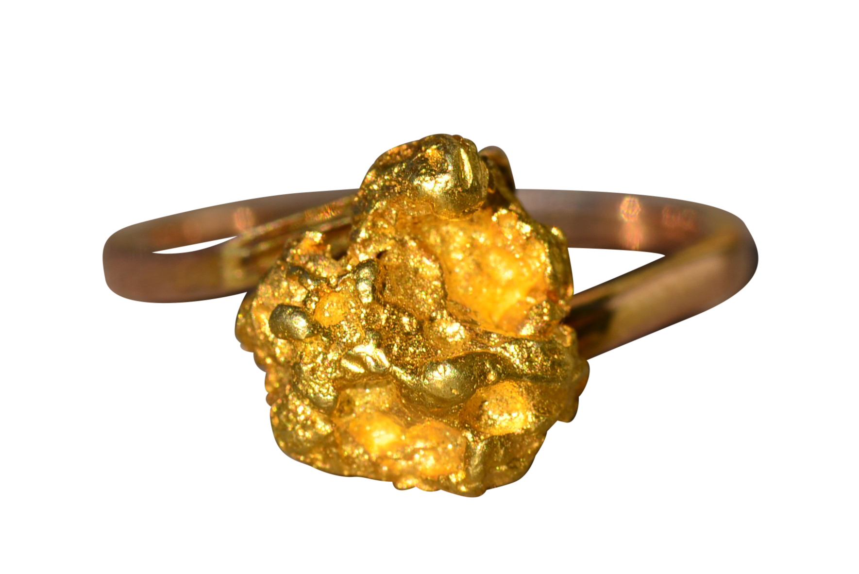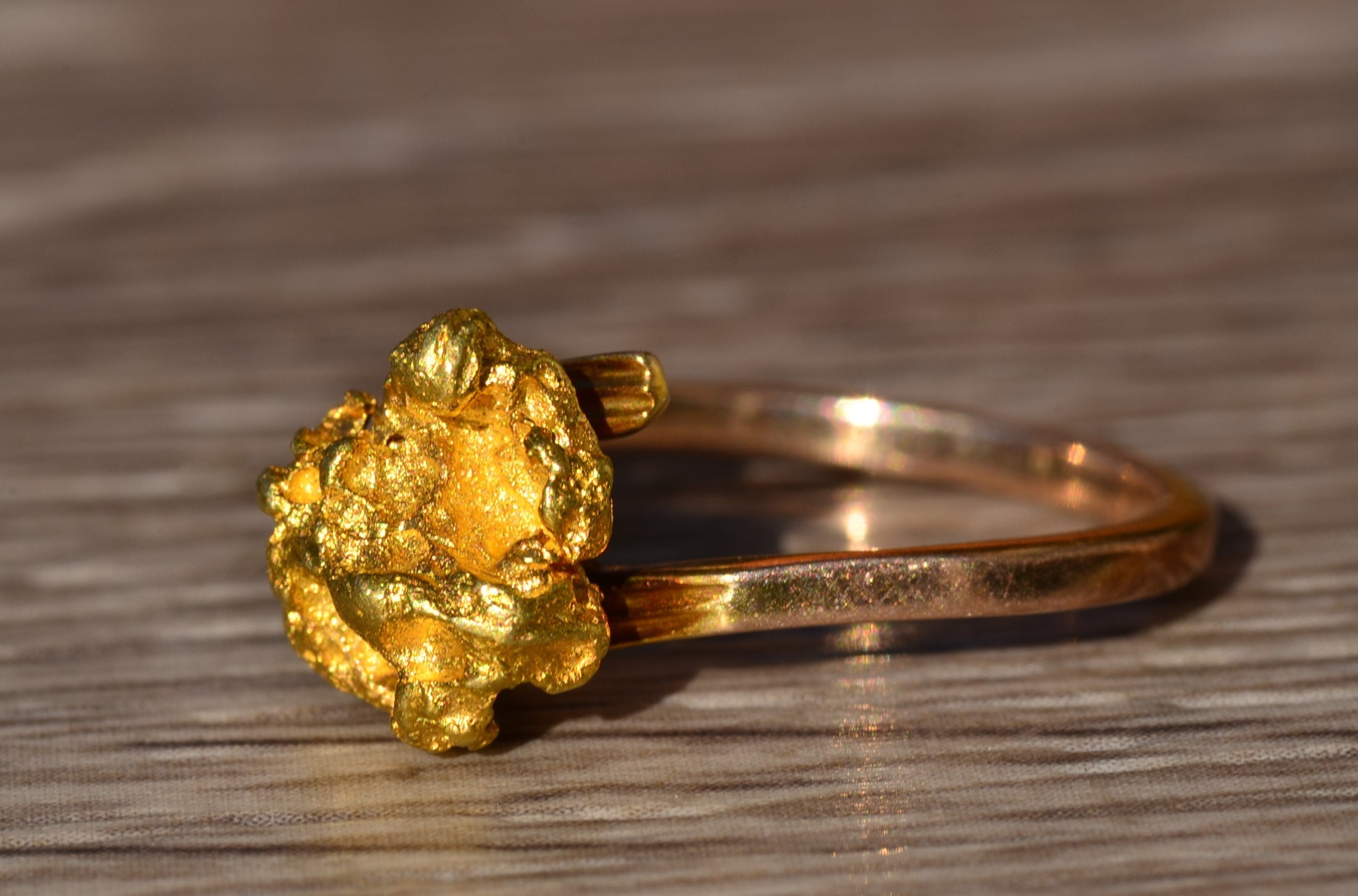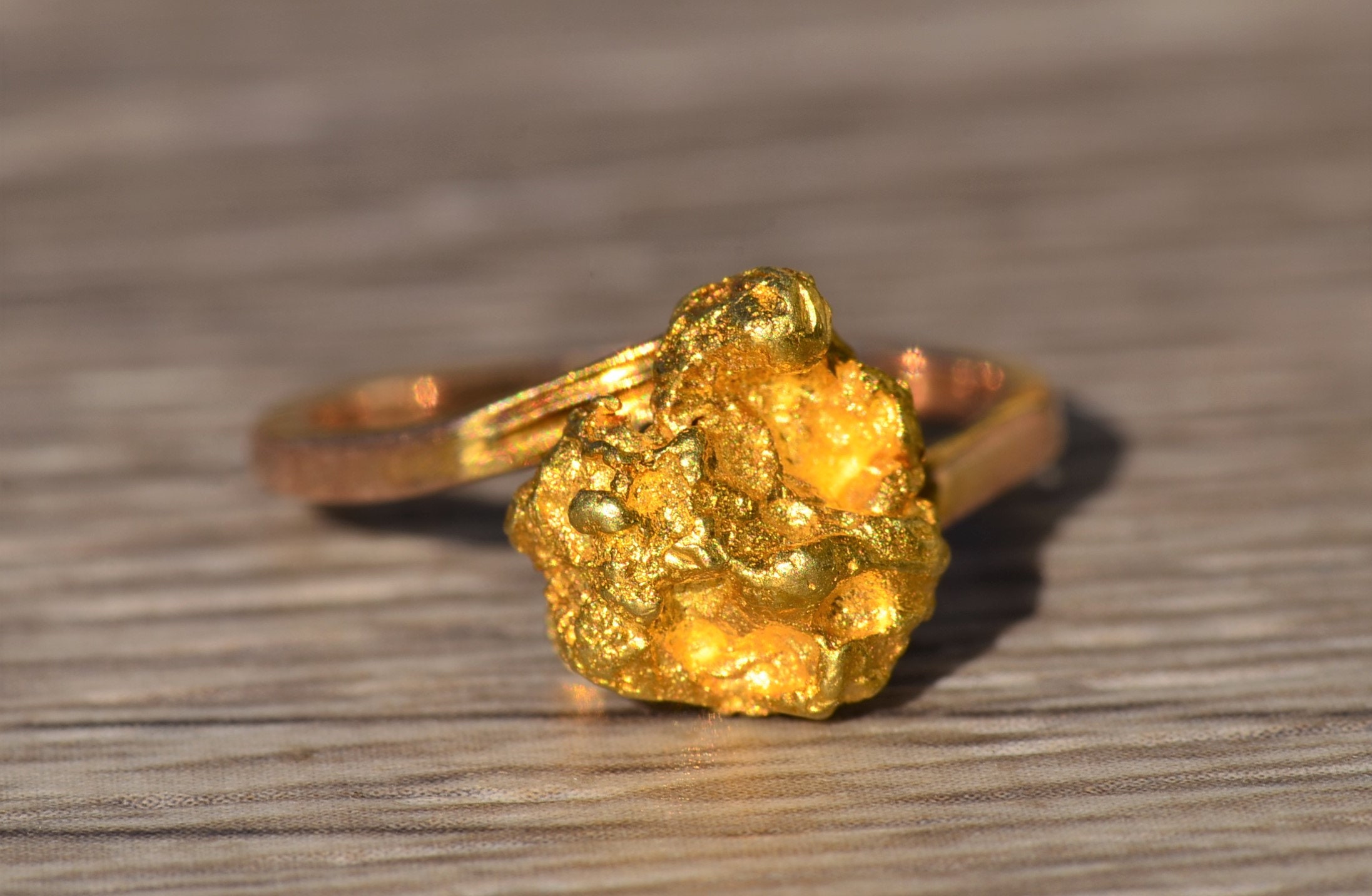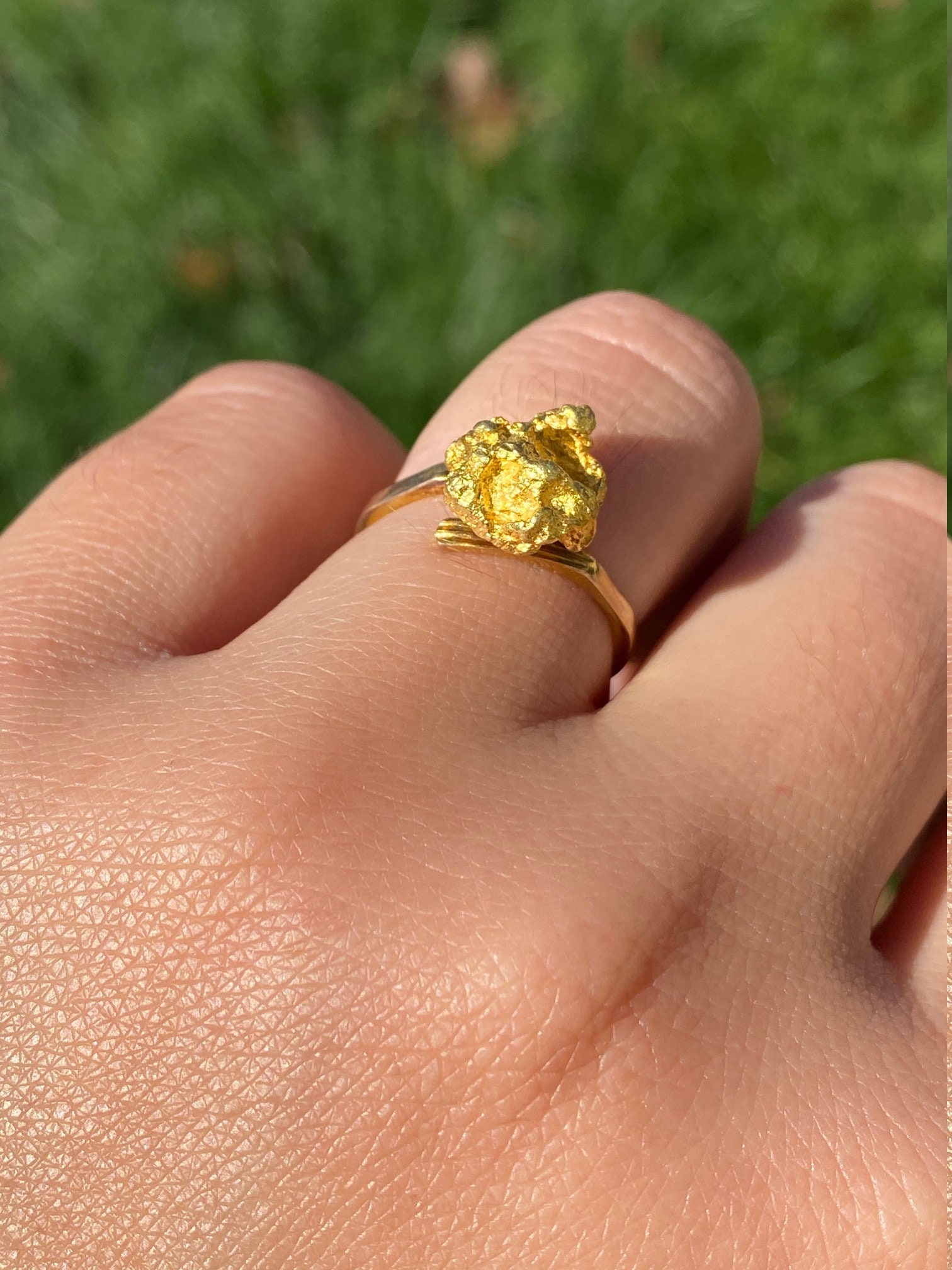 Unique Ladies Yellow Gold Natural Gold Nugget Bypass Ring. This ring is stunningly crafted in 14 and natural 24 karat yellow gold. The gold placer nugget sits up between a bypass style shank. The ring is currently a finger size 6.25, yet can be adjusted in size.