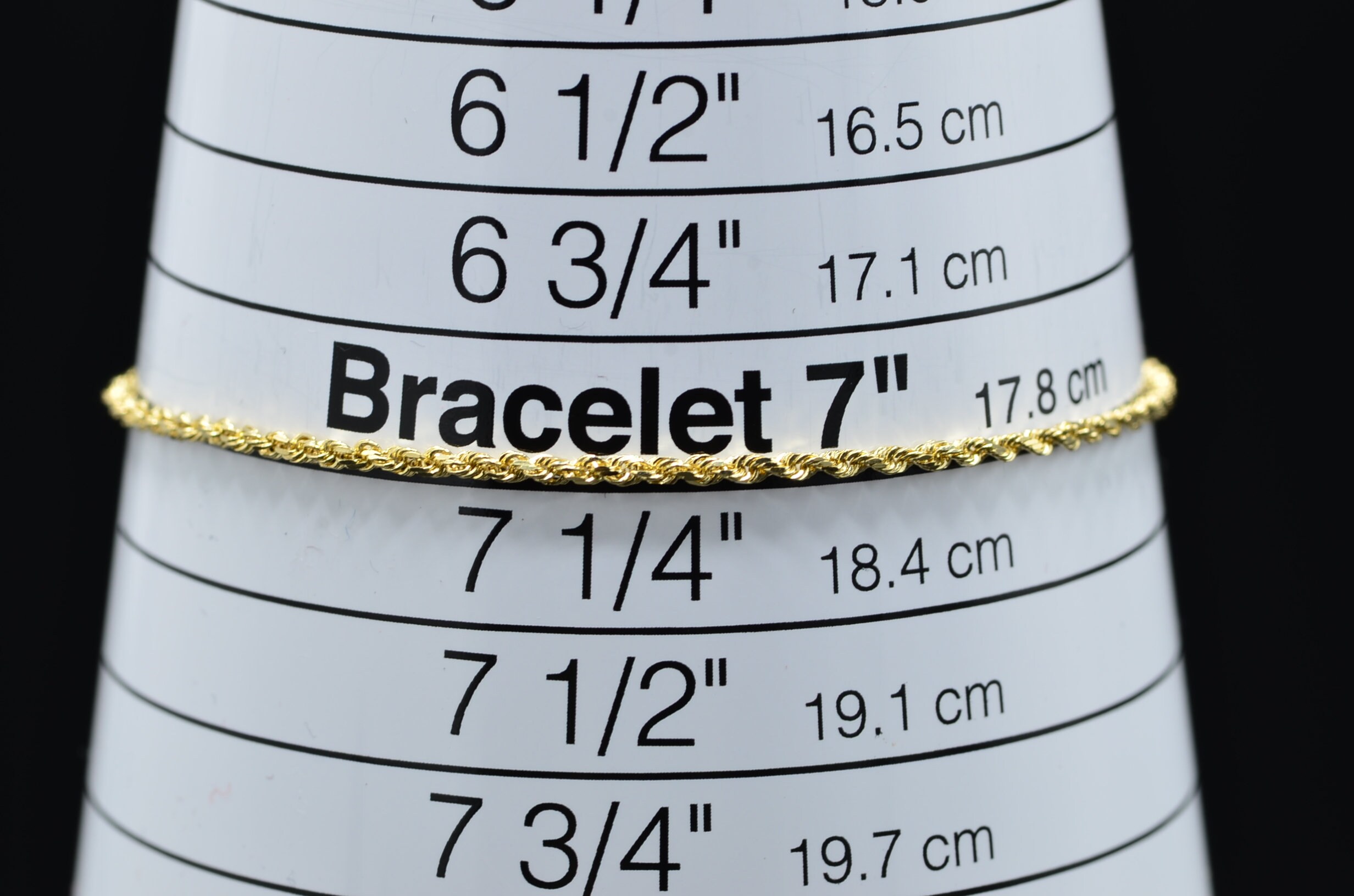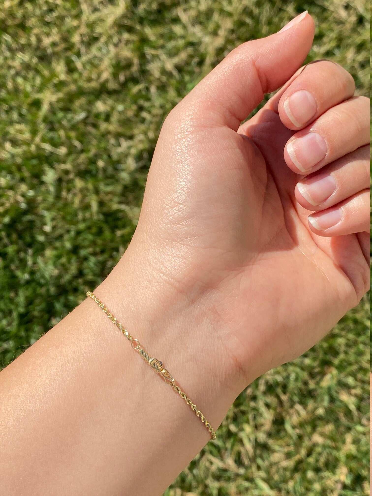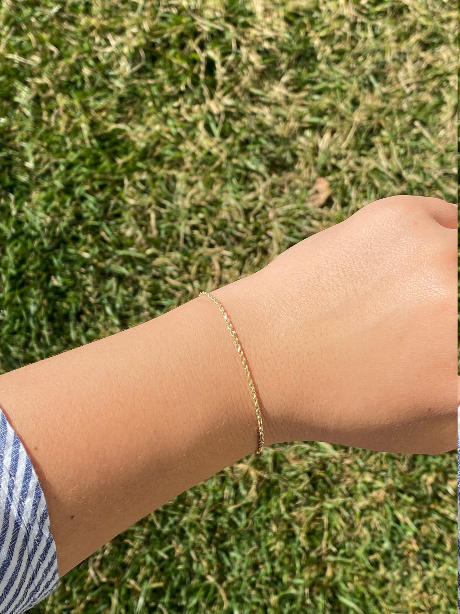 Simple Yellow Gold Thin Twisted Rope Bracelet. This delicate bracelet is crafted in 14 karat yellow gold and features a twisted rope style design. Measuring 7 inches in length, this bracelet makes the perfect addition to your favorite stack.