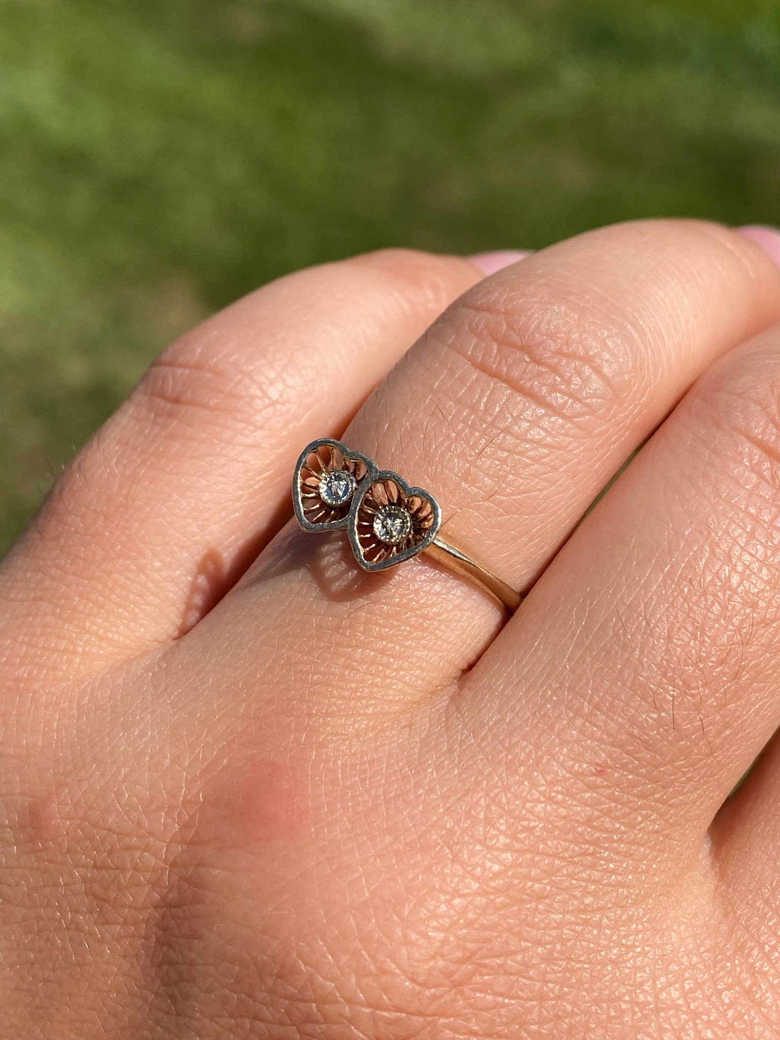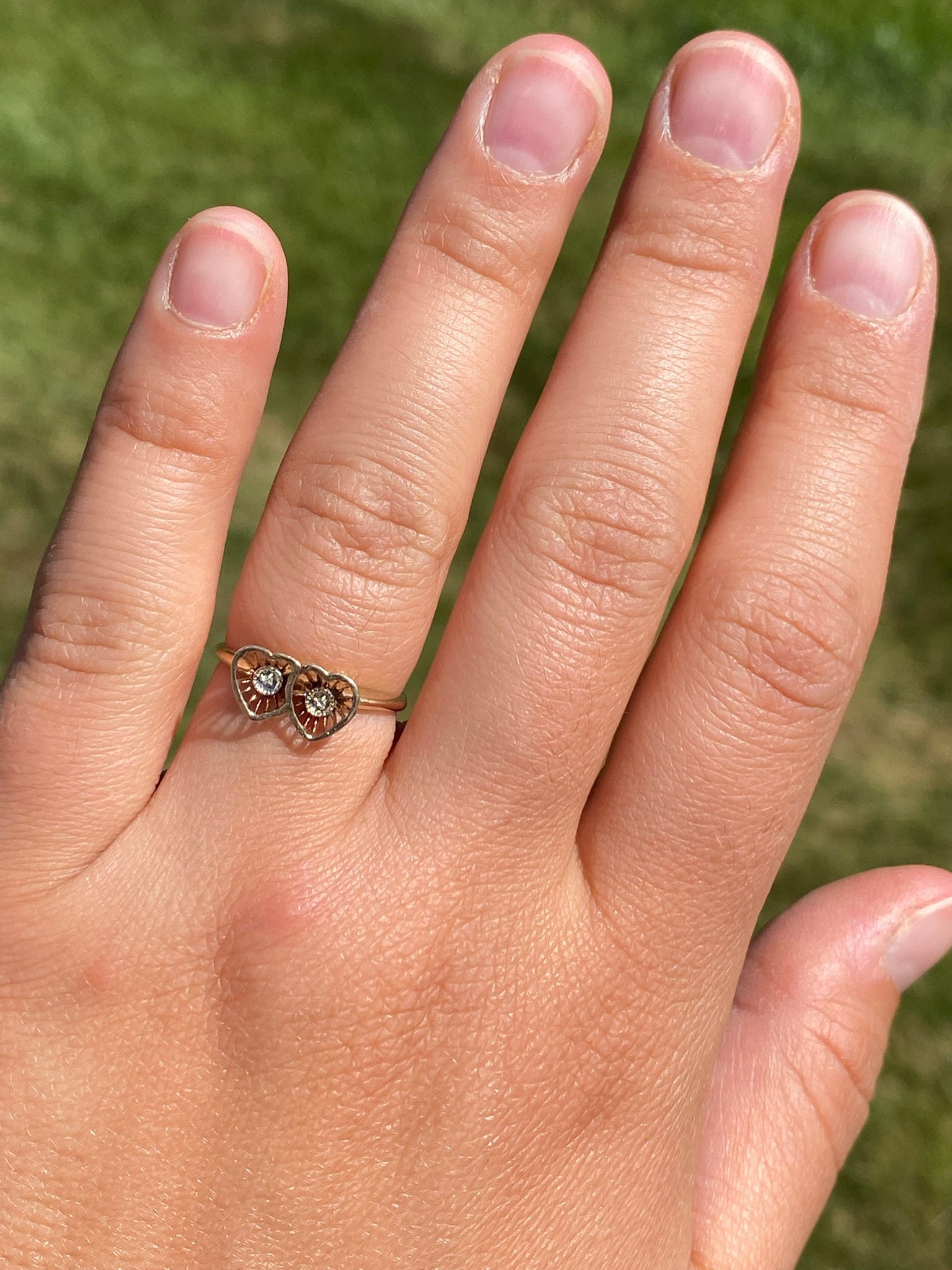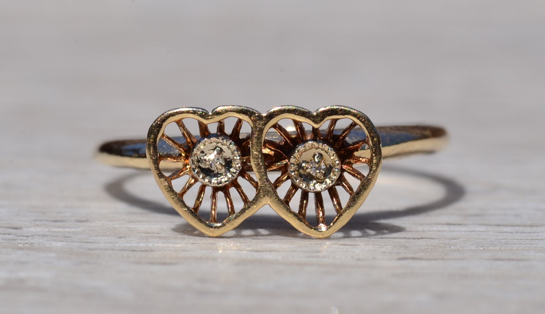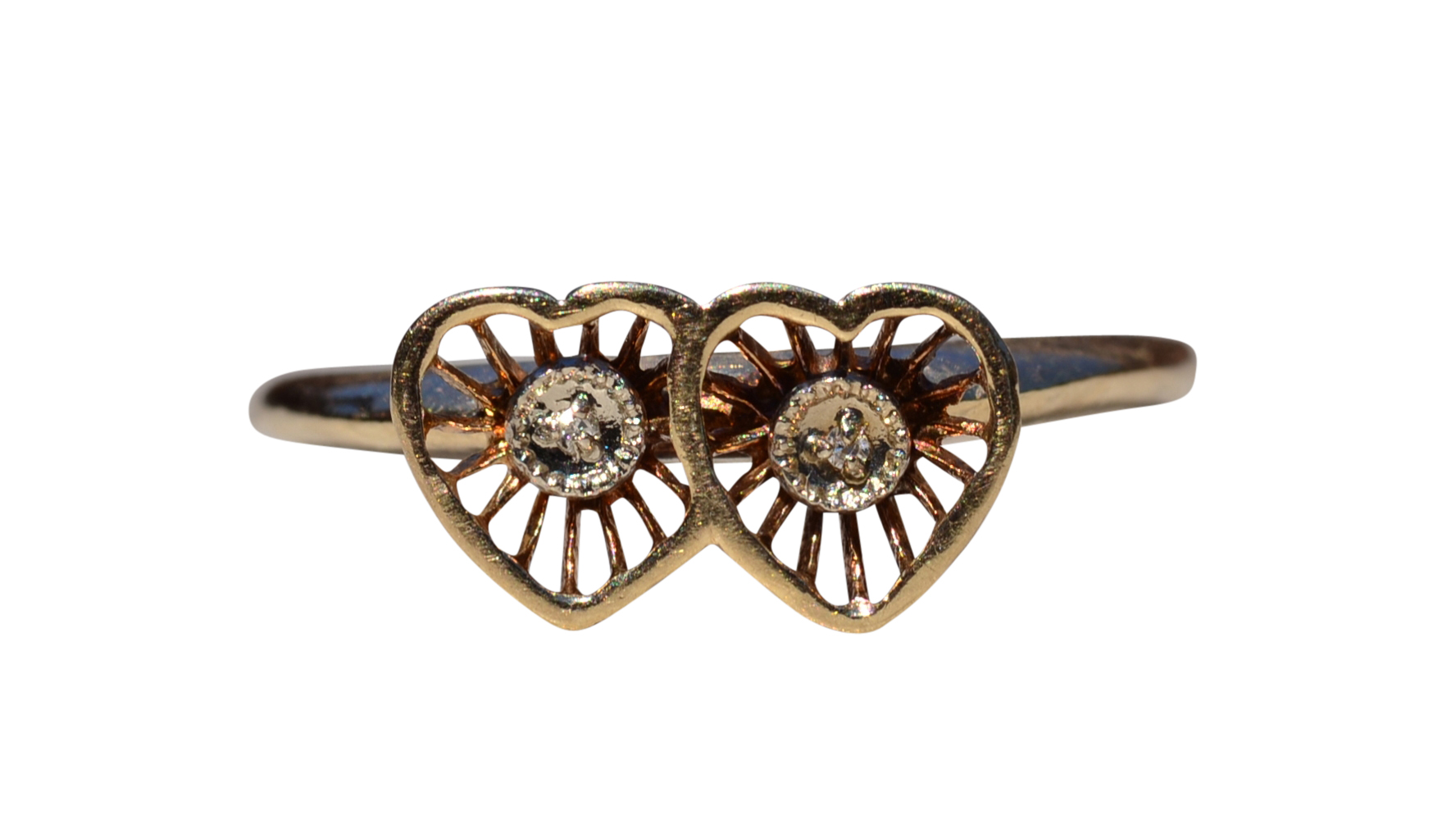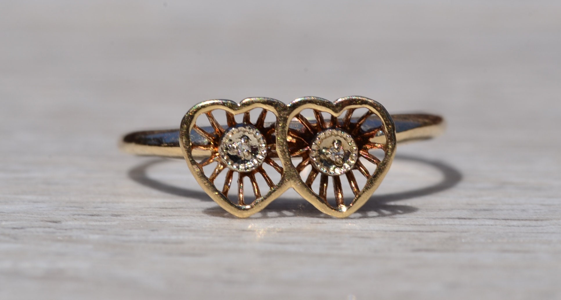 The Calwa: Antique Toi Et Moi Diamond Ring. The ring features two center diamonds in the center of two connected hearts. The hearts have lined filigree and a delicate frame to complete the look. The ring is crafted in 14 karat yellow gold and contains the maker’s hallmarks however we have not quite identified the craftsman yet. The ring is currently a finger size 6 yet can be adjusted to any finger size for an additional charge on request.