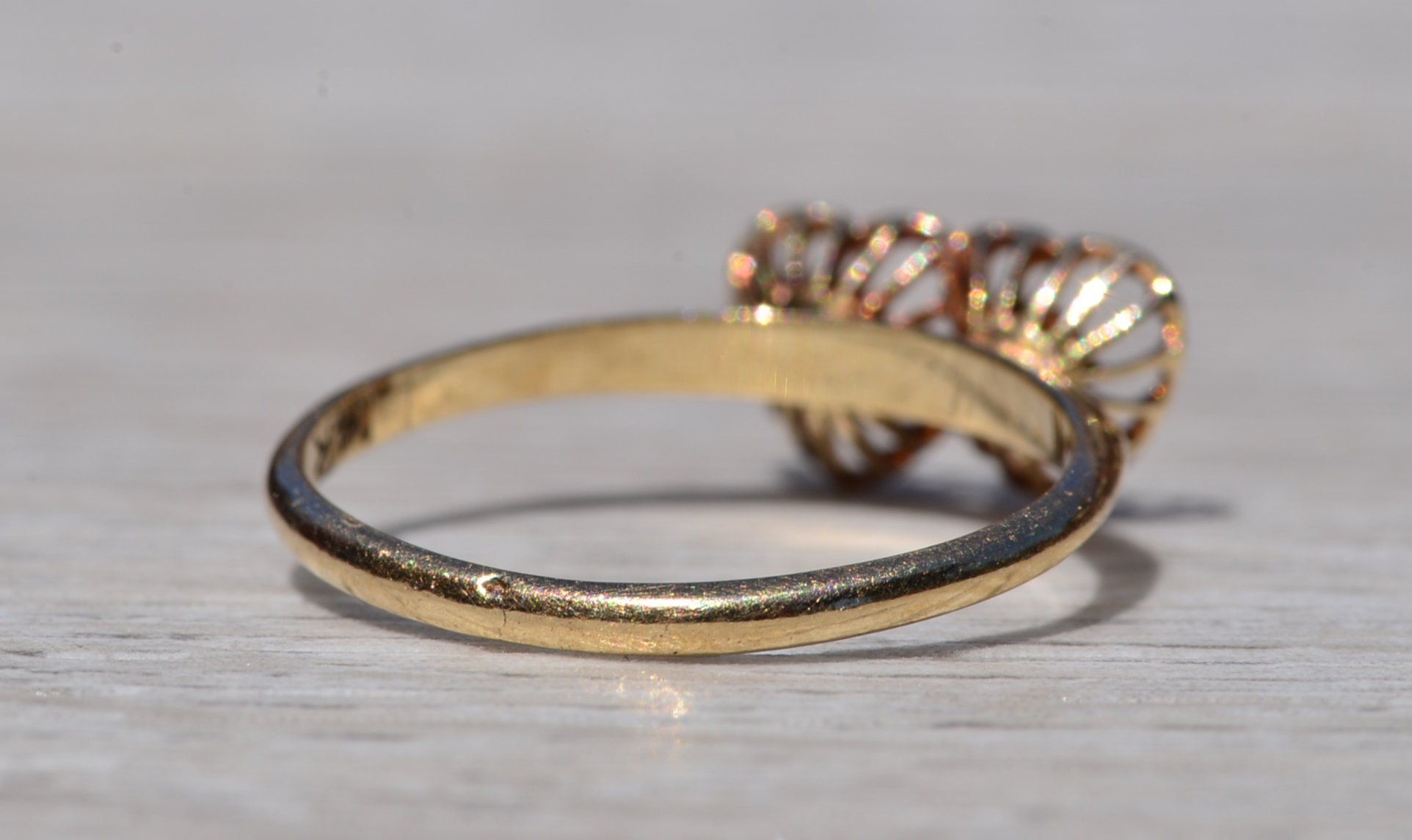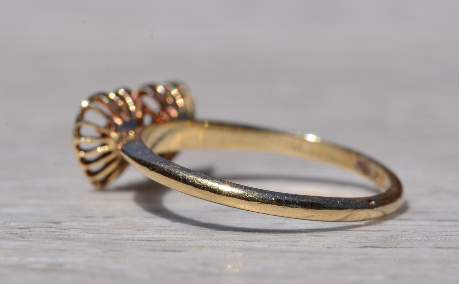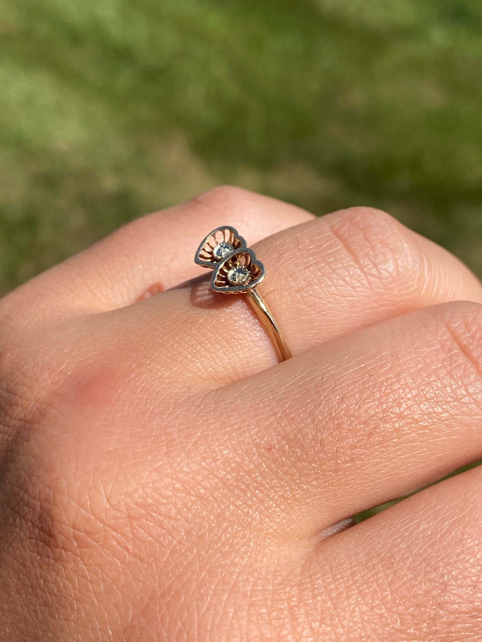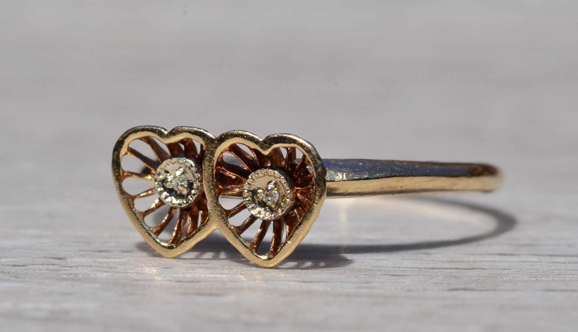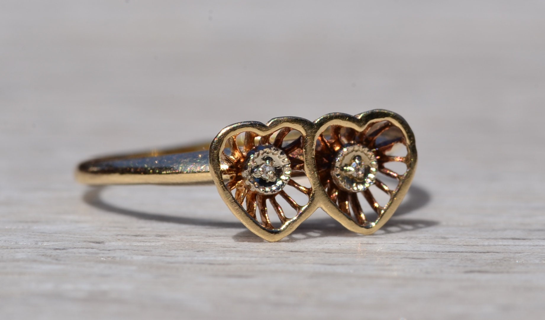 The Calwa: Antique Toi Et Moi Diamond Ring. The ring features two center diamonds in the center of two connected hearts. The hearts have lined filigree and a delicate frame to complete the look. The ring is crafted in 14 karat yellow gold and contains the maker’s hallmarks however we have not quite identified the craftsman yet. The ring is currently a finger size 6 yet can be adjusted to any finger size for an additional charge on request.