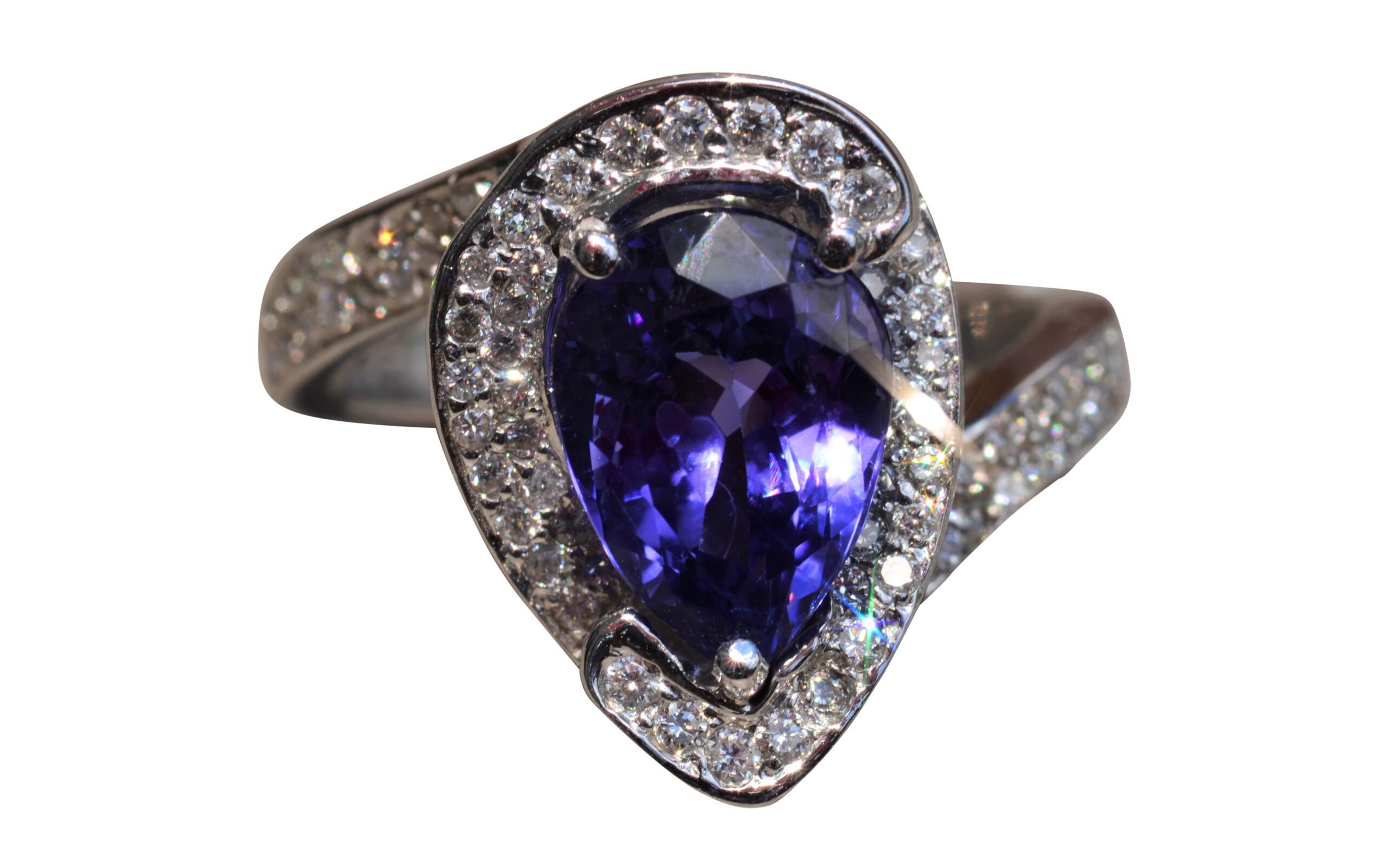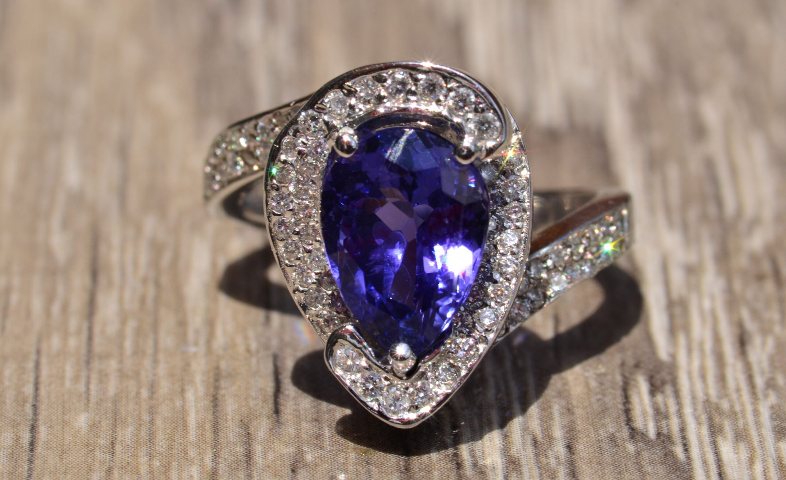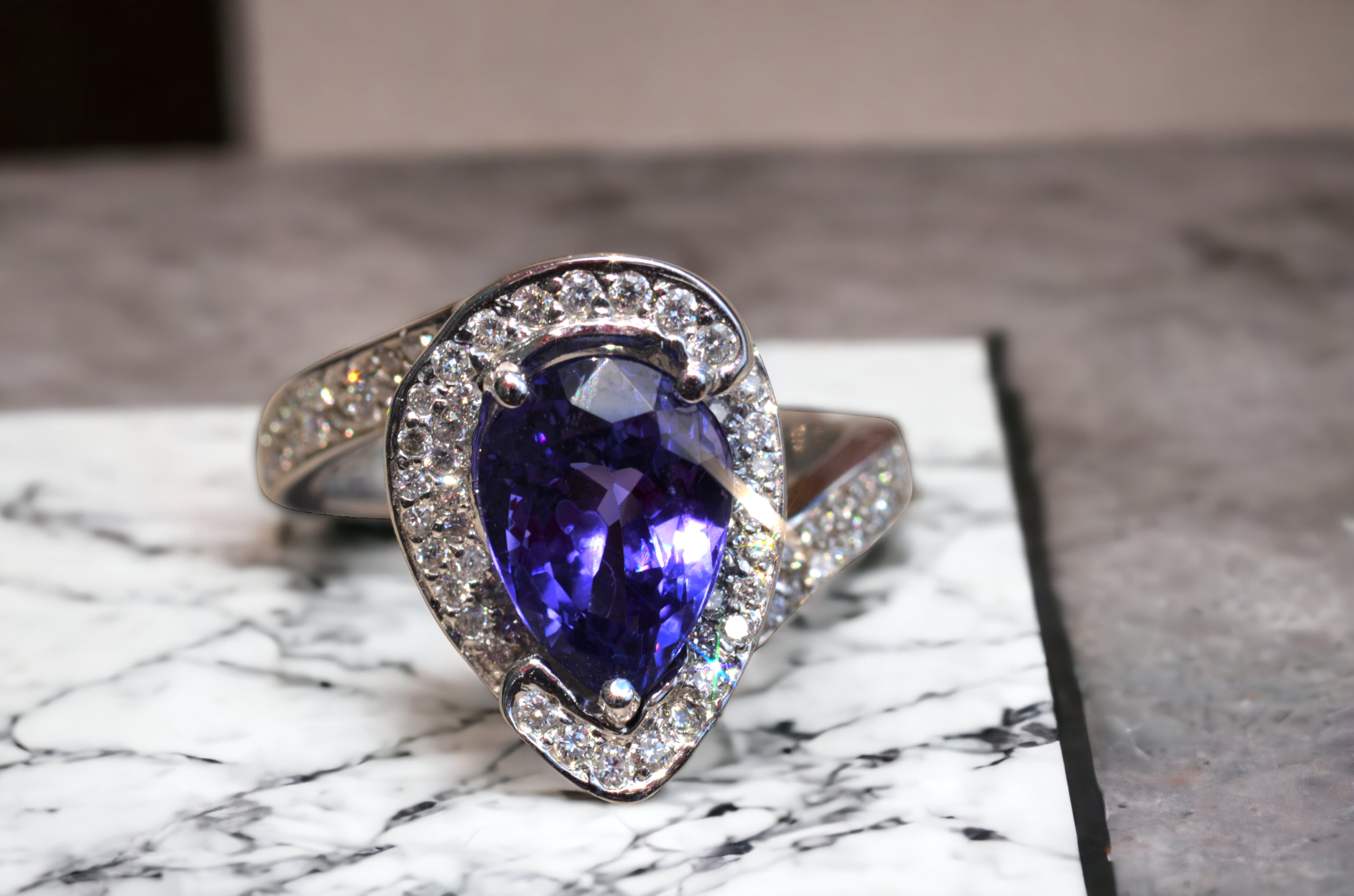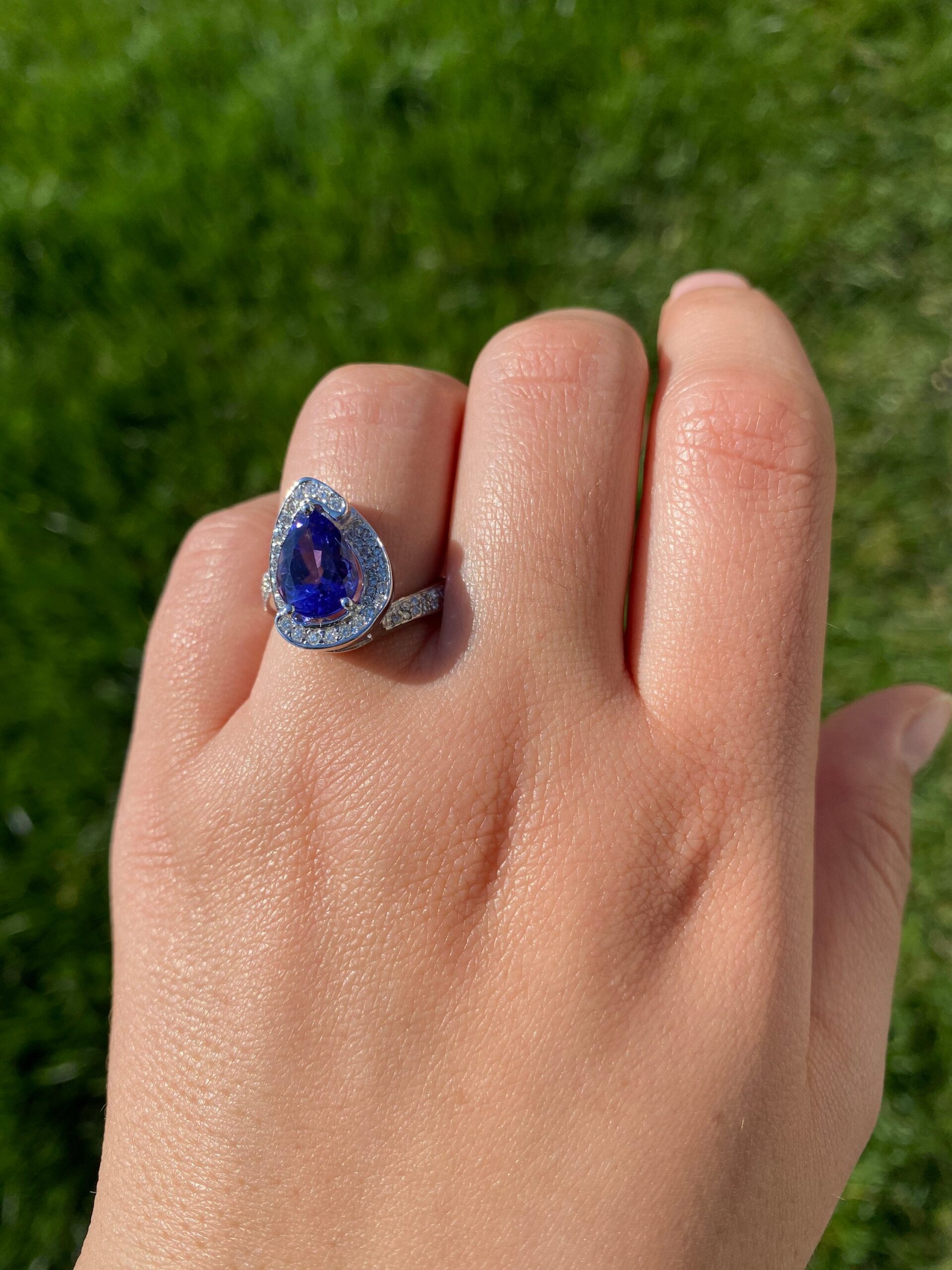 The Cambridge: Pear Shaped Tanzanite & Diamond Halo Ring - Jewelry Memo