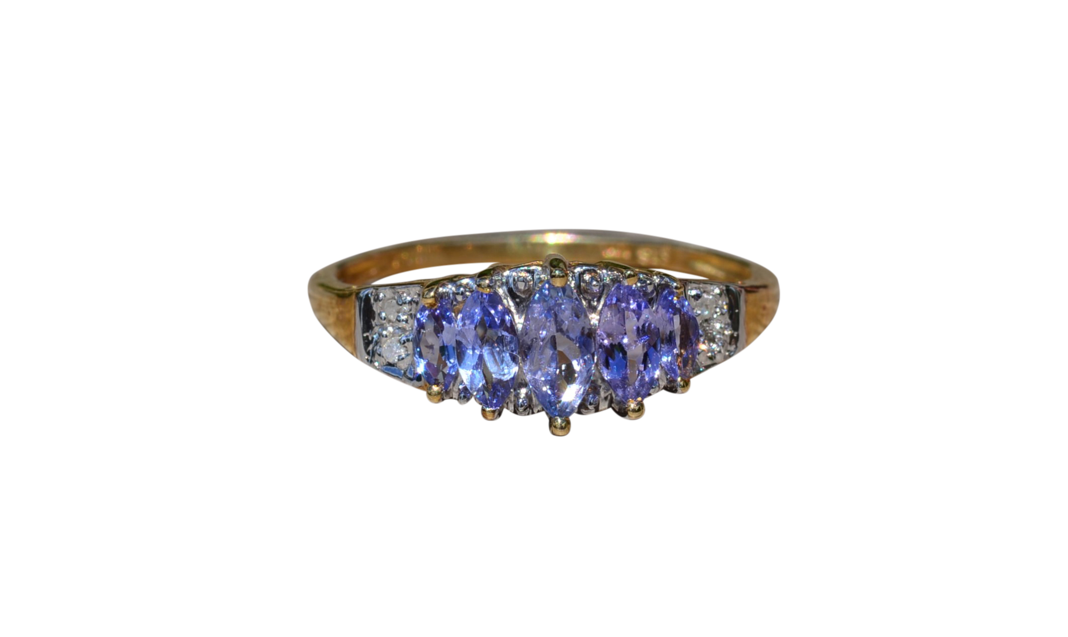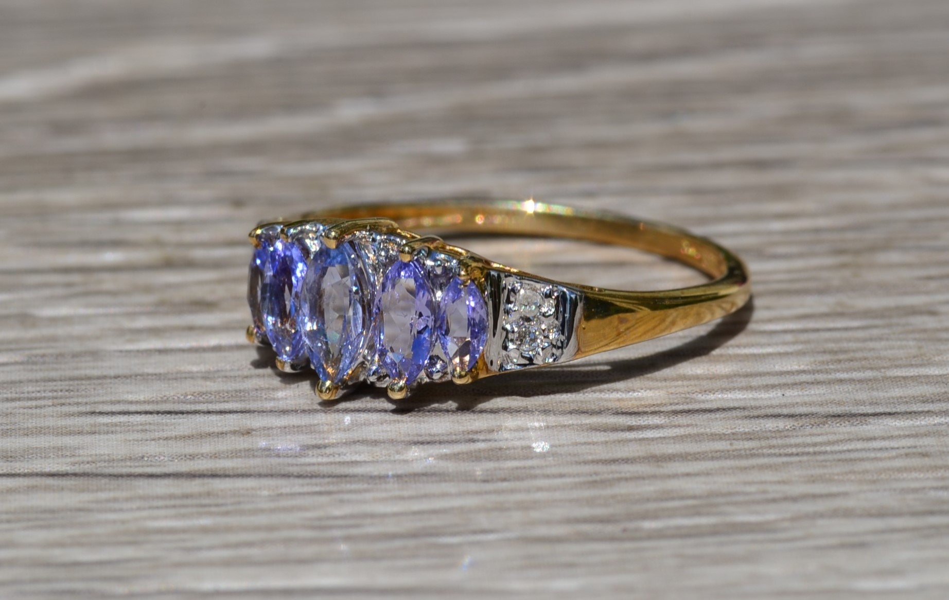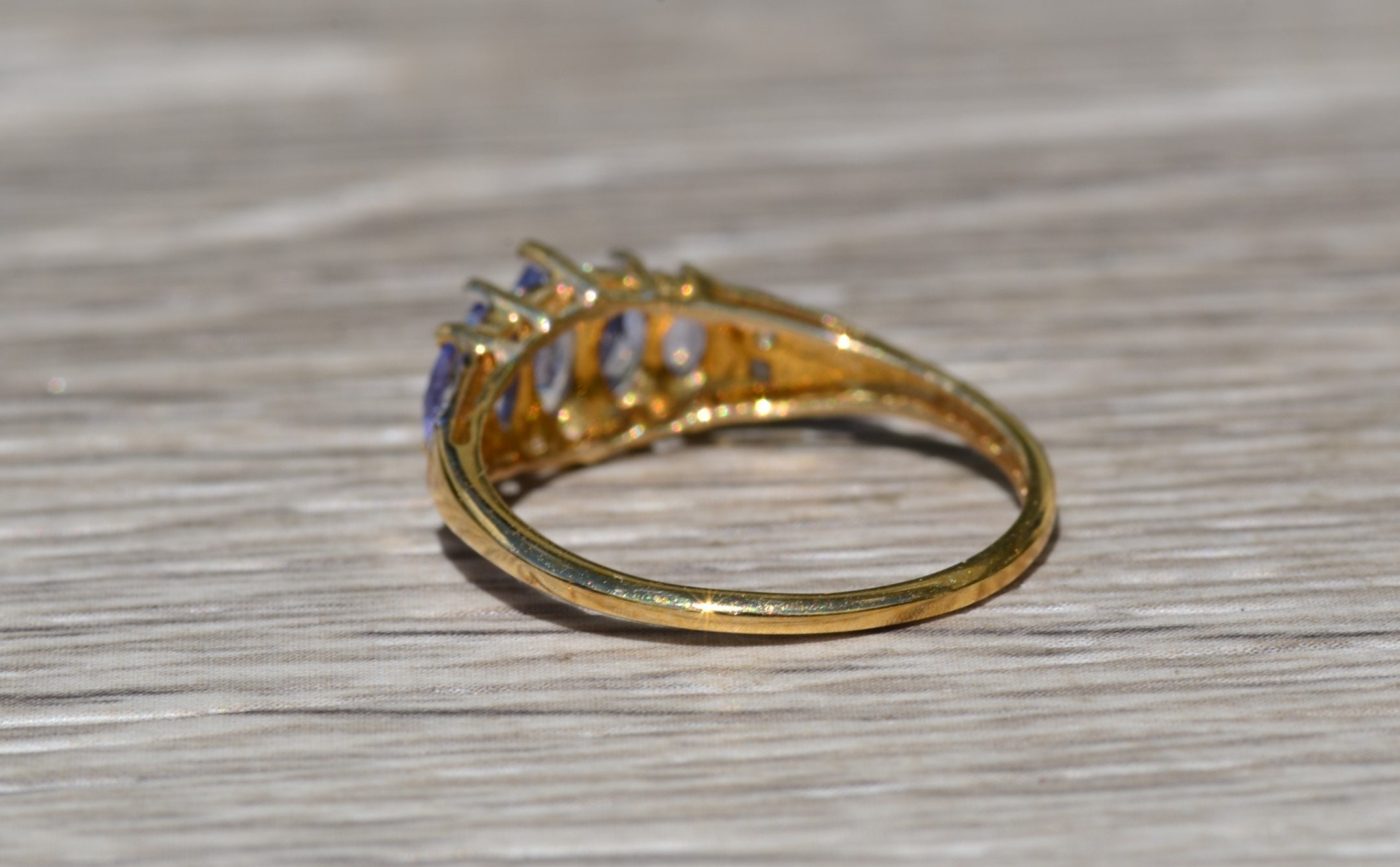Ladies Yellow Gold Cocktail Ring set with Marquise Cut Tanzanite and Diamonds. Crafted in desirable yellow gold, this ladies ring features five marquise cut tanzanite center stones amount to a total of 0.64 carats. Two small diamonds accent each end of the center. Currently a finger size 7.25, this ring can be resized for an additional charge upon request.