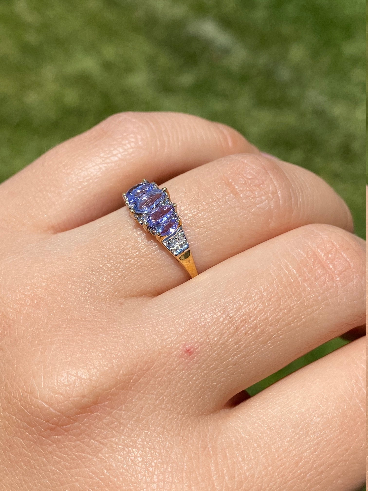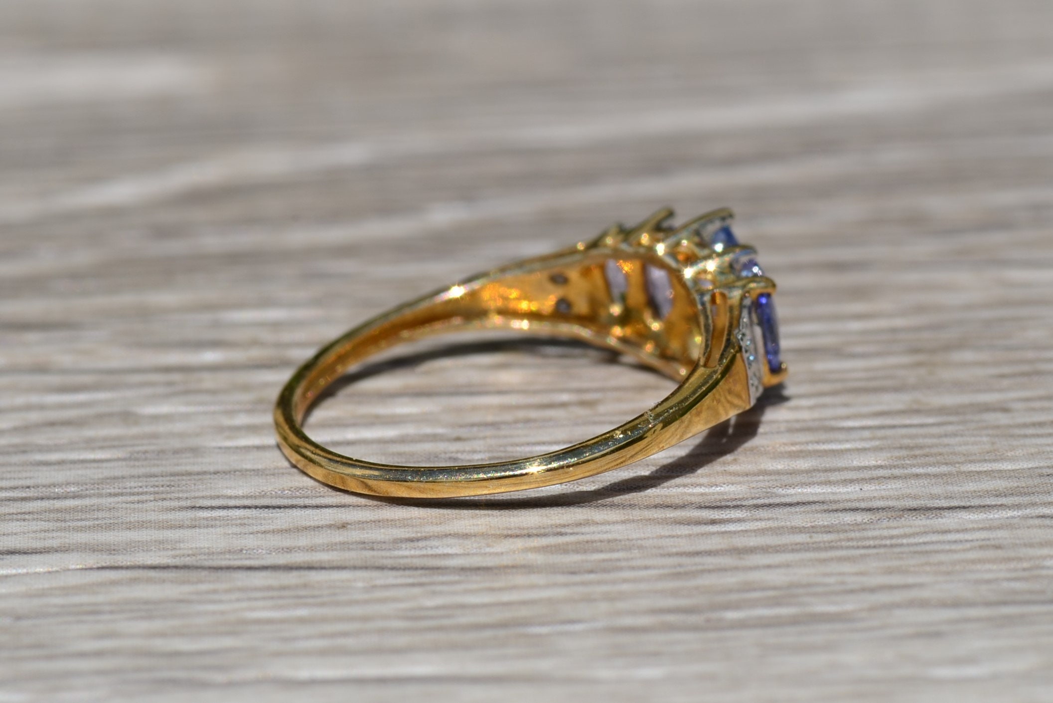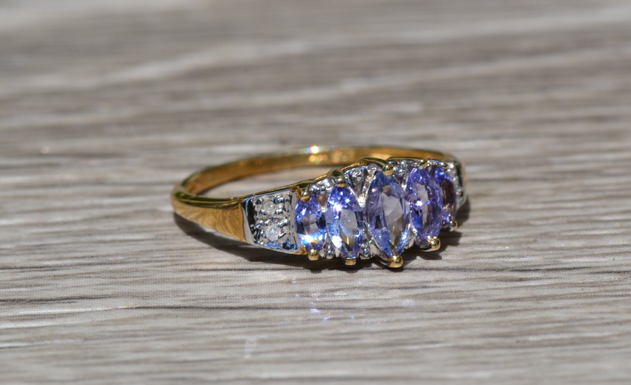 Ladies Yellow Gold Cocktail Ring set with Marquise Cut Tanzanite and Diamonds. Crafted in desirable yellow gold, this ladies ring features five marquise cut tanzanite center stones amount to a total of 0.64 carats. Two small diamonds accent each end of the center. Currently a finger size 7.25, this ring can be resized for an additional charge upon request.