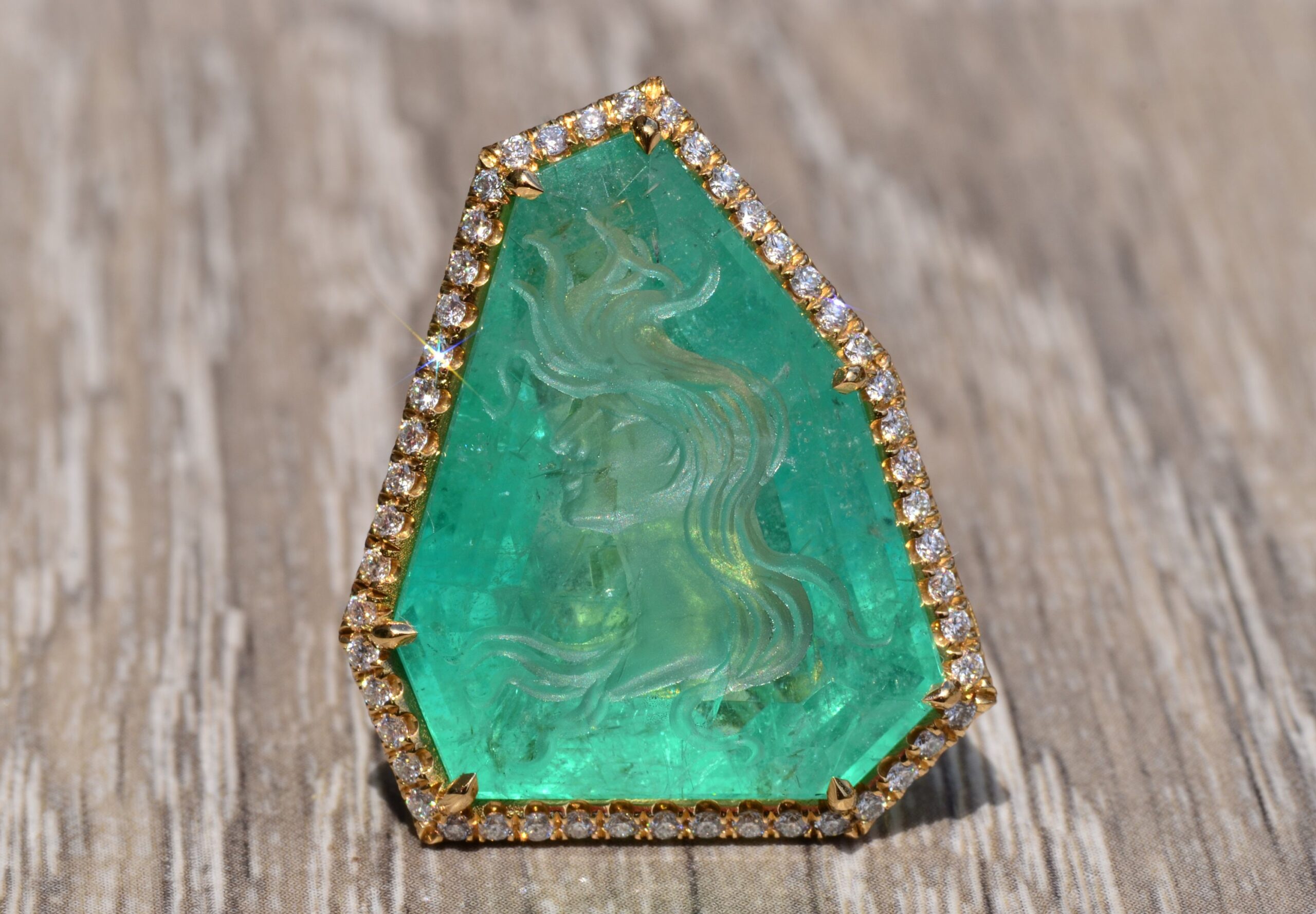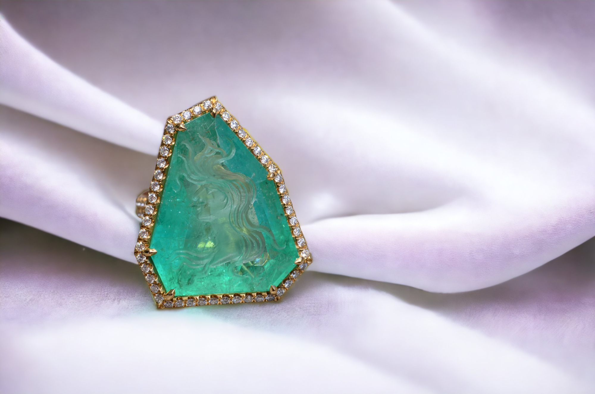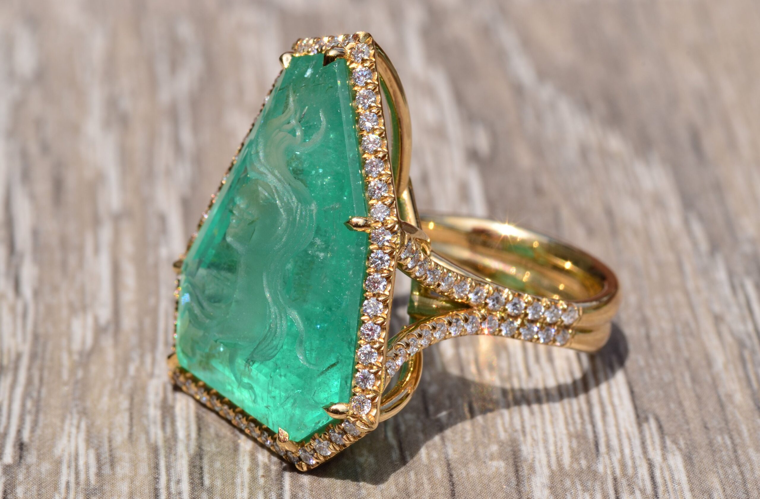 The Cascade: Russian Intaglio Emerald in 18 Karat Yellow Gold Set with Diamonds