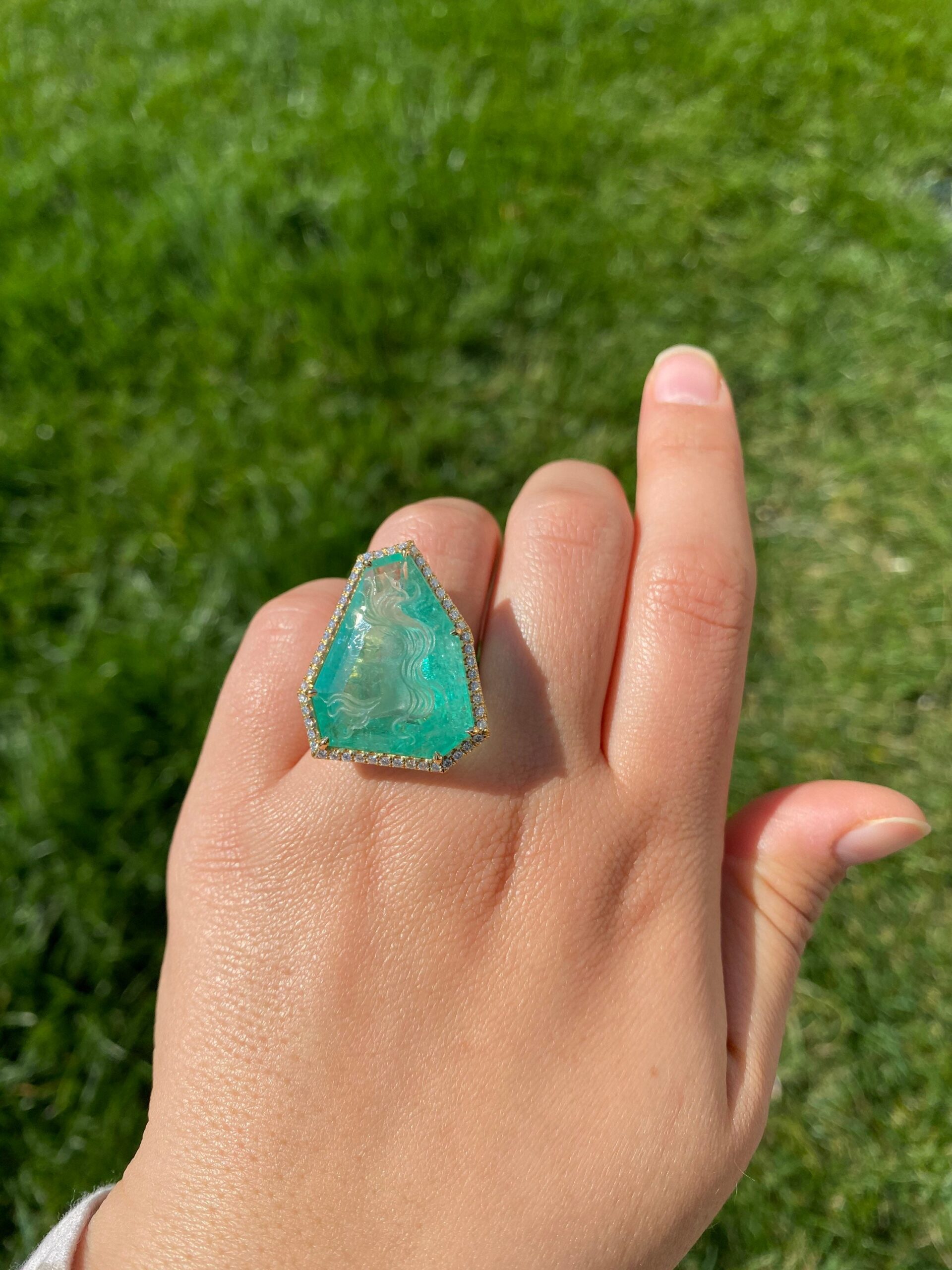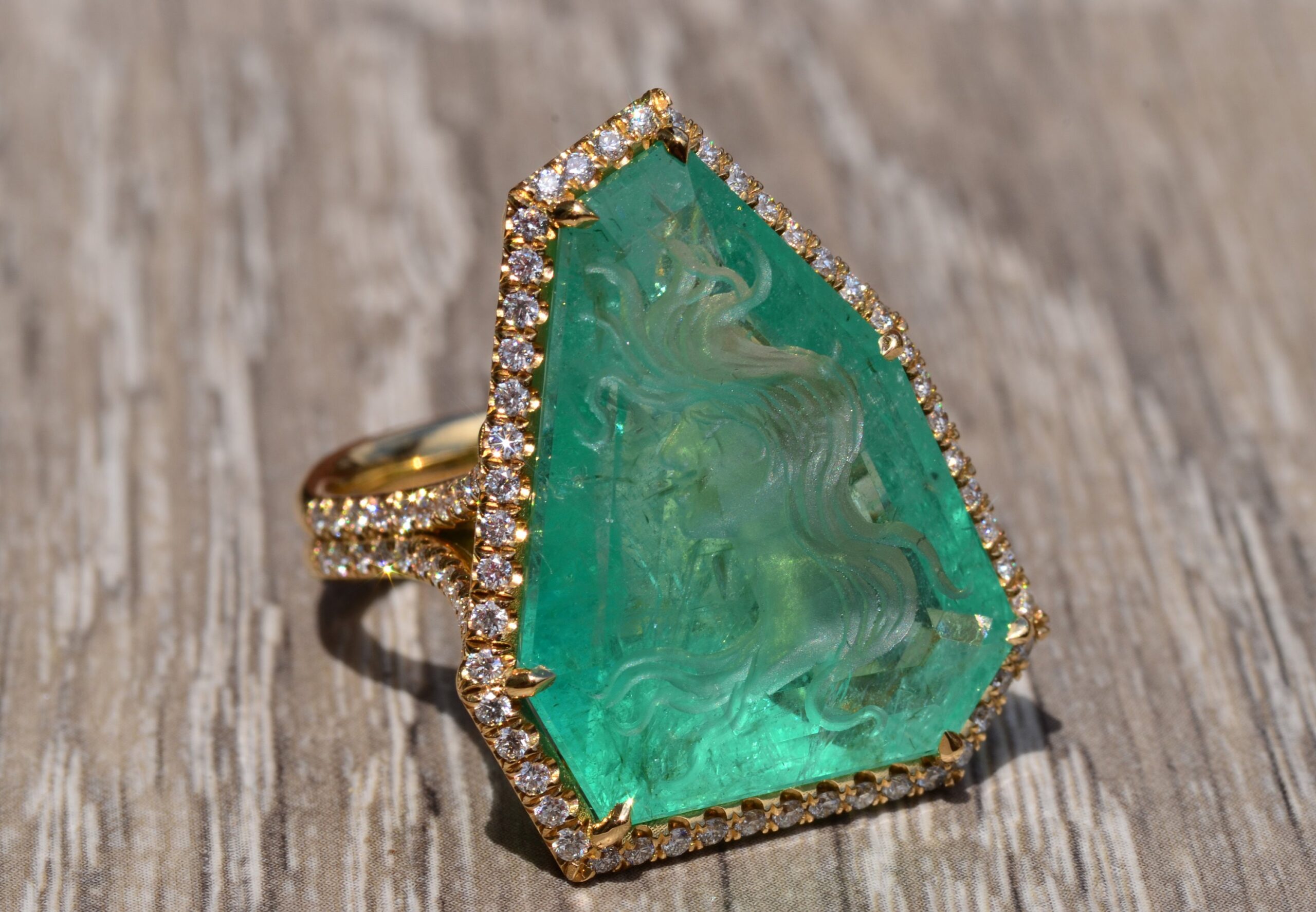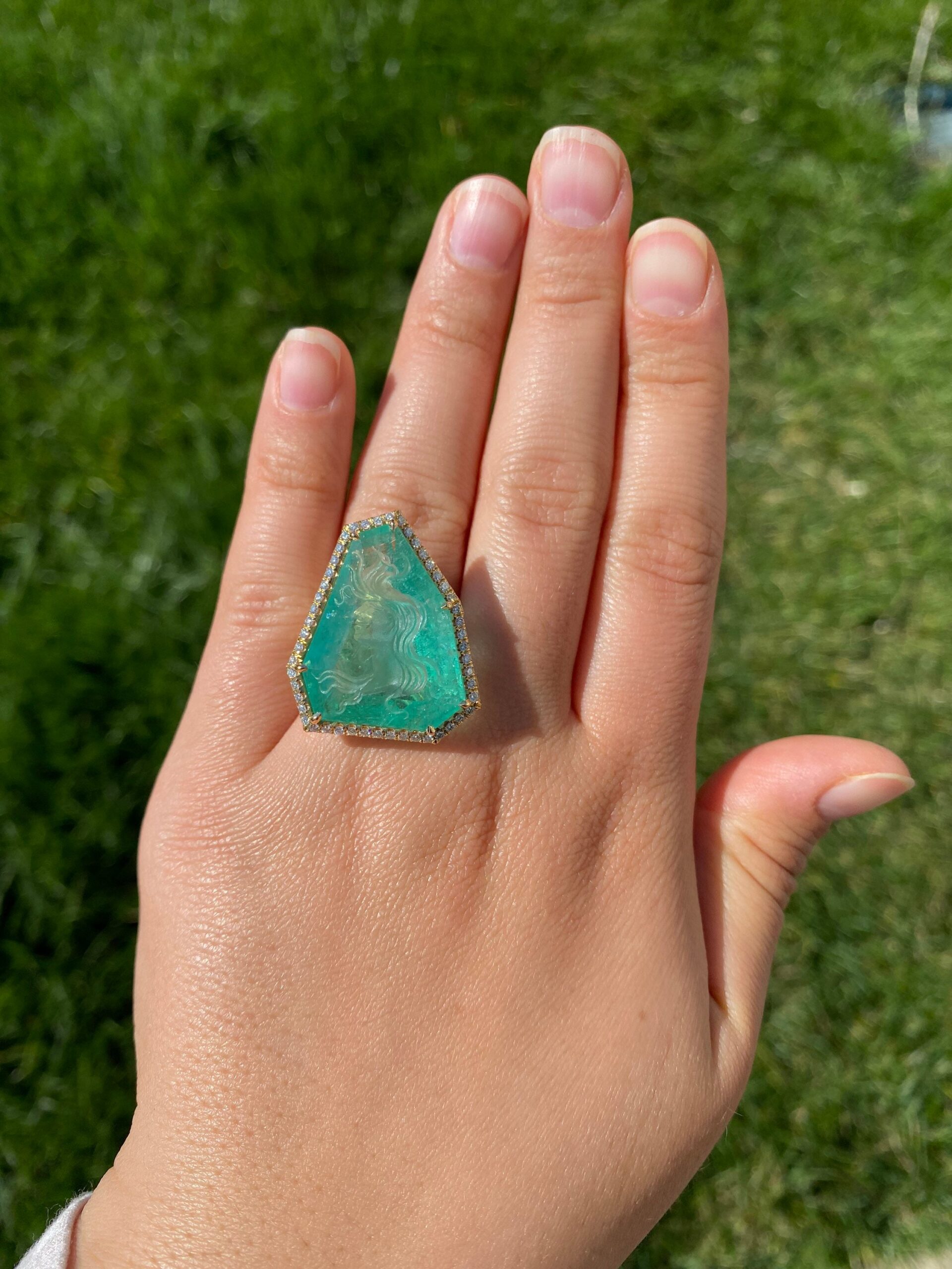 The Cascade: Russian Intaglio Emerald in 18 Karat Yellow Gold Set with Diamonds