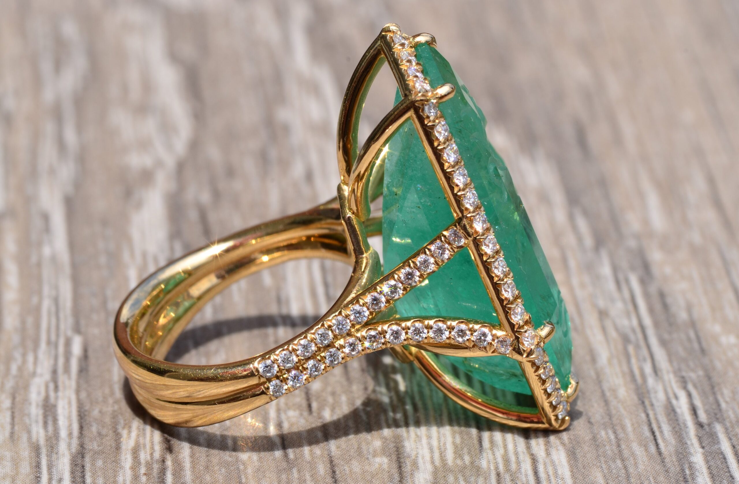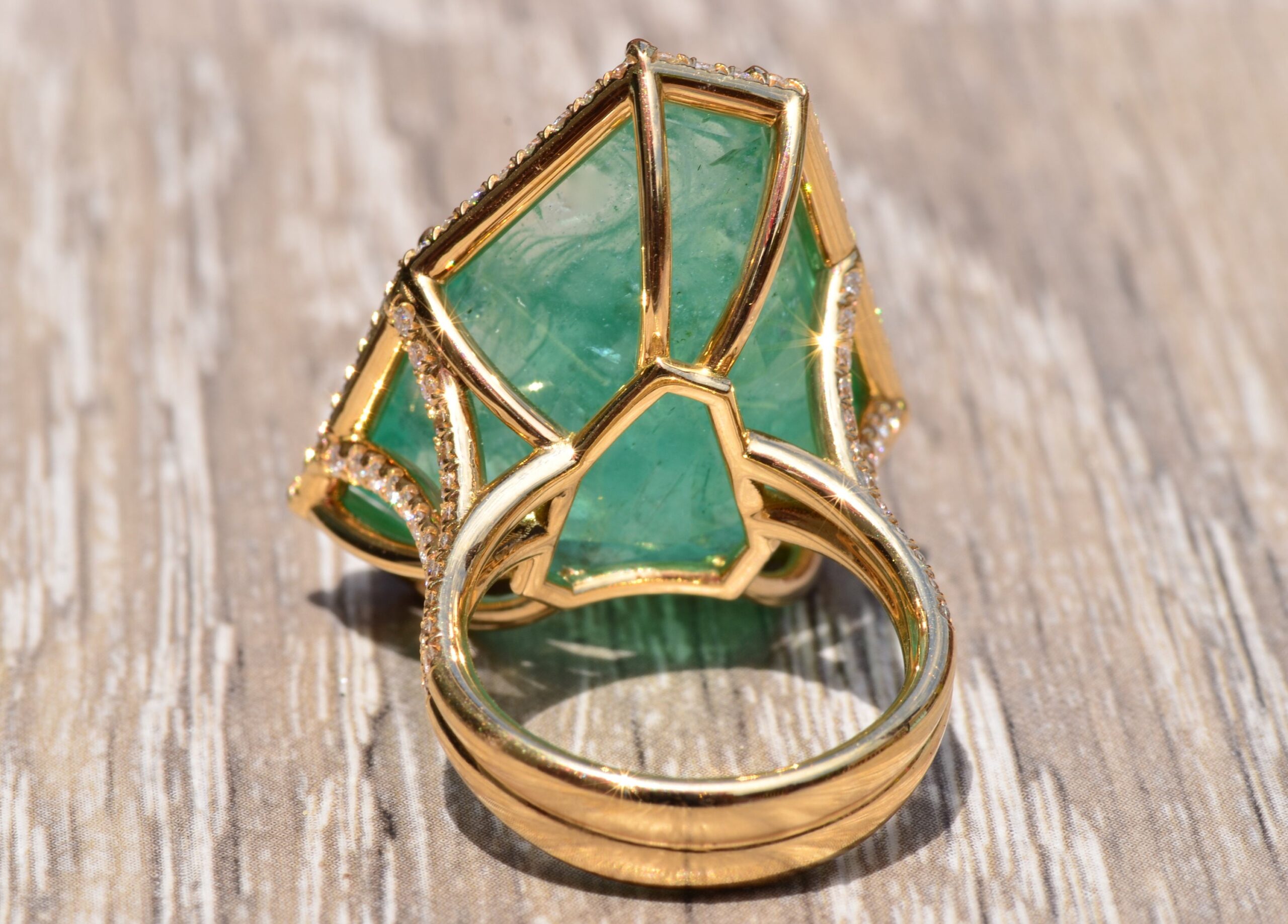 Russian Intaglio Emerald Ring in 18 Karat Yellow Gold Set with Diamonds. The custom cut intaglio emerald has an approximate carat weight by measurement of 32 carats. Surrounding the center and continued down a split shank are round brilliant cut diamonds with a total weight of 1 carat. The ring is expertly crafted in 18 karat yellow gold and features a counterbalanced shank. This ring is truly a piece of art. This ring is currently a finger size 6 1/2, yet can be adjusted in size. The ring comes with a Gemological Institute of America report stating Russian origin for the central emerald.