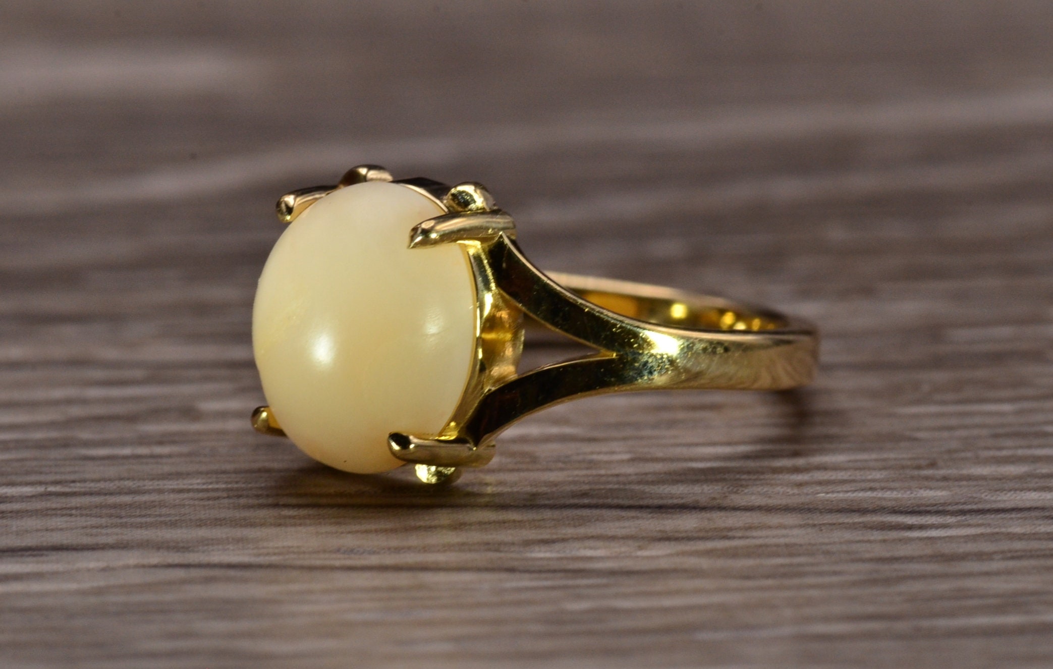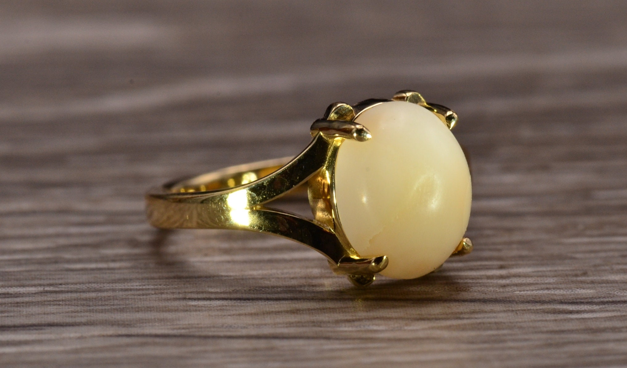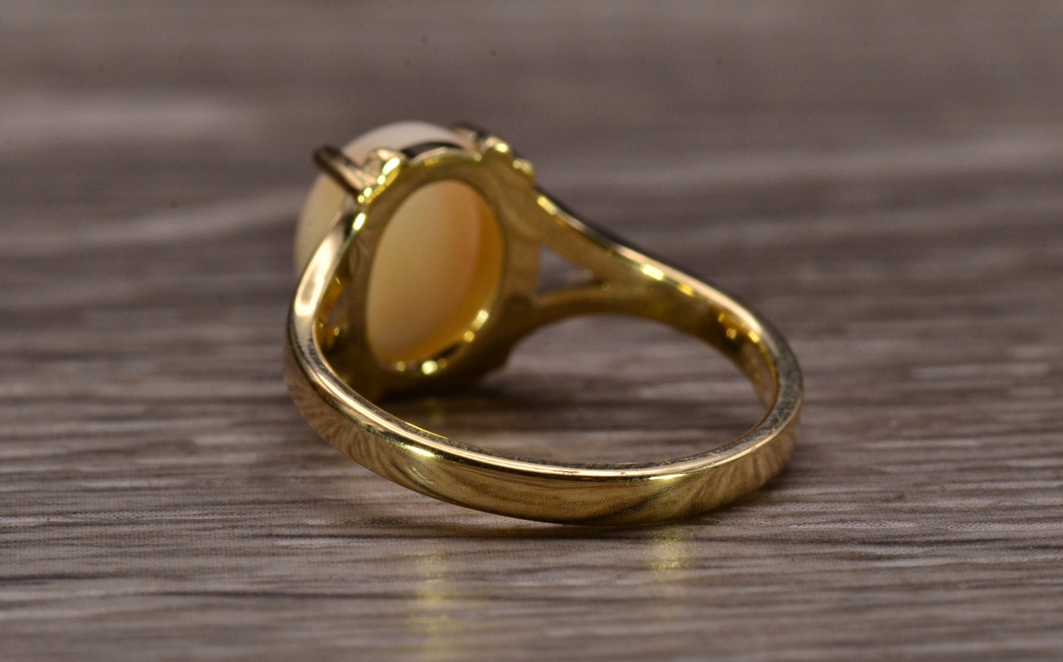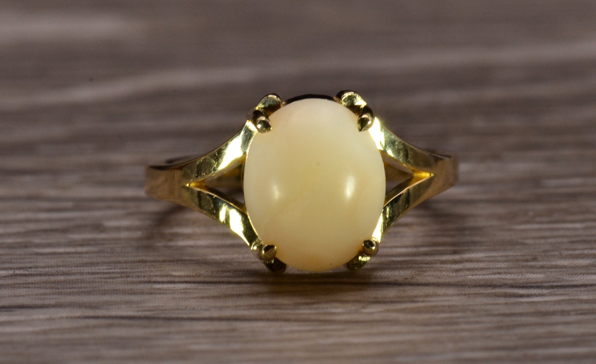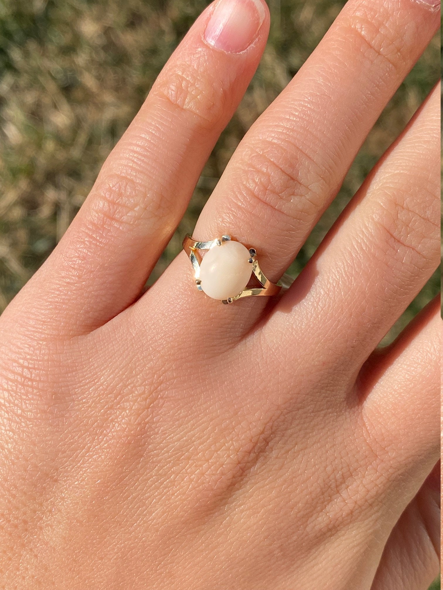 The Chalmette: Ladies Yellow Gold Angel Skin Coral Ring. Crafted in yellow gold with a split shank, this ring features a 10mm x 8mm angel skin coral center stone that is a faint peach color in person. Currently a finger size 6, this ring can be resized for an additional charge.