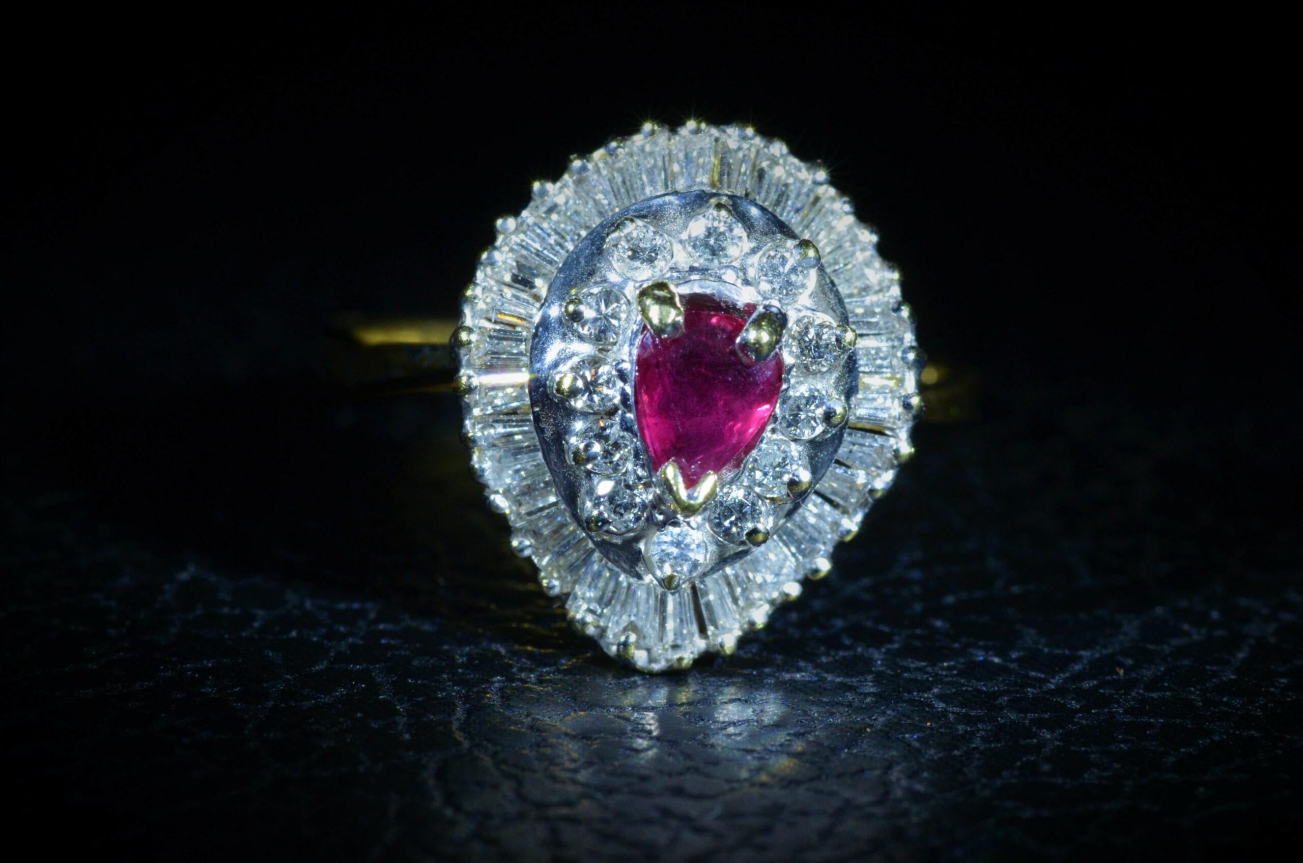 Two Tone Pear Shaped Ruby & Diamond Ring. The ring features a central pear brilliant cut 0.40 carat natural ruby in the center. Surrounding the center in a double halo is a section of round brilliant cut diamonds and section of baguette cut diamonds that flow in a ballerina pattern with a total diamond weight by measurement of 1.25 carats, The ring is crafted in white and yellow gold and is smooth to wear at a ladies finger size 7.