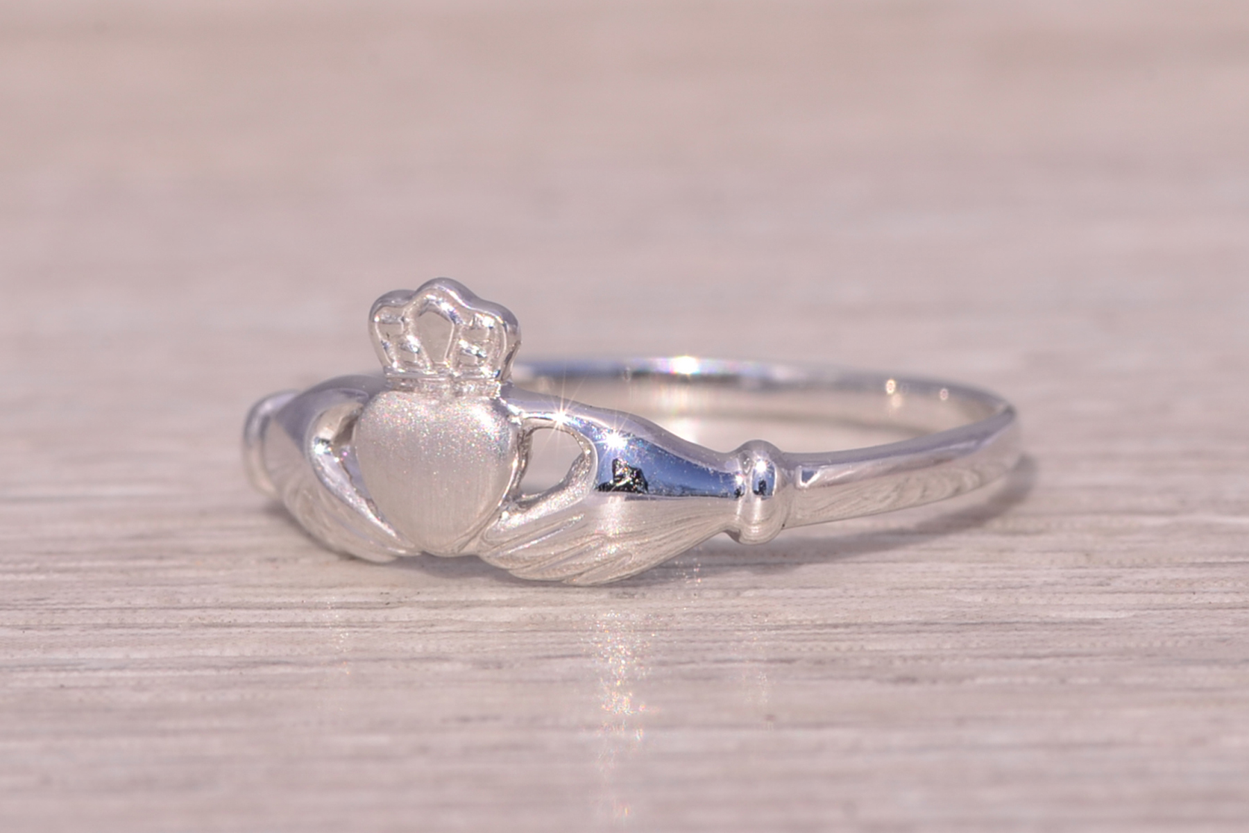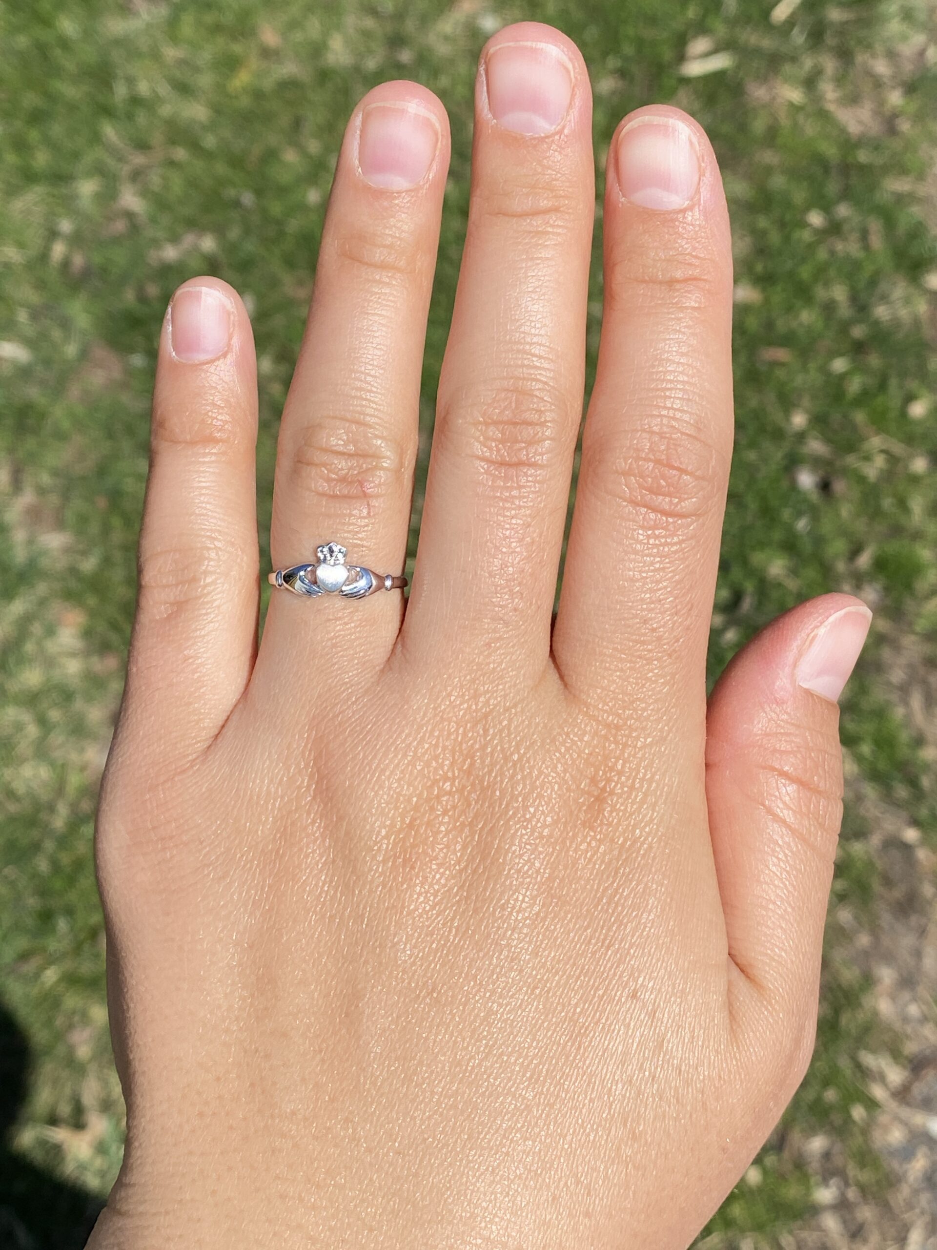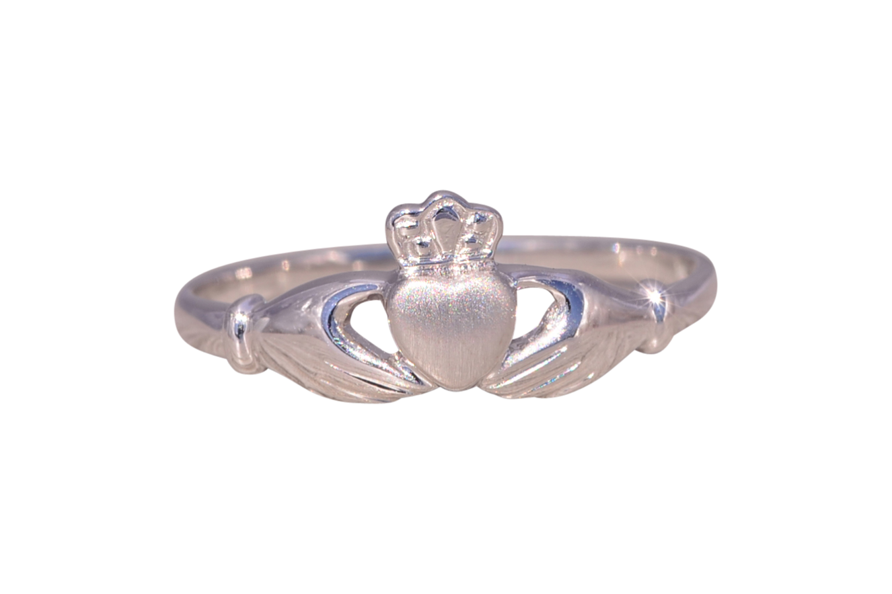 This stunning piece, known as The Claddagh Embrace, features the iconic Claddagh design, symbolizing love, loyalty, and friendship. The heart, crowned with a regal crown and held by two hands, represents the timeless sentiment of devotion. Crafted in 14 karat white gold, the sleek and polished design adds a modern touch to this traditional symbol. The ring is crafted in 14 karat white gold and is currently a finger size 6.75 yet can be adjusted to any finger size for an additional charge upon request, ensuring a perfect fit.