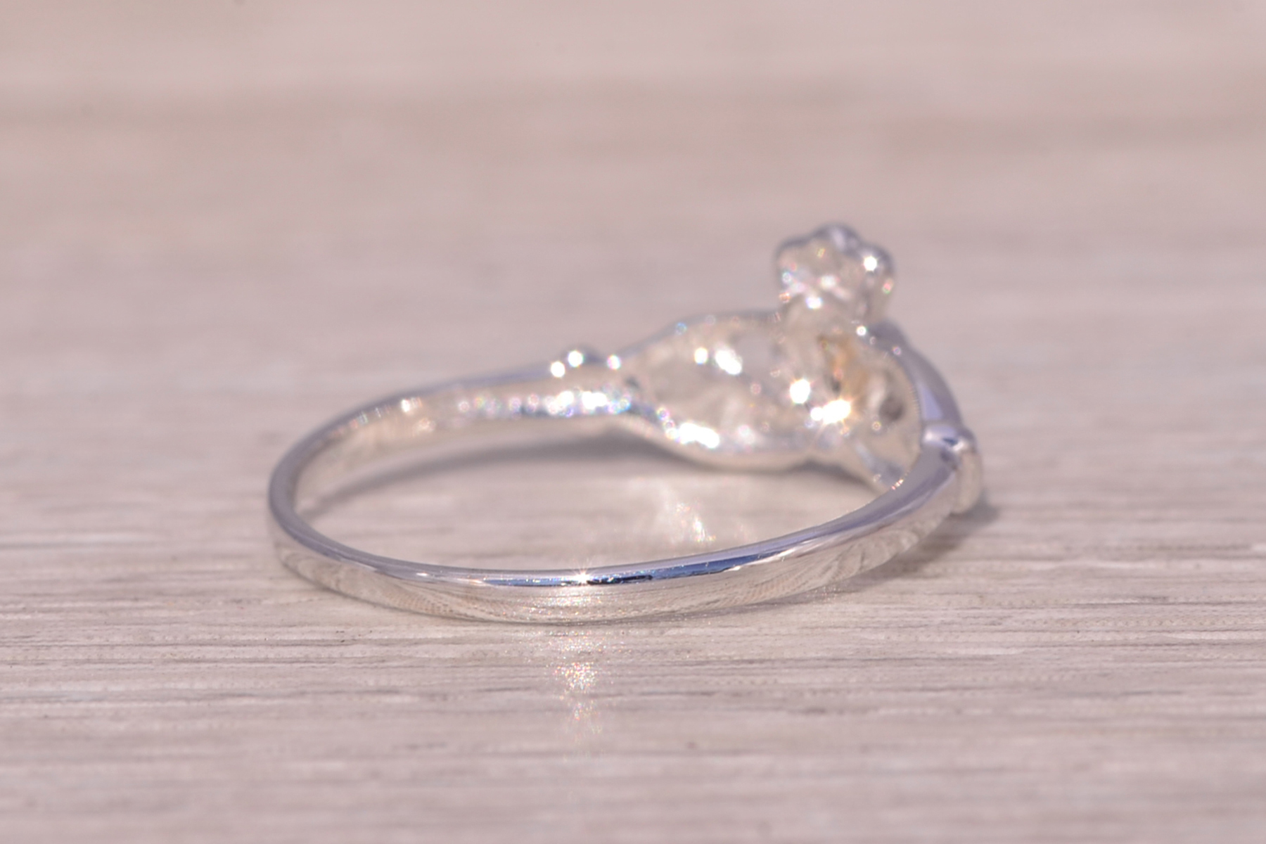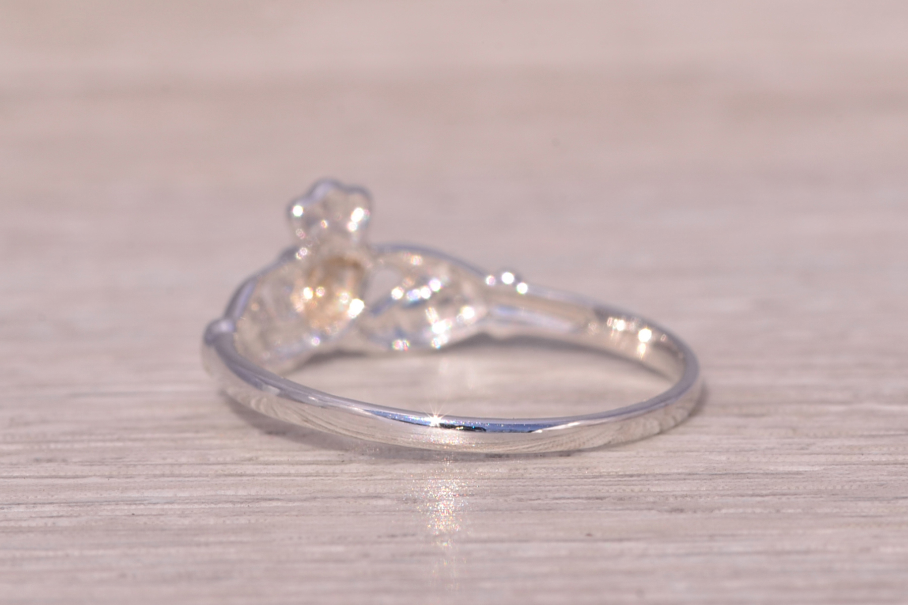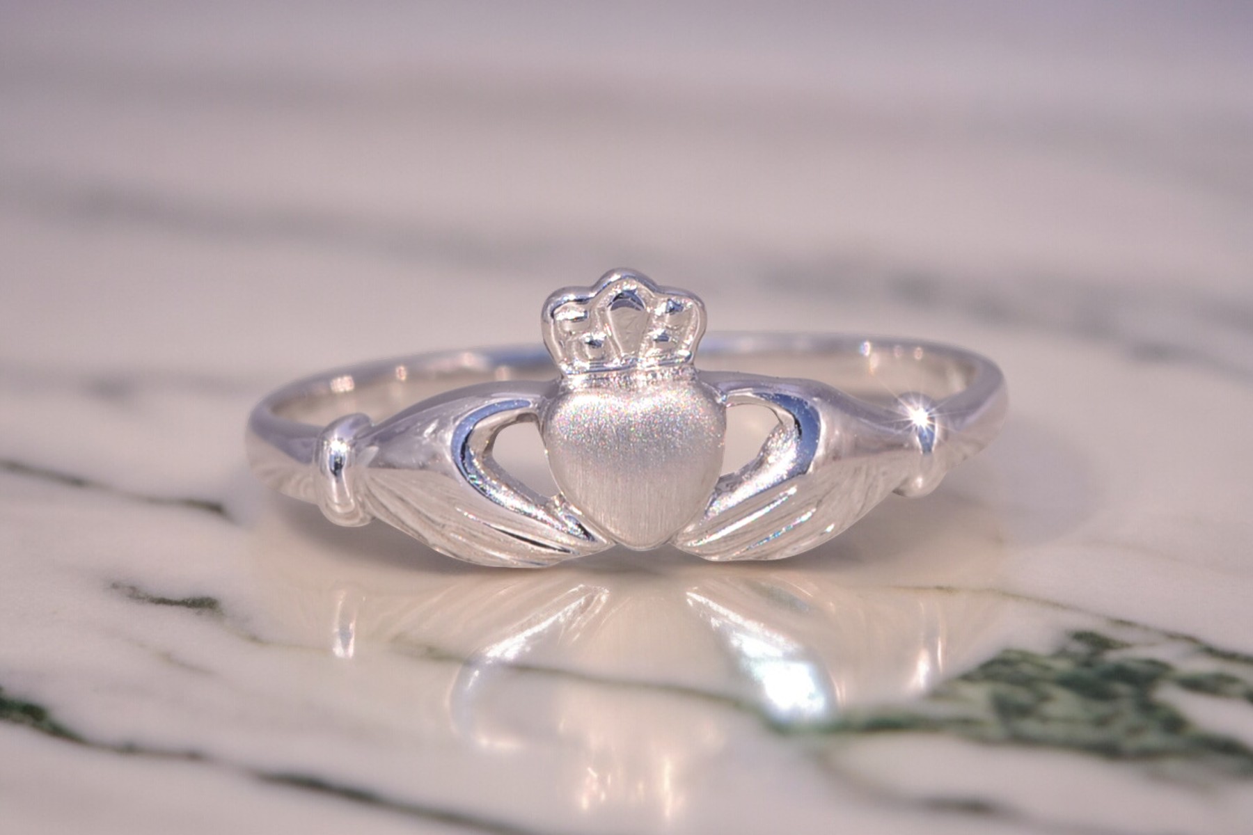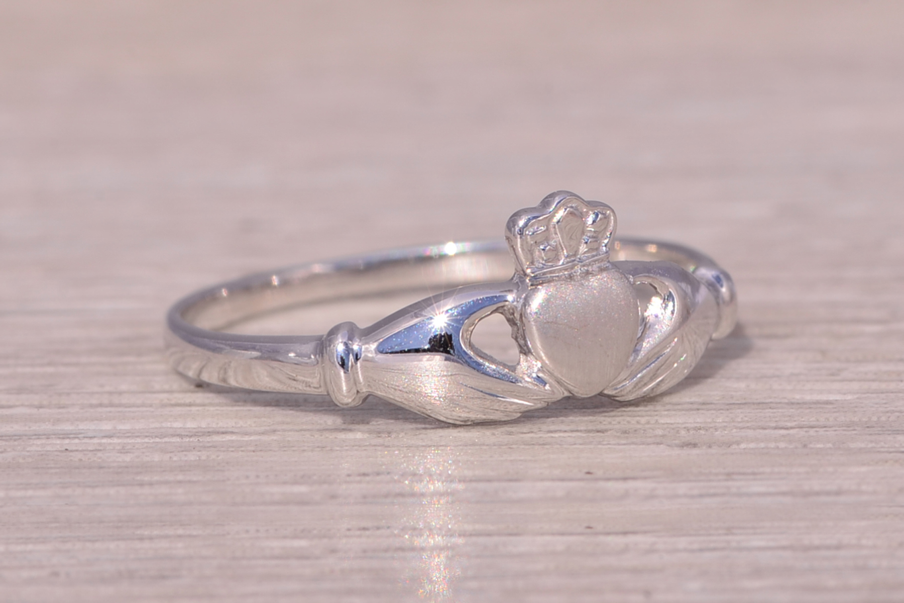 This stunning piece, known as The Claddagh Embrace, features the iconic Claddagh design, symbolizing love, loyalty, and friendship. The heart, crowned with a regal crown and held by two hands, represents the timeless sentiment of devotion. Crafted in 14 karat white gold, the sleek and polished design adds a modern touch to this traditional symbol. The ring is crafted in 14 karat white gold and is currently a finger size 6.75 yet can be adjusted to any finger size for an additional charge upon request, ensuring a perfect fit.
