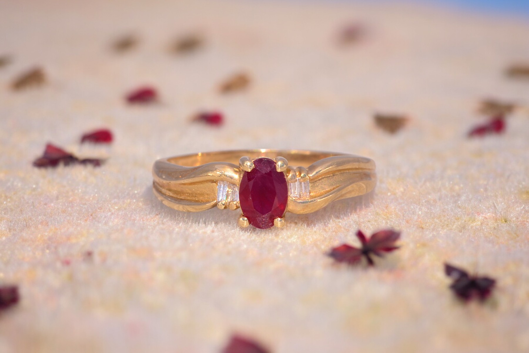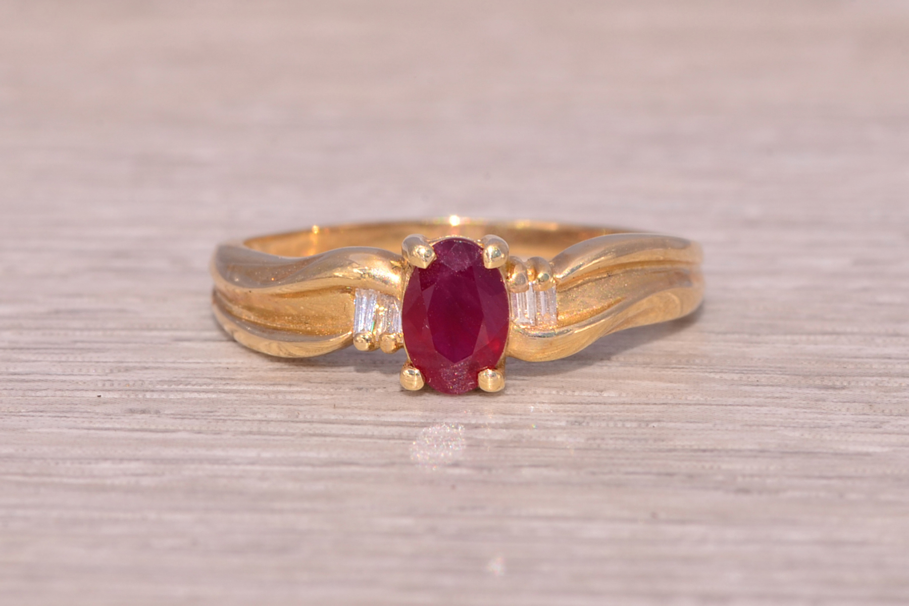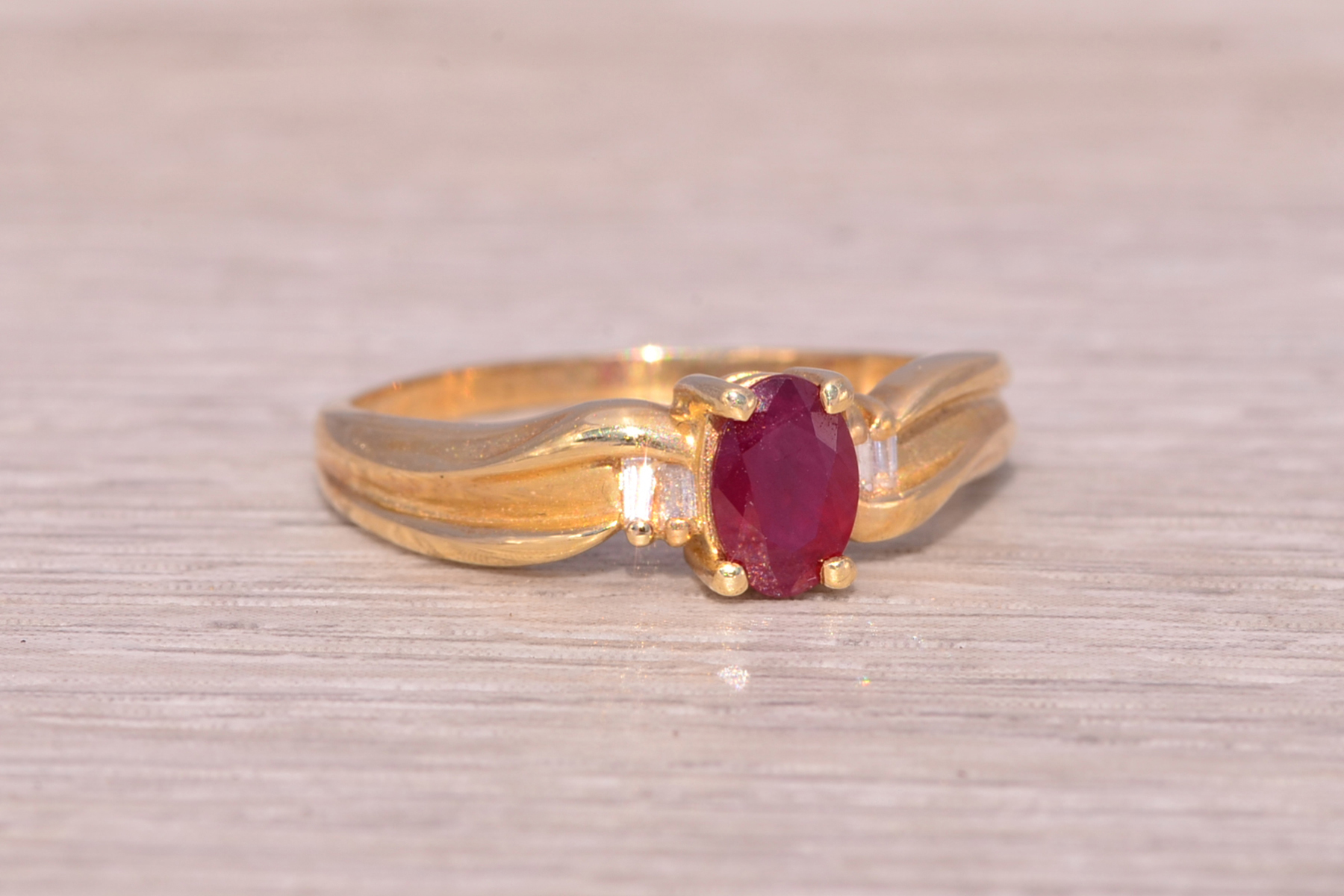 This stunning piece, known as The Classic Ruby Elegance, features a captivating oval cut ruby at its center, elegantly held by four prongs. On either side of the ruby, two baguette cut natural diamonds add a touch of sparkle, perfectly complementing the vibrant red gemstone. The ring is crafted in 14 karat yellow gold, with smooth, flowing lines that enhance the elegance of the design. The ring is currently a finger size 6.75 but can be adjusted to any size for an additional charge upon request, ensuring a perfect fit.