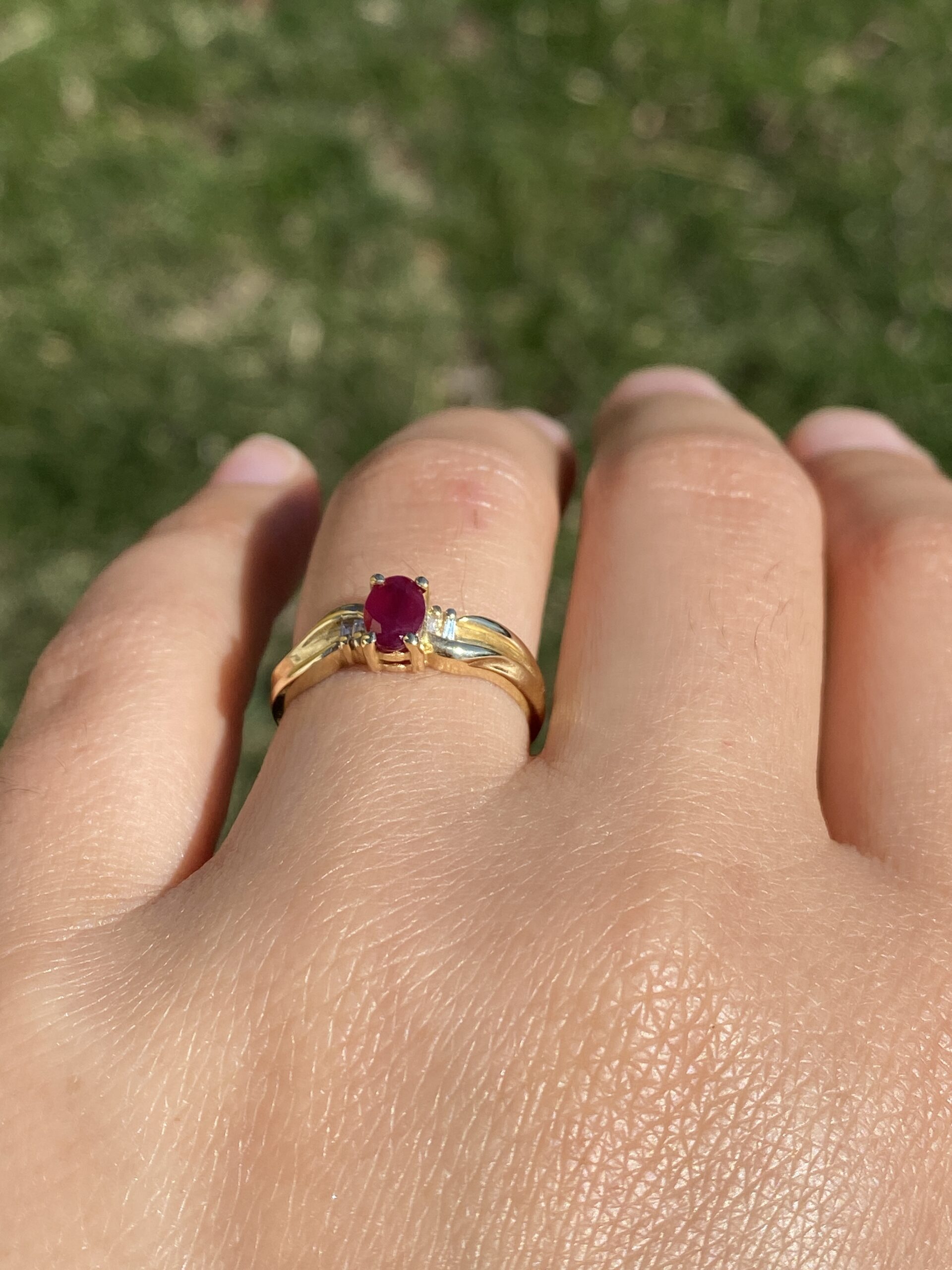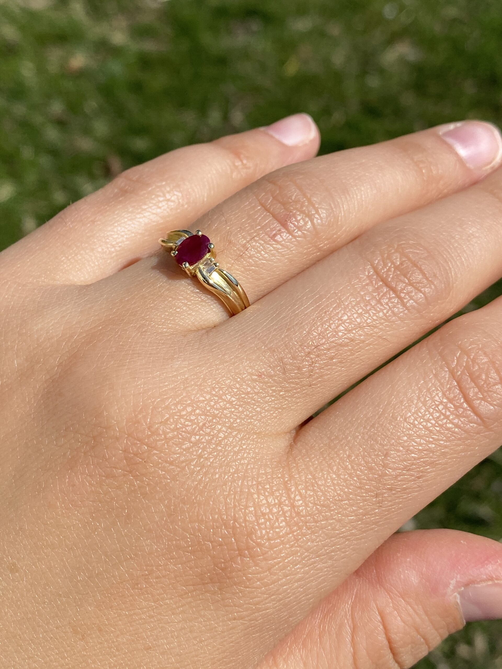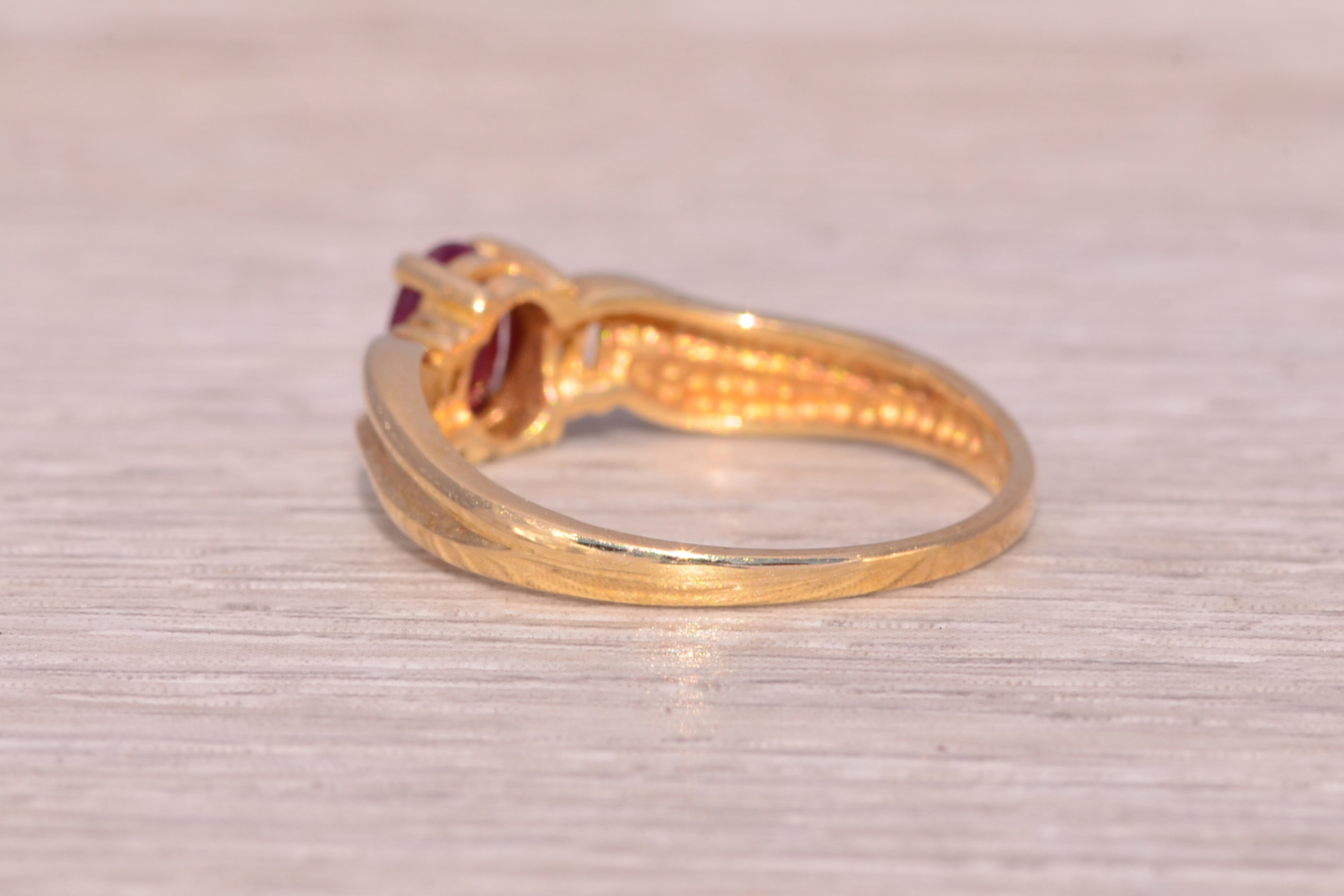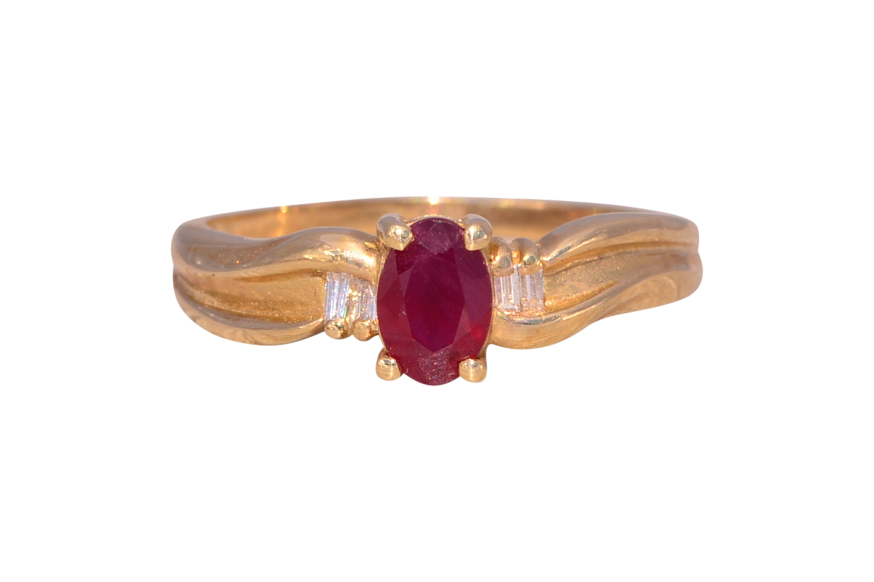 This stunning piece, known as The Classic Ruby Elegance, features a captivating oval cut ruby at its center, elegantly held by four prongs. On either side of the ruby, two baguette cut natural diamonds add a touch of sparkle, perfectly complementing the vibrant red gemstone. The ring is crafted in 14 karat yellow gold, with smooth, flowing lines that enhance the elegance of the design. The ring is currently a finger size 6.75 but can be adjusted to any size for an additional charge upon request, ensuring a perfect fit.