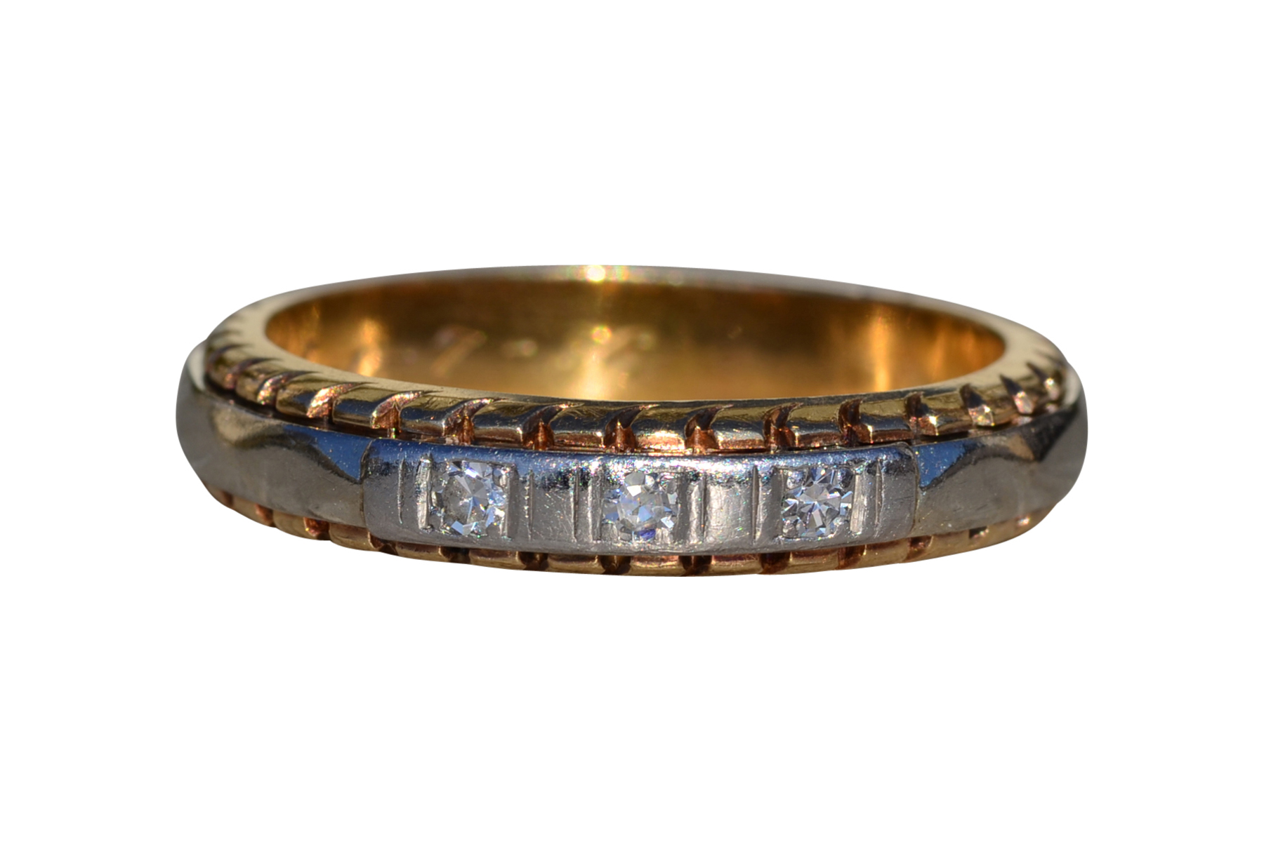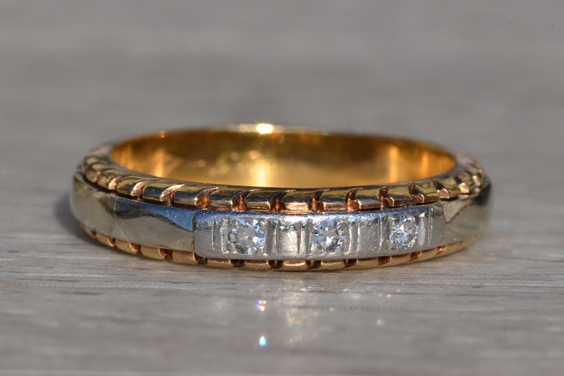 The Cohassett: Gentlemen’s Vintage 14K Two Tone Diamond Wedding Band. Crafted in 14 karat yellow and white gold, this men’s wedding band dates back to 1956 as we can see from the original engraving on the inner band. The inside of the band is engraved with “Kate – Ed 1-7-56” and can be removed and engraved with your own initials or saying for an additional fee. Set across the top of the band in white gold boxes are three small diamonds totaling 0.06 carats in weight. The ring is currently a finger size 9.25 and is able to be resized for an additional charge upon request.