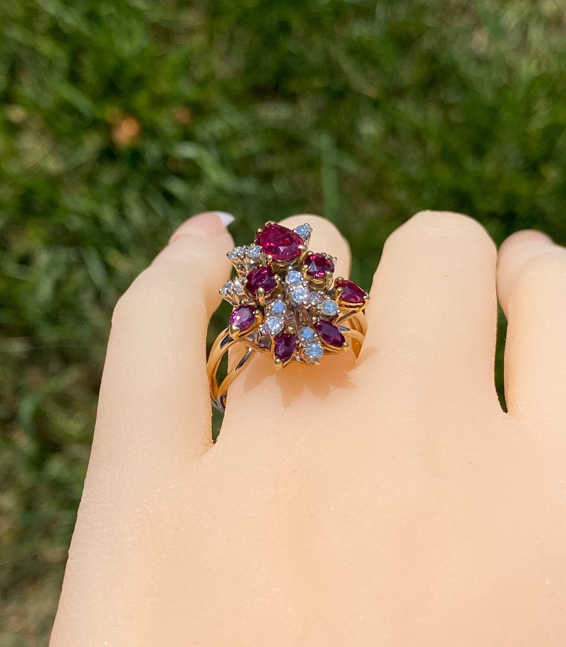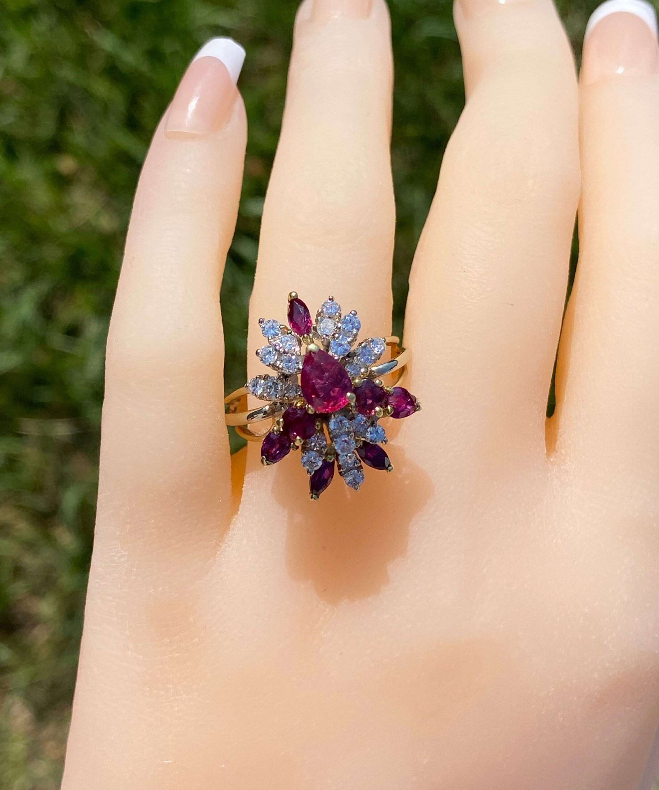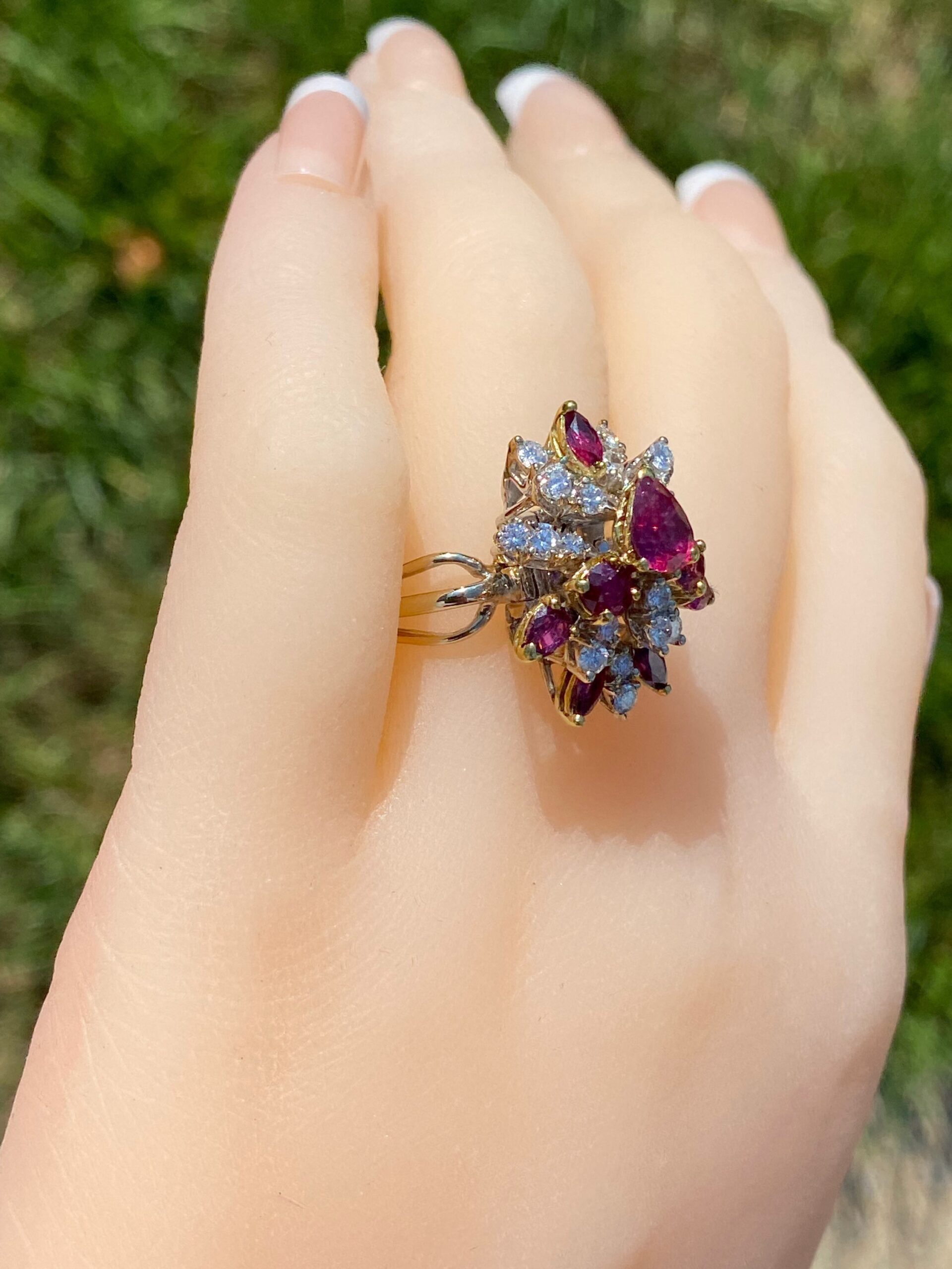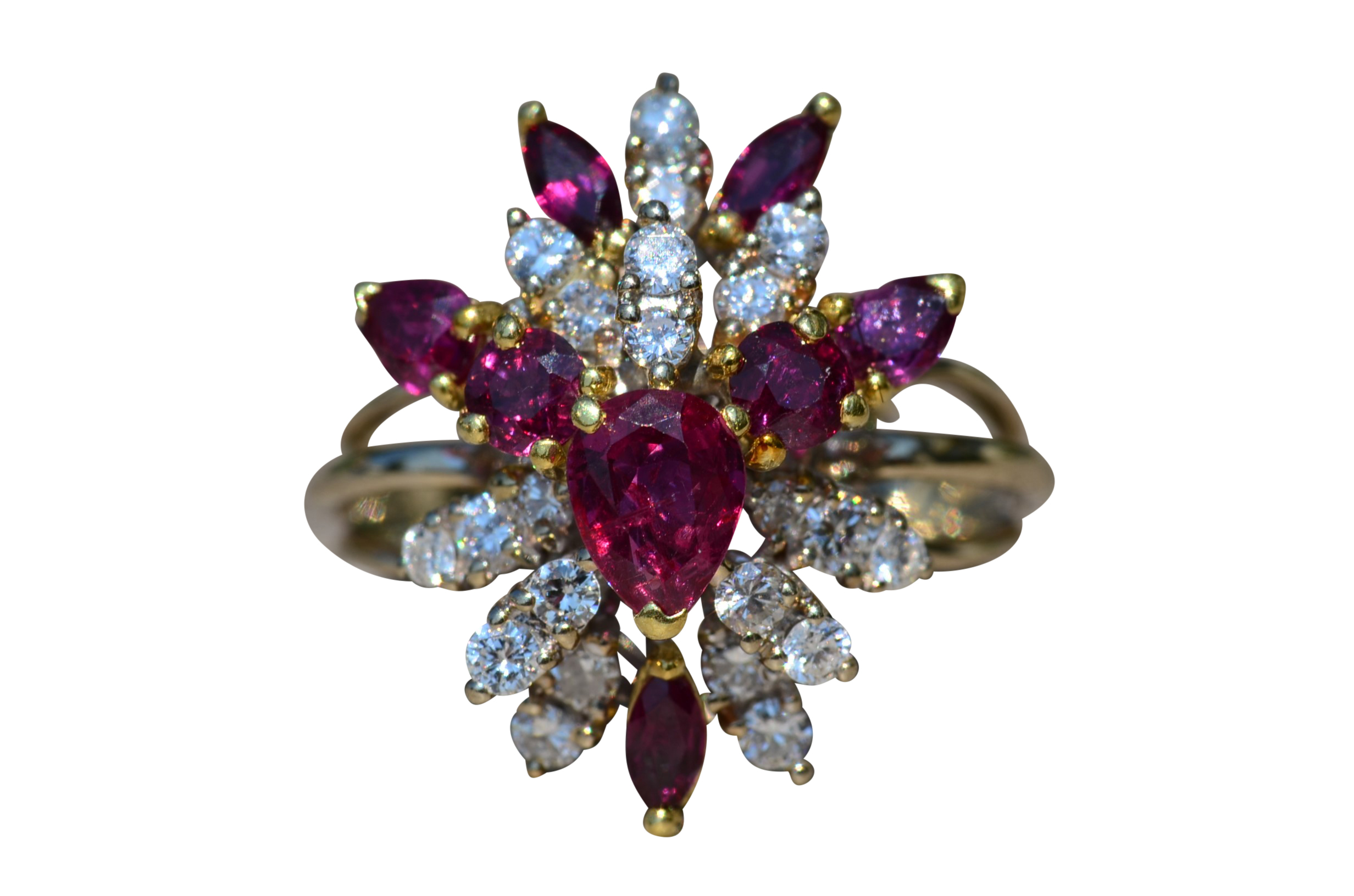 The Cooper City: Natural Ruby and Diamond Spray Ring. The ring contains a 0.90 carat pear shaped natural ruby center stone. Surrounding the center in a spray type pattern is a combination of natural vivid red rubies and round brilliant cut diamonds. The rubies have a total weight (not including the center) of 0.90 carats. The diamonds have an approximate weight of 1 carat. The stones are of exceptional quality and flow nicely to the top of the finger. The ring is crafted in 18 karat white and yellow gold. The ring is currently a finger size 8 1/2 yet can be adjusted to any finger size for an additional charge.