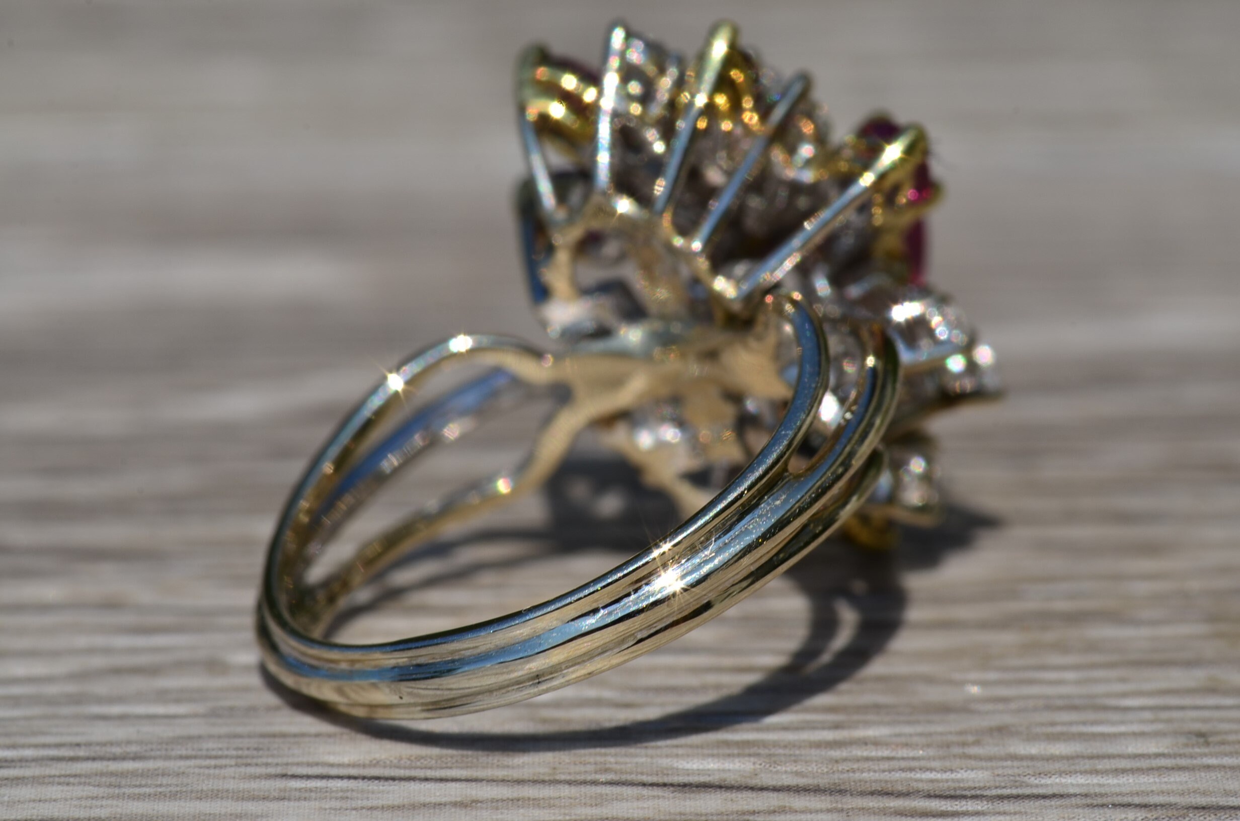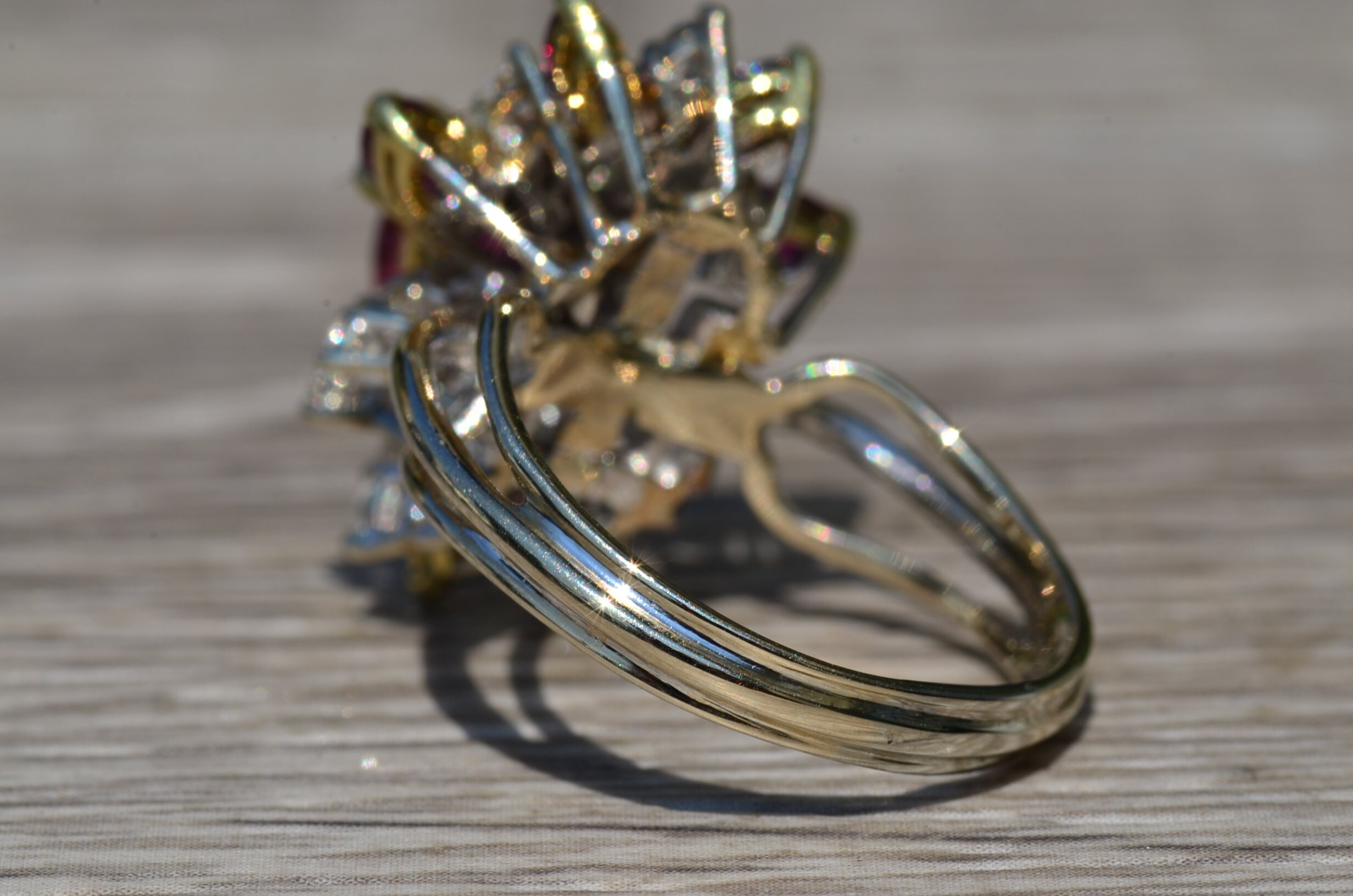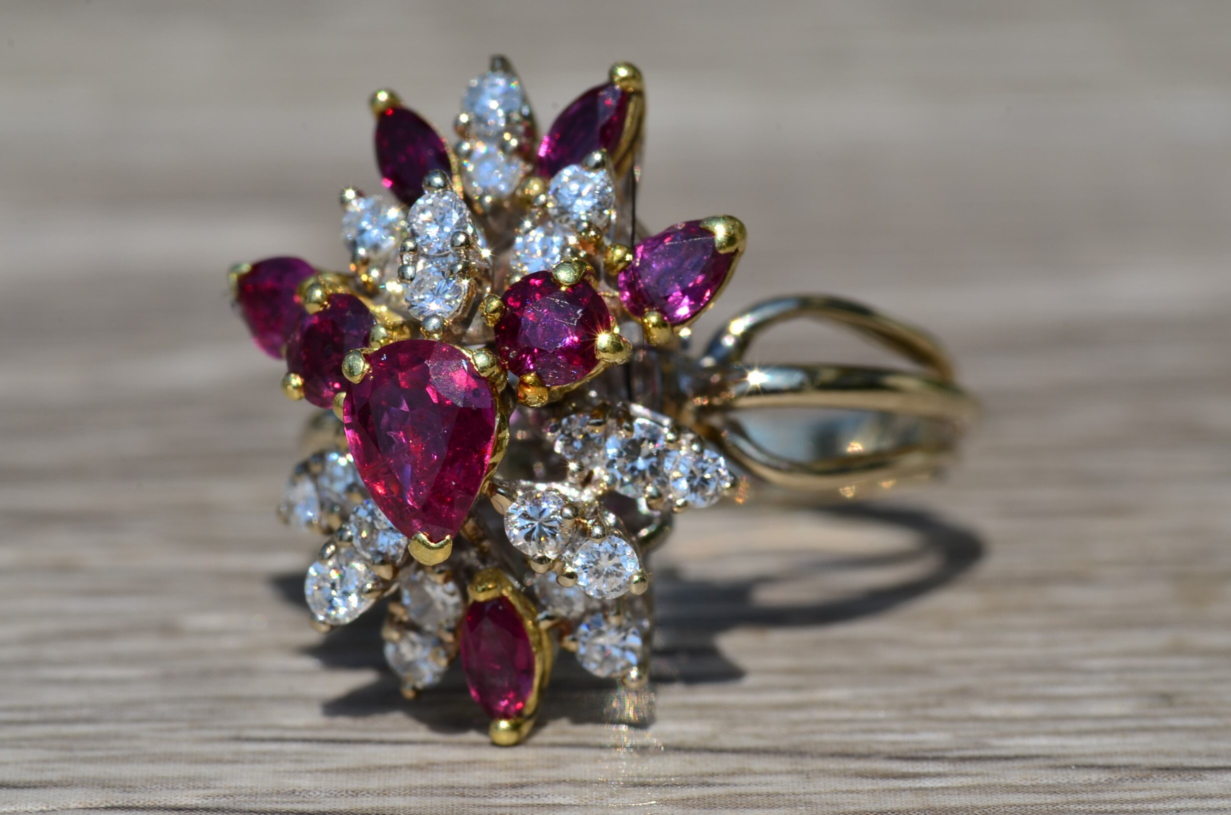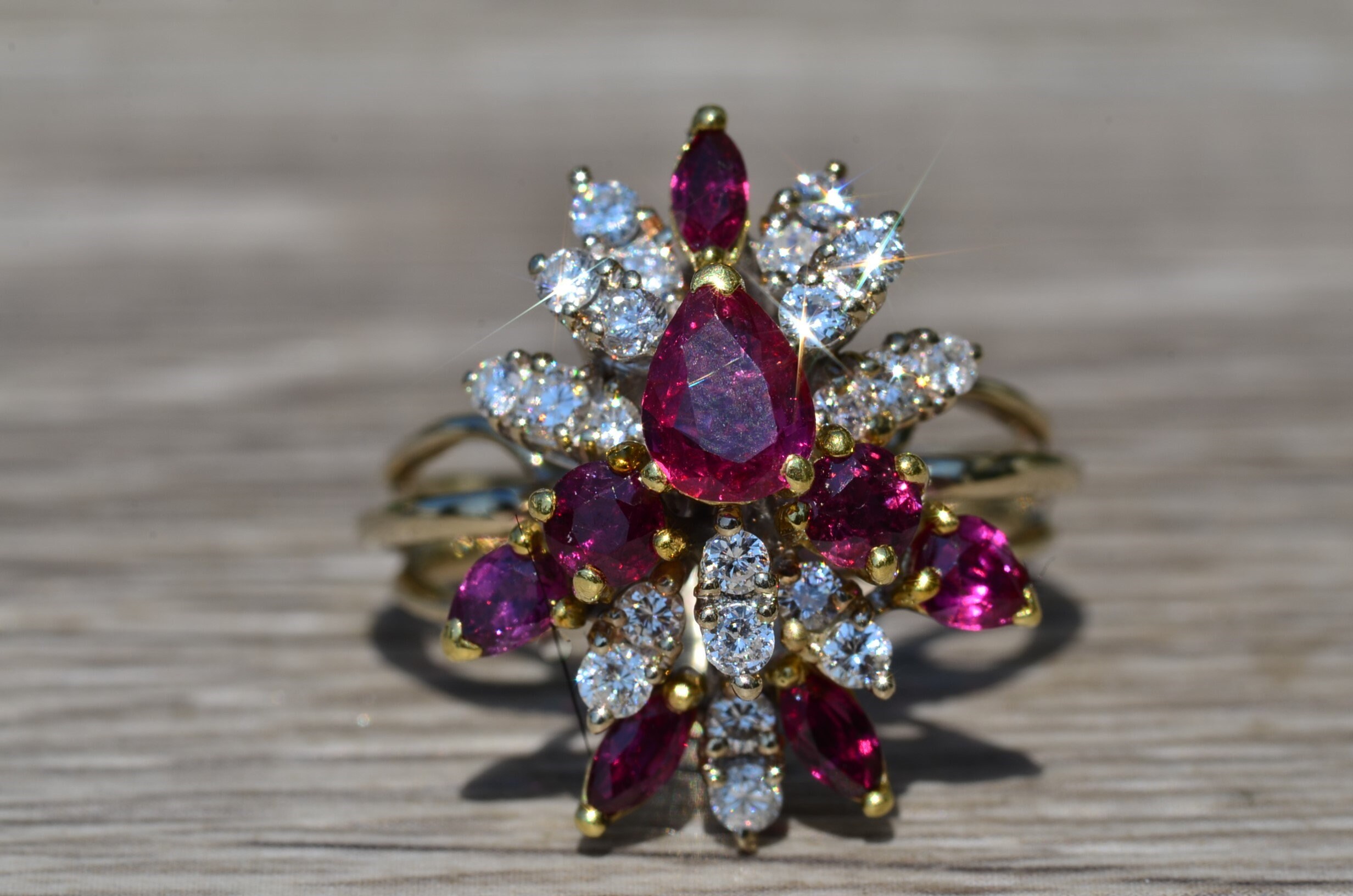 The Cooper City: Natural Ruby and Diamond Spray Ring. The ring contains a 0.90 carat pear shaped natural ruby center stone. Surrounding the center in a spray type pattern is a combination of natural vivid red rubies and round brilliant cut diamonds. The rubies have a total weight (not including the center) of 0.90 carats. The diamonds have an approximate weight of 1 carat. The stones are of exceptional quality and flow nicely to the top of the finger. The ring is crafted in 18 karat white and yellow gold. The ring is currently a finger size 8 1/2 yet can be adjusted to any finger size for an additional charge.