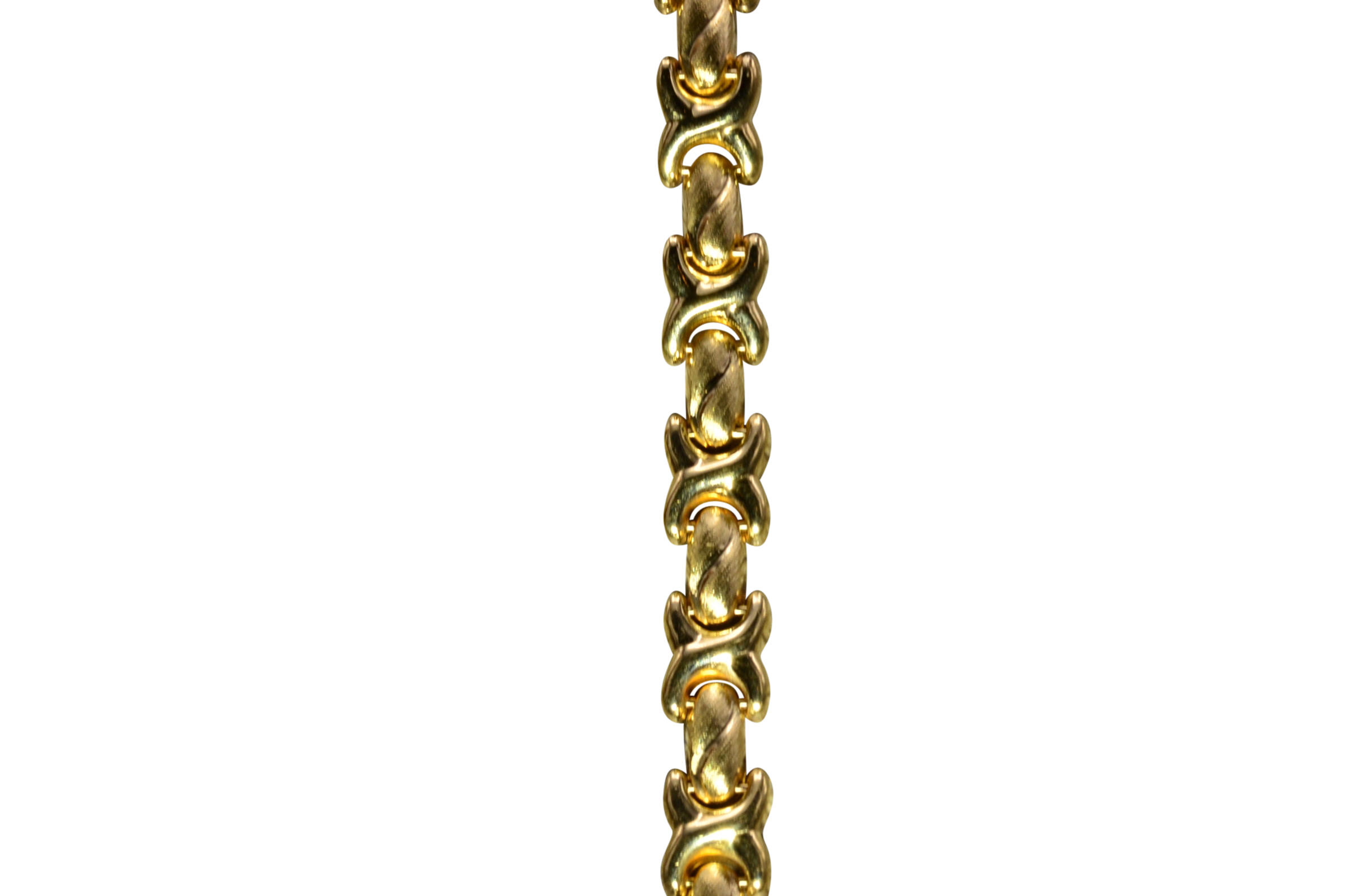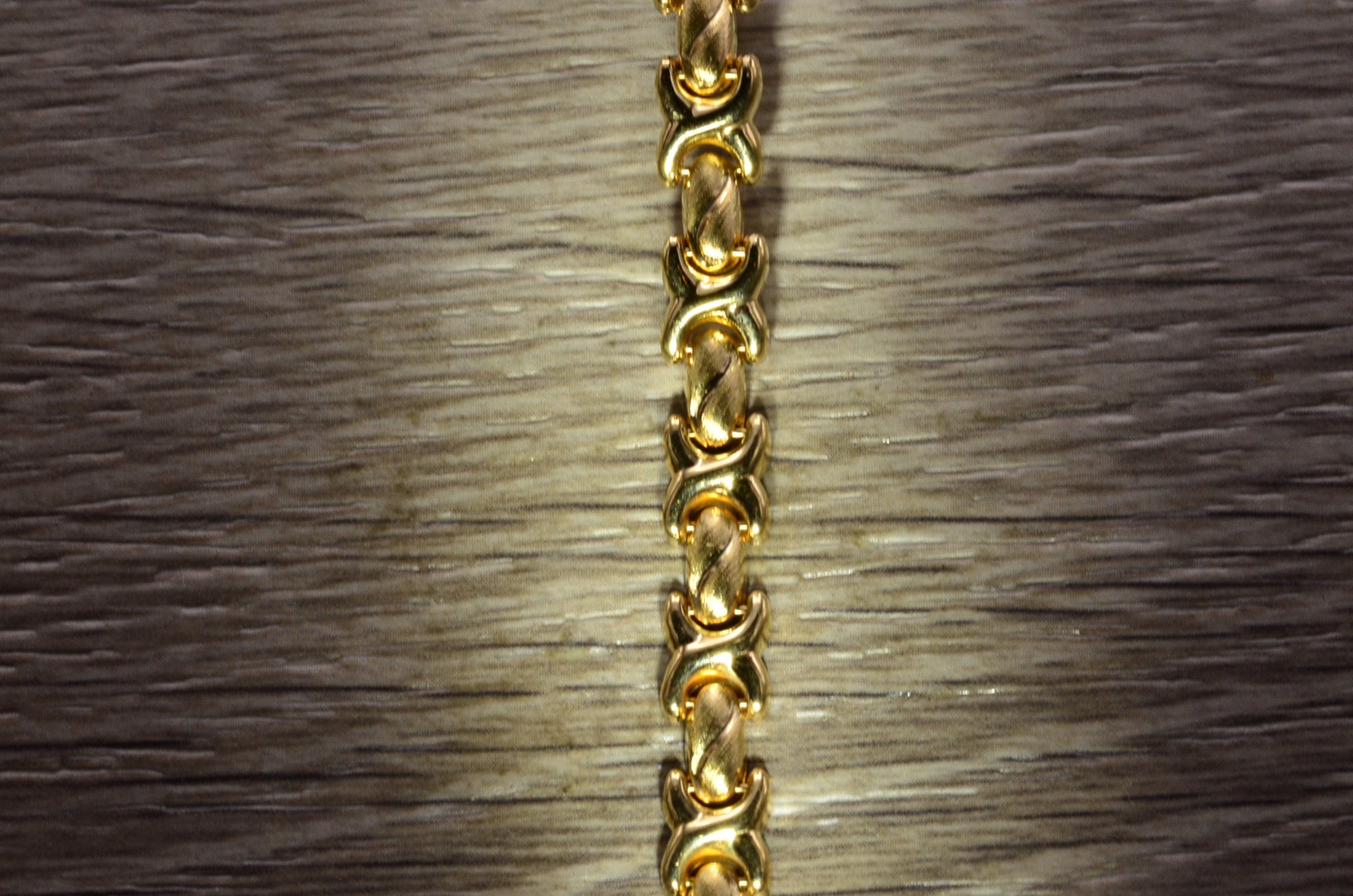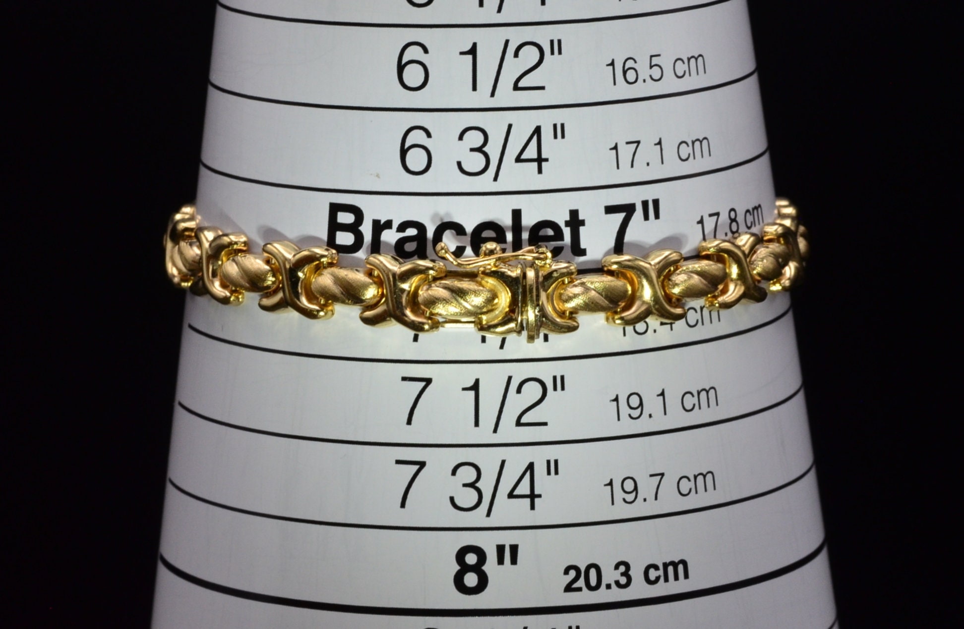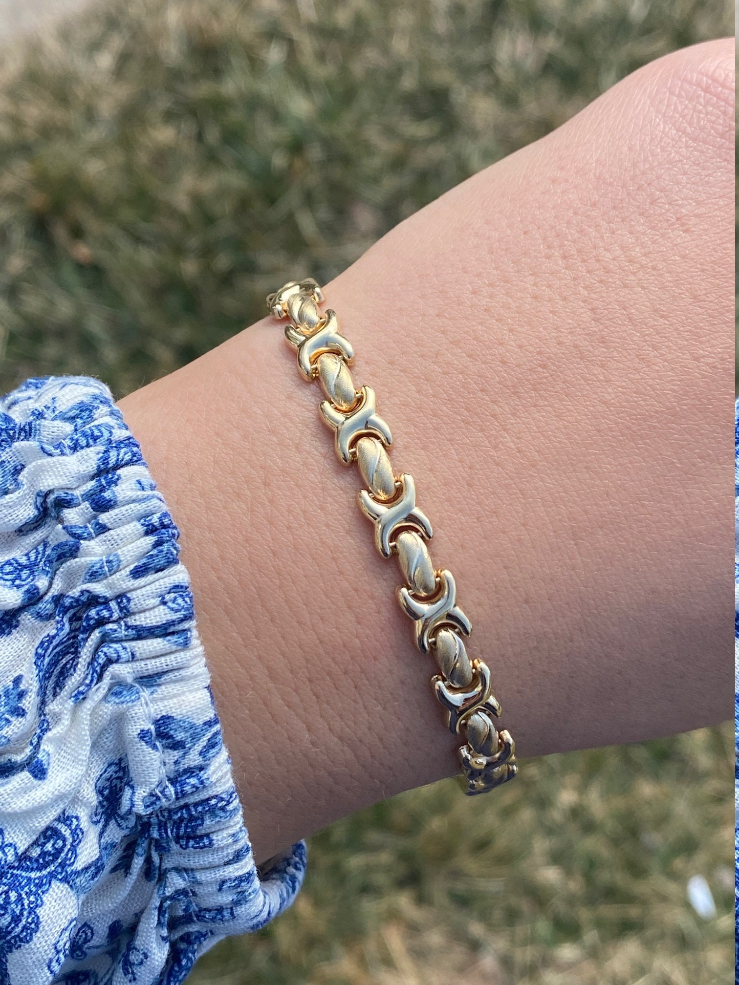 The Corvallis Beach: Ladies Vintage 14K Yellow Gold Italian Made Bracelet. This bracelet measures 7 inches in length and features an XO style design. The bracelet is complete with a push style clasp and added safety hook.