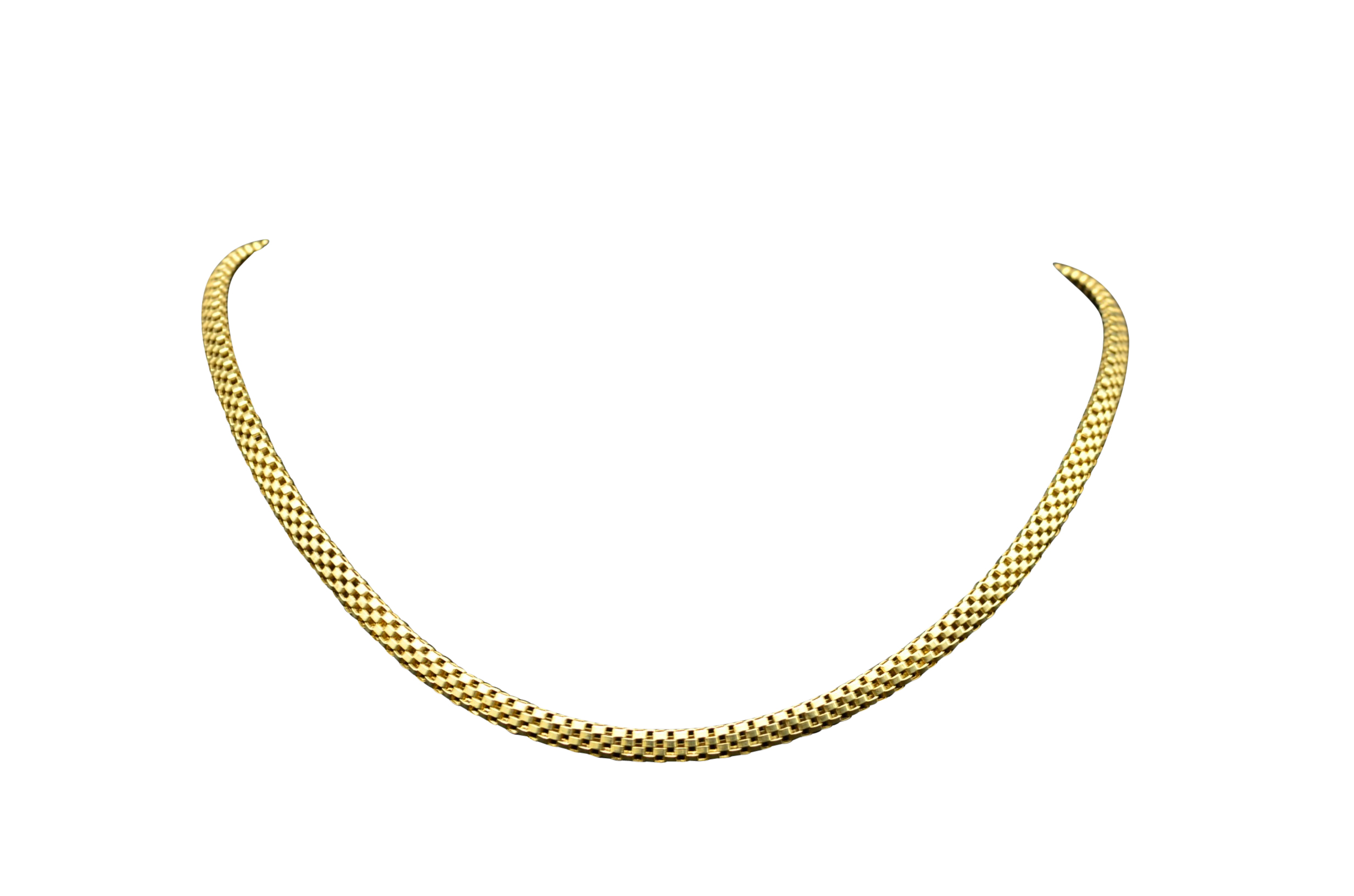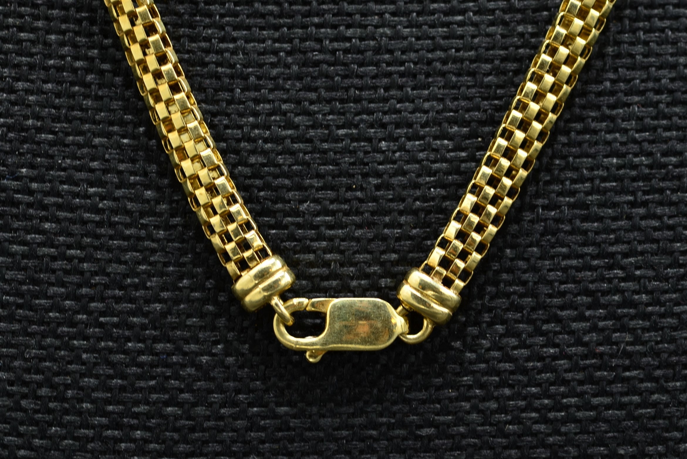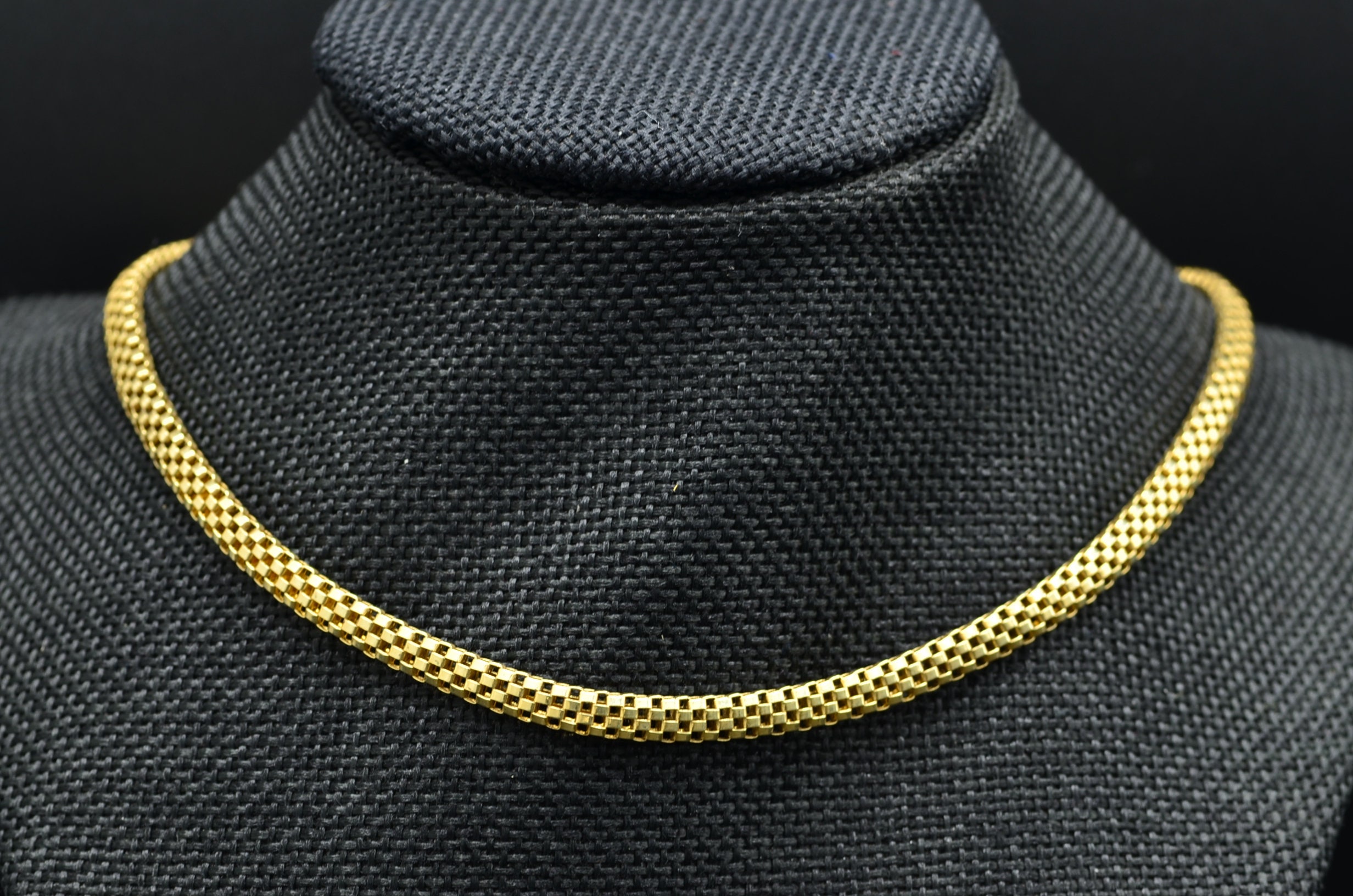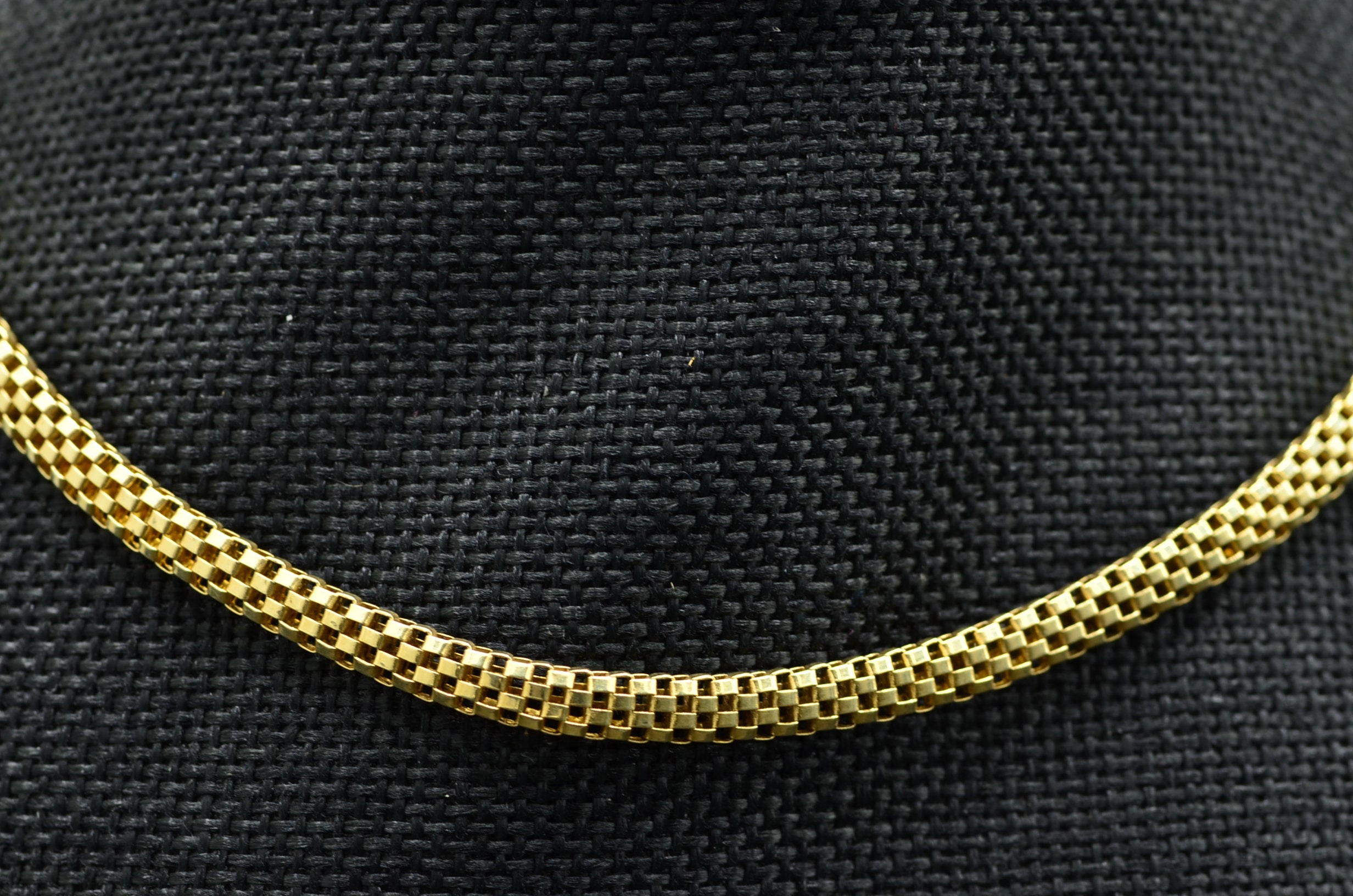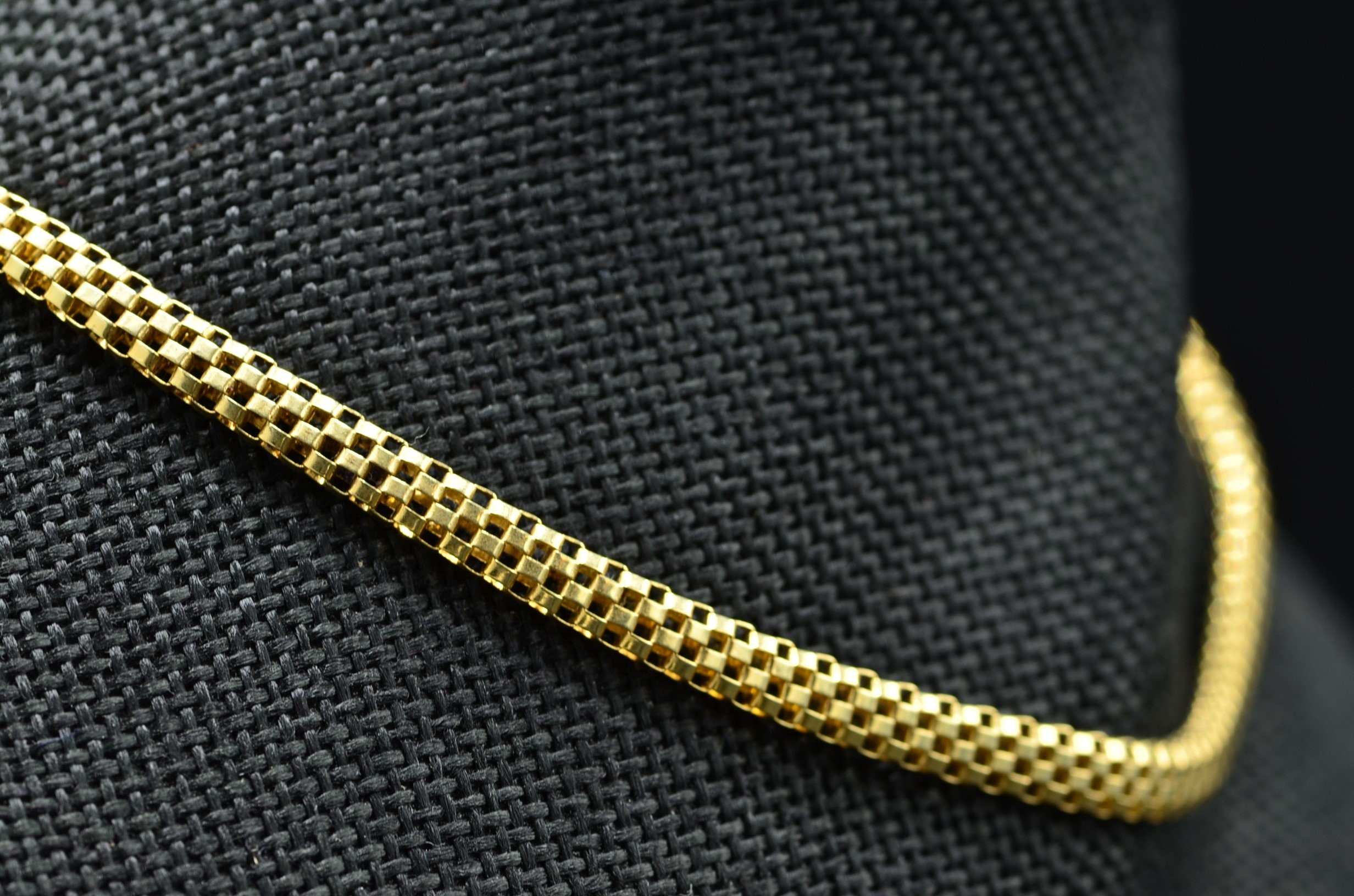 Vintage 14 Karat Yellow Gold Checkerboard Box Style Necklace. This necklace is crafted in 14 karat yellow gold and features an easy to open lobster style clasp. The necklaces measures 18 inches in length and features a modified box checkerboard style chain that lays nicely when worn.