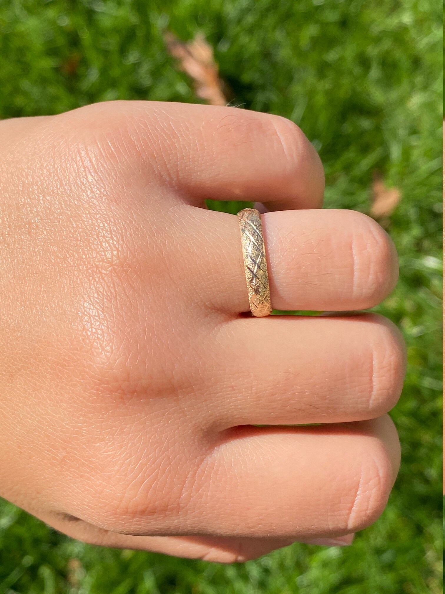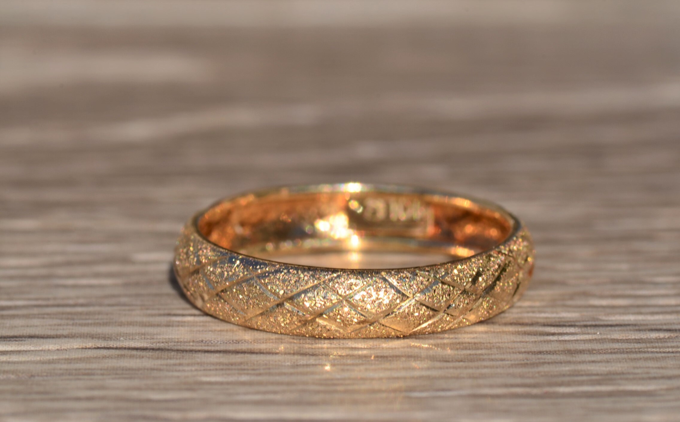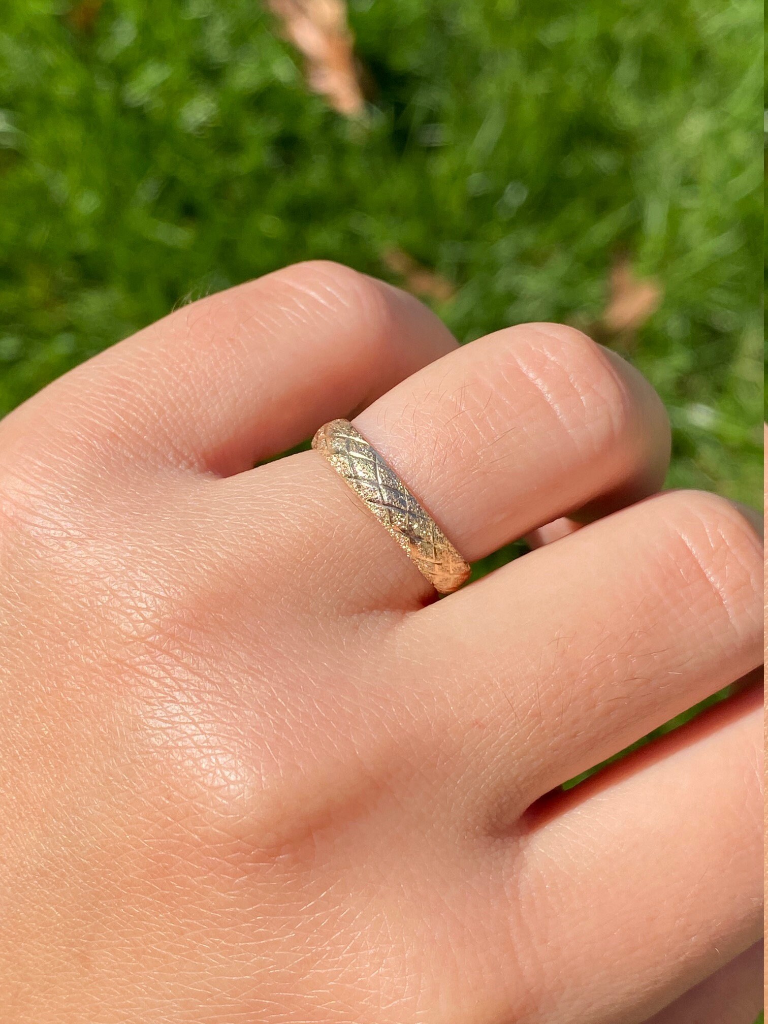 Ladies 10 K Gold Crisscross Band. Add this lightweight gold band to your favorite stack for a trendy layered look. The band is crafted in 10 karat yellow gold and features a crisscross design engraved throughout with a textured finish. This ring is currently a finger size 7.25, yet can be adjusted in size.