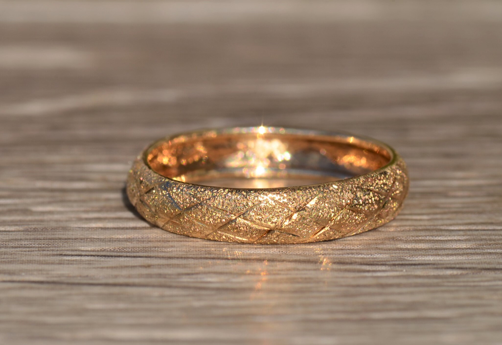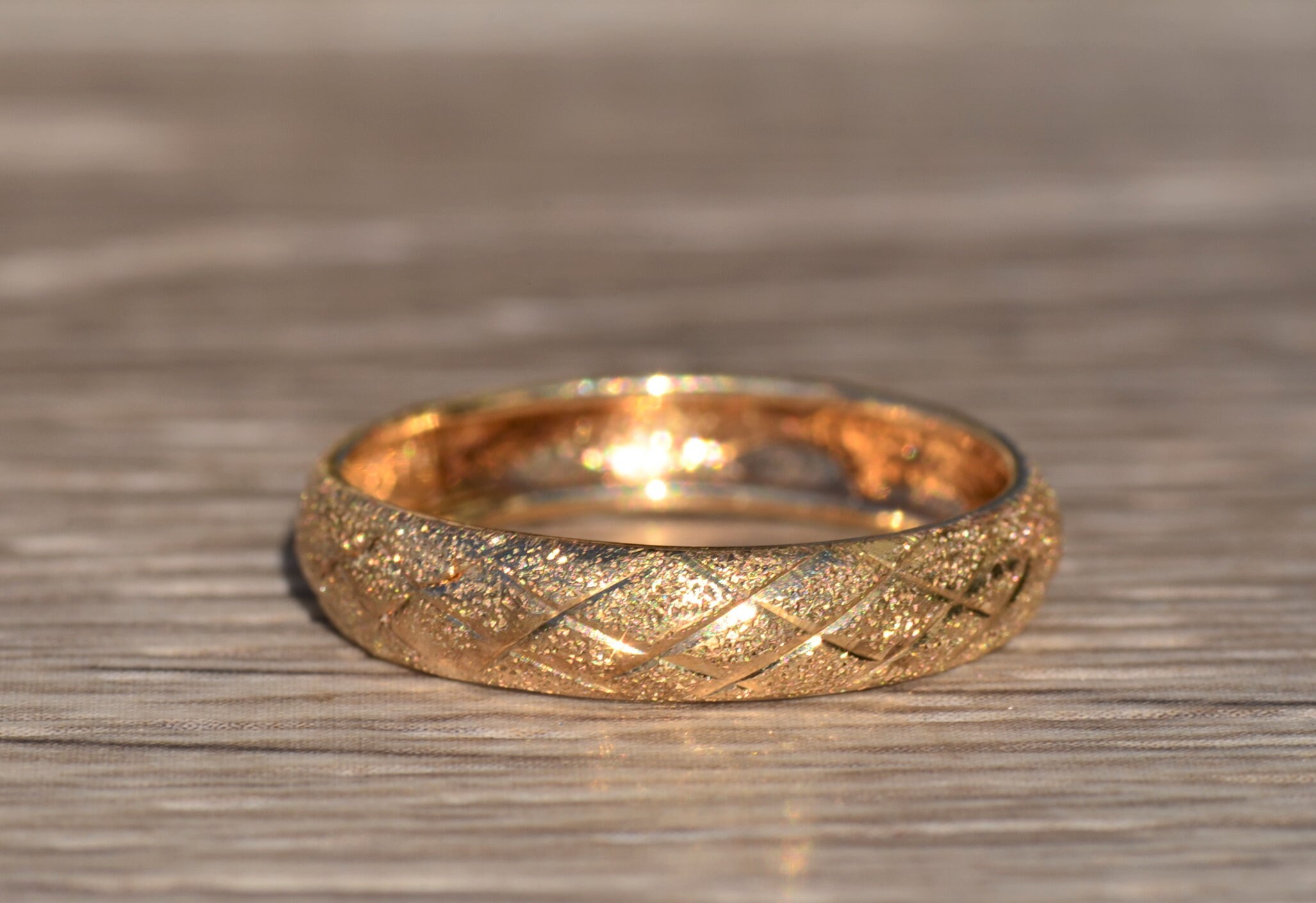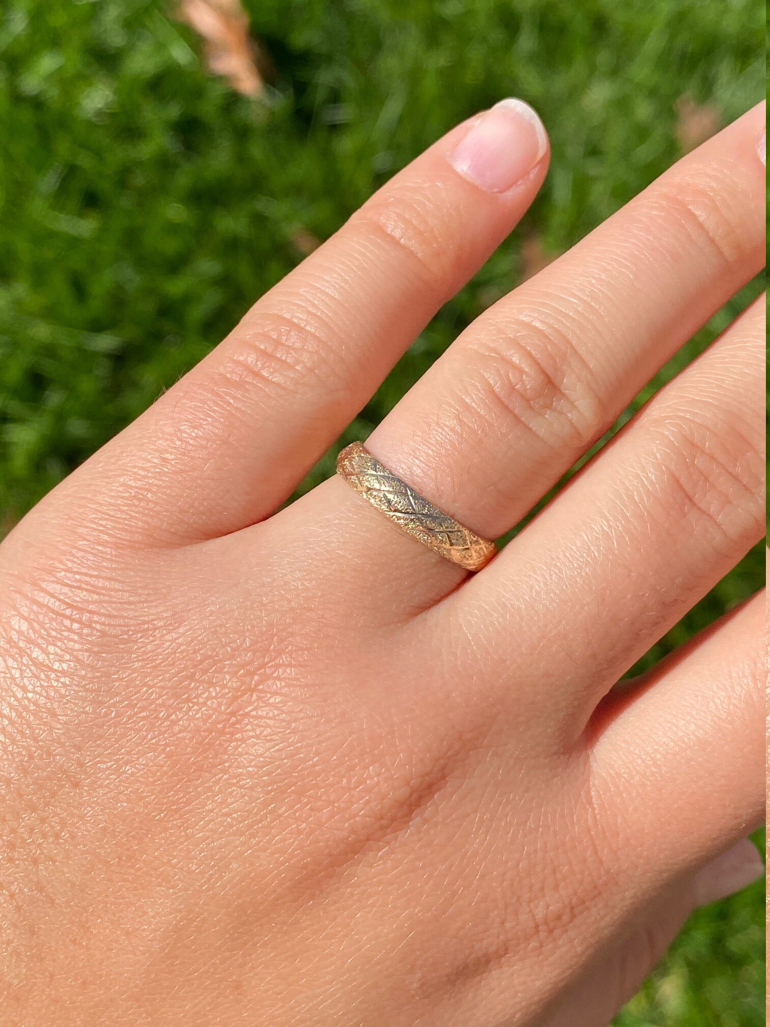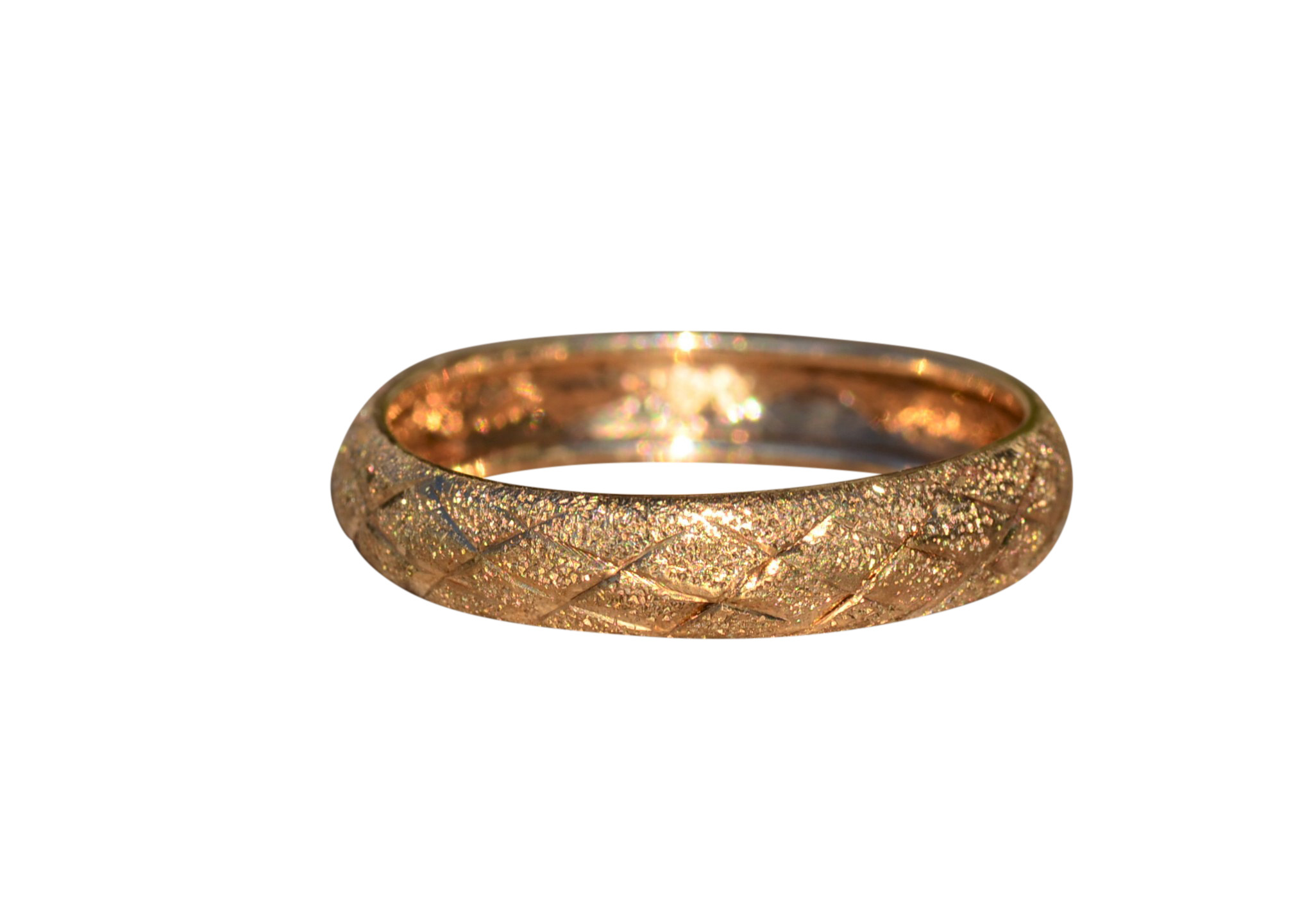 Ladies 10 K Gold Crisscross Band. Add this lightweight gold band to your favorite stack for a trendy layered look. The band is crafted in 10 karat yellow gold and features a crisscross design engraved throughout with a textured finish. This ring is currently a finger size 7.25, yet can be adjusted in size.