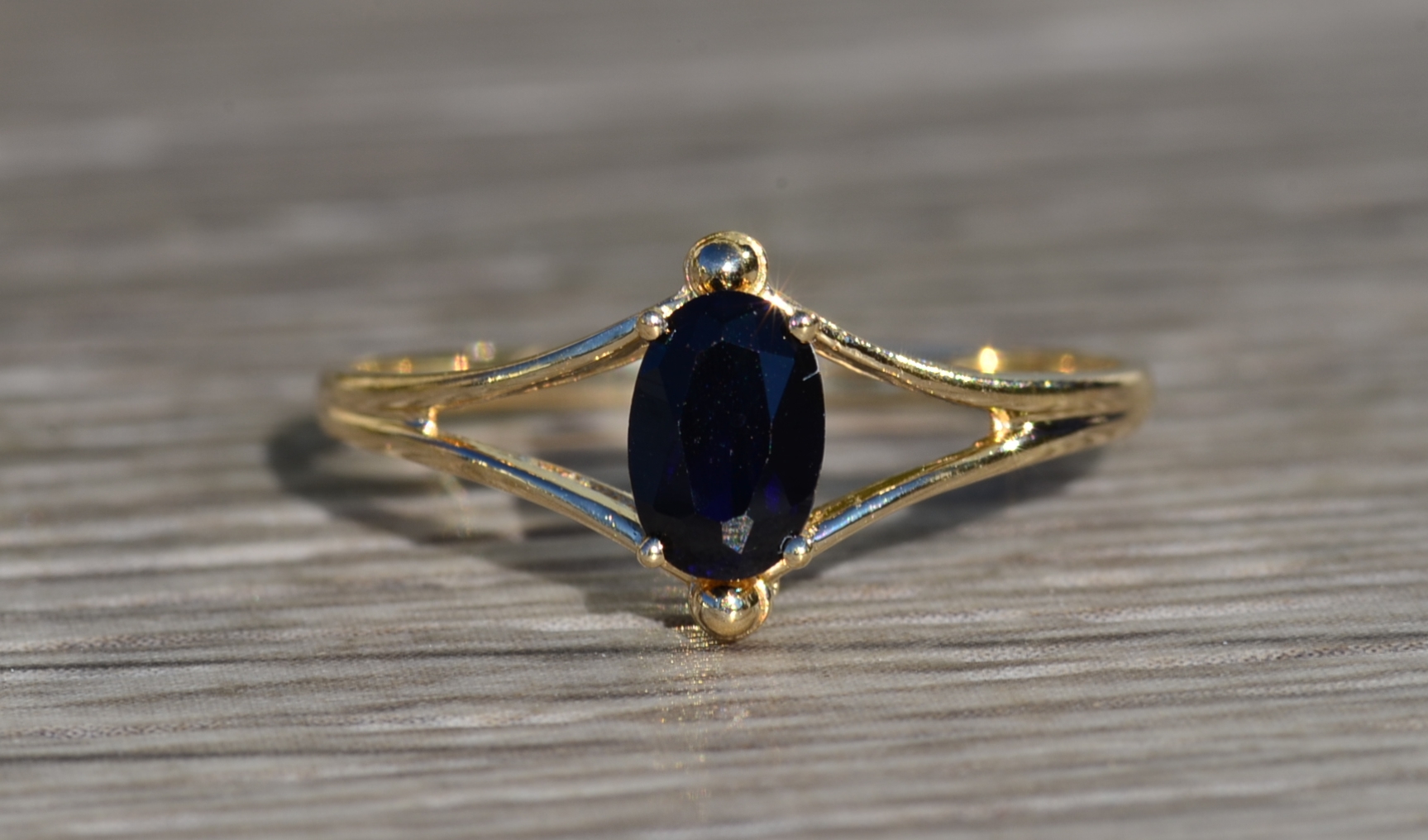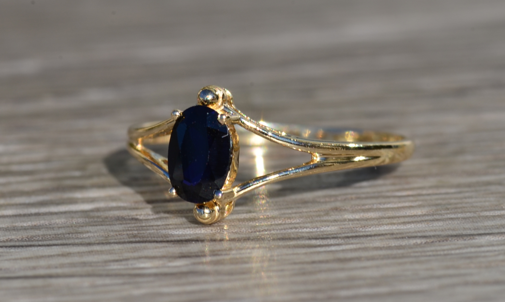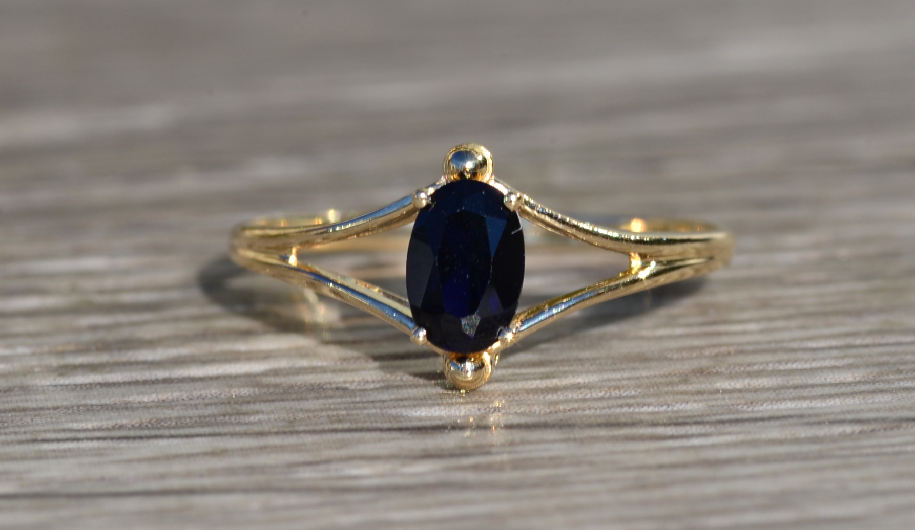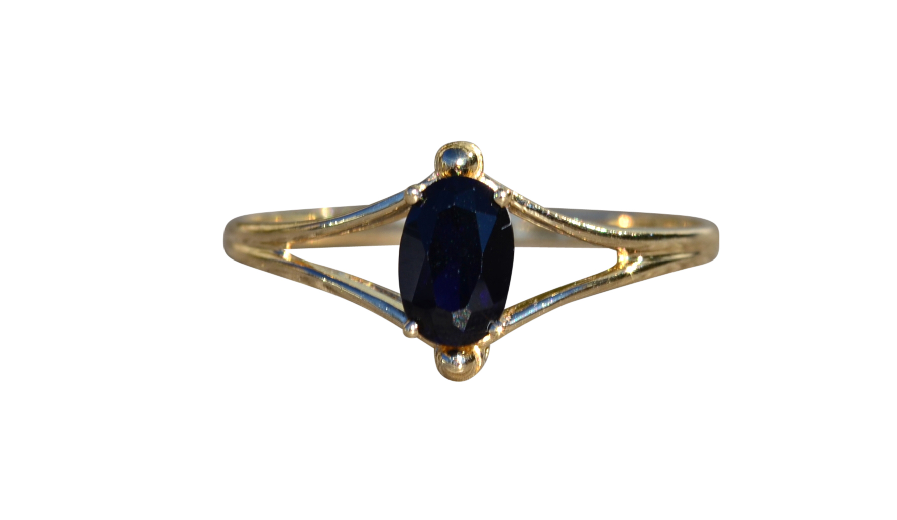 The Crossville: Ladies Split Shank Onyx Engagement Ring in 14K Gold. Crafted in 14 karat yellow gold, this ring centers on an oval cut black onyx. A split shank highlights the center stone and gives the ring dimension. Currently a finger size 6.5, this ring can be resized for an additional charge