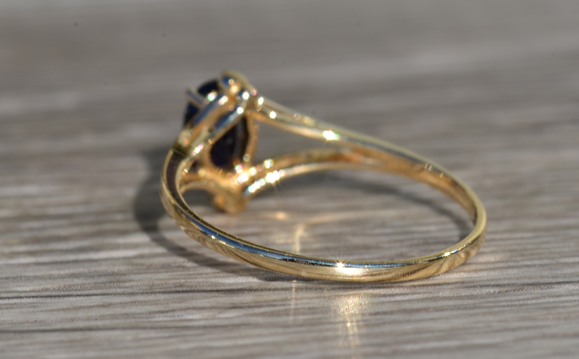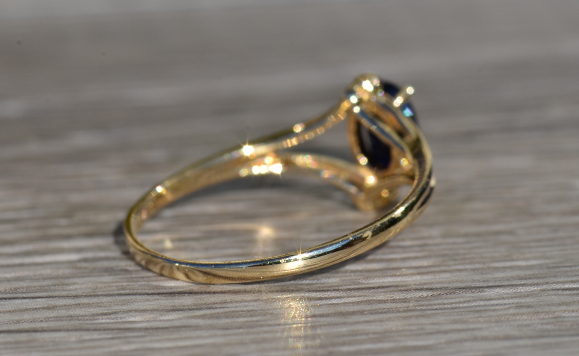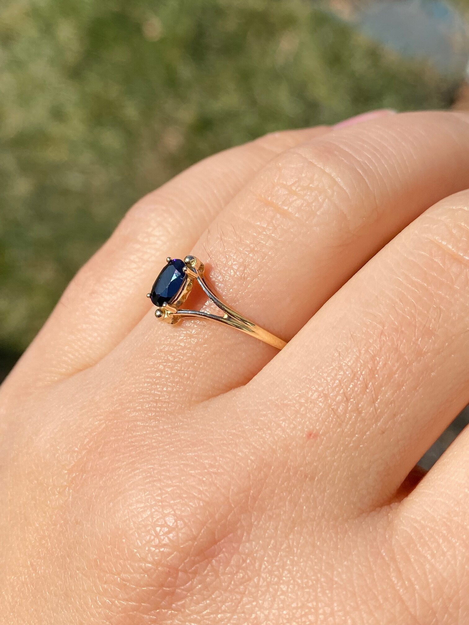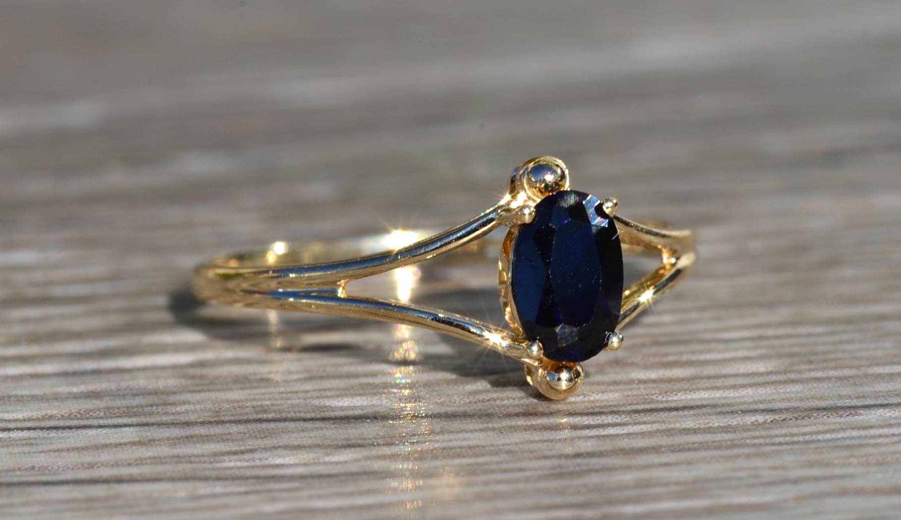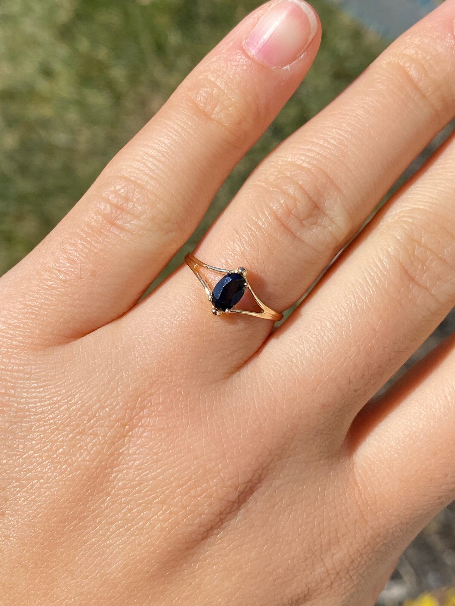 The Crossville: Ladies Split Shank Onyx Engagement Ring in 14K Gold. Crafted in 14 karat yellow gold, this ring centers on an oval cut black onyx. A split shank highlights the center stone and gives the ring dimension. Currently a finger size 6.5, this ring can be resized for an additional charge