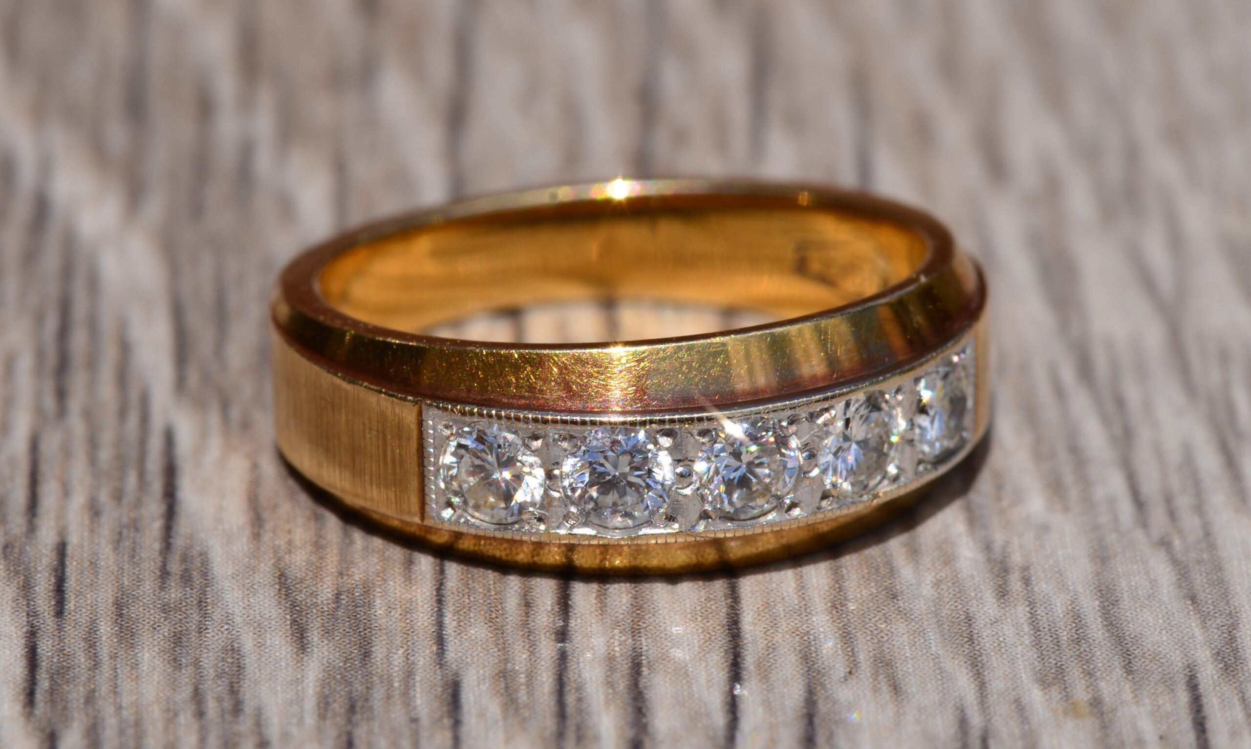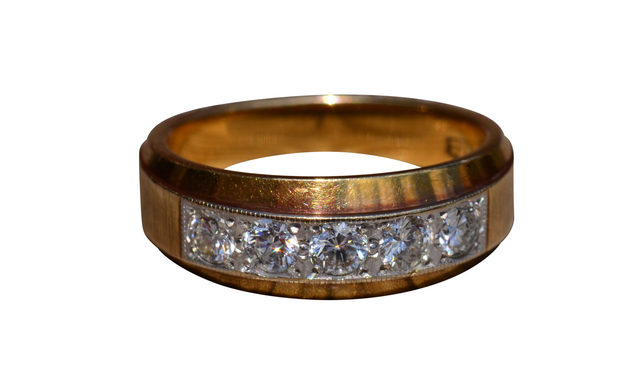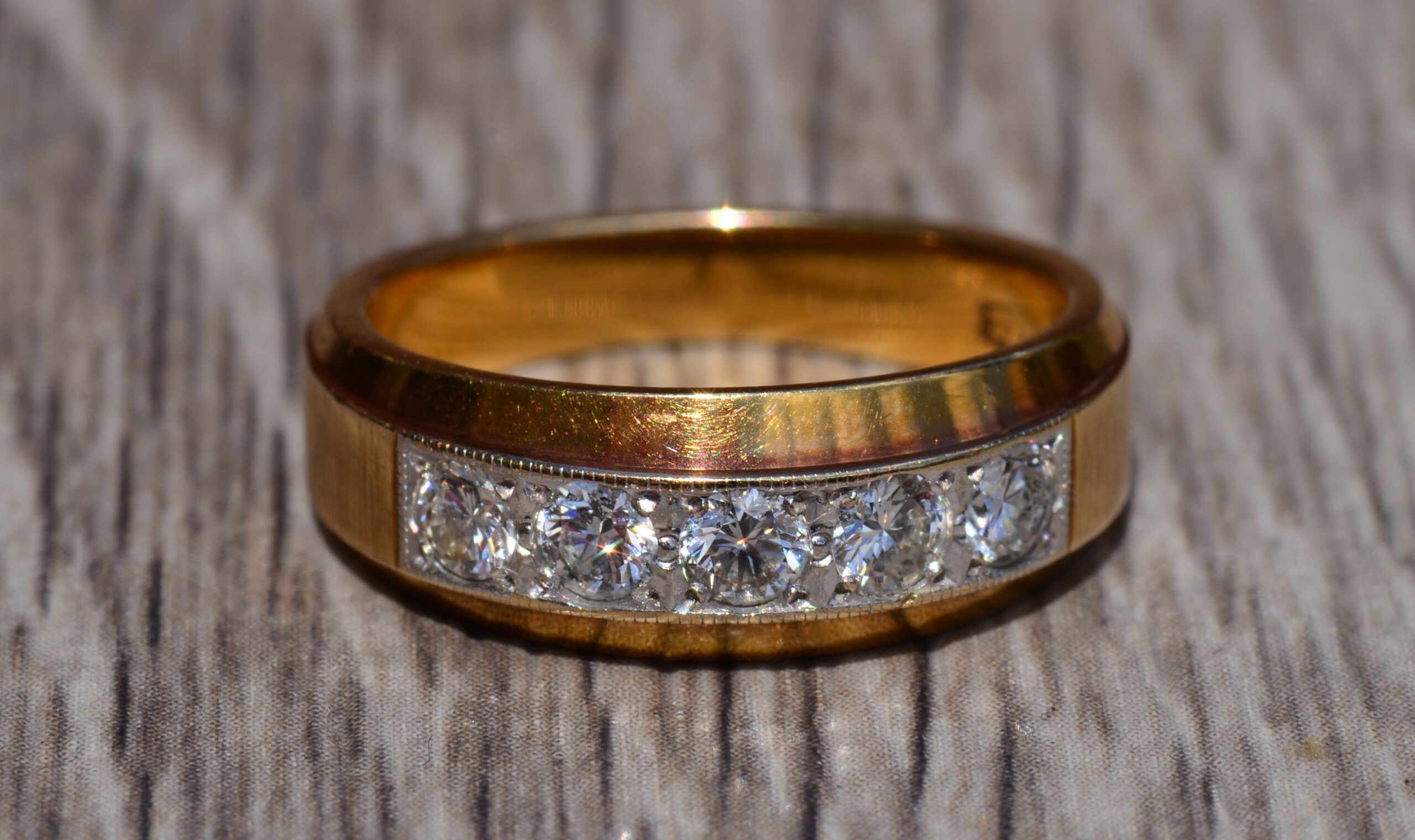 Yellow Gold and Diamond Band. The band is set across the center with five round brilliant cut 0.10 carat diamonds for a total weight of 0.50 carats. The diamonds have an approximate Gemological Institute of America clarity grade of VVS2 and a color grade of G. The ring is crafted in 14 karat yellow gold and the diamonds are set low making it comfortable to wear. The ring is currently a finger size 6 1/2 yet can be adjusted to any finger size.