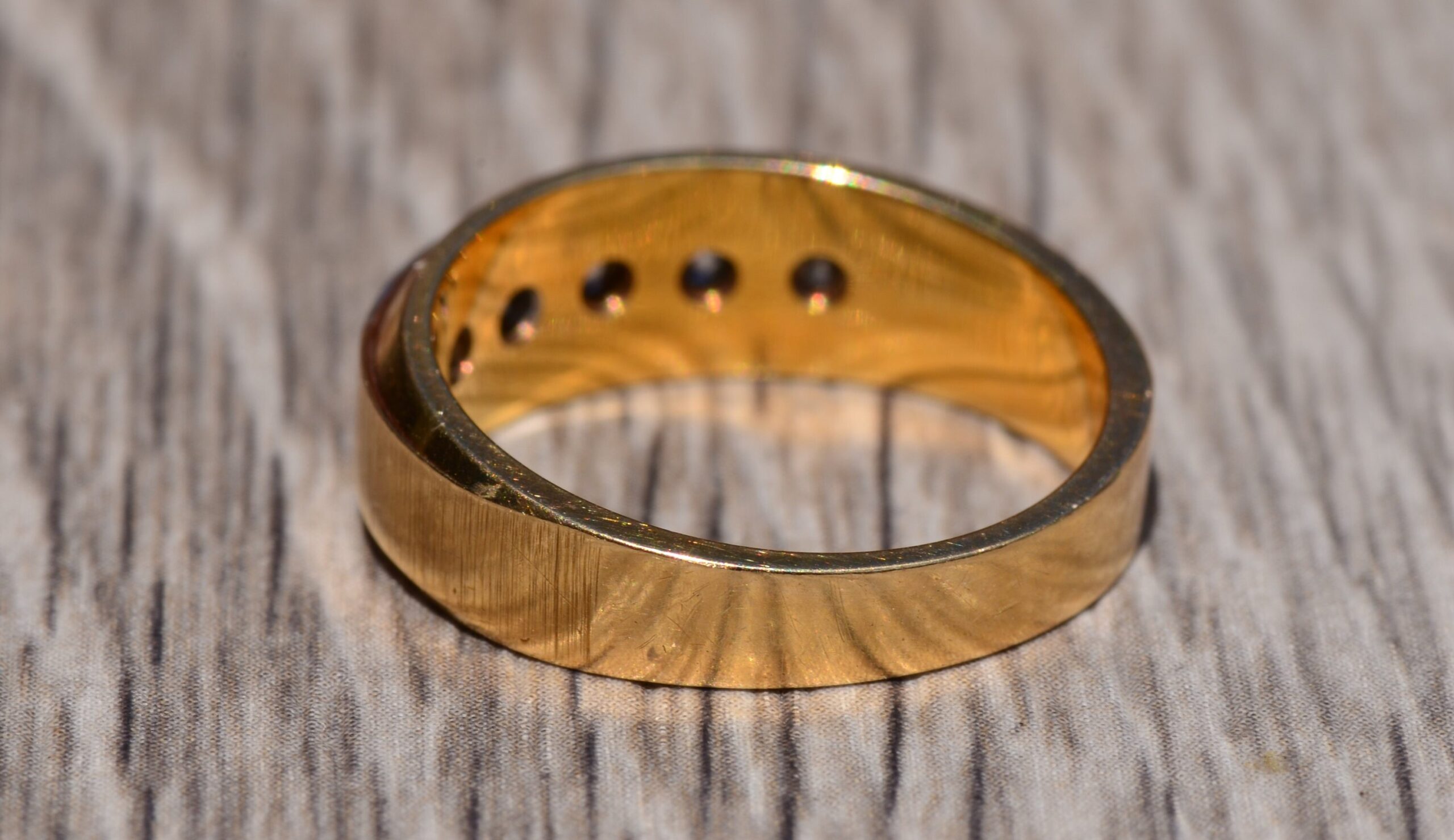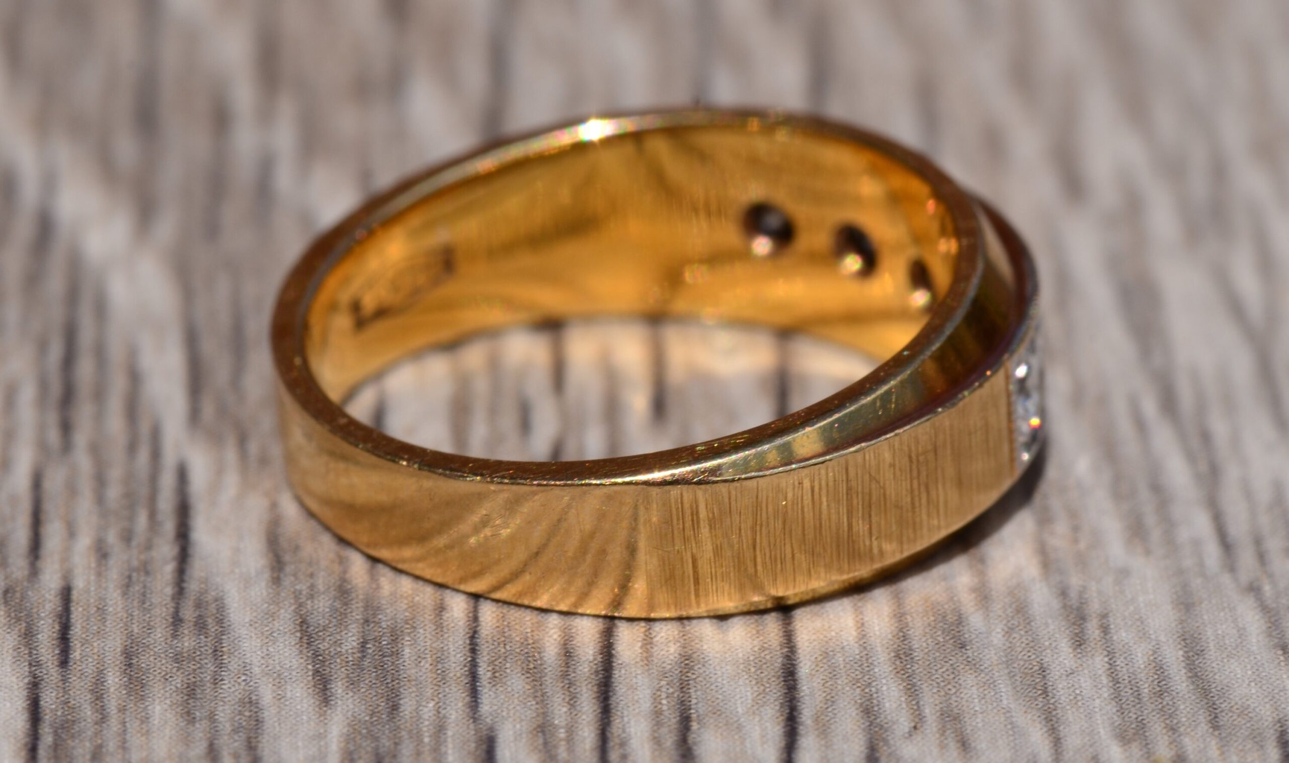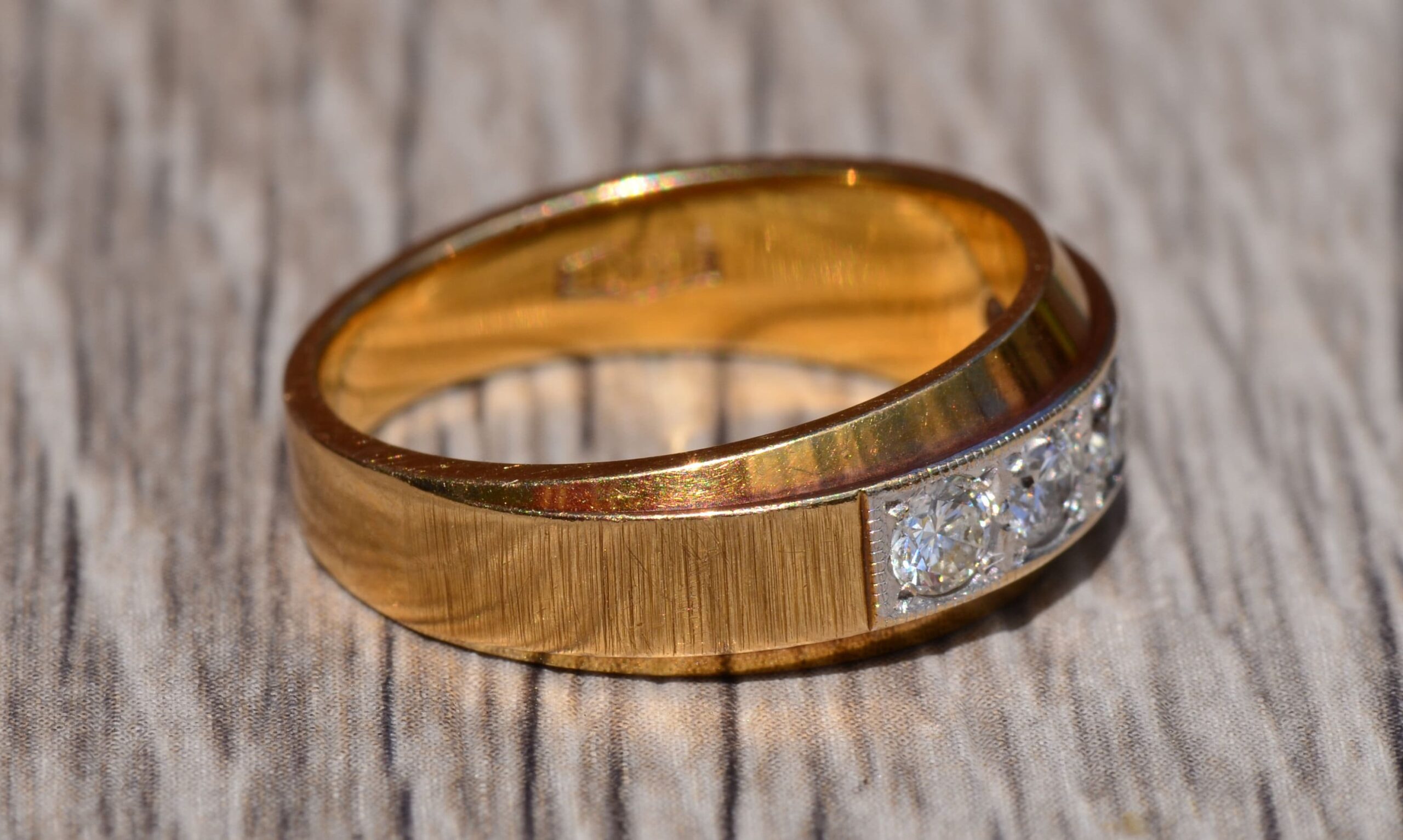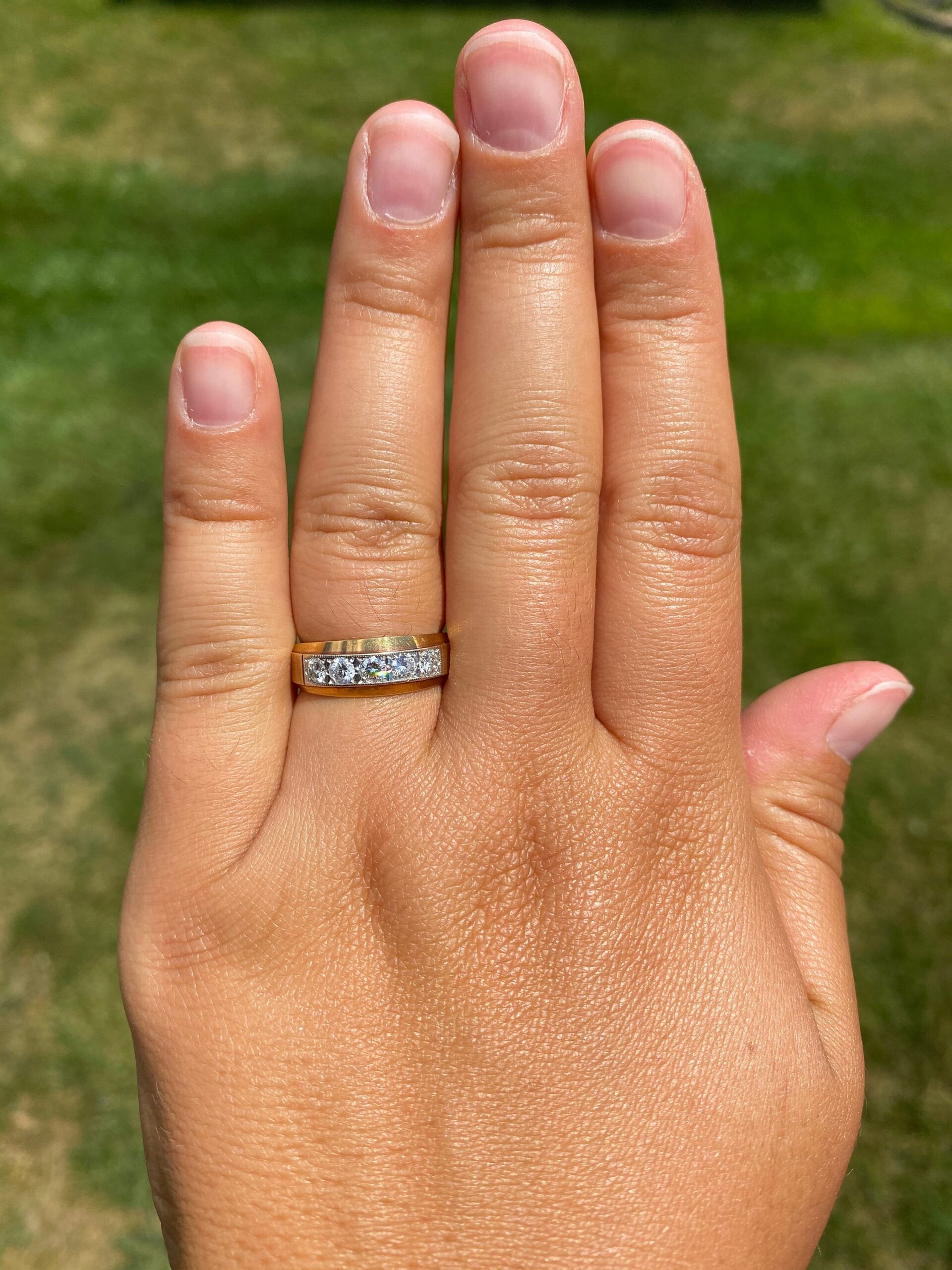 Yellow Gold and Diamond Band. The band is set across the center with five round brilliant cut 0.10 carat diamonds for a total weight of 0.50 carats. The diamonds have an approximate Gemological Institute of America clarity grade of VVS2 and a color grade of G. The ring is crafted in 14 karat yellow gold and the diamonds are set low making it comfortable to wear. The ring is currently a finger size 6 1/2 yet can be adjusted to any finger size.