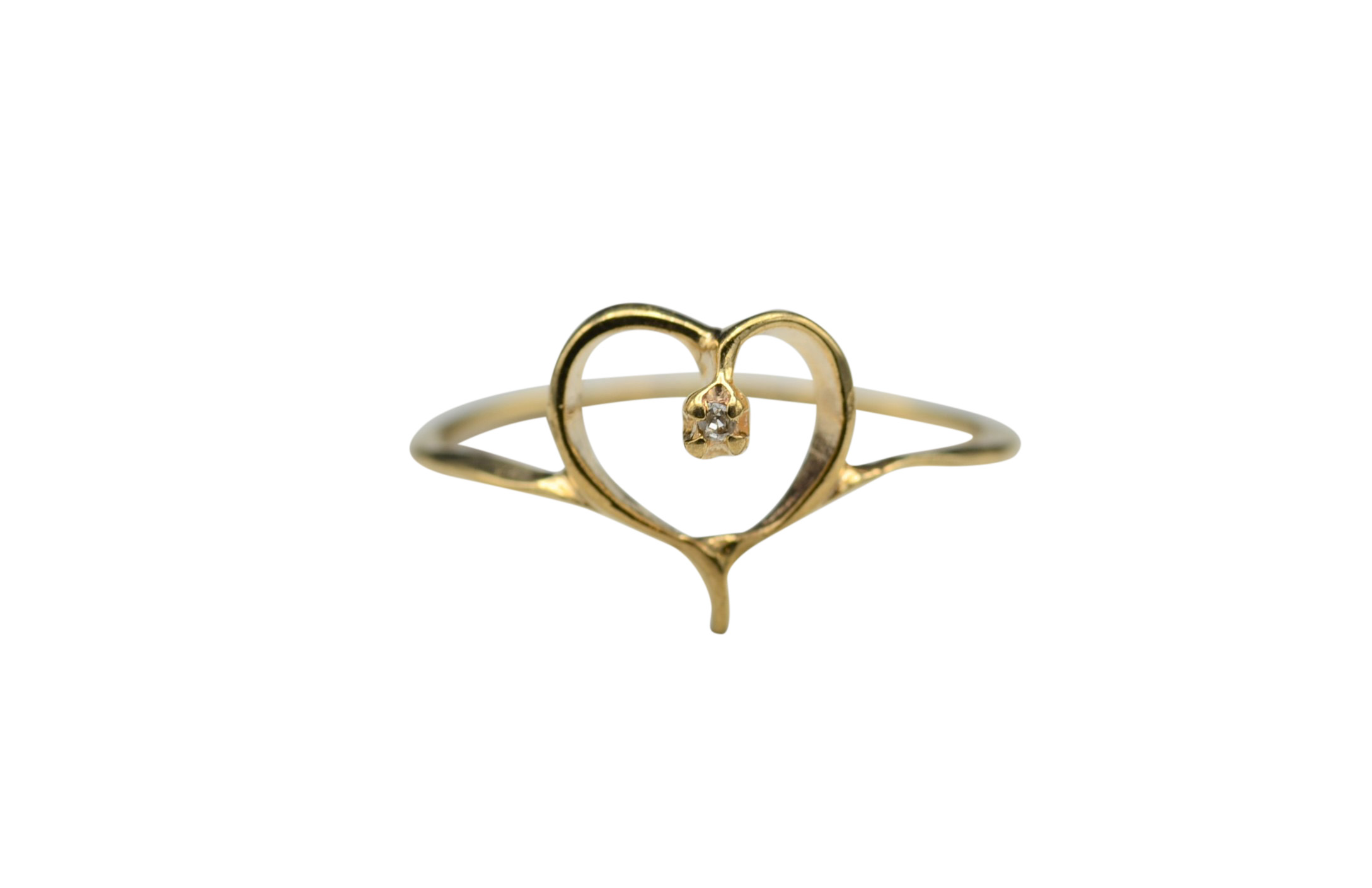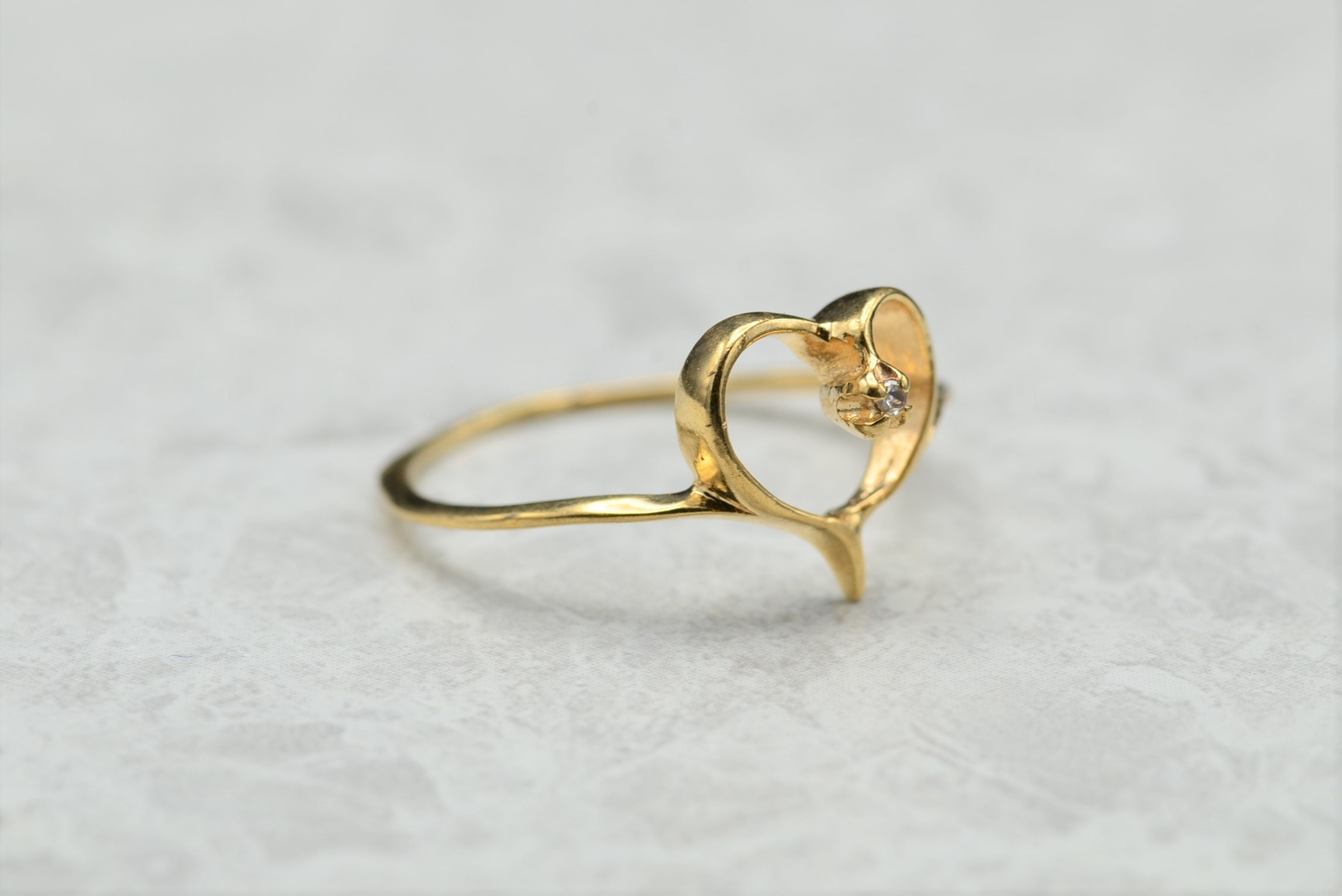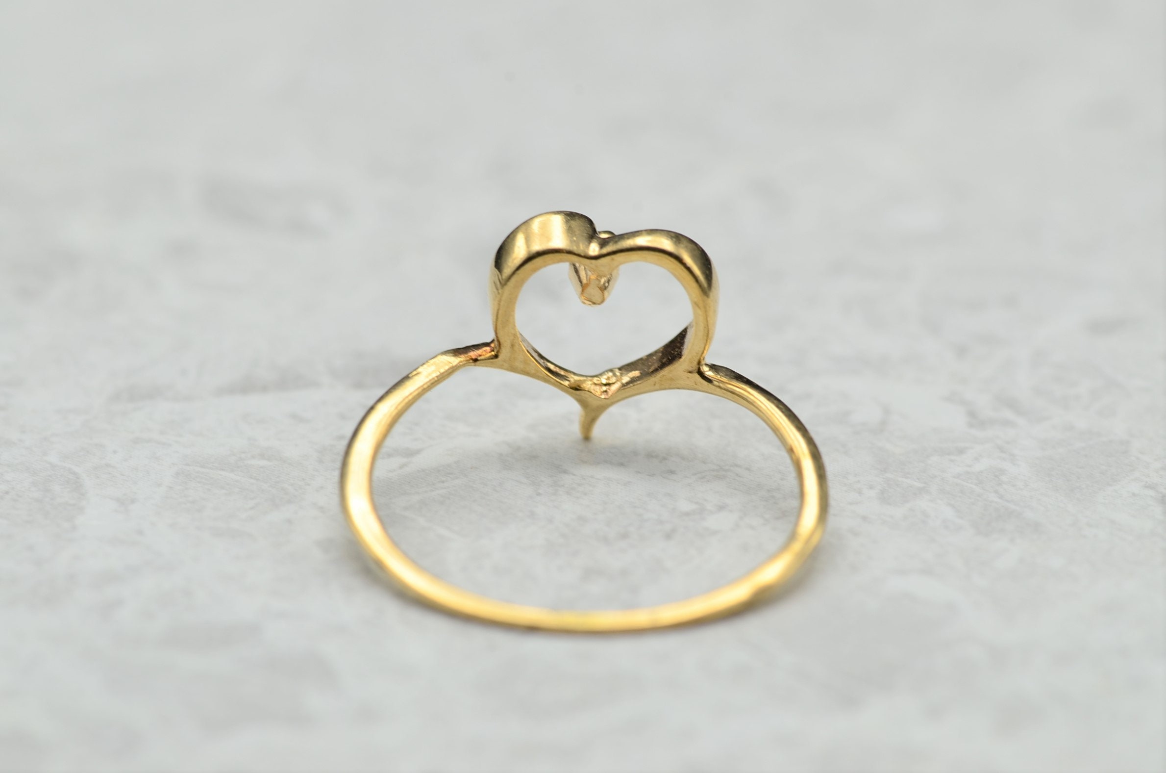 Contemporary Thin Yellow Gold Heart and Diamond Ring. This ring is crafted in yellow gold and features a small accent diamond in the heart. The ring is finger size 5, yet can be adjusted to any size.