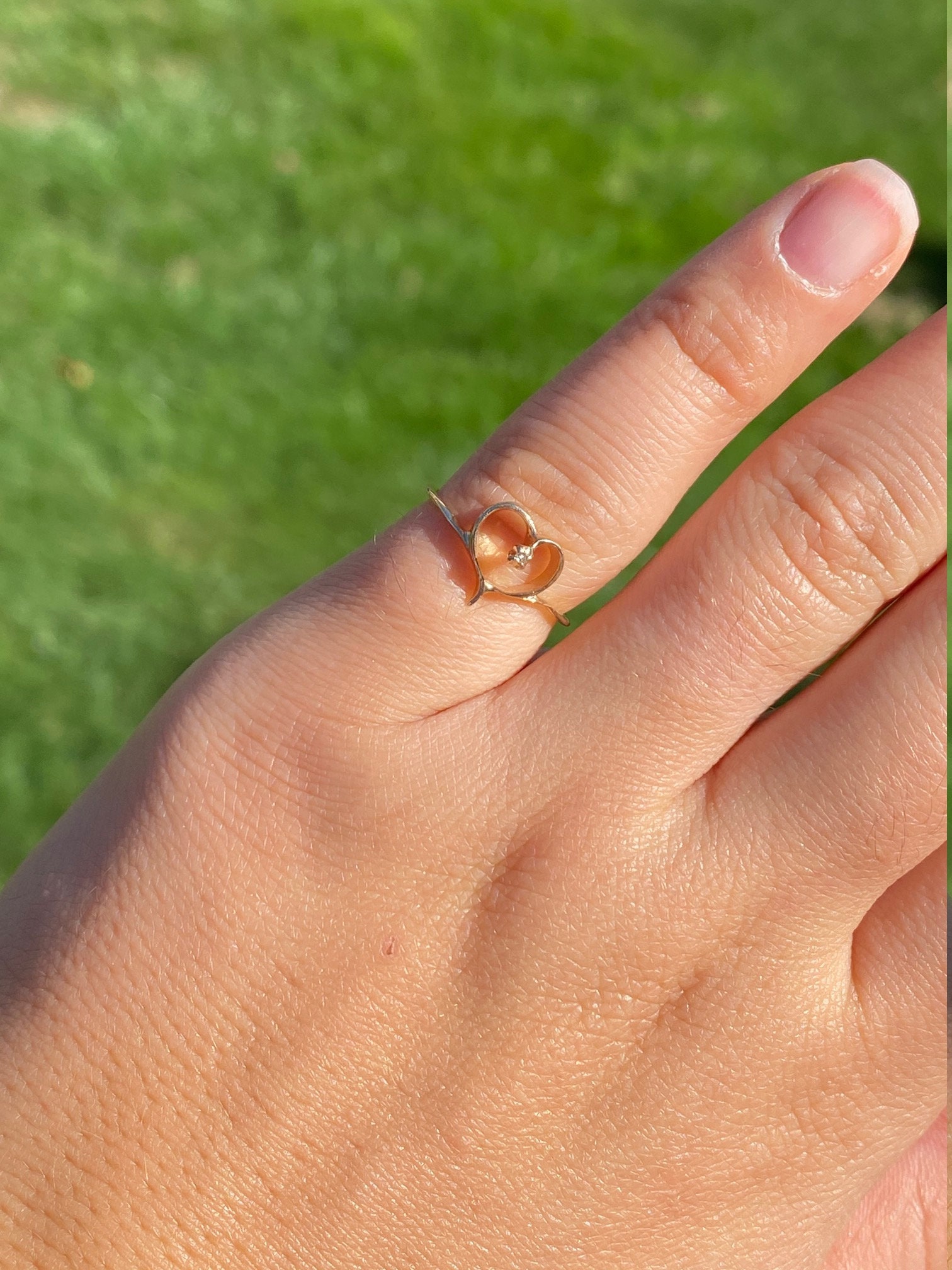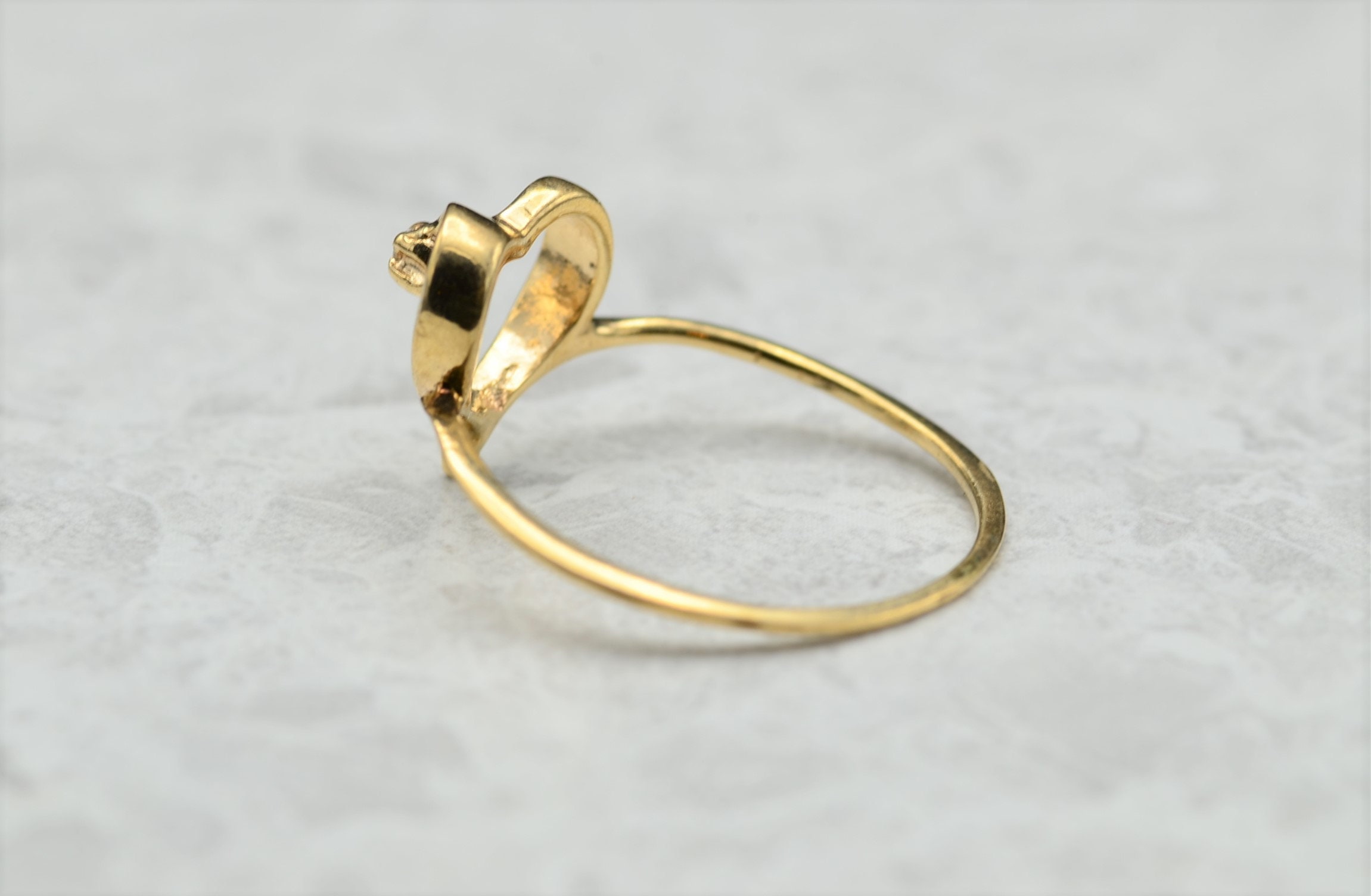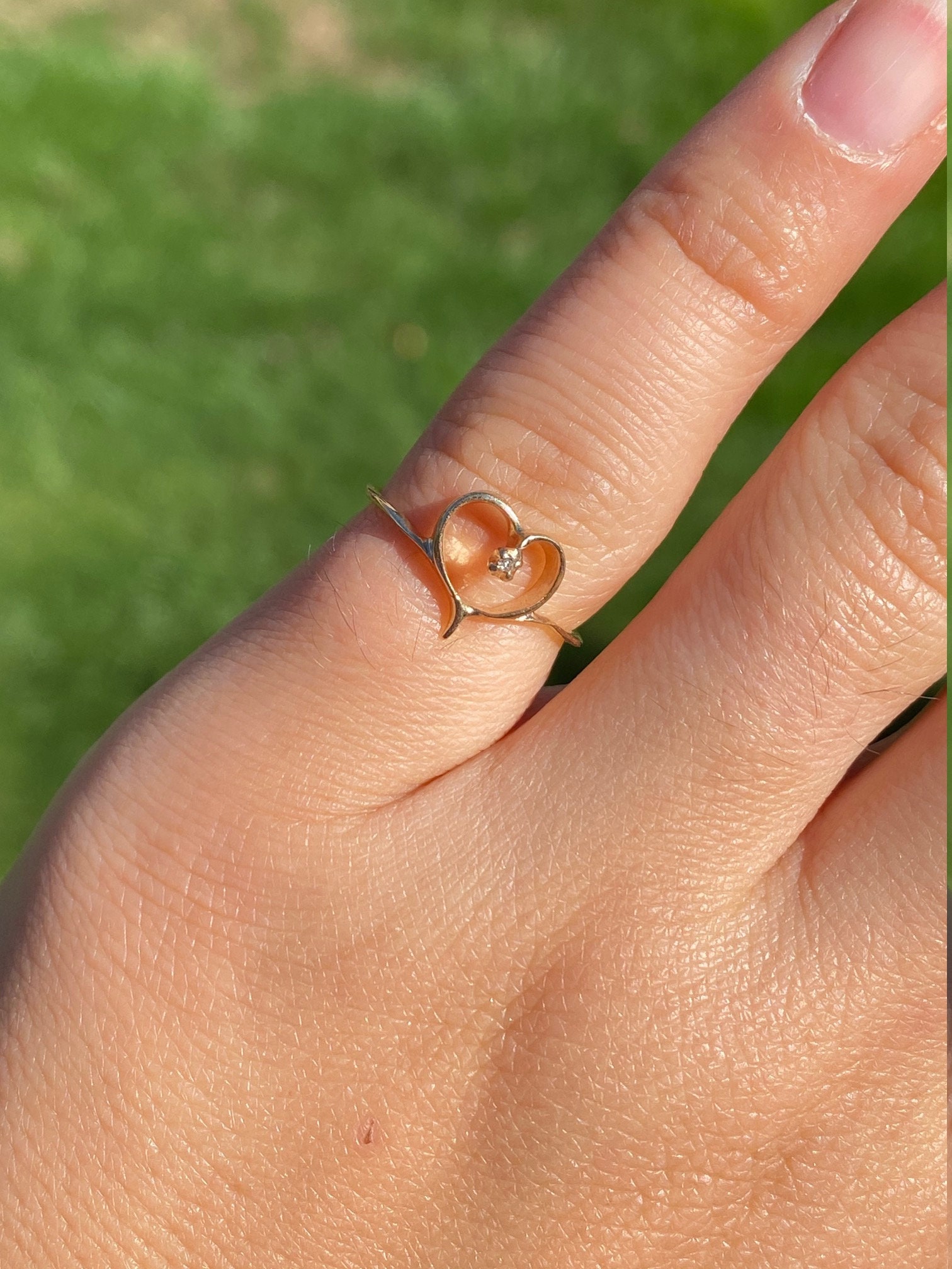Contemporary Thin Yellow Gold Heart and Diamond Ring. This ring is crafted in yellow gold and features a small accent diamond in the heart. The ring is finger size 5, yet can be adjusted to any size.