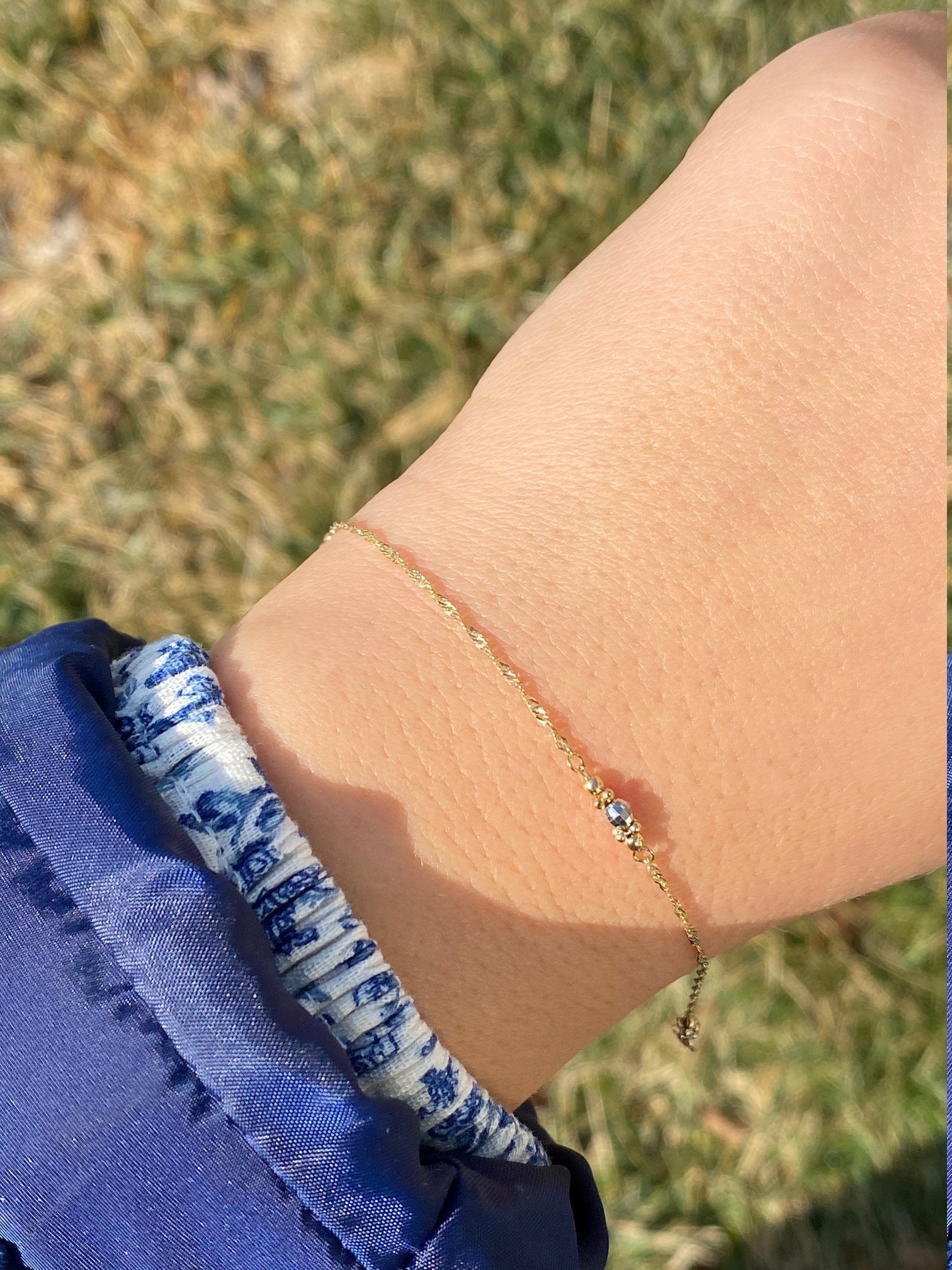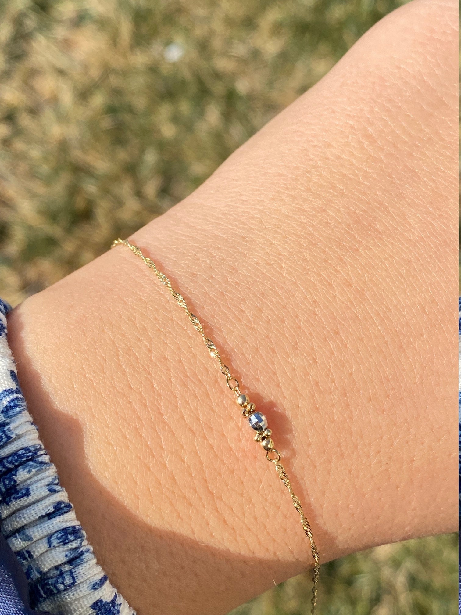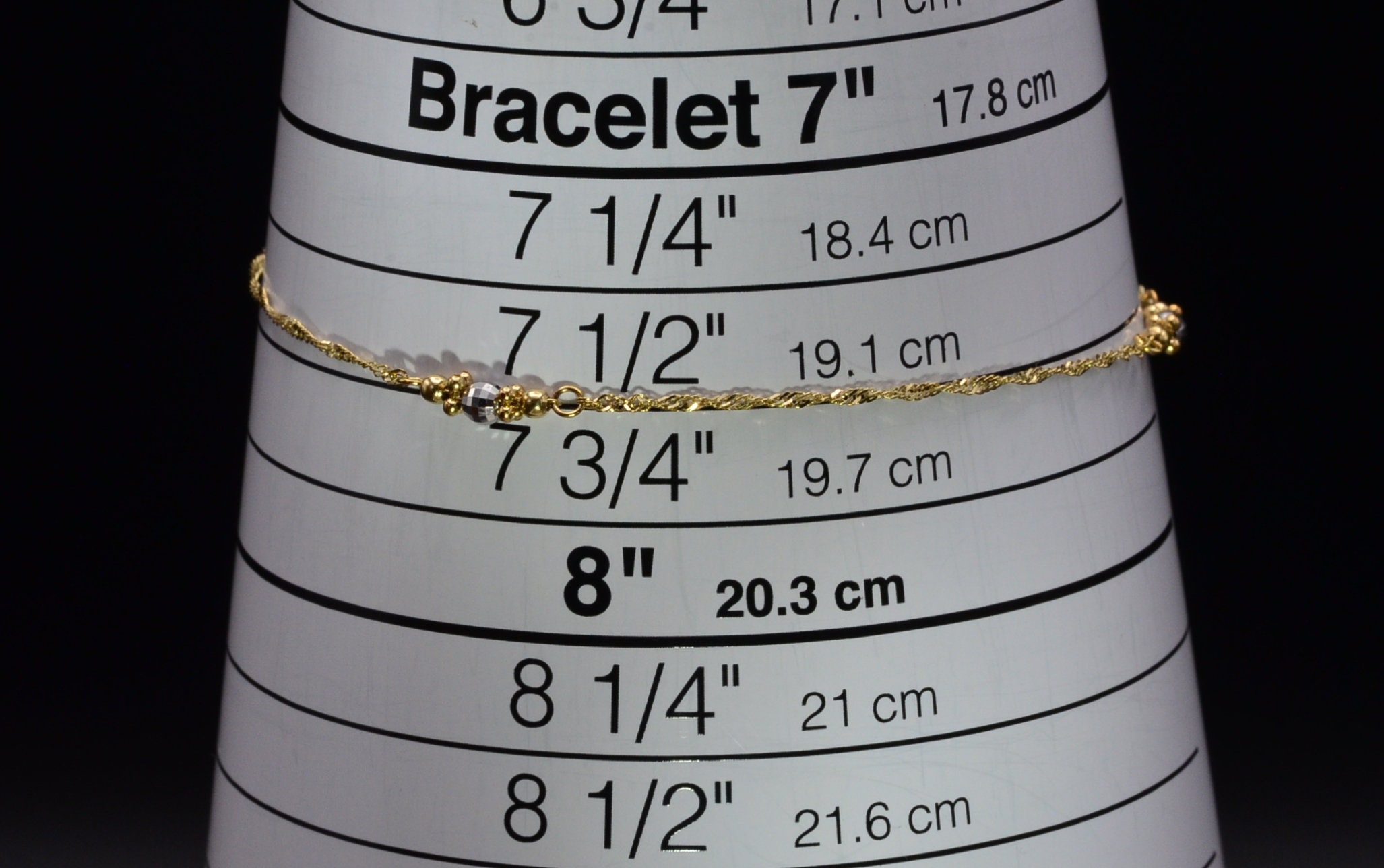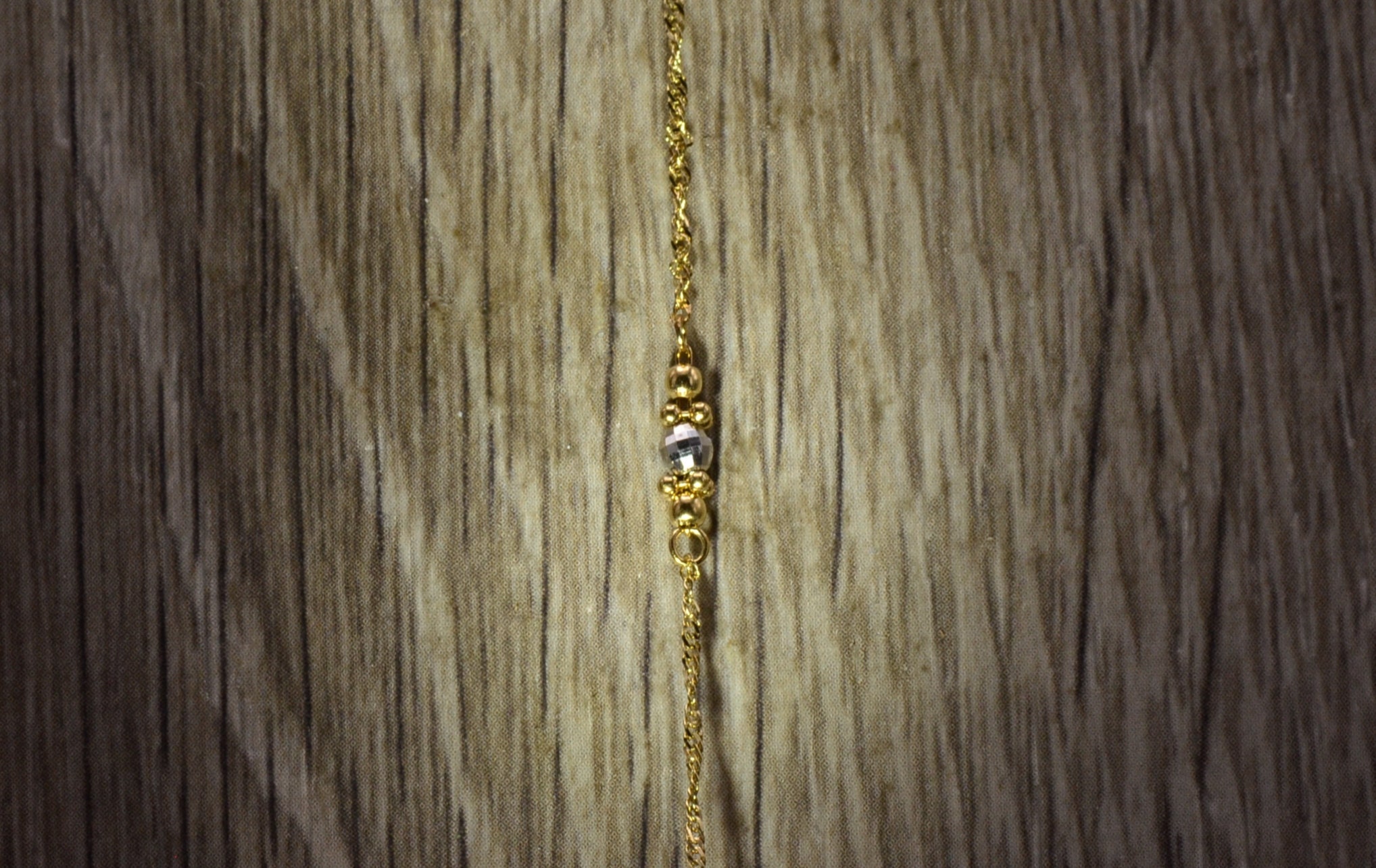 The Cullman Street: Ladies 14K Two Tone Thin Diamond Cut Station Bracelet. Finely crafted in 14 karat gold, this ladies thin bracelet features three stations of diamond cut white gold and yellow gold beads. The bracelet measures 7.5 inches in length.