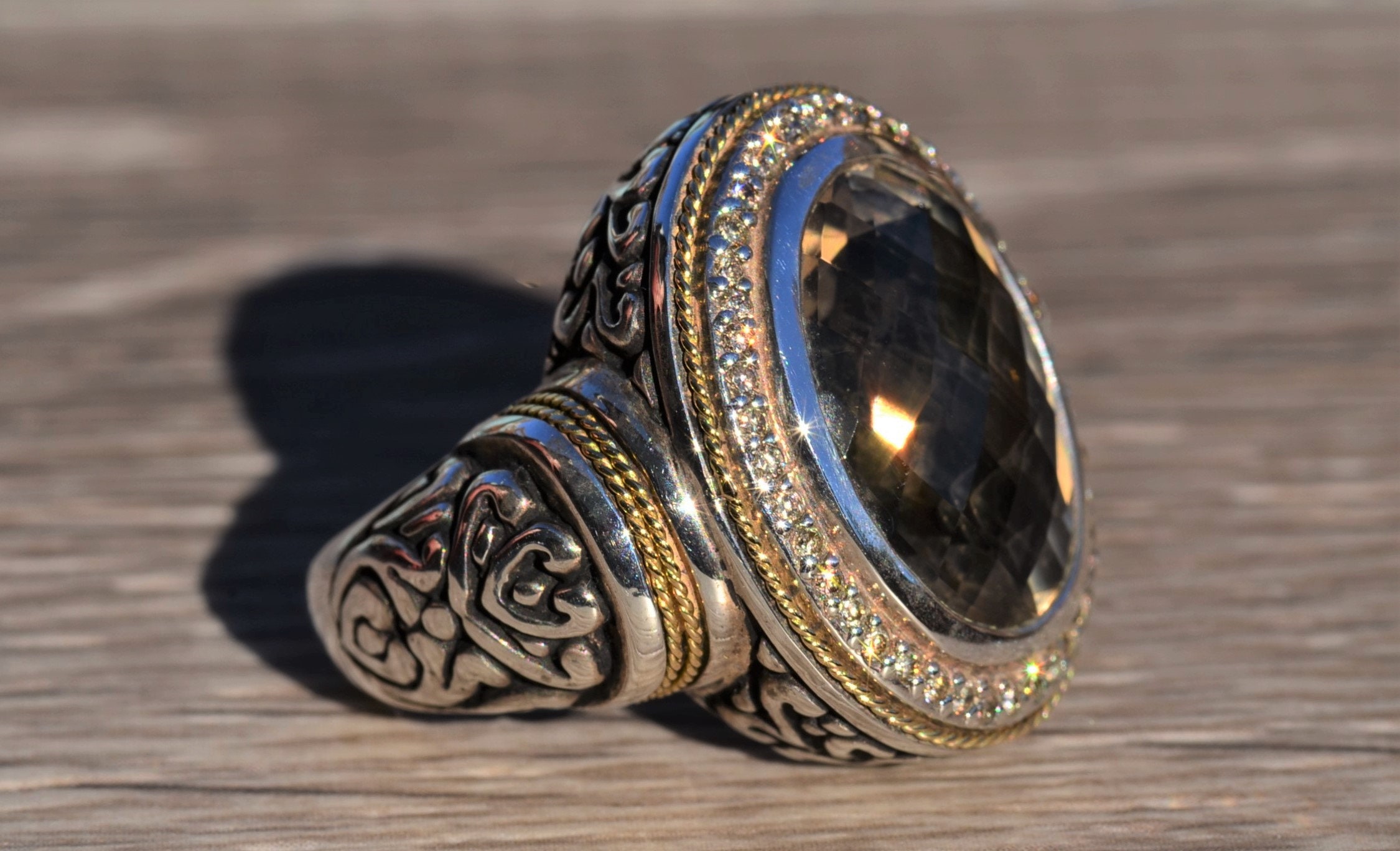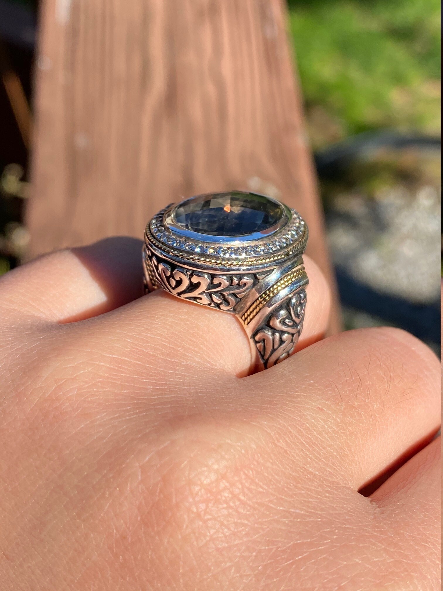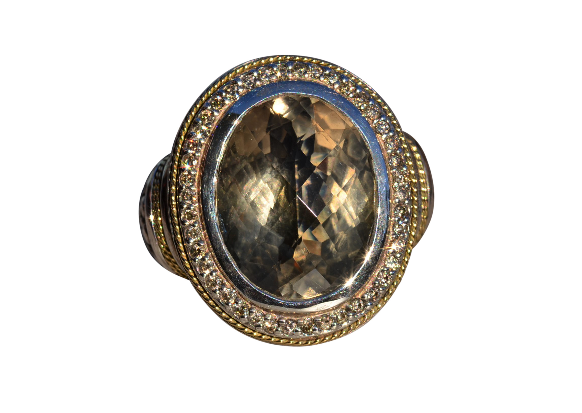 Signed Phillip Gavriel Cocktail Ring set in Sterling Silver and 18 Karat Gold. This statement ring features a checkerboard cut oval quartz center stone with diamond halo. Bold engraving and scroll work dominate the design of this ring. The ring is crafted in sterling silver with 18 karat yellow gold accents. The ring measures a finger size 6 1/4, yet can be adjusted in size.