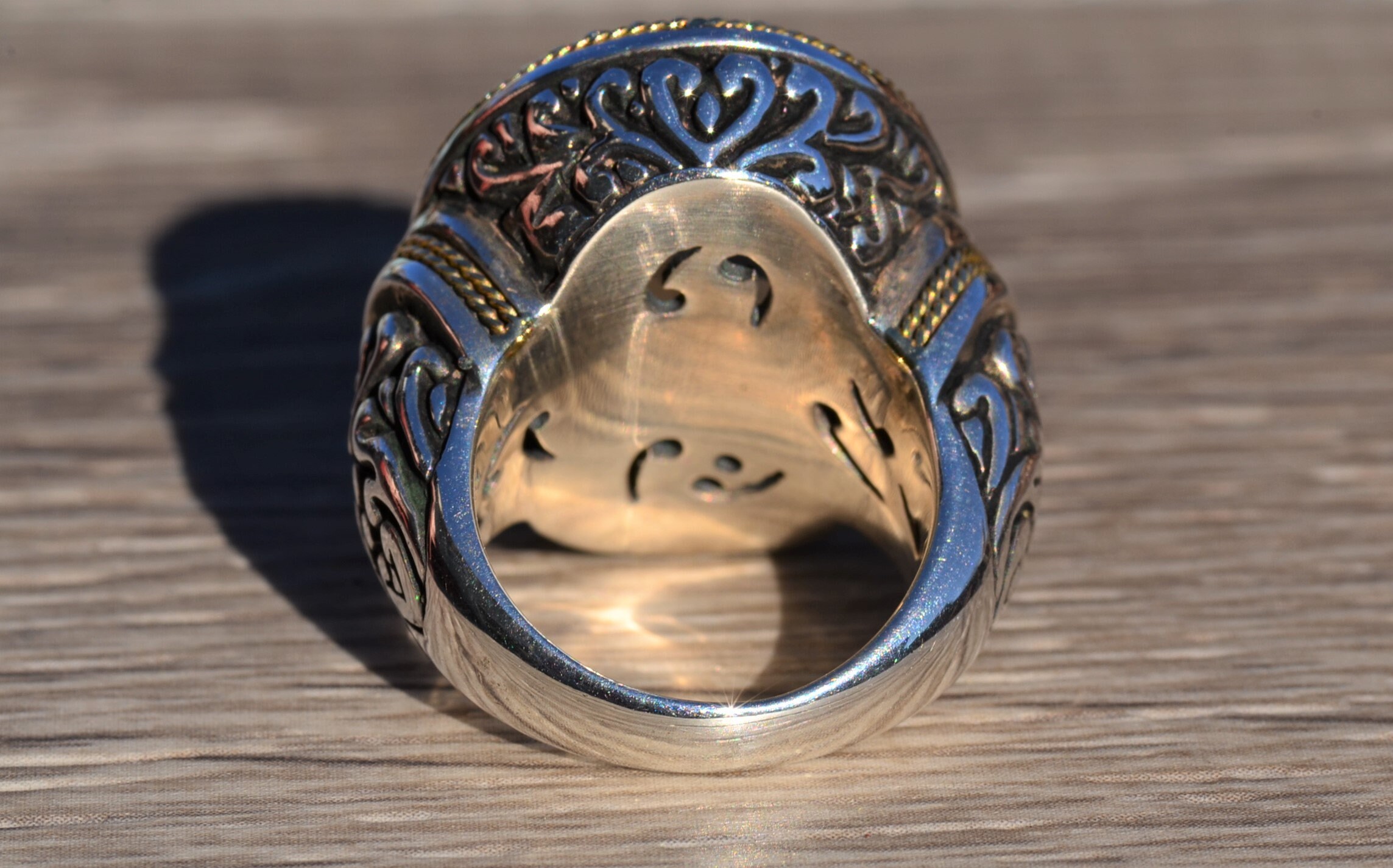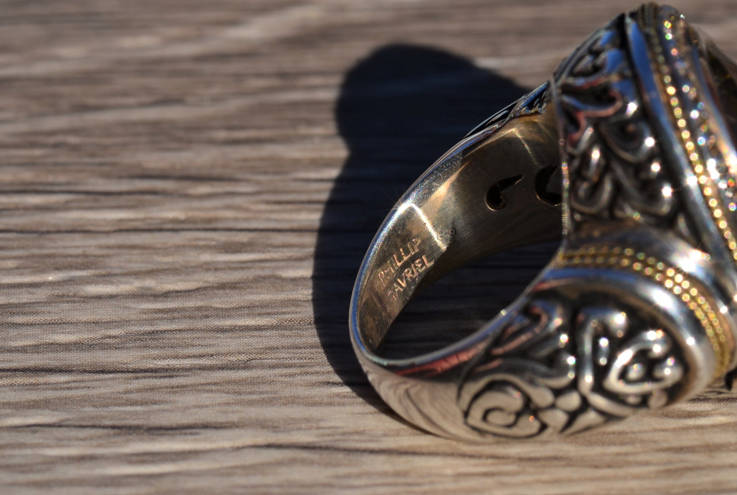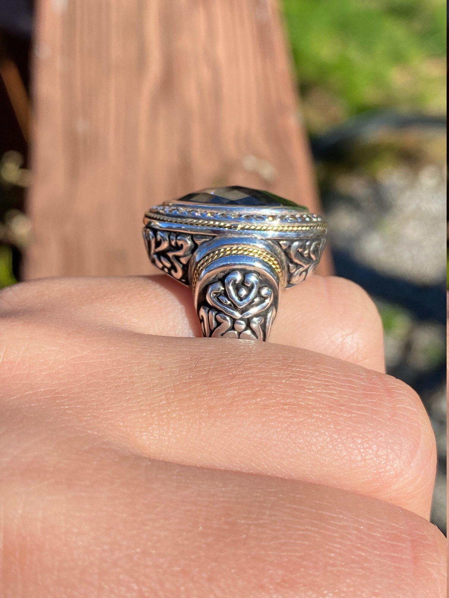 Signed Phillip Gavriel Cocktail Ring set in Sterling Silver and 18 Karat Gold. This statement ring features a checkerboard cut oval quartz center stone with diamond halo. Bold engraving and scroll work dominate the design of this ring. The ring is crafted in sterling silver with 18 karat yellow gold accents. The ring measures a finger size 6 1/4, yet can be adjusted in size.