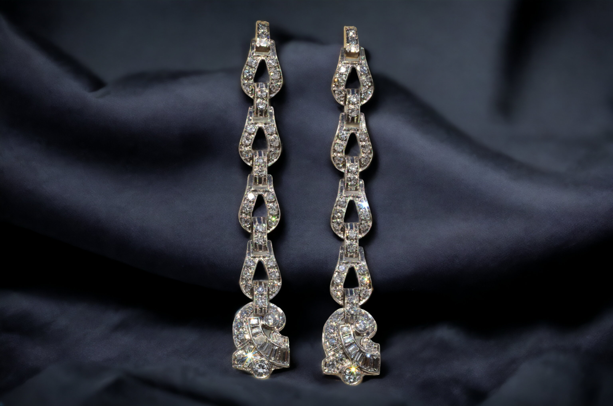 Antique Platinum & Diamond Dangler Earrings. The earrings are set with 2.60 carats of old cut diamonds throughout including antique baguette cut diamonds at the bottom of the earring. The earrings are finished with milgrain. Very comfortable to wear the earrings dangle almost three inches in length making them great antique earrings for a wedding, black tie event, or everyday wear to the super market! The earrings are marked and tested as platinum.