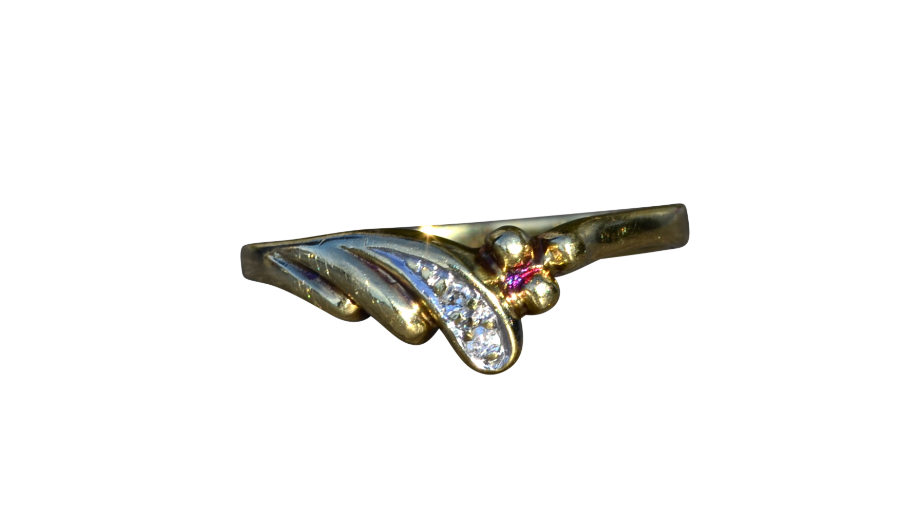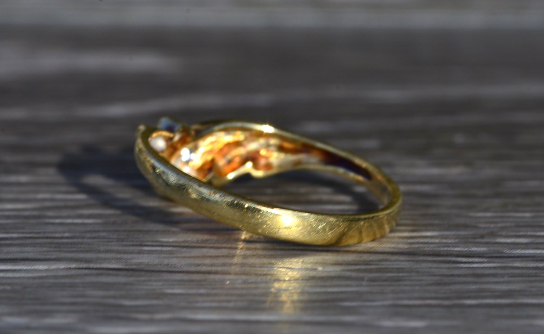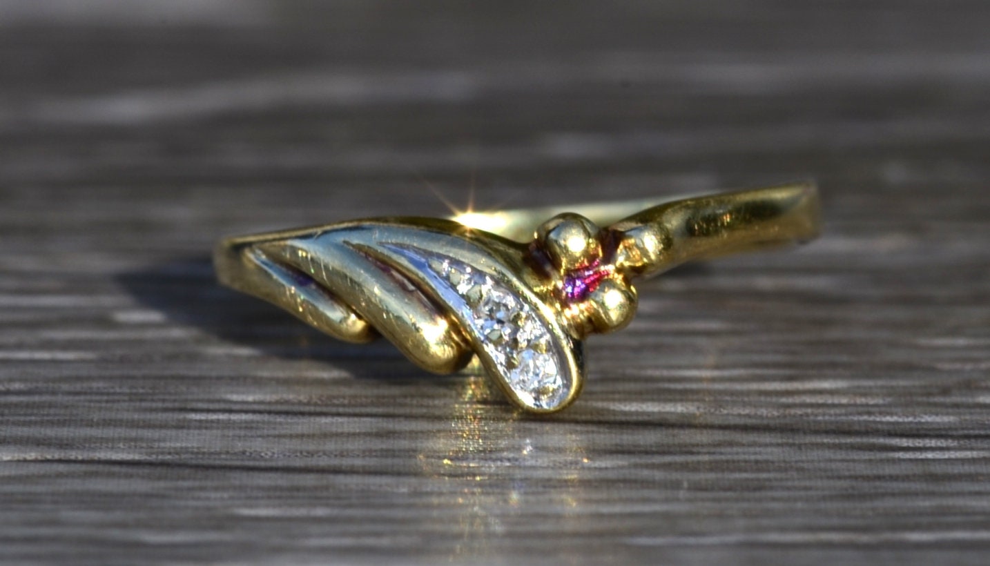 The Dandridge: Ladies 14K Gold Cocktail Ring with Diamonds. Crafted in 14 karat yellow gold, this vintage ladies ring is accented with diamonds. Currently a finger size 5.25, this ring can be resized for an additional charge.