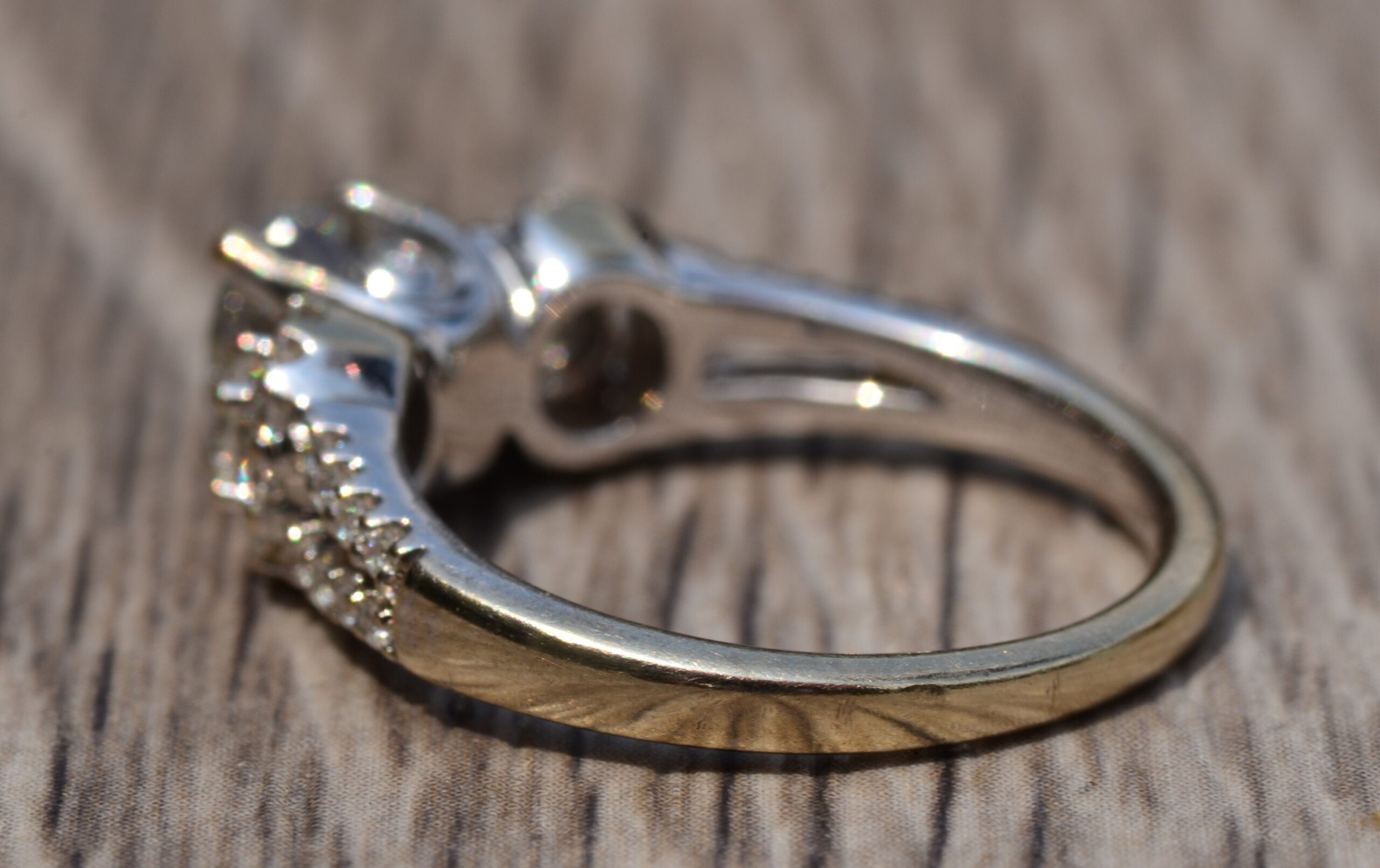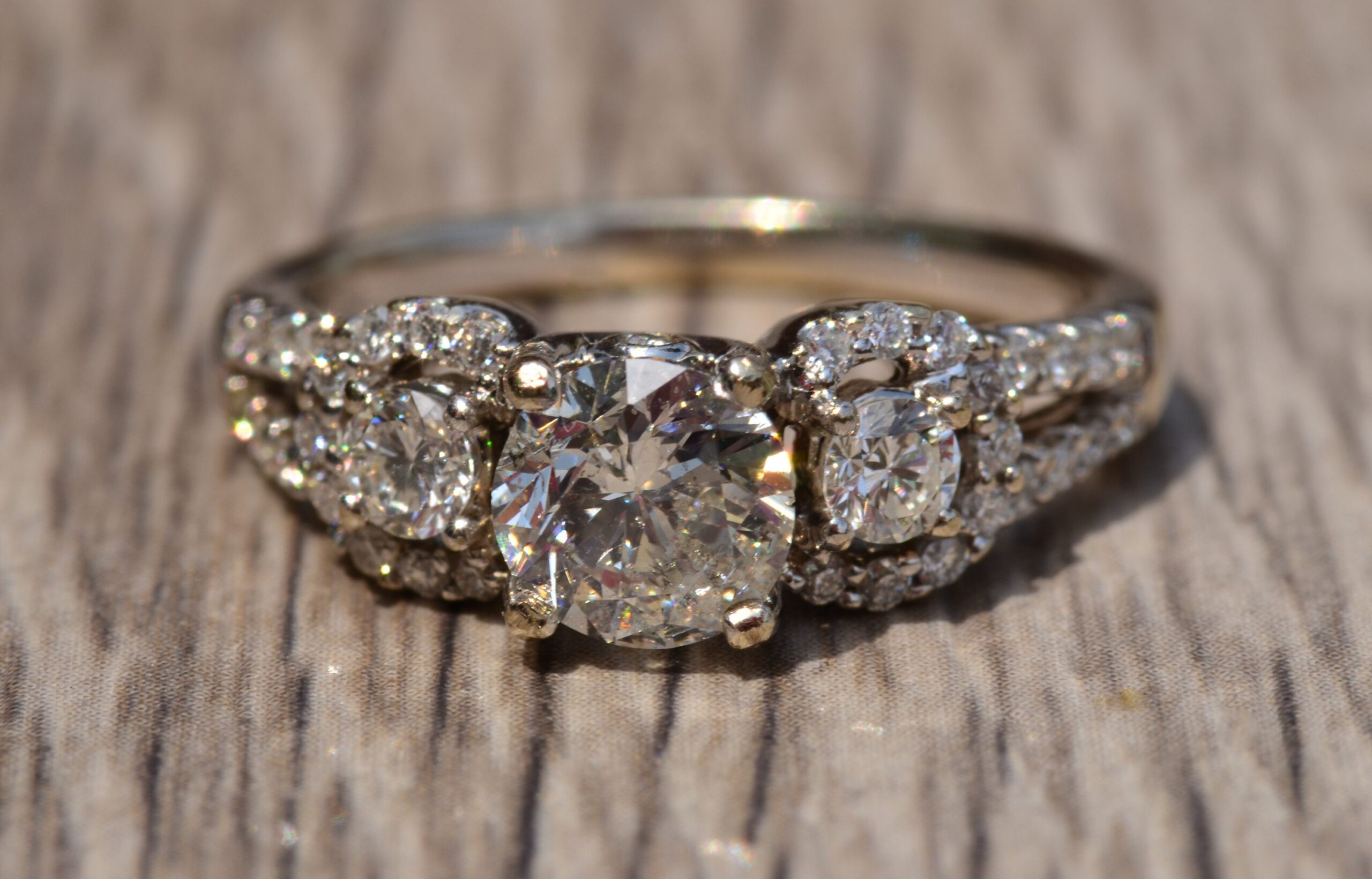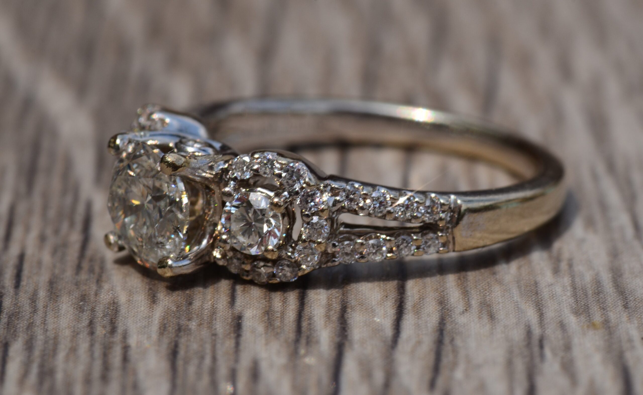 Ladies Engagement Ring set with 0.91 Carat Center round brilliant cut diamond. The diamond has a Gemological Institute of America clarity grade of I2 and a color grade of K. On either side of the center and continuing down the shank are 0.47 carats total weight of diamonds. This ring is currently a finger size 6 1/4, yet can be adjusted in size.