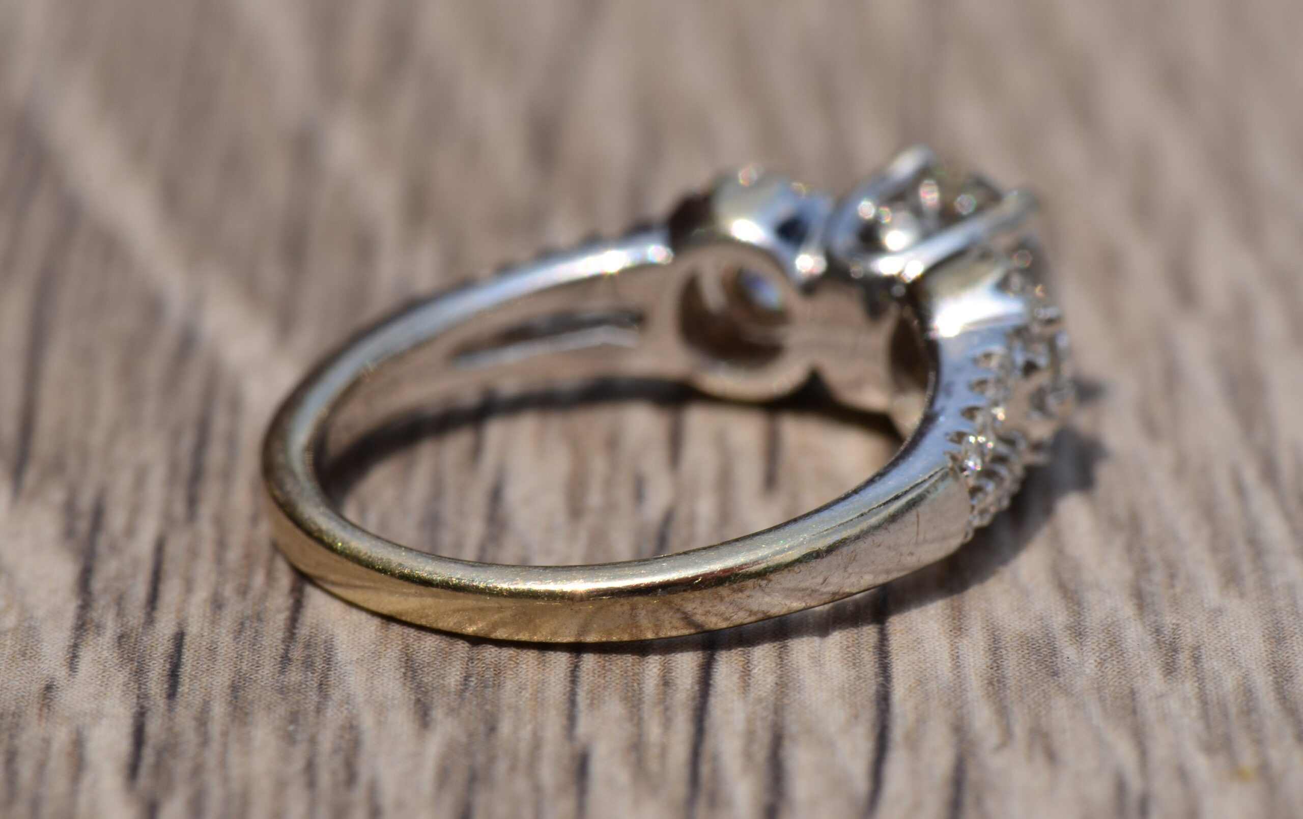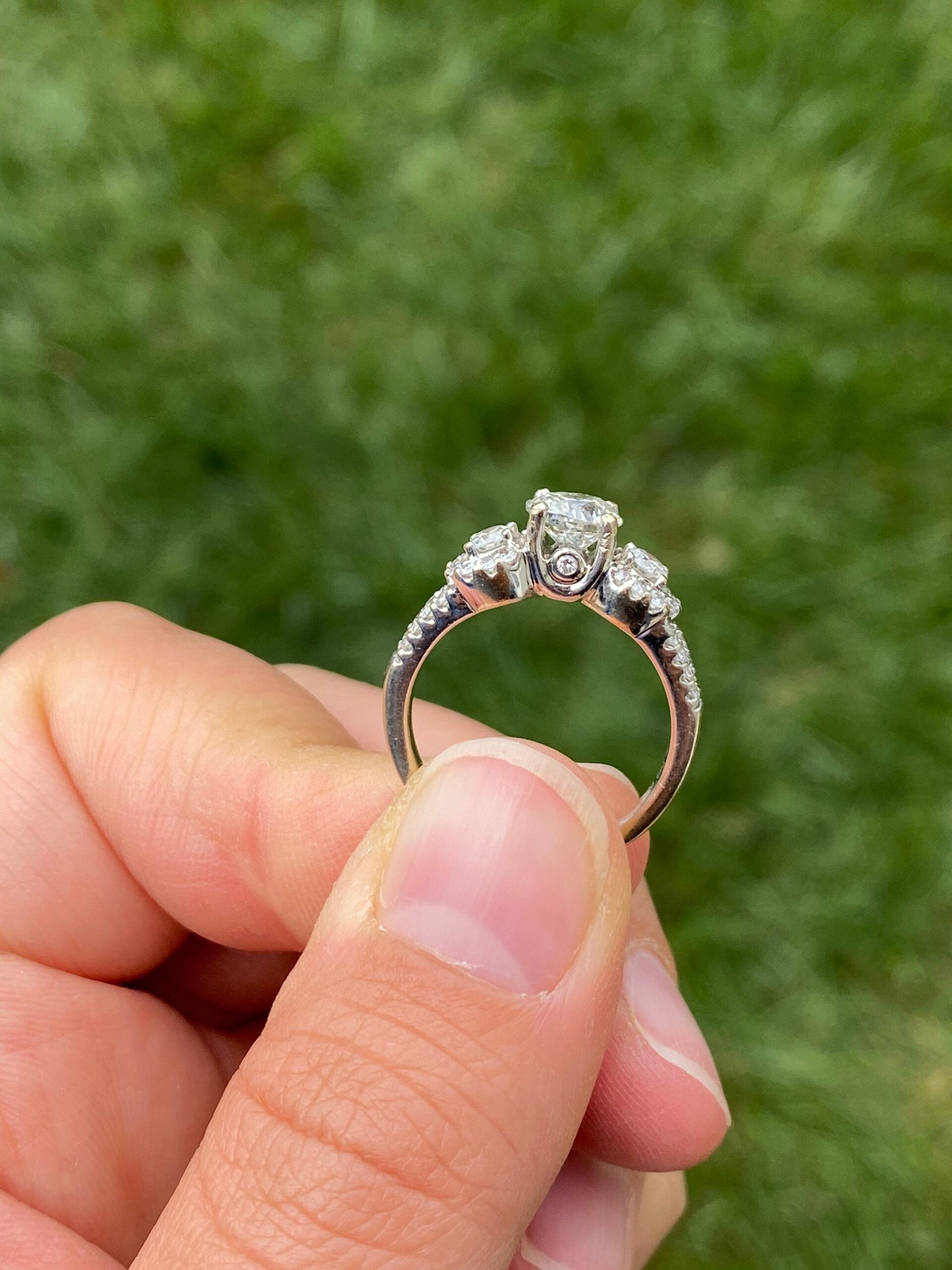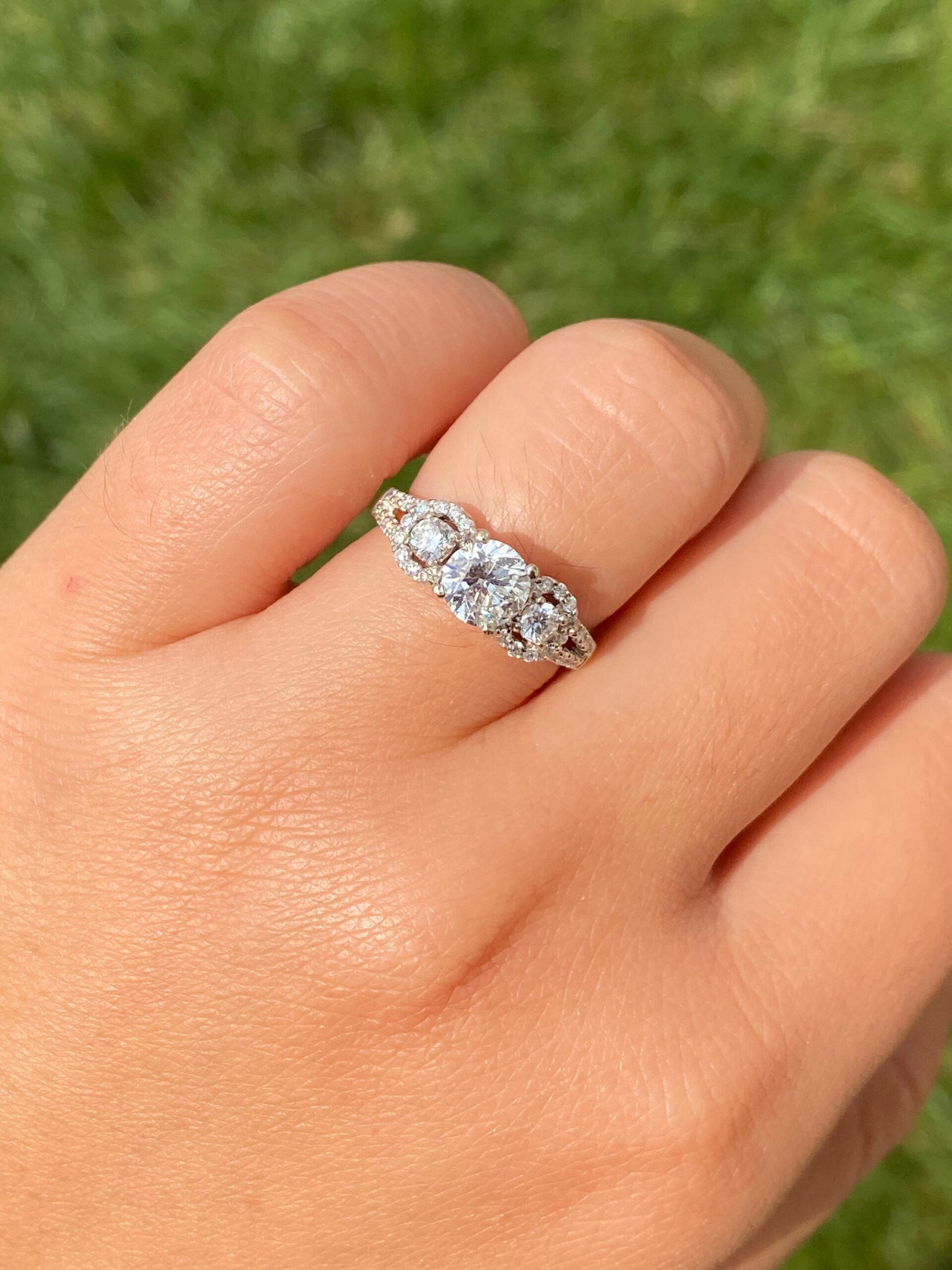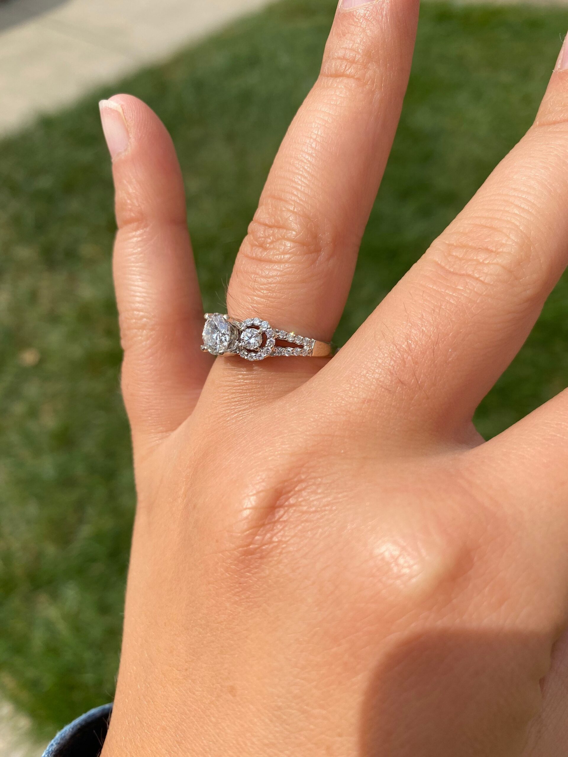 Ladies Engagement Ring set with 0.91 Carat Center round brilliant cut diamond. The diamond has a Gemological Institute of America clarity grade of I2 and a color grade of K. On either side of the center and continuing down the shank are 0.47 carats total weight of diamonds. This ring is currently a finger size 6 1/4, yet can be adjusted in size.